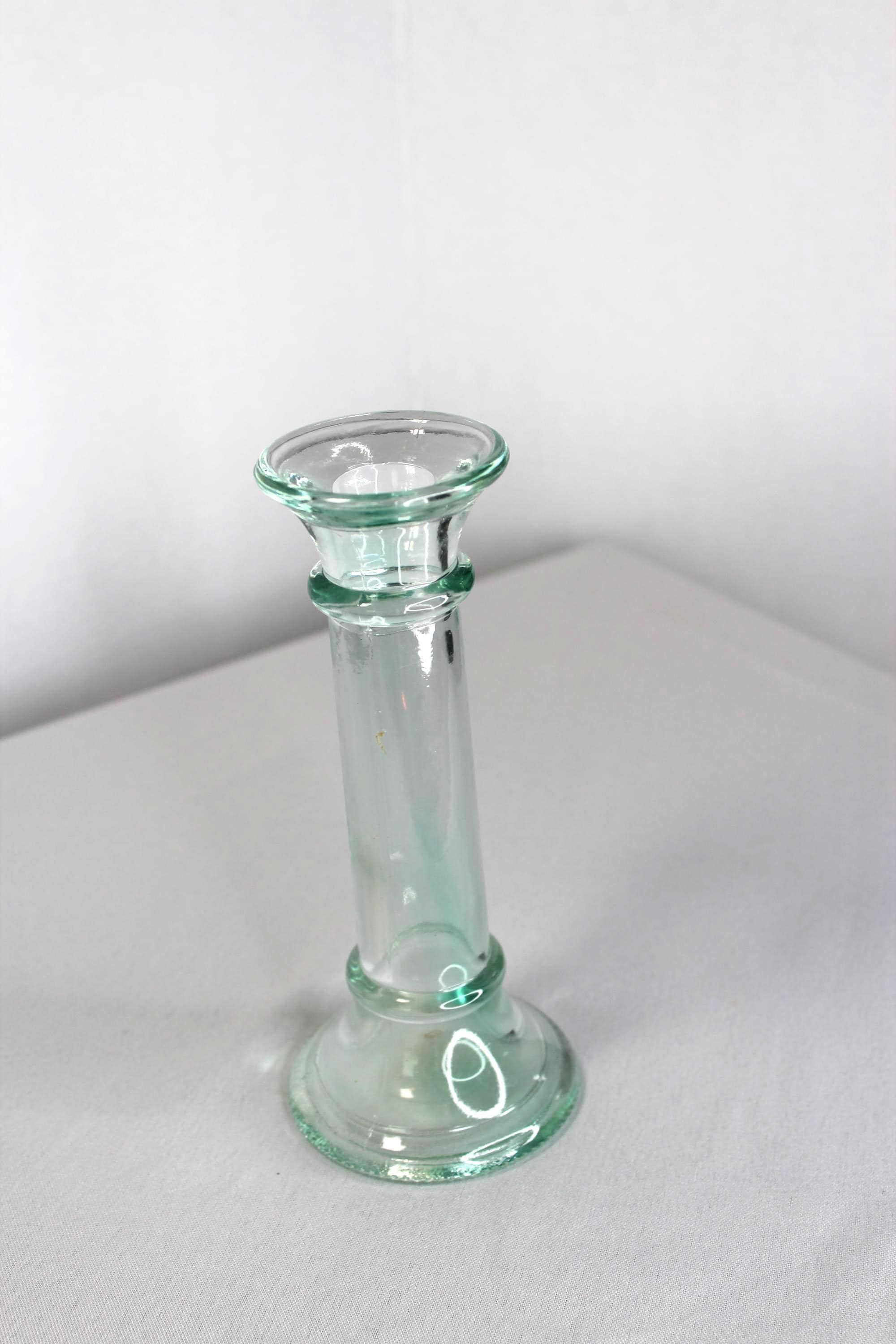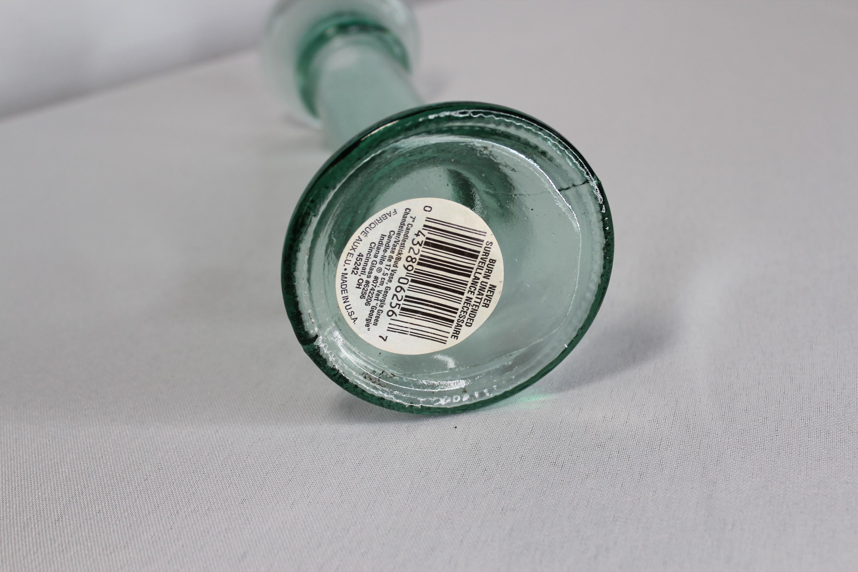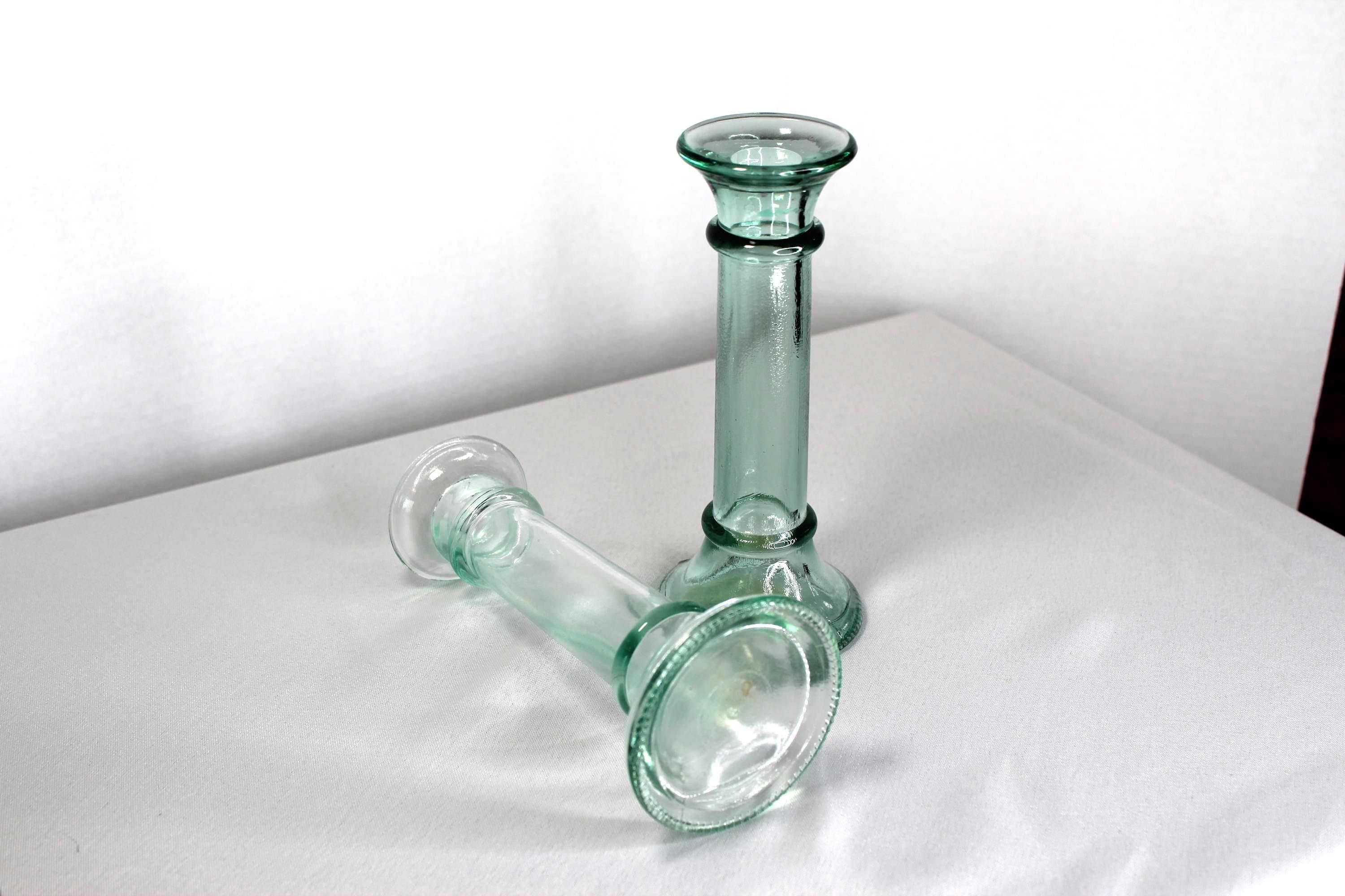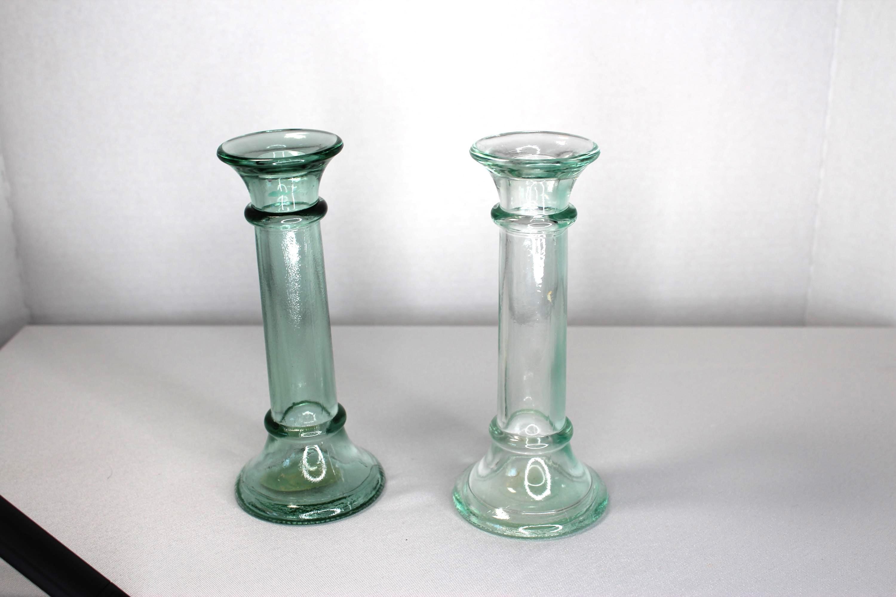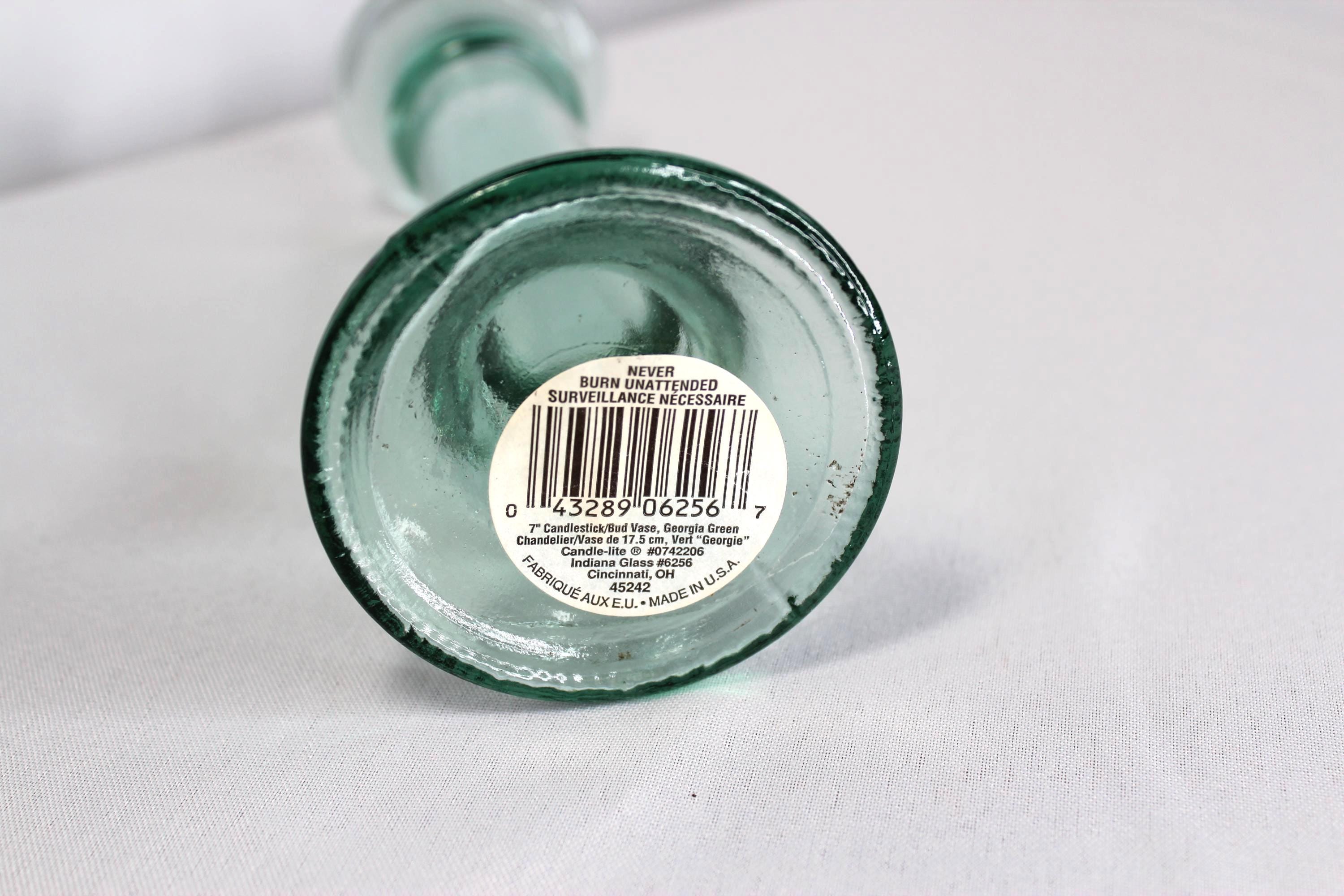 Darling translucent candle holder or bud vases in column design in popular green tint! Thes are vintage Indiana glass and they measure 7 inches tall, 3 inches wide at the base. One of them has a sticker that indicates the color is "Georgia Green". The other does not have a tag and is slightly lighter in color. They would be a fun addition to most any decor. They are in perfect used condition from the 1990's. Price is for the pair.