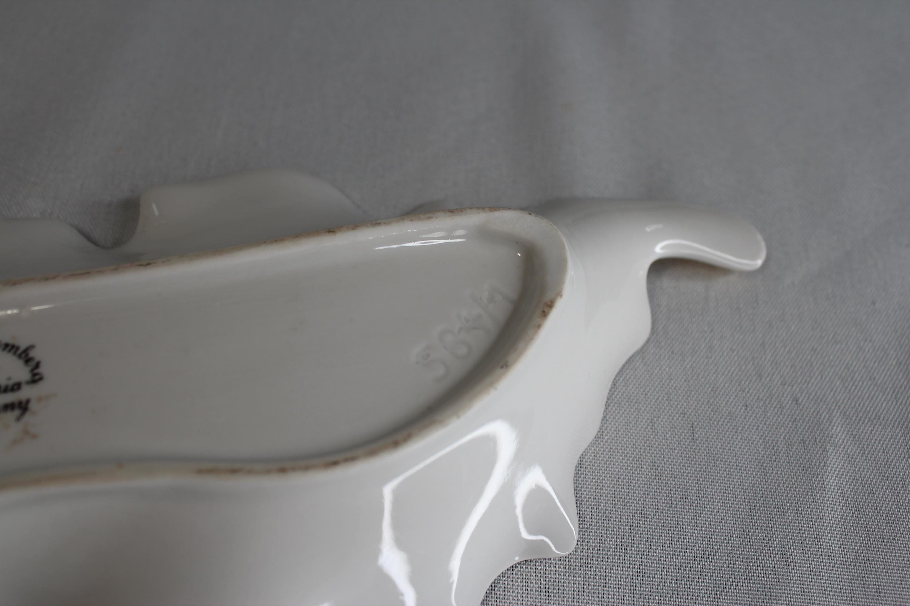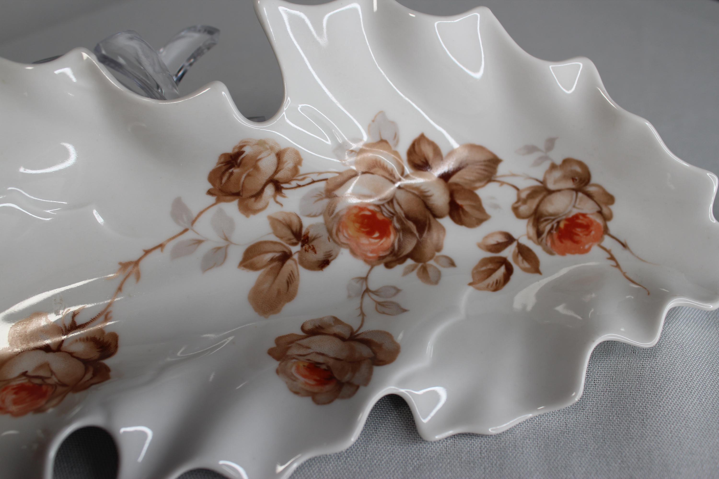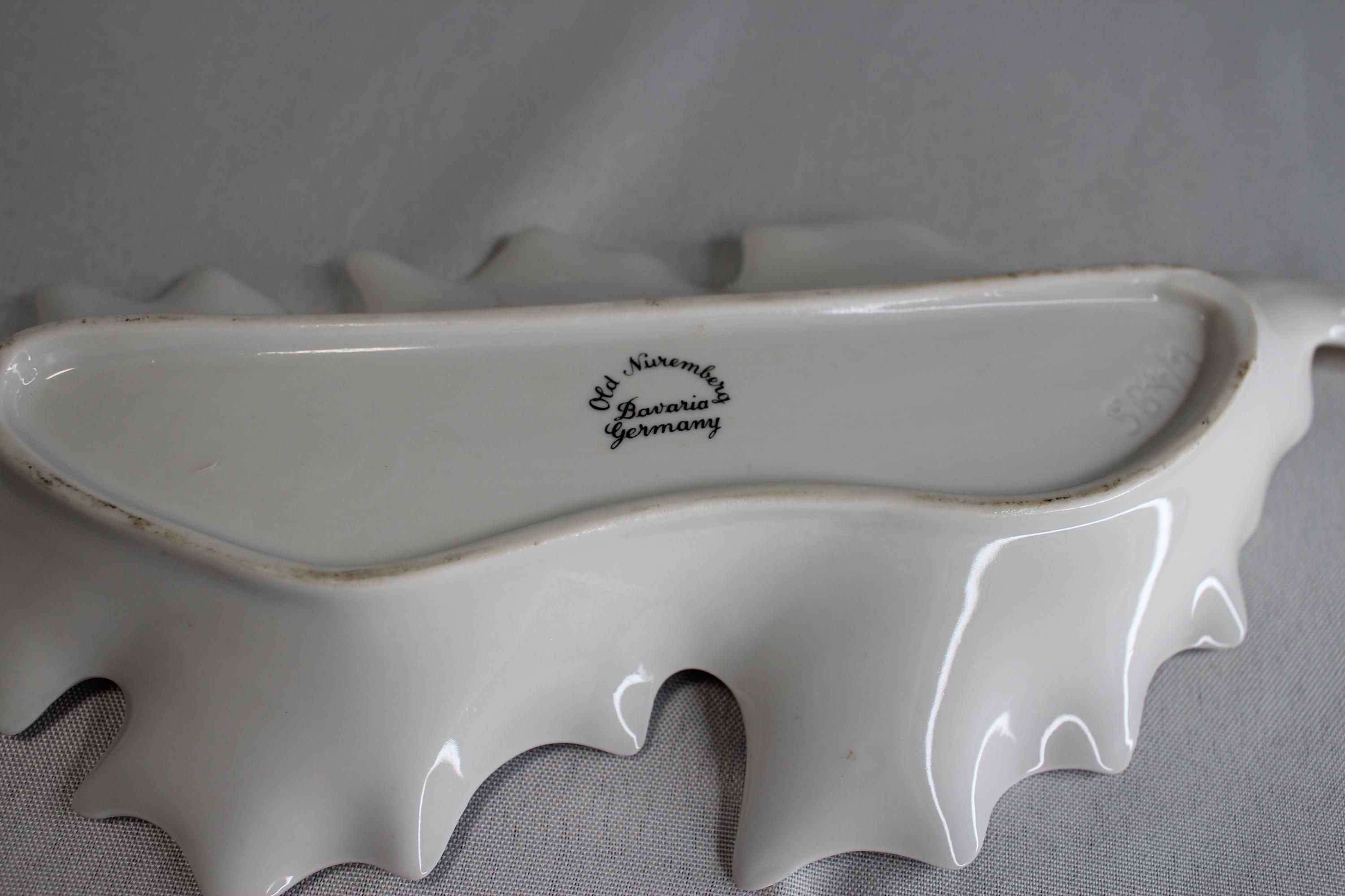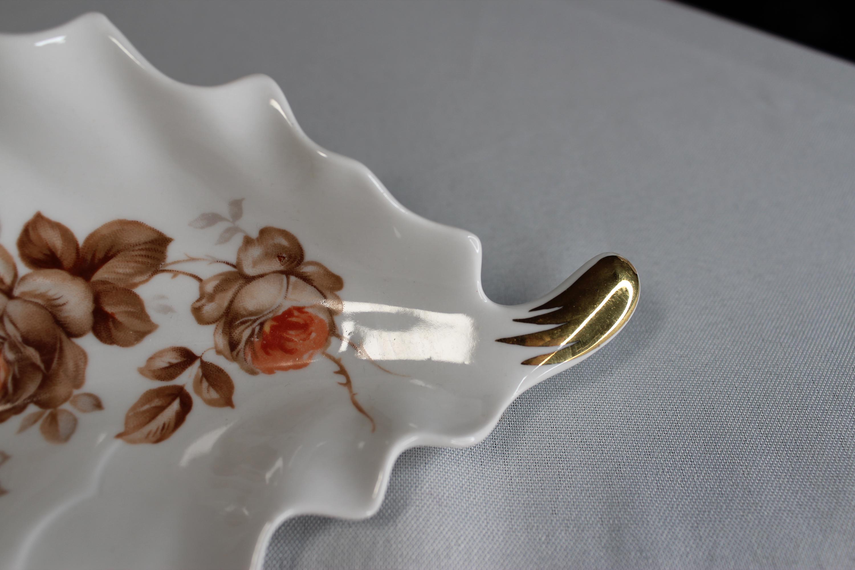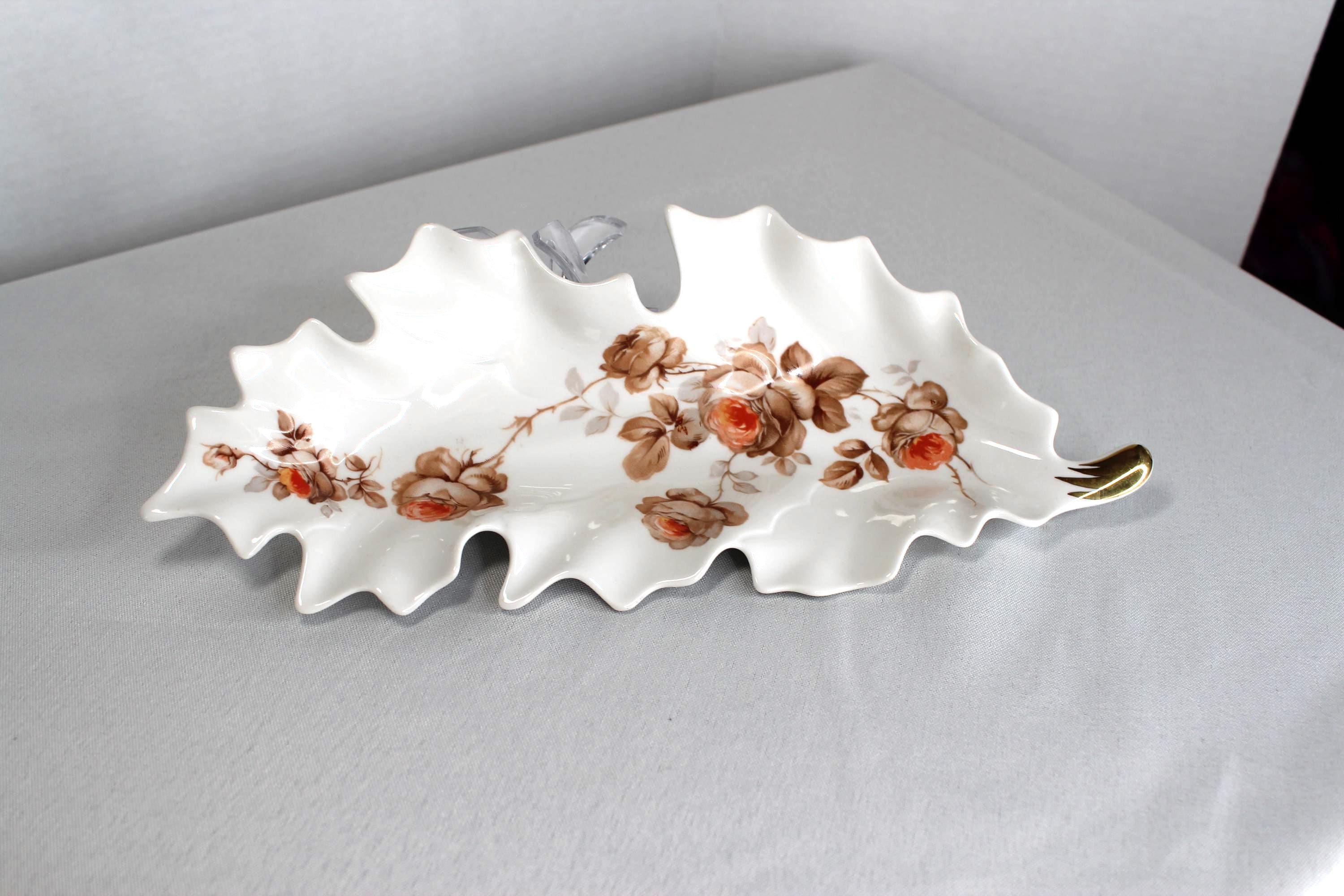 Vintage Old Nuremberg, Bavaria Germany tray or dish. This pretty leaf shaped accent piece would be wonderful as a jewelry holder, or other items or as a display piece. It measures 11 inches long x 4 inches wide x 1.5 deep inches. Marked with 584/7. The pattern is roses and stems in a soft muted gray/brown with pinkish coral centers on a white back drop. The "handle" of the leaf has gold painted accent.