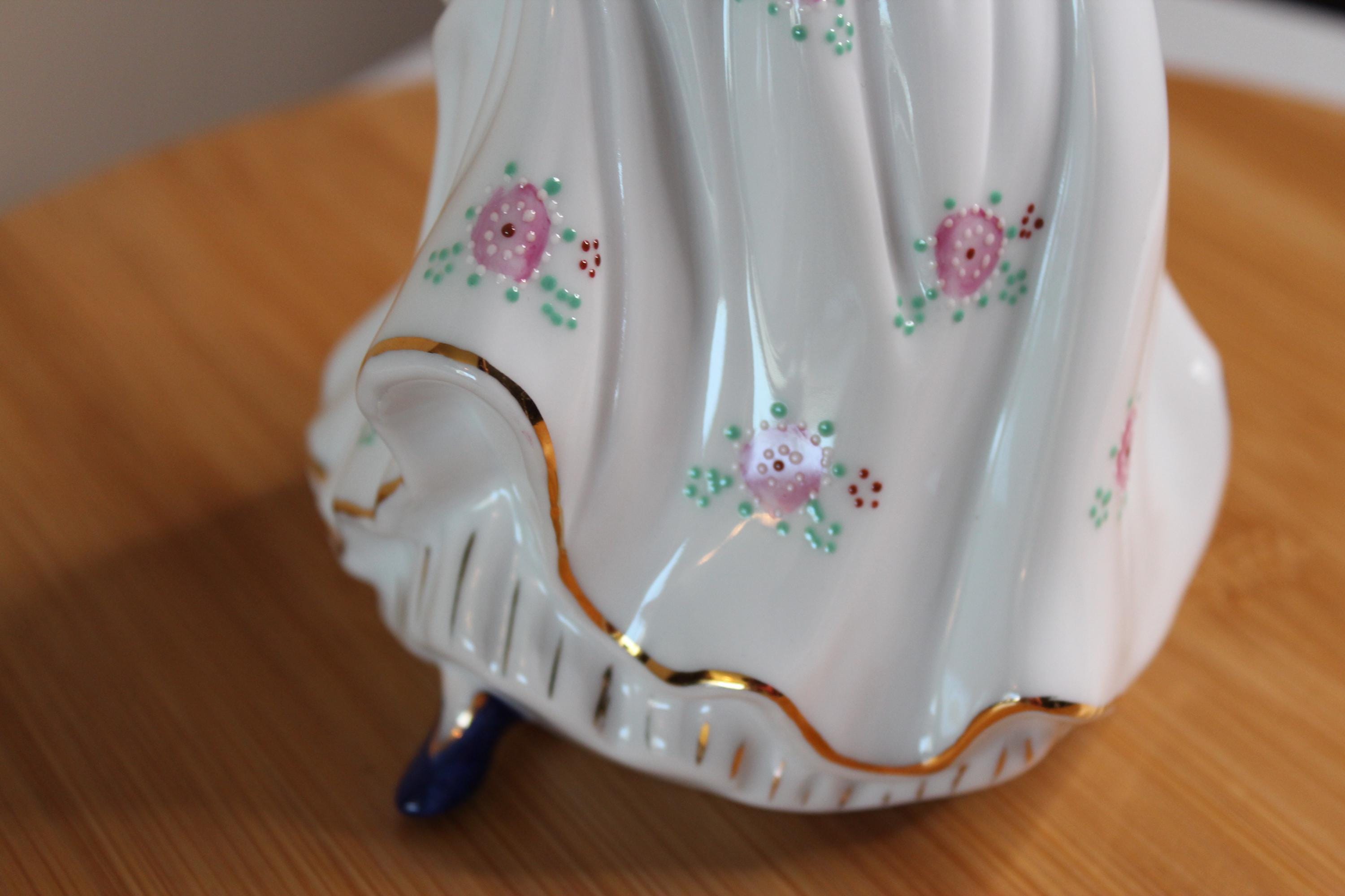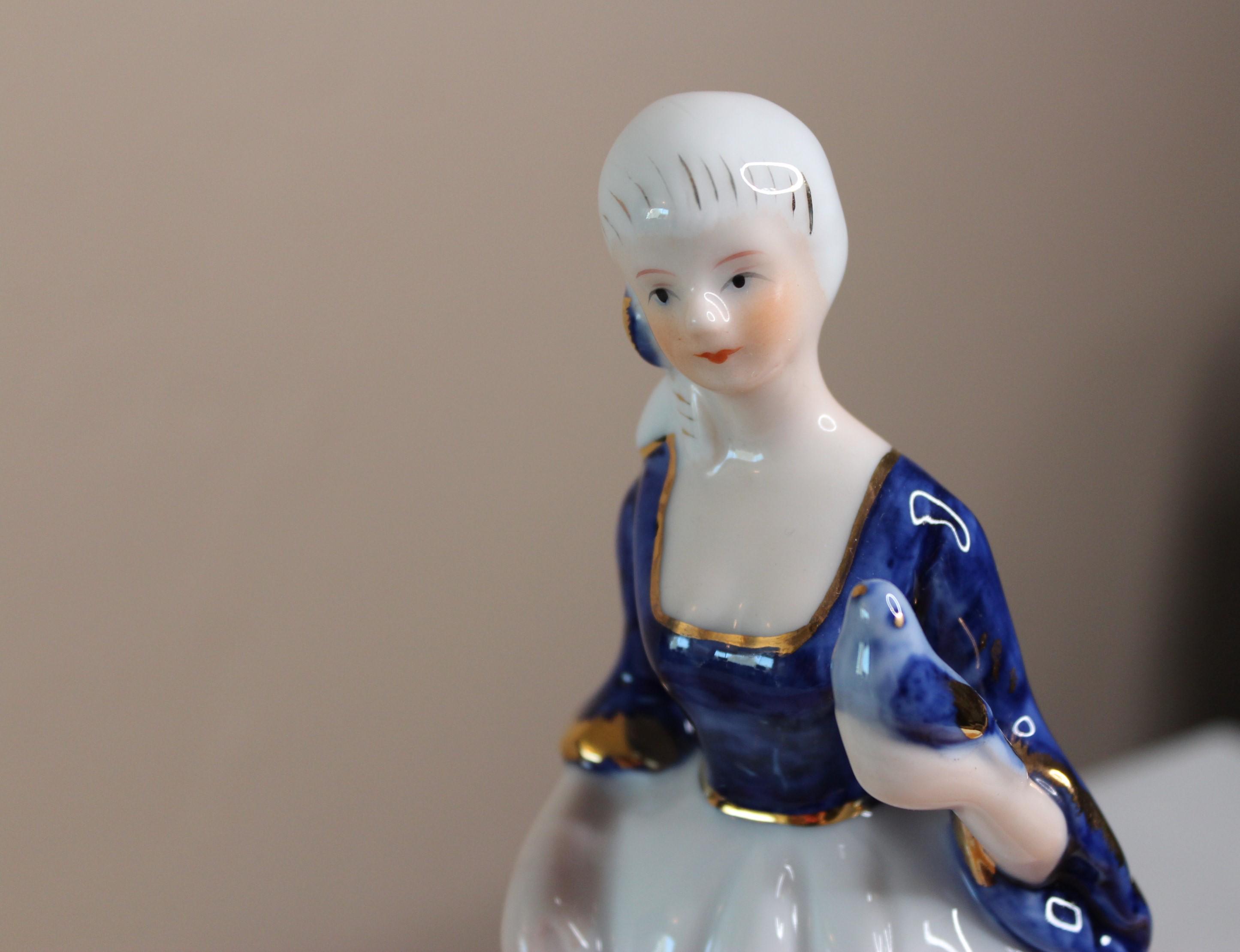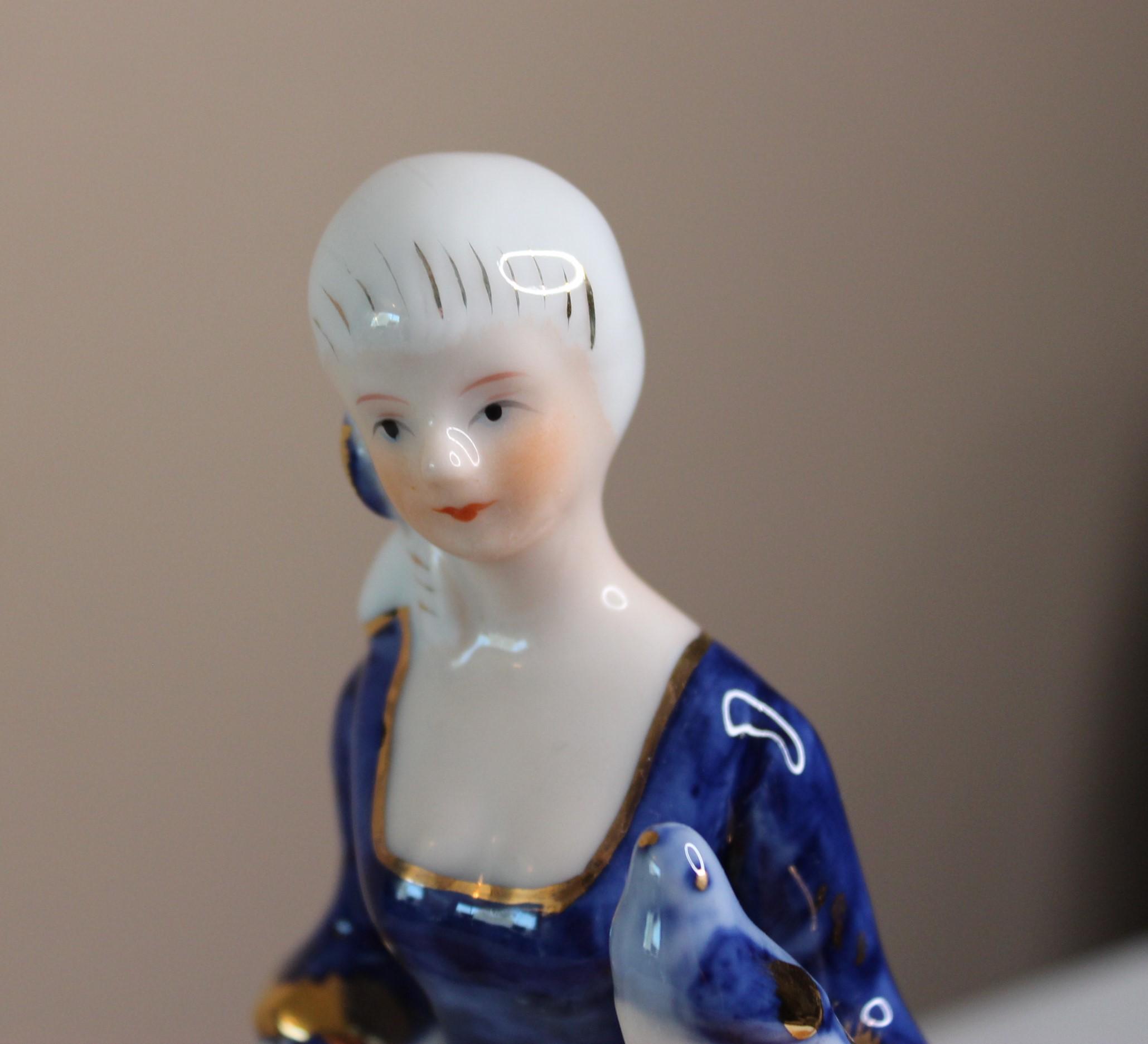 Porcelain figurine by KPM in Berlin Germany, circa 1896. She is a delicate beauty who is in pristine used condition. She stands 8 inches tall. There is hand painted cobalt bodice over a skirt with pink and green flowers, and gold accents throughout. She holds a blue bird in one hand and gently lifts a bit of her skirt with the other, revealing a bit of the underskirt and painted blue shoe.