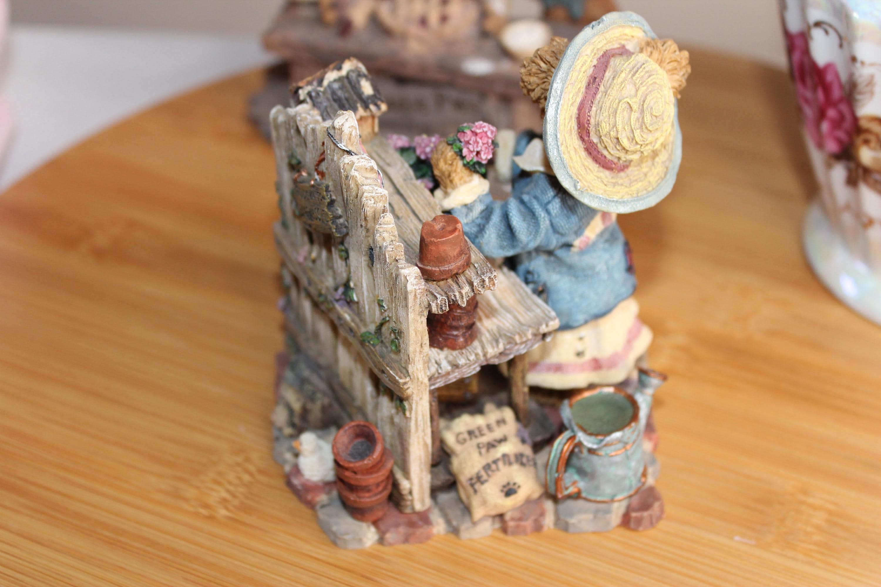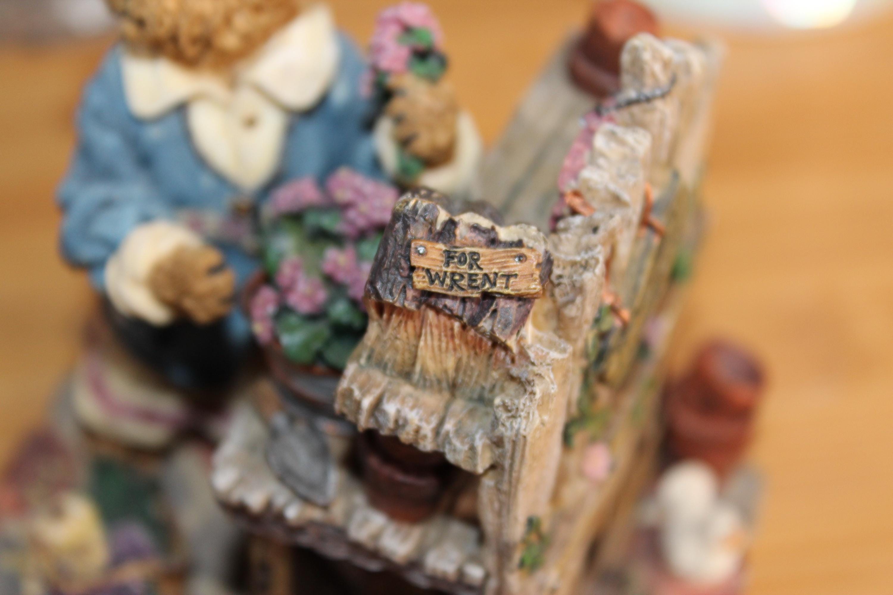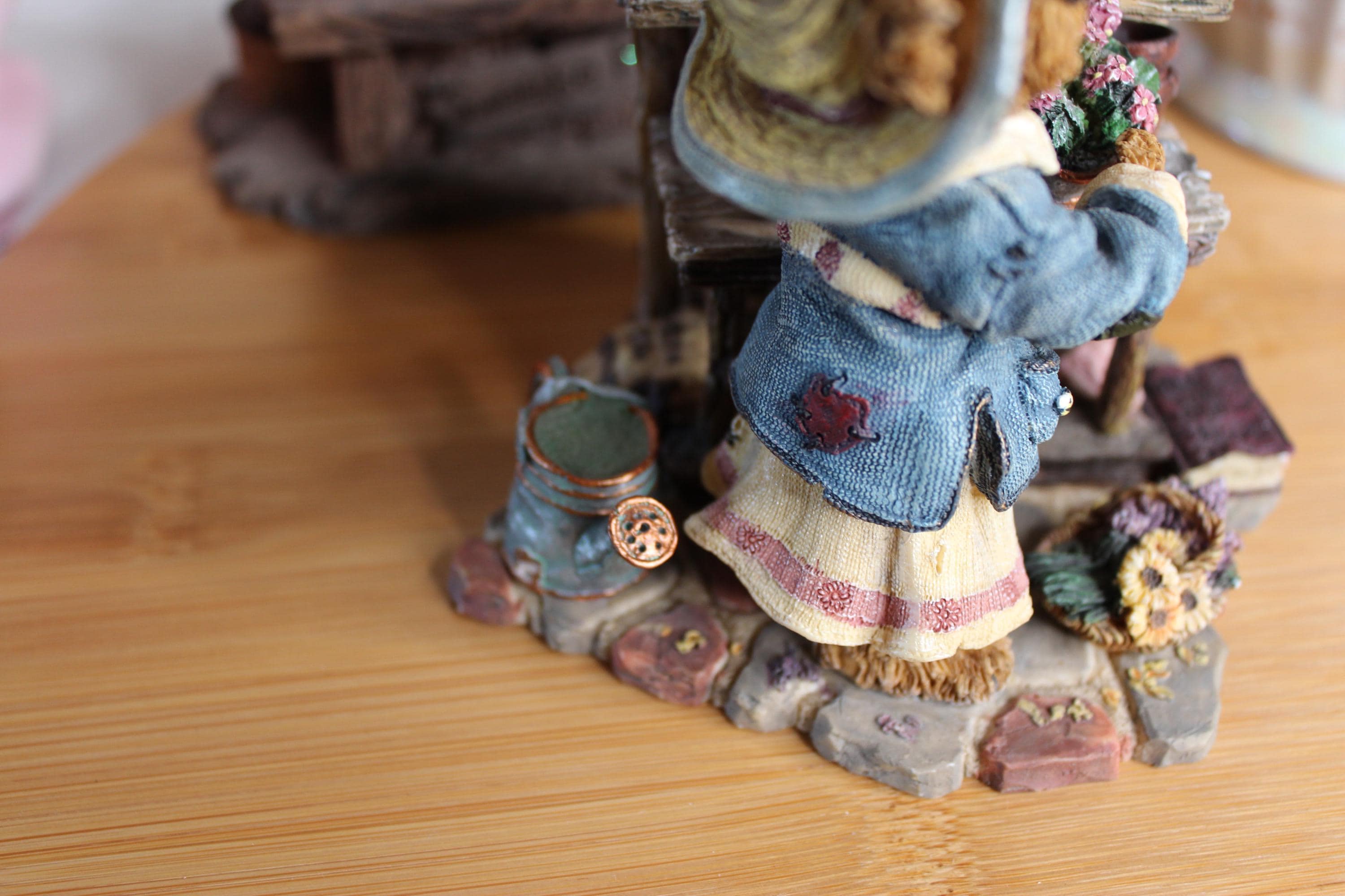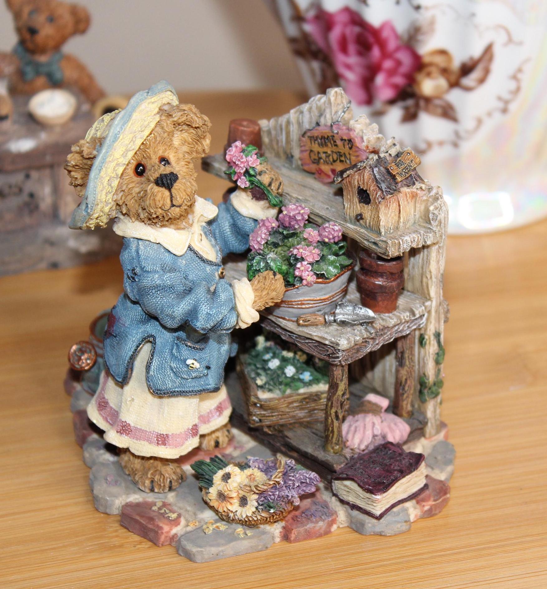 This darling Boyds Bears and Friends figurine has character galore! There is exquisite detail over the entire figurine, from the little signs on the potting table and bird house, underneath the table where she stores her gardening gloves, her hat and fabric on her clothing, to the tip of her nose! Even the watering can holds "water", and she stands on paving stones. Zoom in on the photos to enjoy! On the bottom of the figurine it reads, Boyds Bears and Friends, Editions/pc # 7E/652, Style #227748 Martha Bloomengrow... Thyme to Garden, c 2000 The Boyds Collection LTD.
