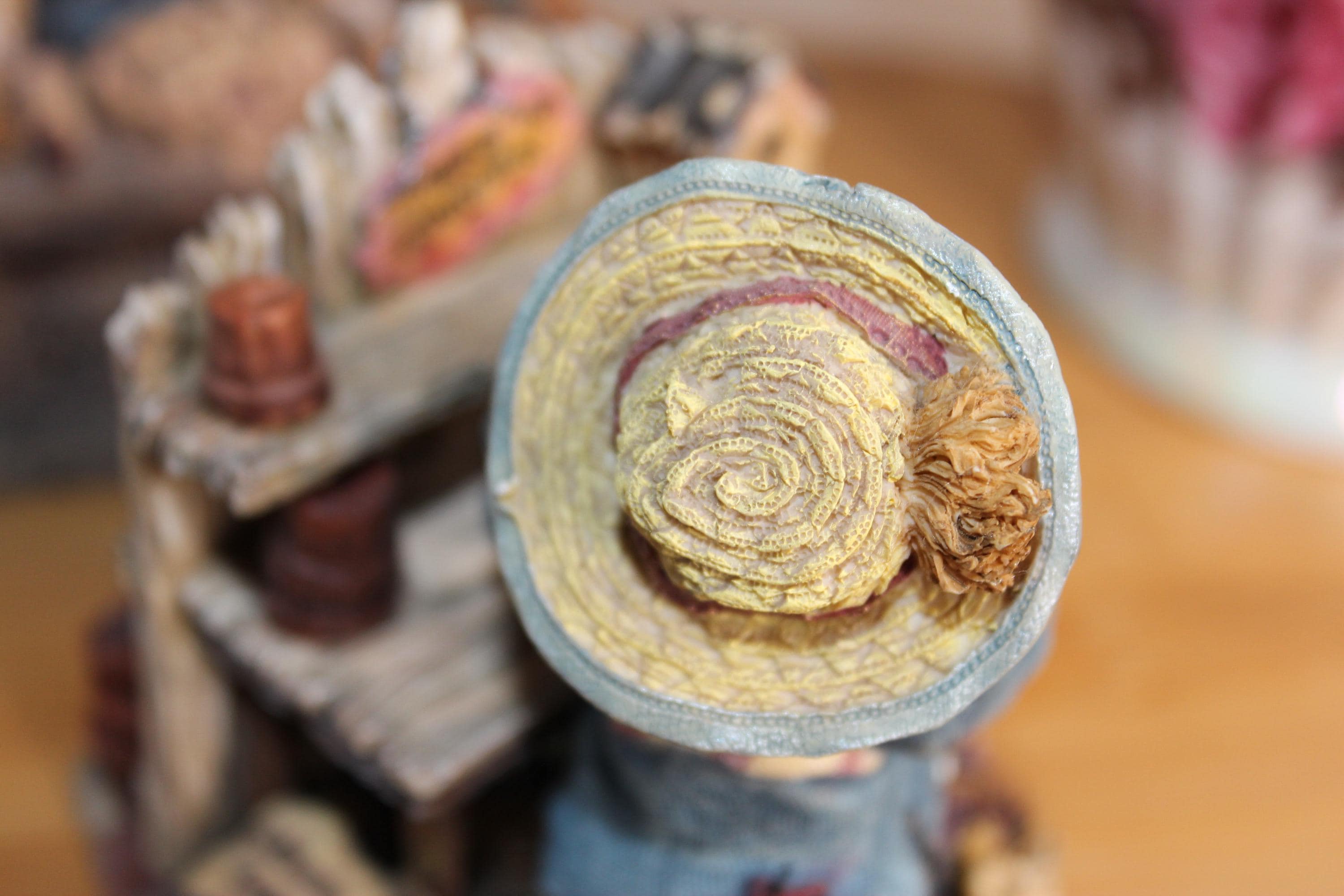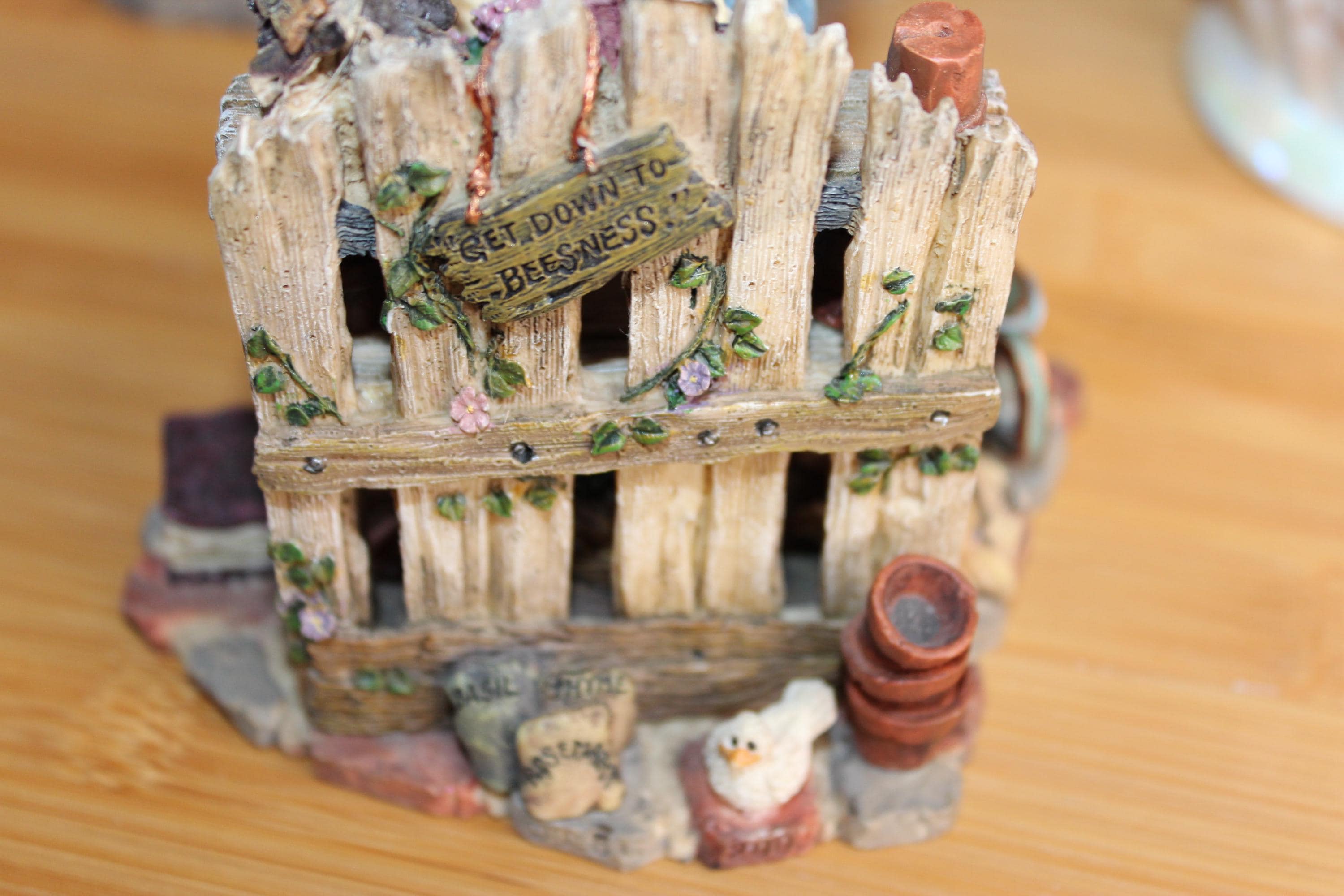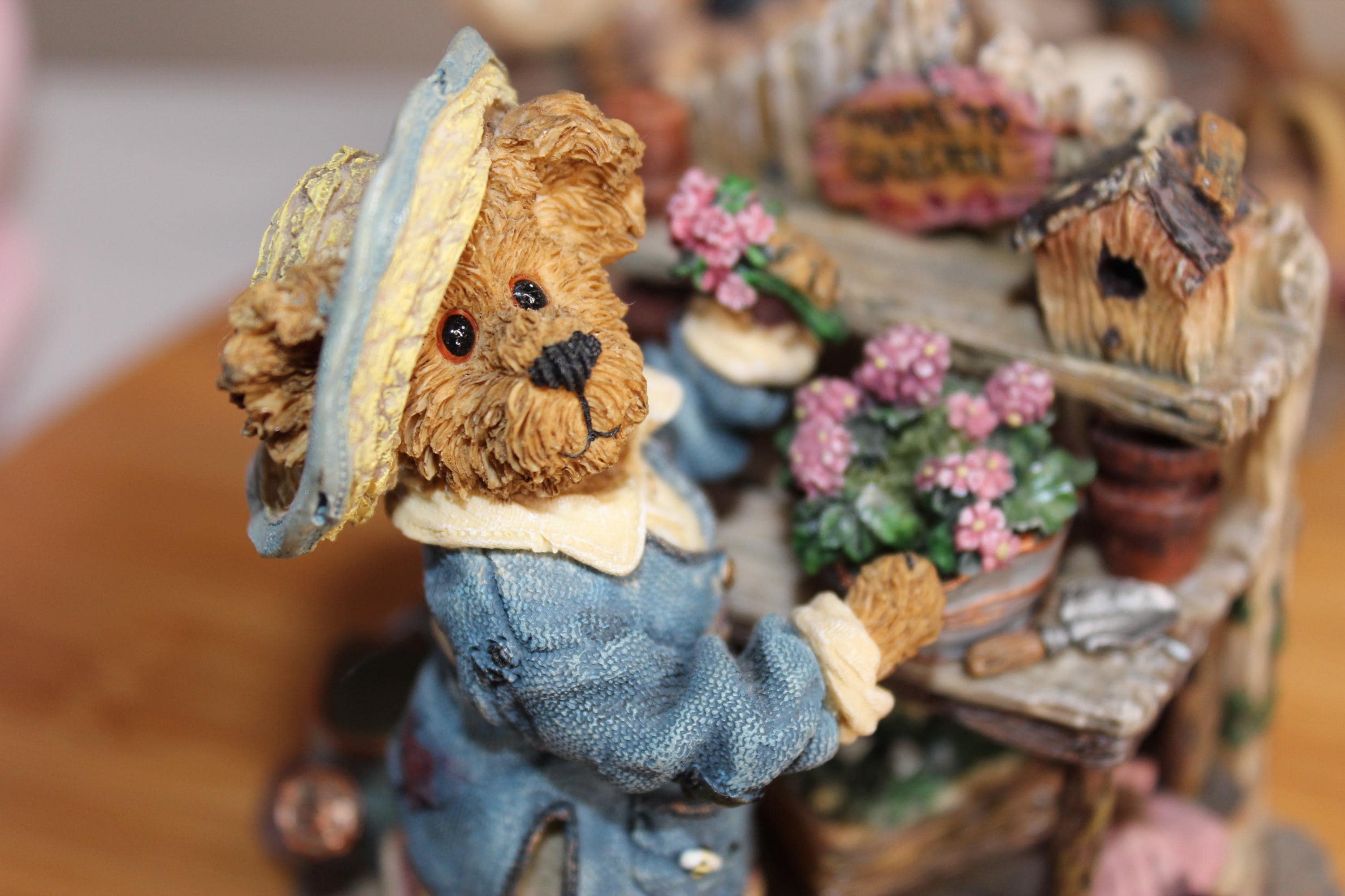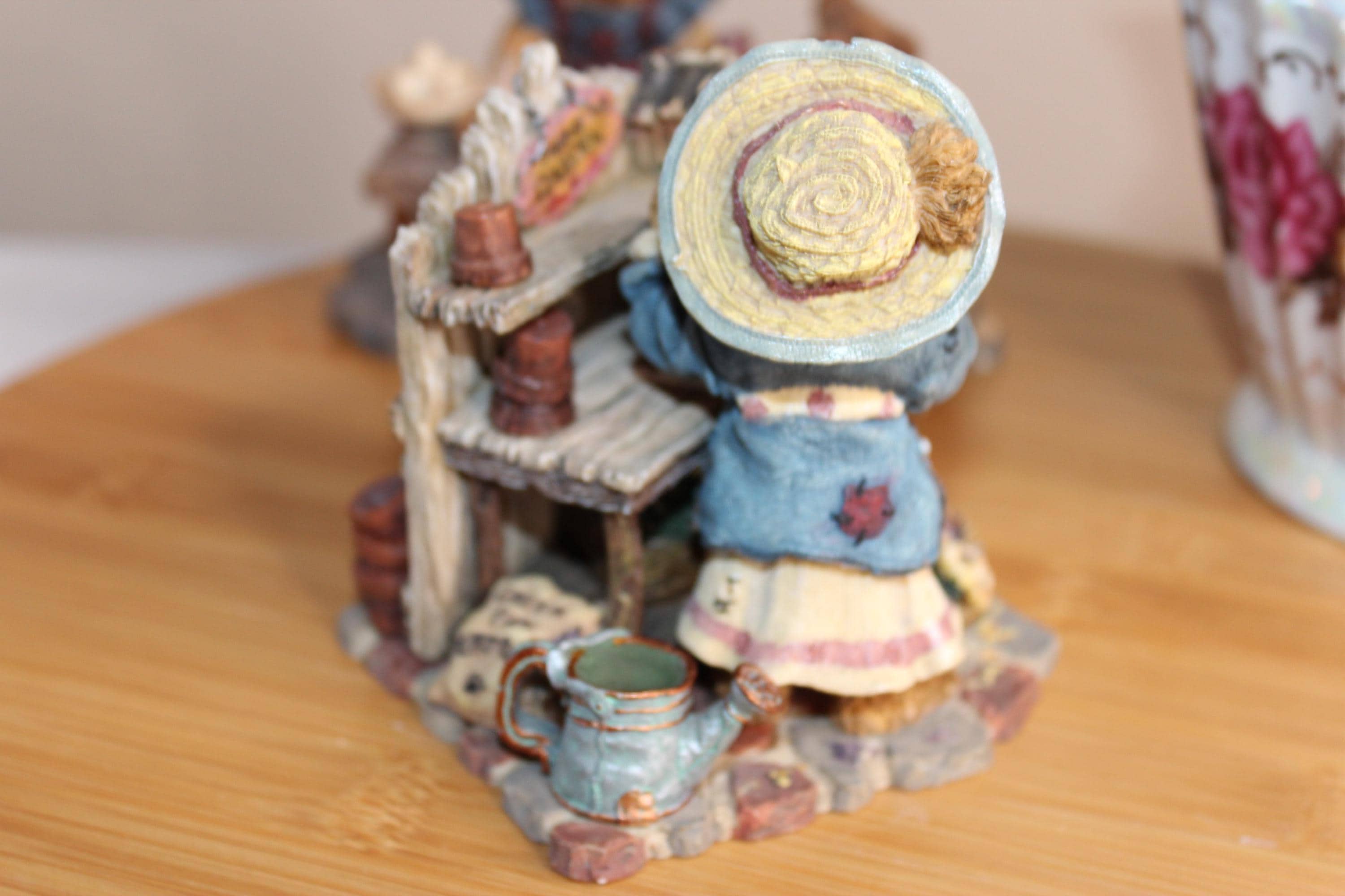 This darling Boyds Bears and Friends figurine has character galore! There is exquisite detail over the entire figurine, from the little signs on the potting table and bird house, underneath the table where she stores her gardening gloves, her hat and fabric on her clothing, to the tip of her nose! Even the watering can holds "water", and she stands on paving stones. Zoom in on the photos to enjoy! On the bottom of the figurine it reads, Boyds Bears and Friends, Editions/pc # 7E/652, Style #227748 Martha Bloomengrow... Thyme to Garden, c 2000 The Boyds Collection LTD.