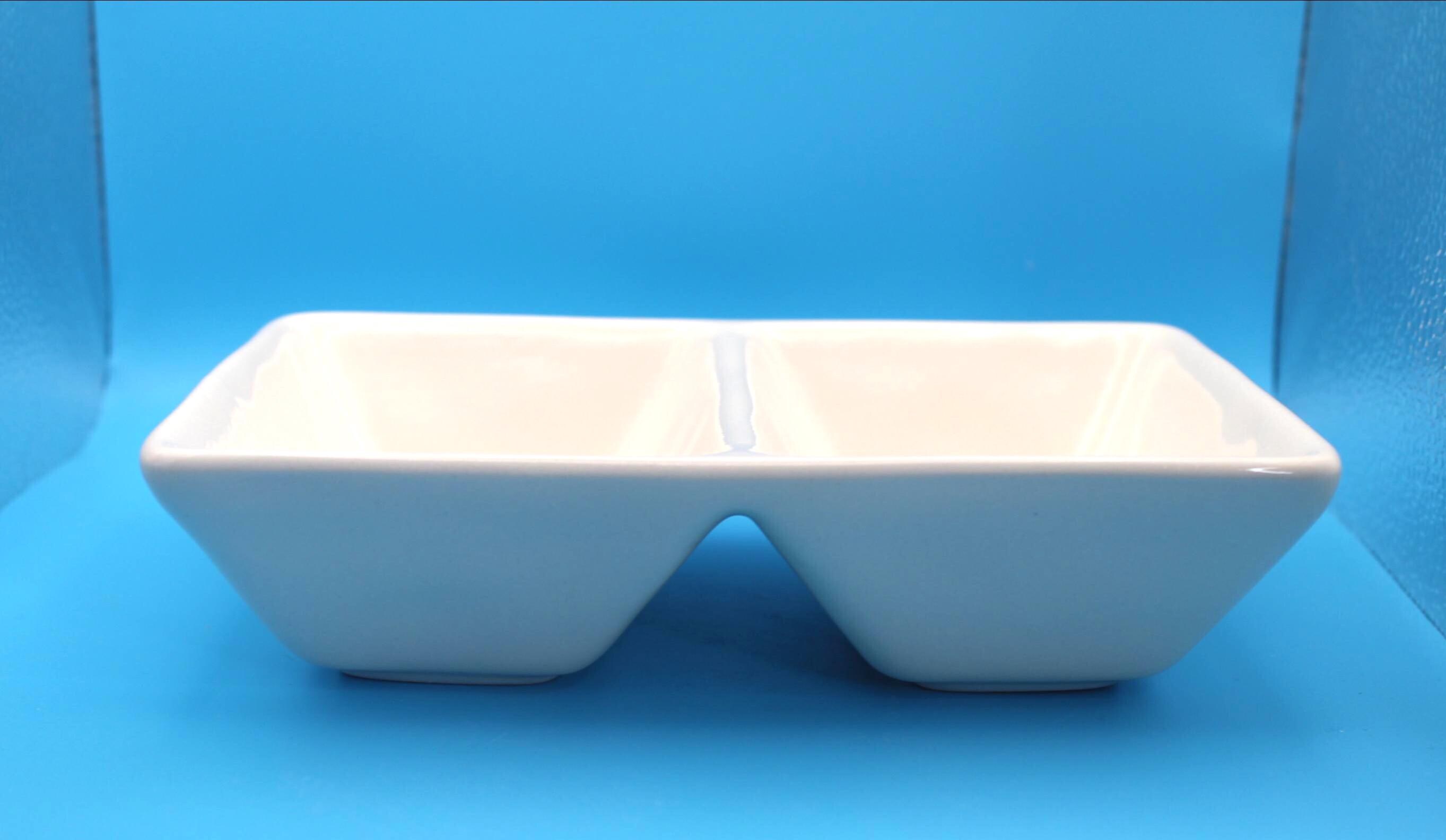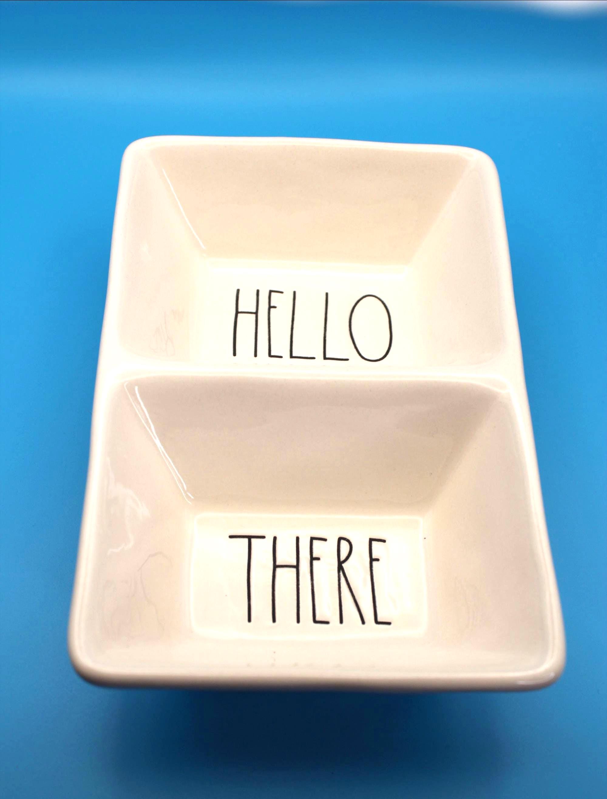 Rae Dunn Pottery, divided tray "HELLO THERE", Artisan Collection. Dishwasher safe. 8 inches long x 5 inches wide, x2 inches deep. Pristine pre-owned condition.