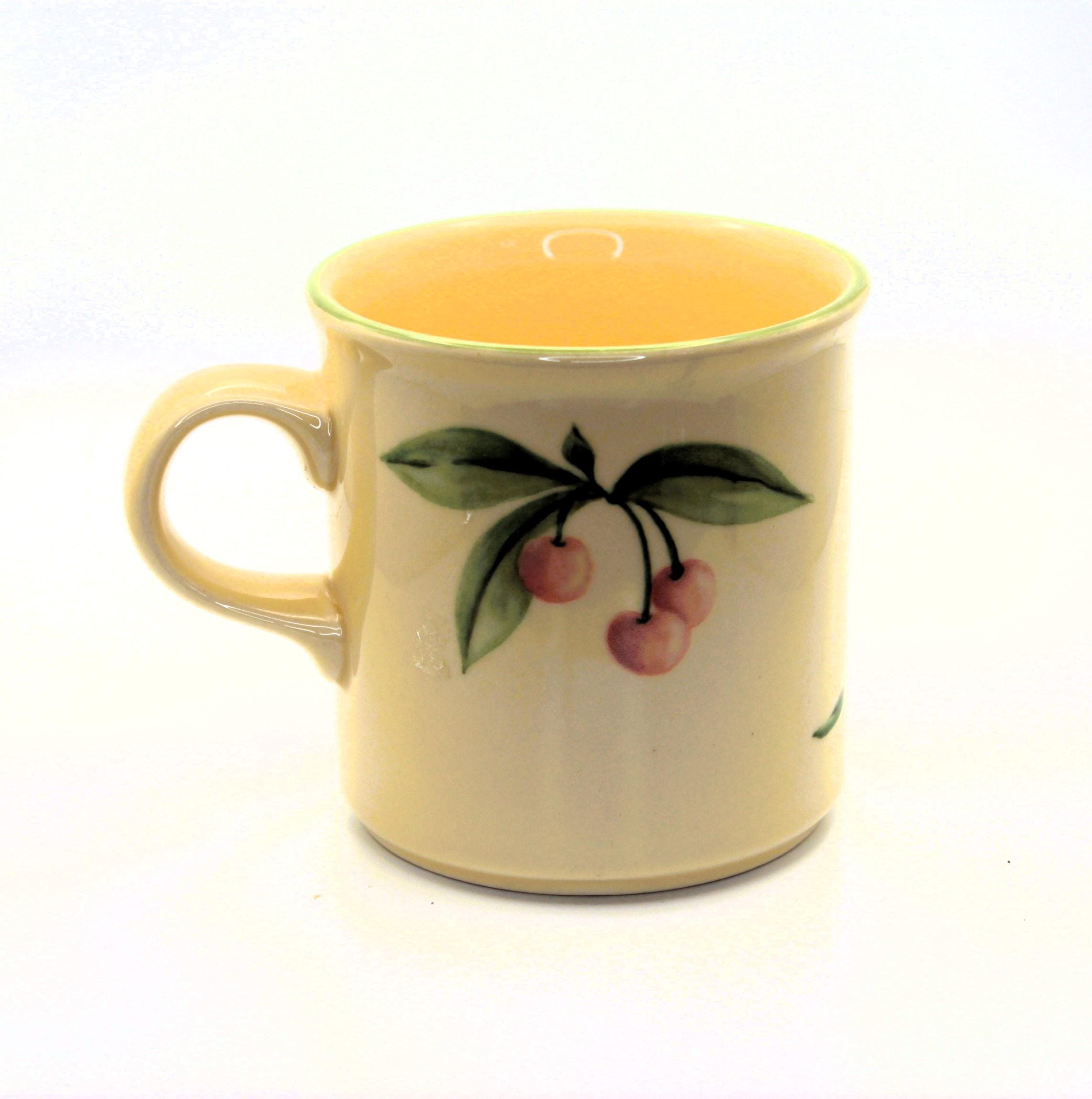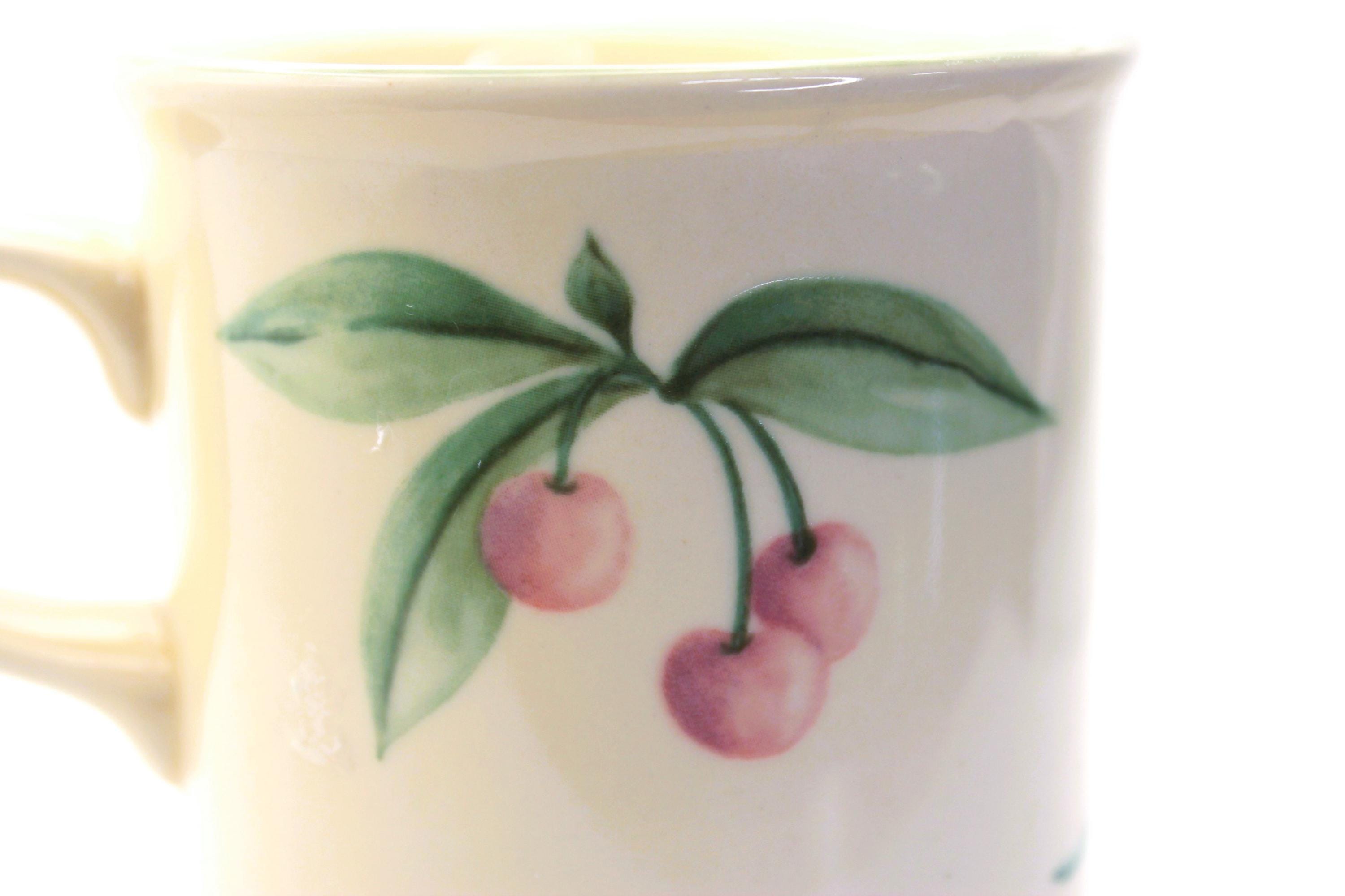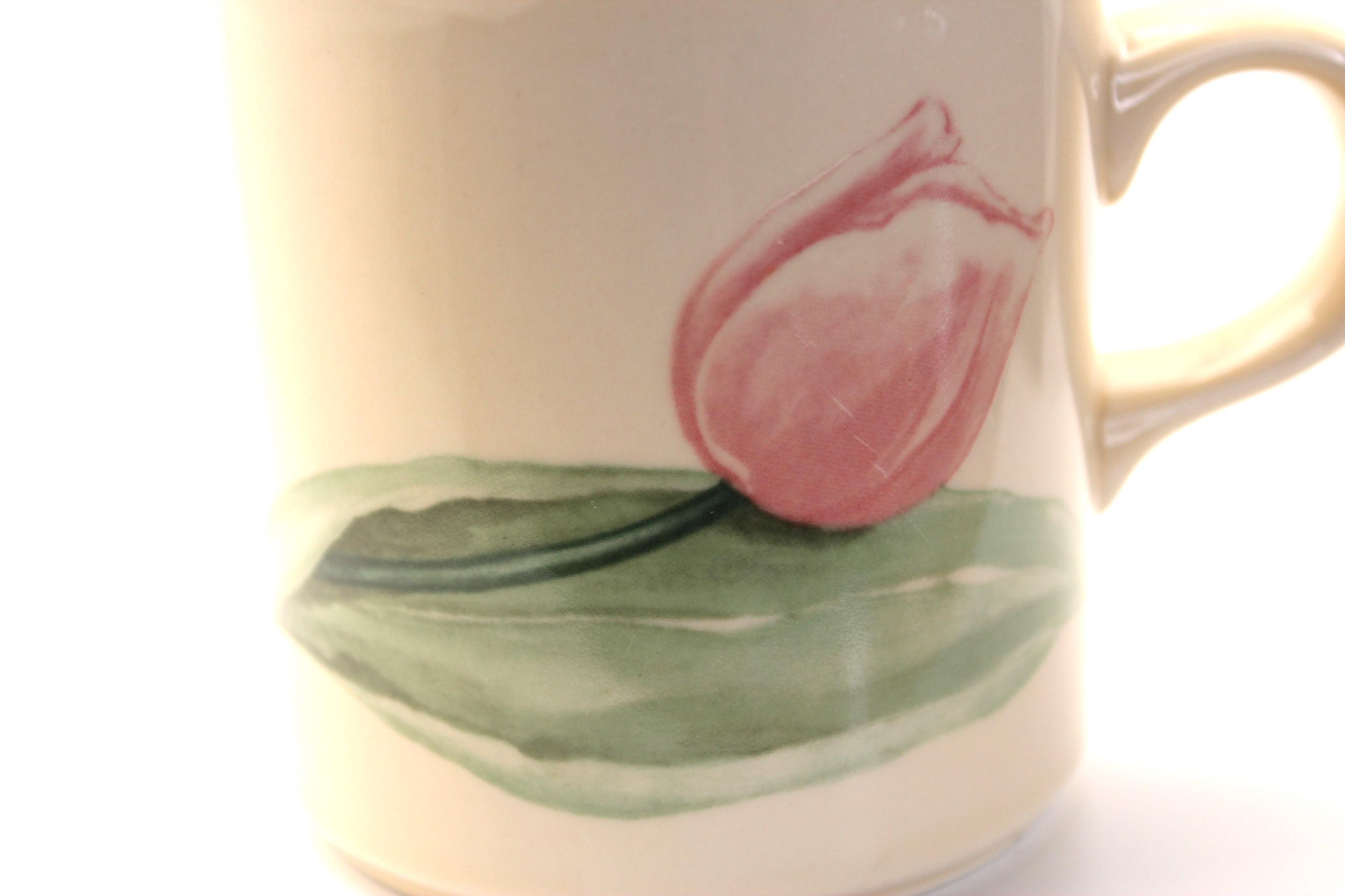 Replacement Vintage Pfaltzgraff Garden Party Coffee Mug. Adorable coffee mug is just precious with cherries on one side and tulip on the other. The base color is cream with a sage color on the rim. The graphics are pink and green. This was made in USA and has the Pfaltzgraff name embossed and printed on the bottom of the 10oz cup. It is in excellent pre-owned vintage condition. There is a very minor scratch on the tulip which I have a close up on in the photo.