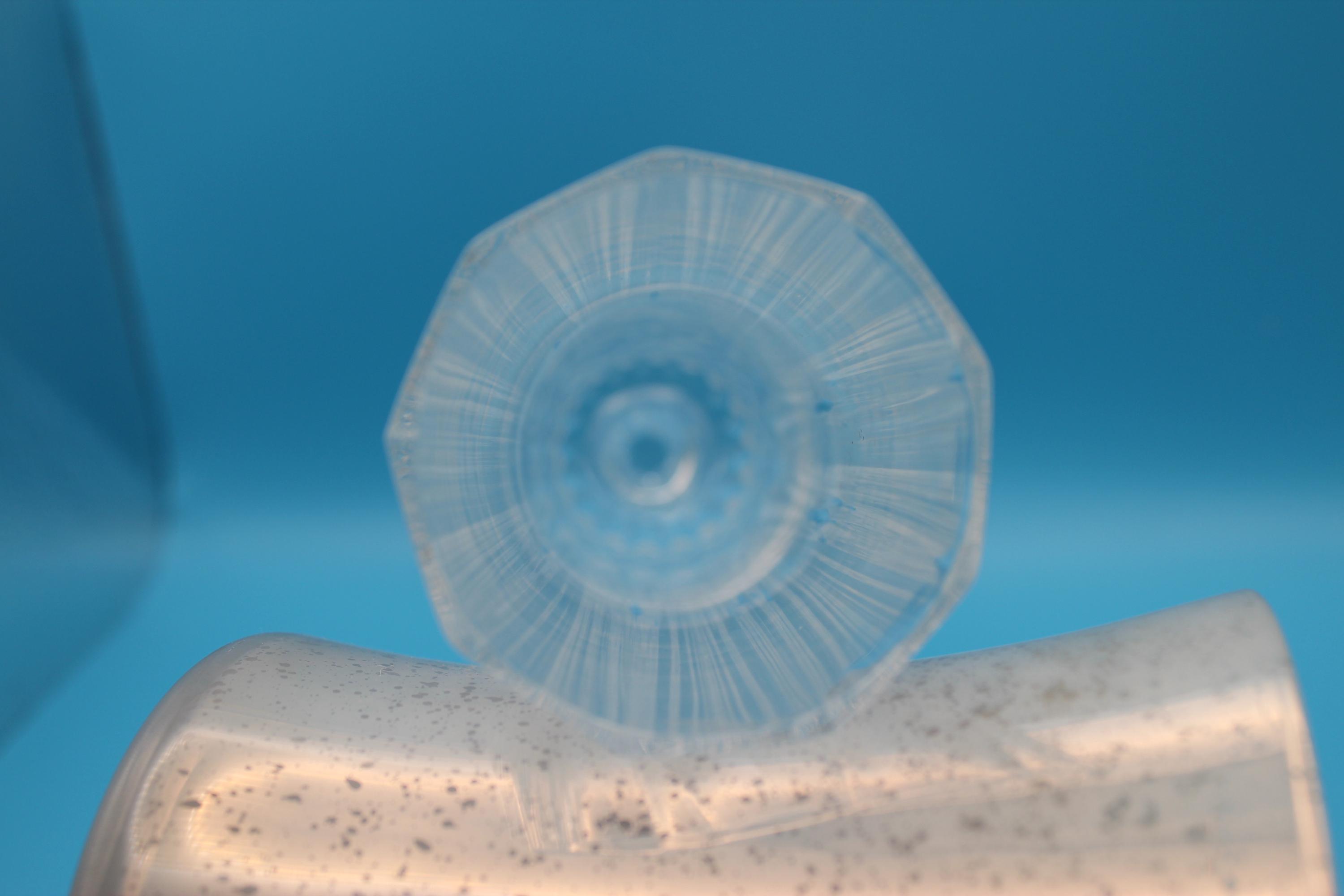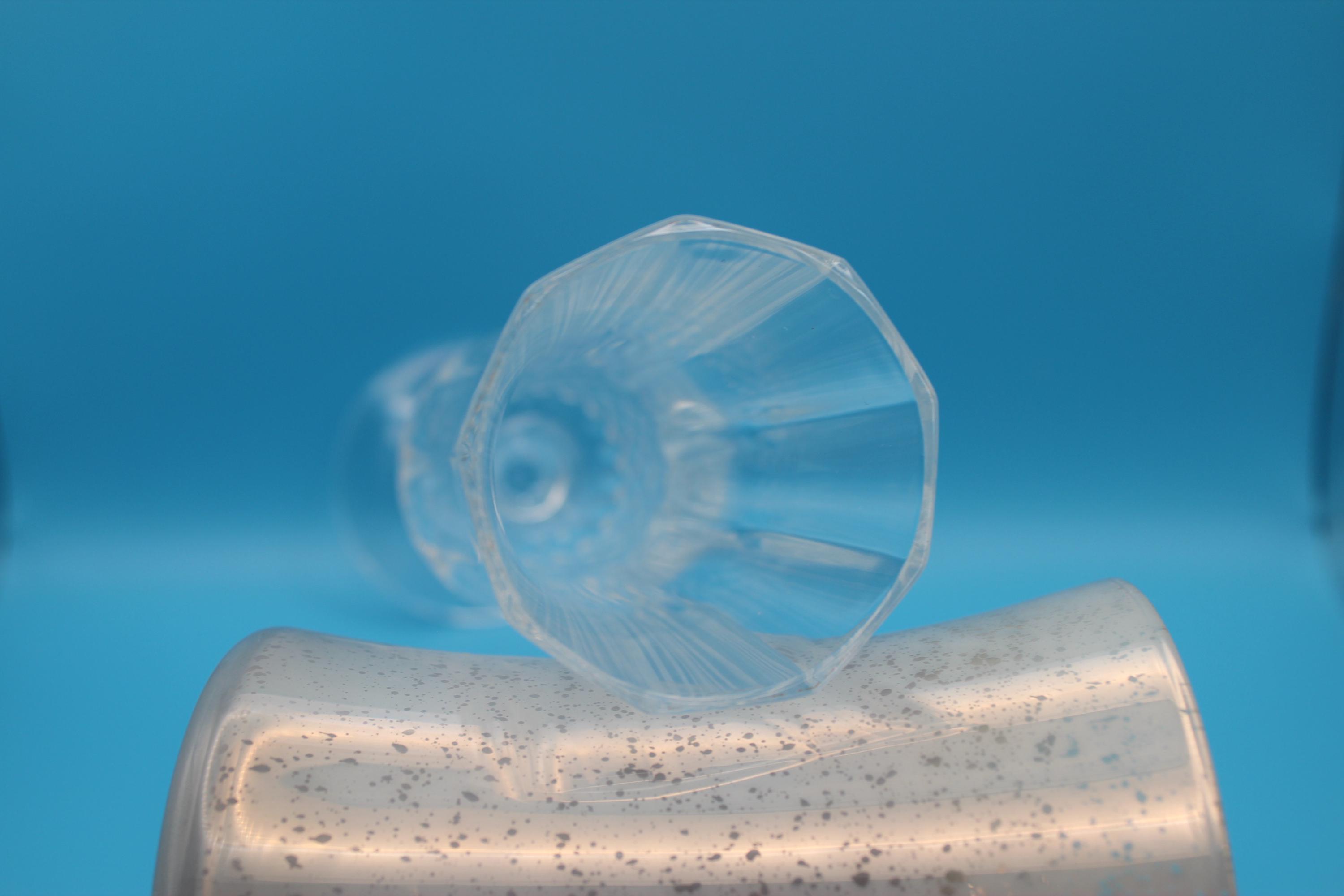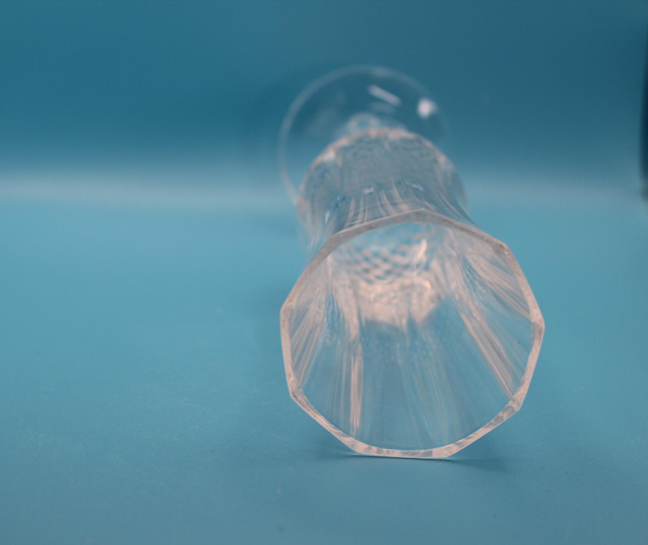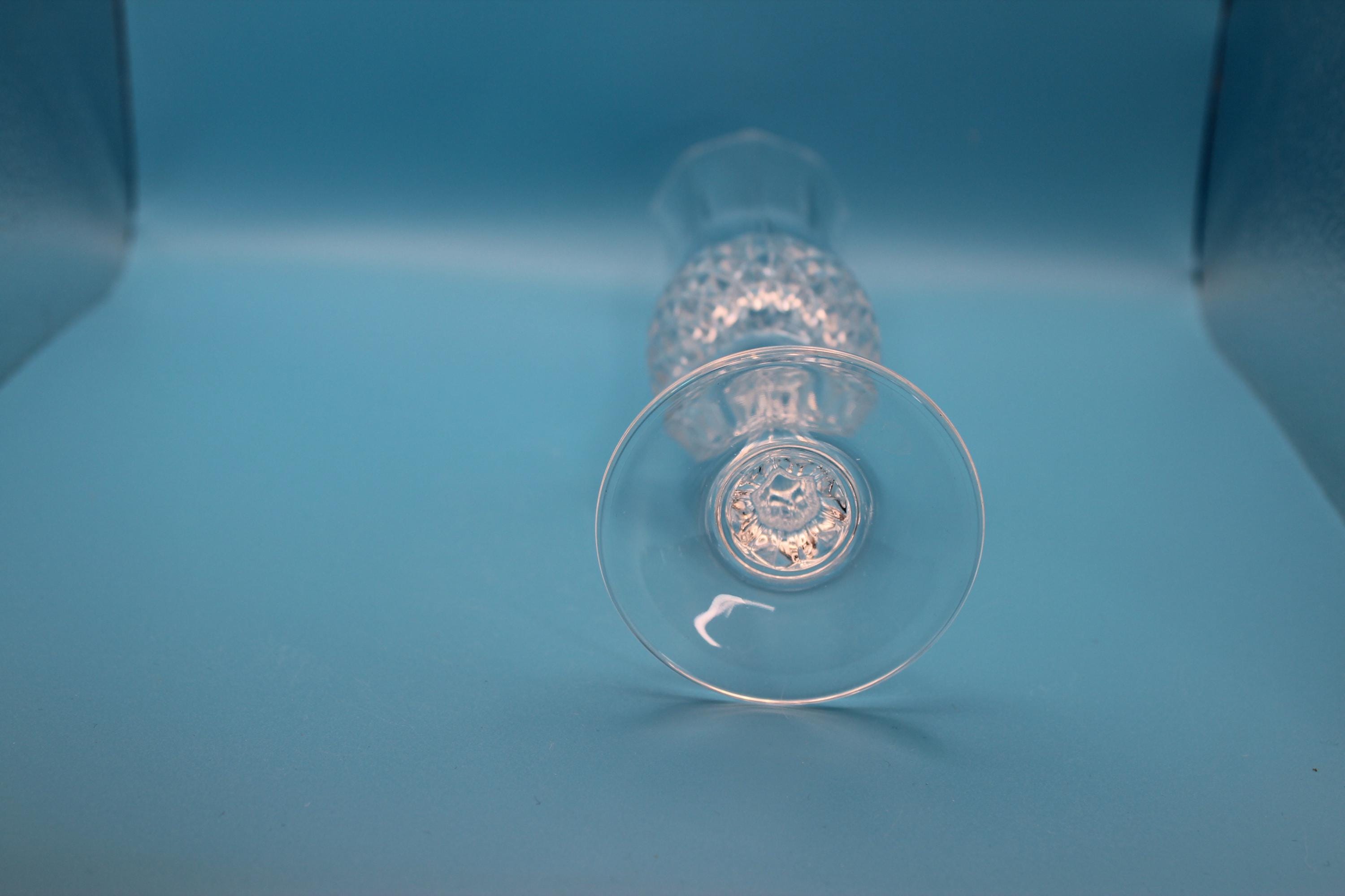 Cut vertical and crisscross design. 8 inches tall. Has interesting 9-sided shape on outside of flute, round inside. The cuts in this glass are gorgeous and allows the lighting to really make it sparkle. In pristine pre-owned condition.