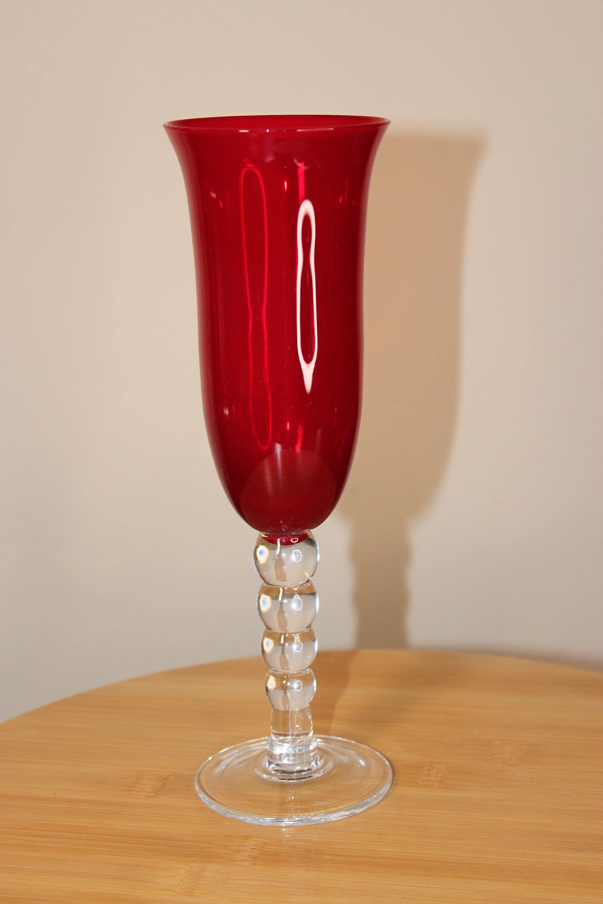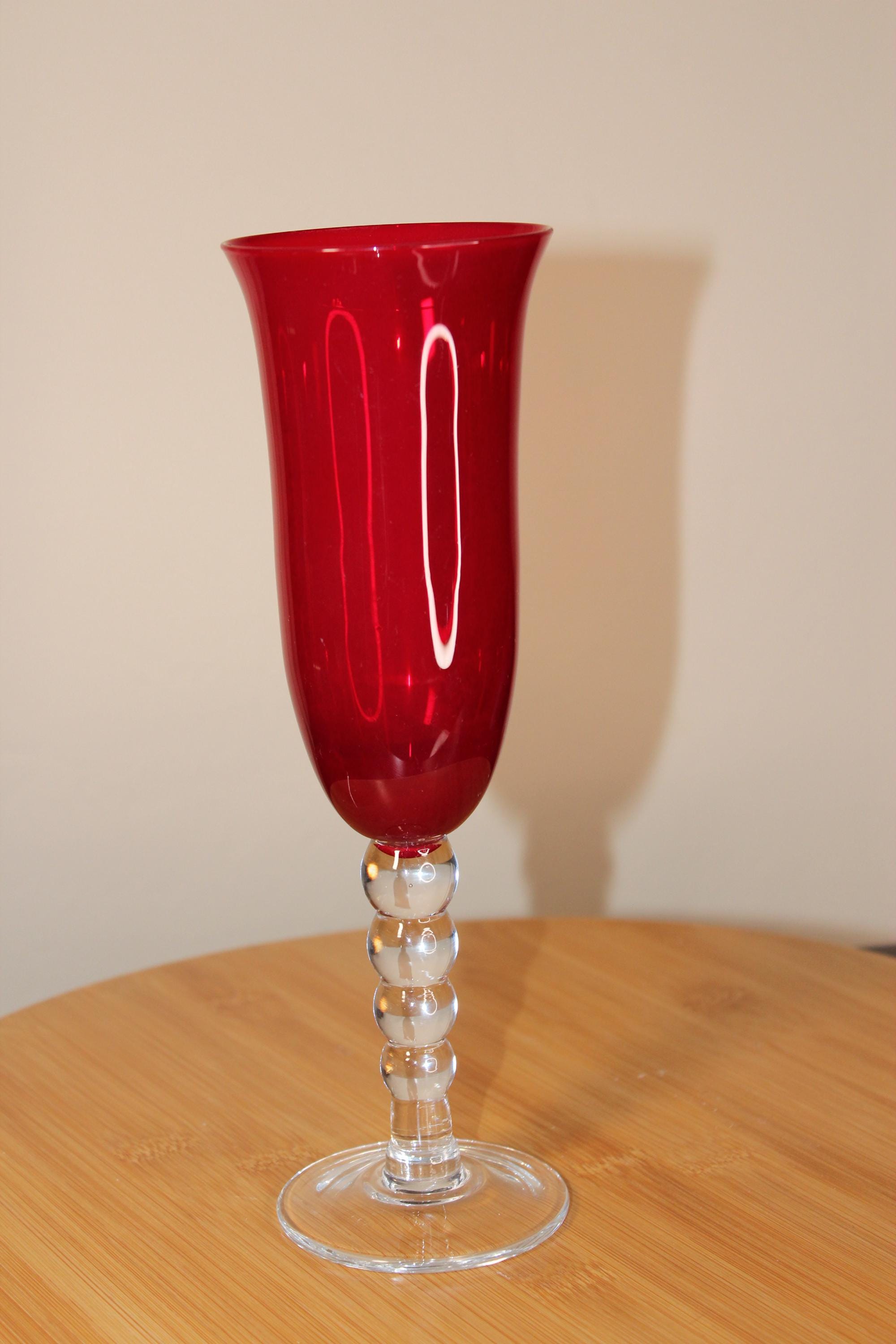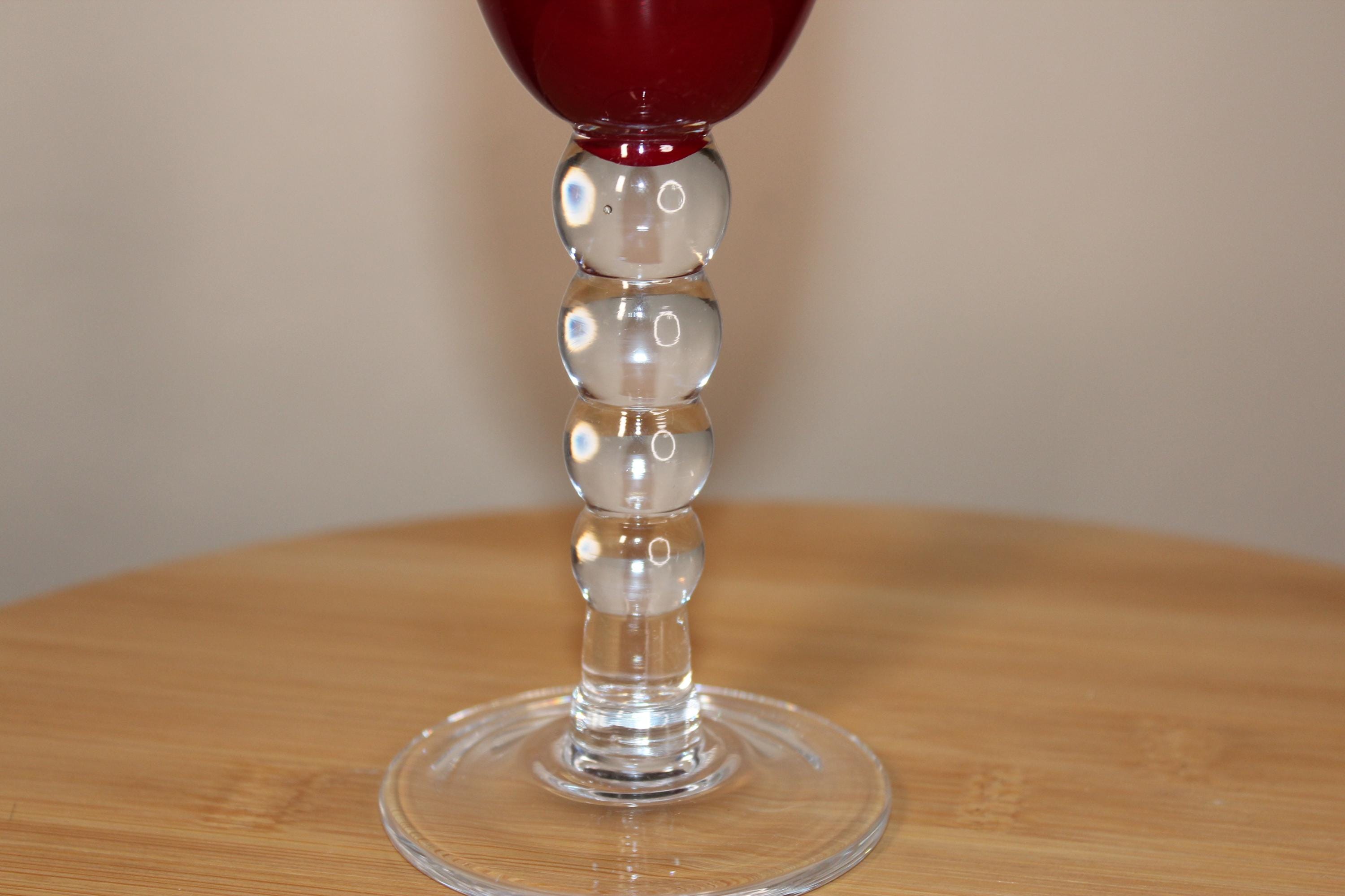 Ruby Red Wine Flute is 9.25 inches high by 3.02 inches wide at the slightly flared rim, and 2 7/8 inches wide at bottom pedestal. The stem is decorative, with four bubble shapes that are descending in size. This is a very pretty glass, in very good pre-owned condition. It holds 10oz fluid to the rim.