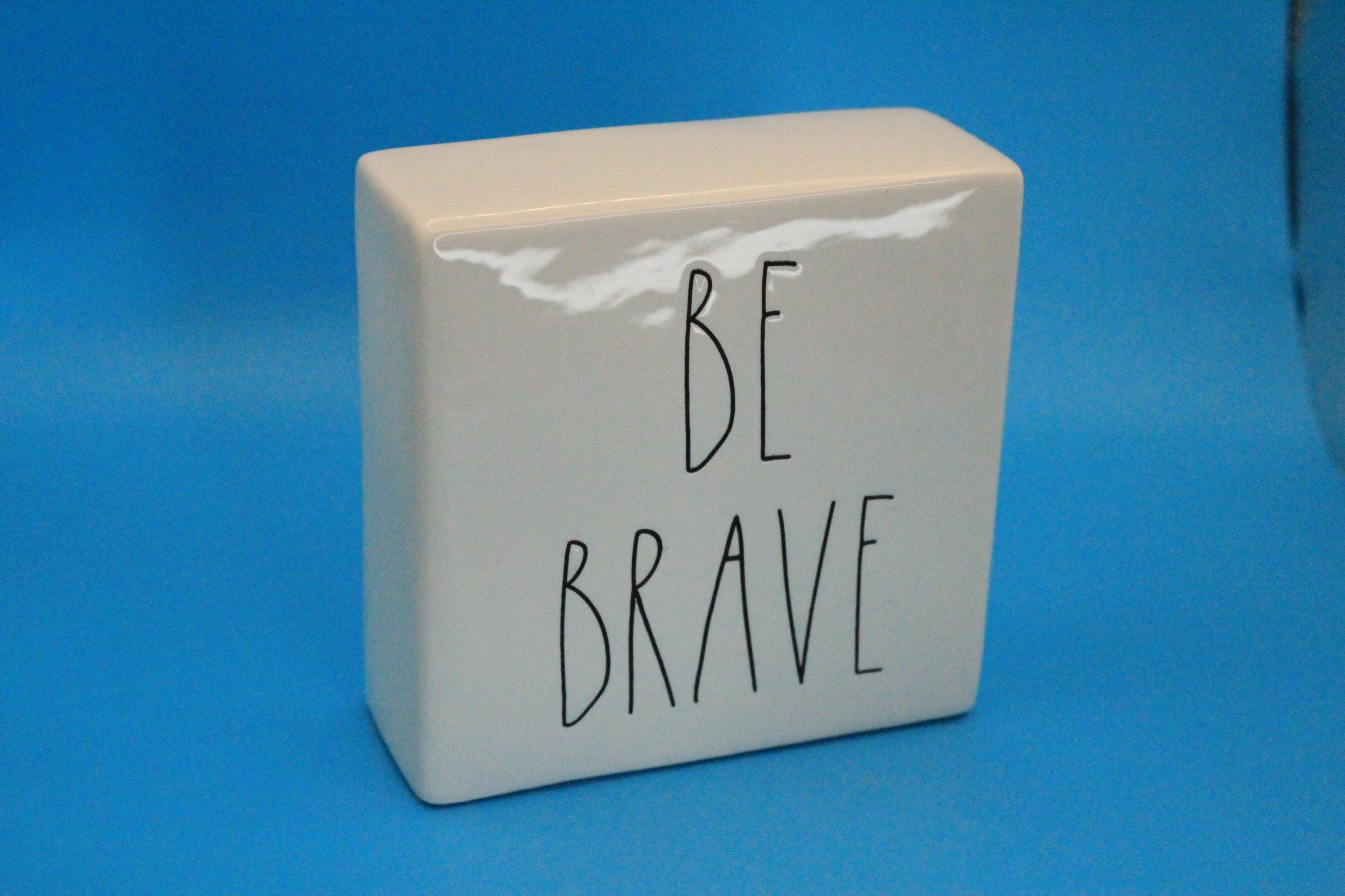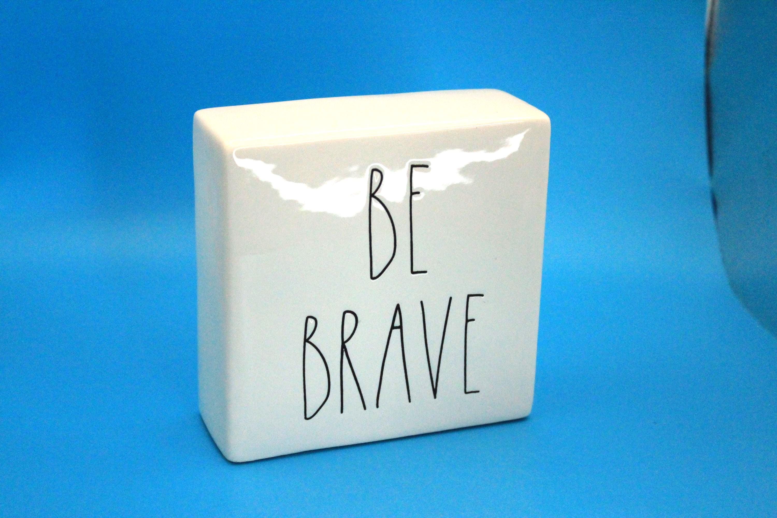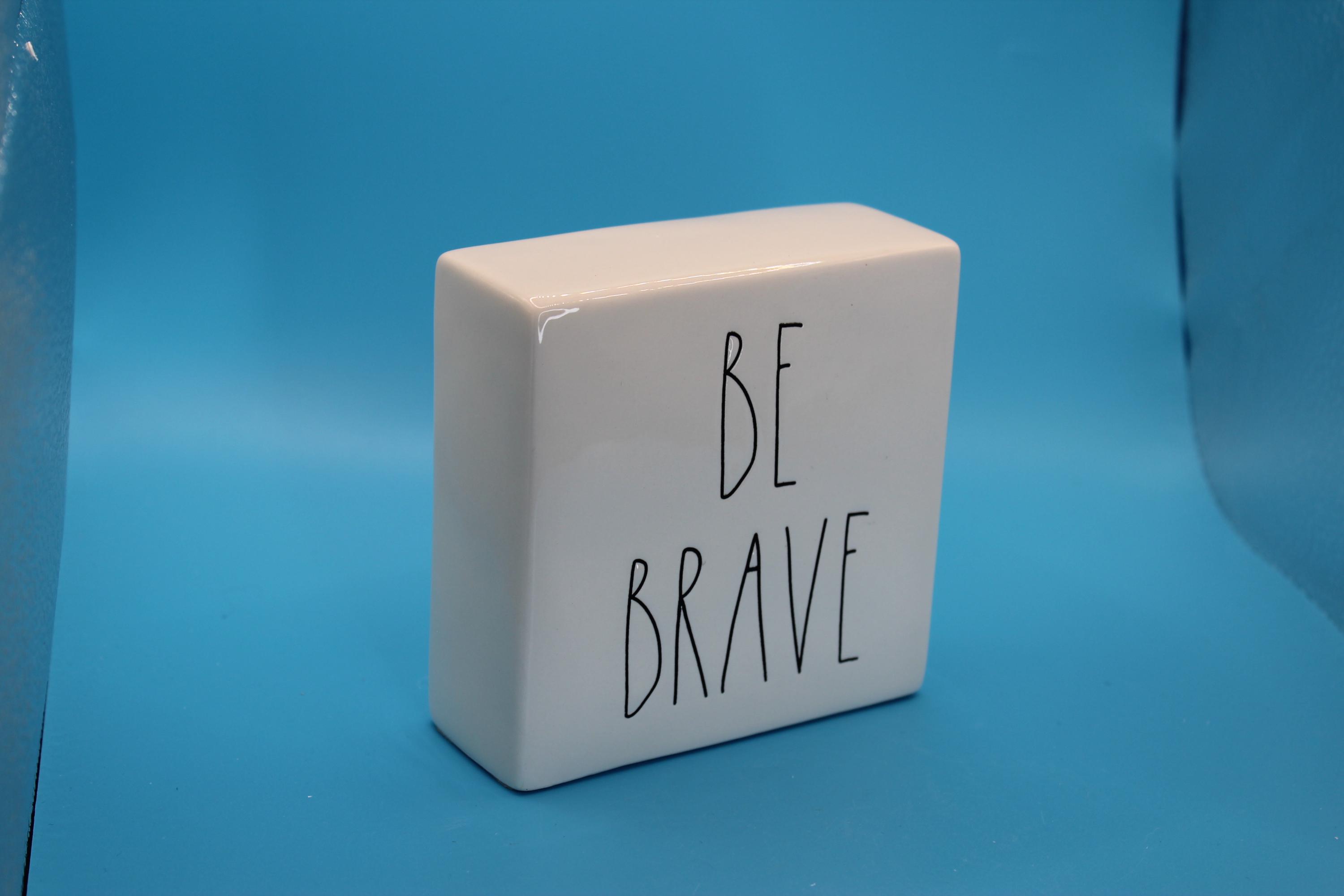 Rae Dunn Artisan Collection Decorative Paperweight or desk Decor "Be Brave/Work Hard". Classic black lettering on white backdrop, Inspirational message can be used in the office or at home. This measures 4 x4 x1.5 inches. Perfect preowned condition. Includes shipping.