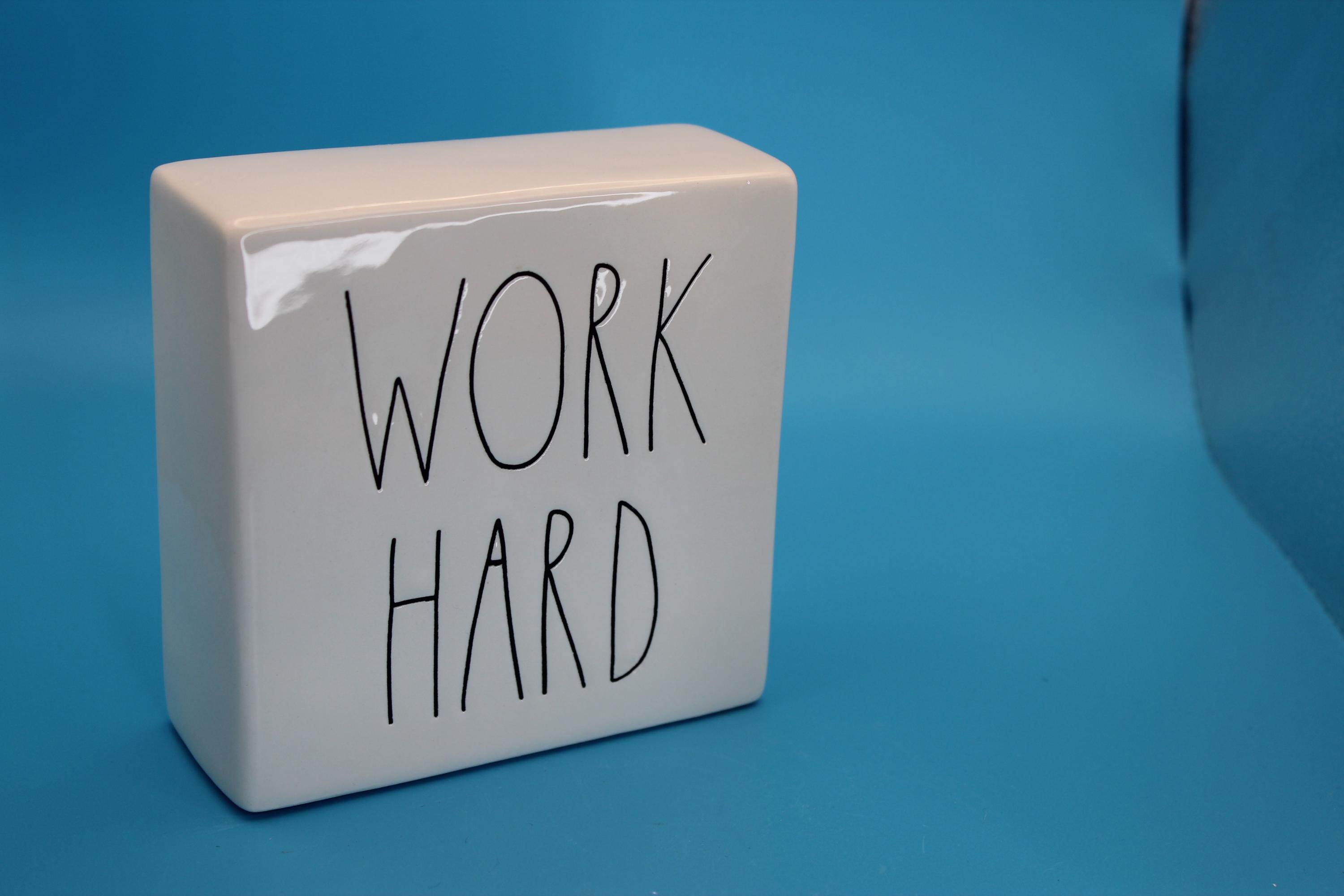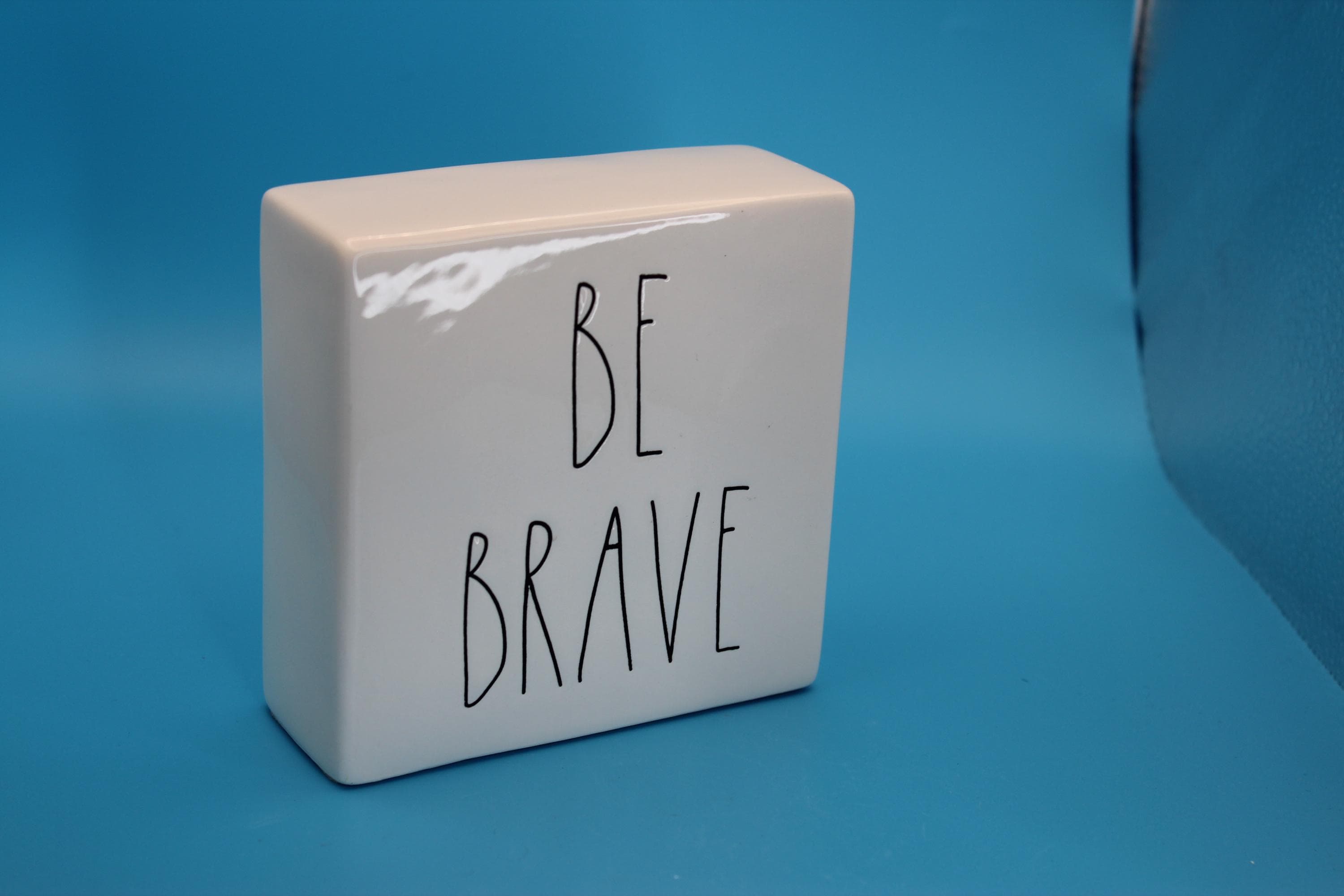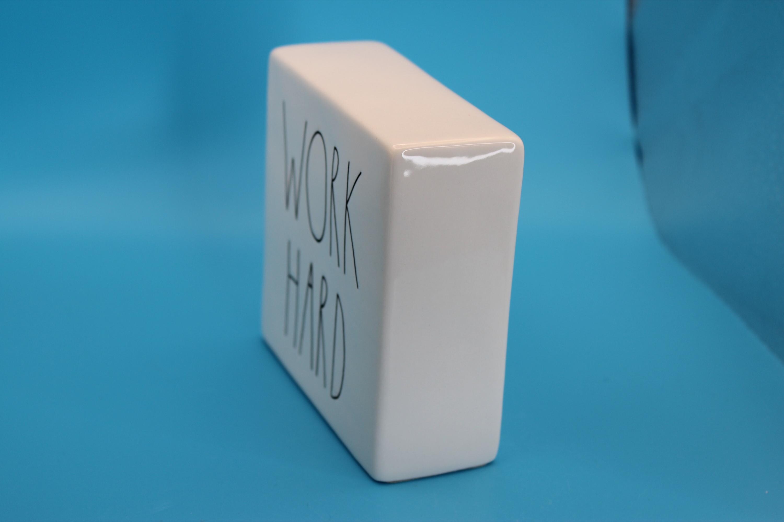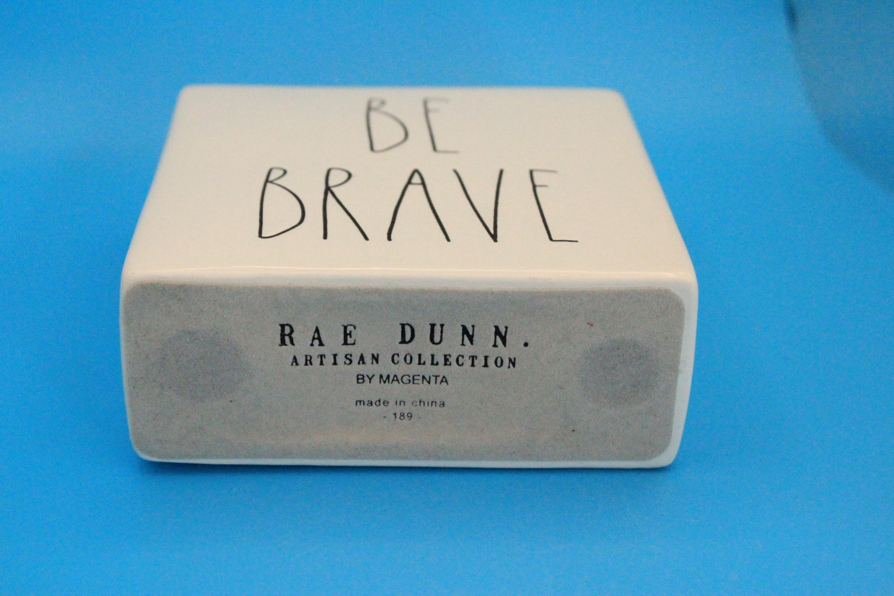 Rae Dunn Artisan Collection Decorative Paperweight or desk Decor "Be Brave/Work Hard". Classic black lettering on white backdrop, Inspirational message can be used in the office or at home. This measures 4 x4 x1.5 inches. Perfect preowned condition. Includes shipping.