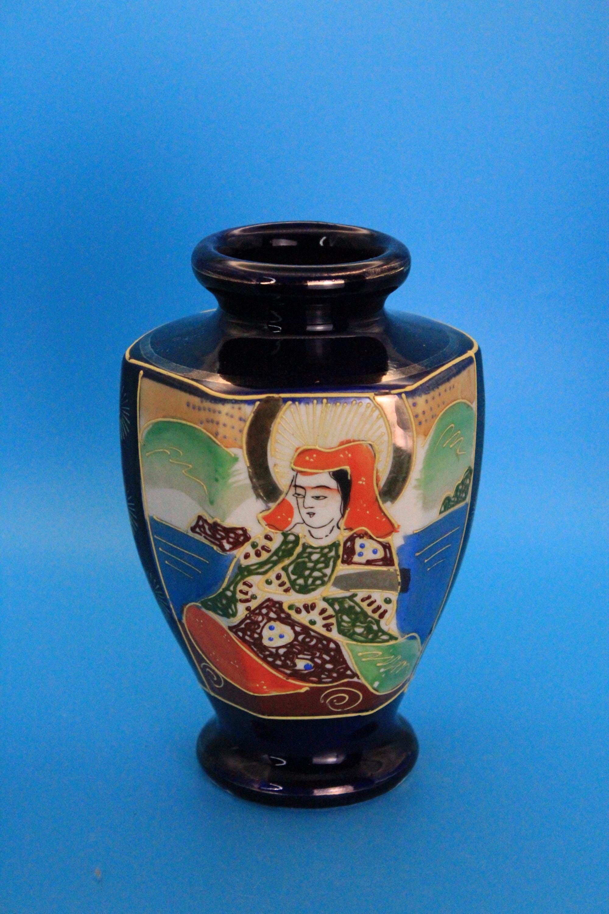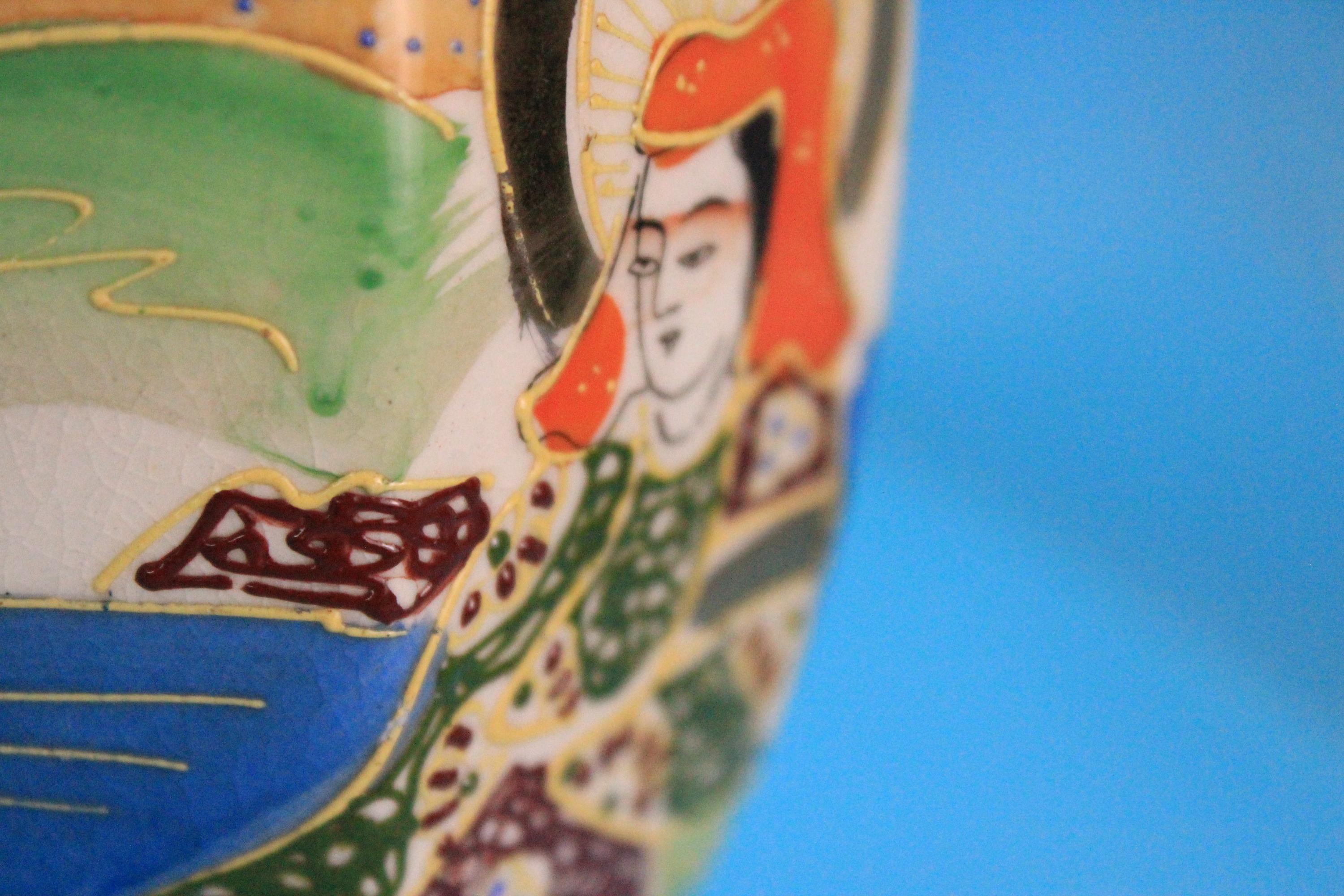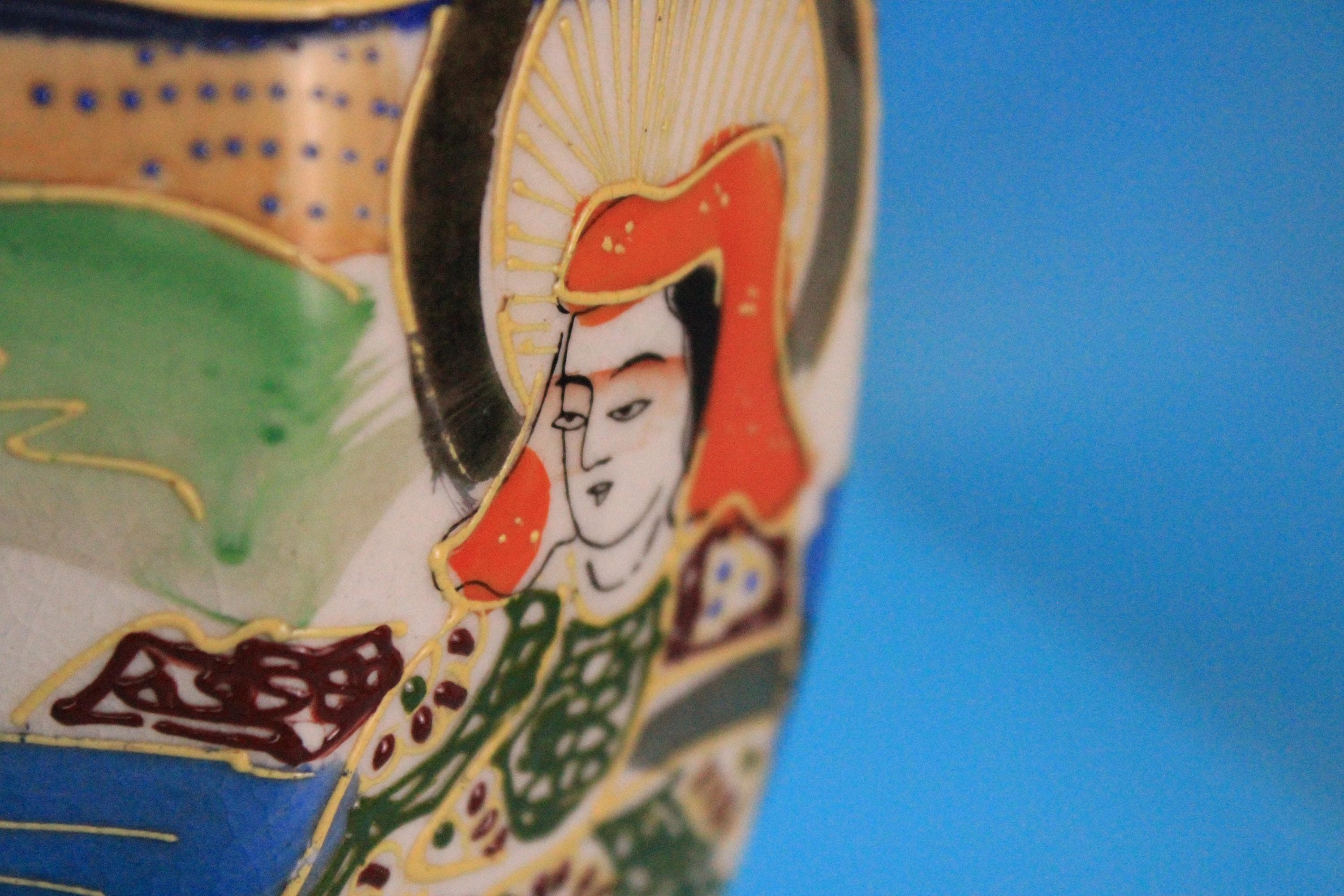 Hand painted with details, featuring Geisha. Satsuma ware became popular in the West after being showcased at the 1867 Paris exposition. It is earthenware pottery with cobalt blue glaze and hand painted, raised designs. Metallic gold trim. It is 6 inches tall and 4.5 inches in diameter.