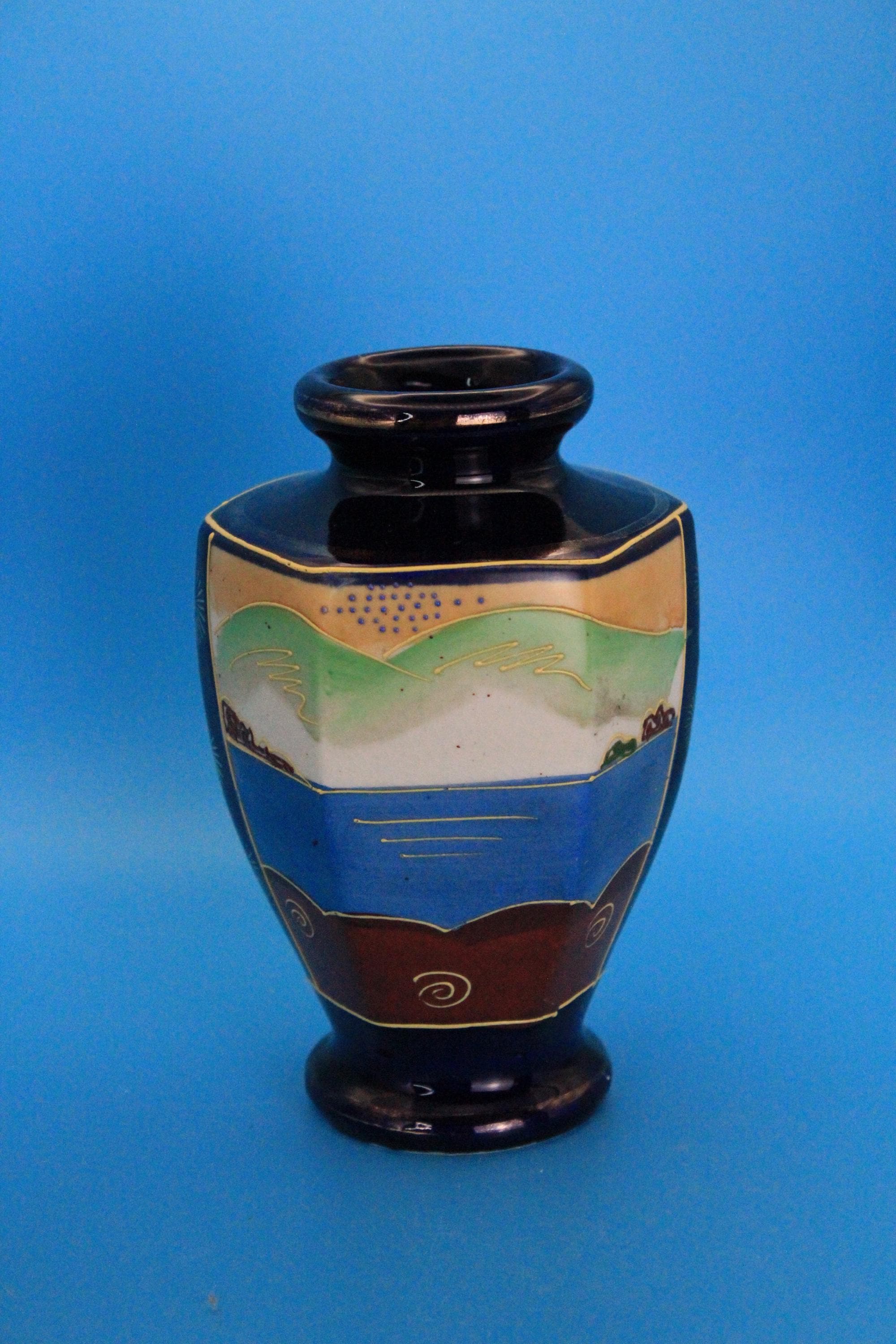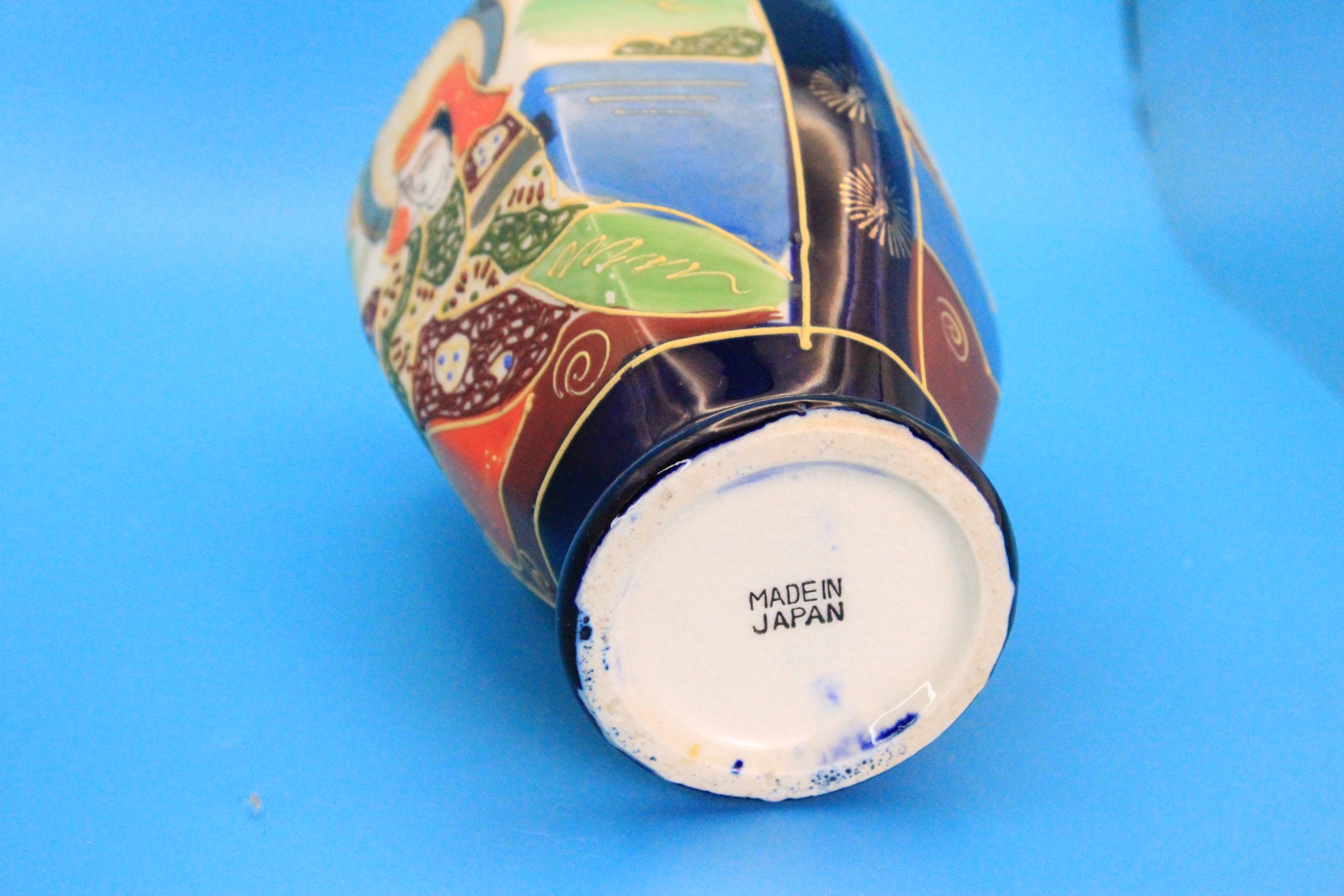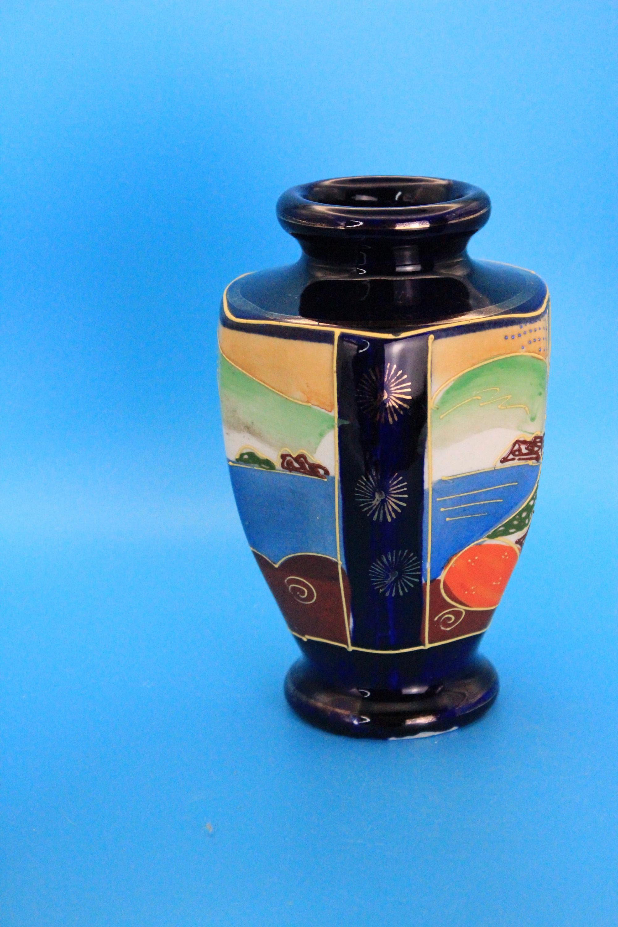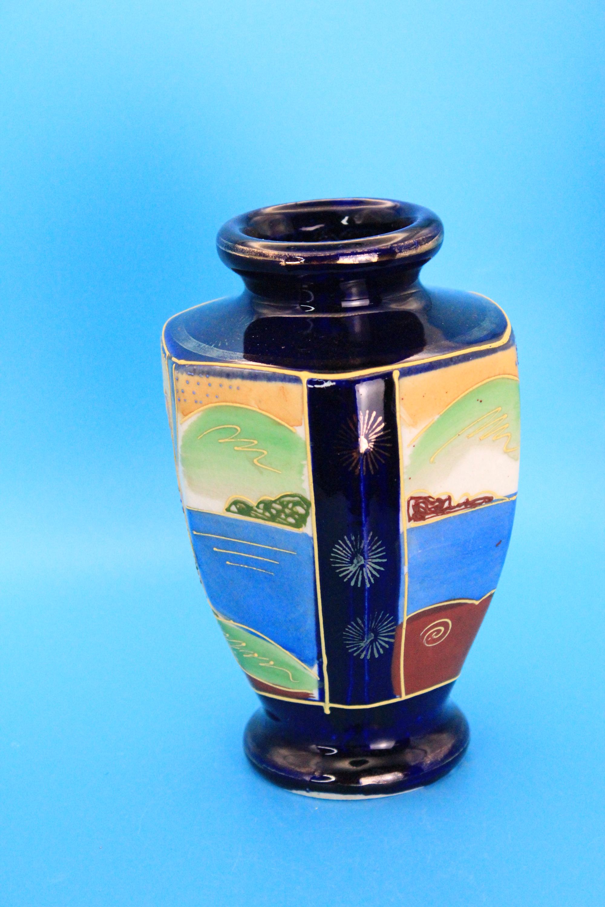 Hand painted with details, featuring Geisha. Satsuma ware became popular in the West after being showcased at the 1867 Paris exposition. It is earthenware pottery with cobalt blue glaze and hand painted, raised designs. Metallic gold trim. It is 6 inches tall and 4.5 inches in diameter.