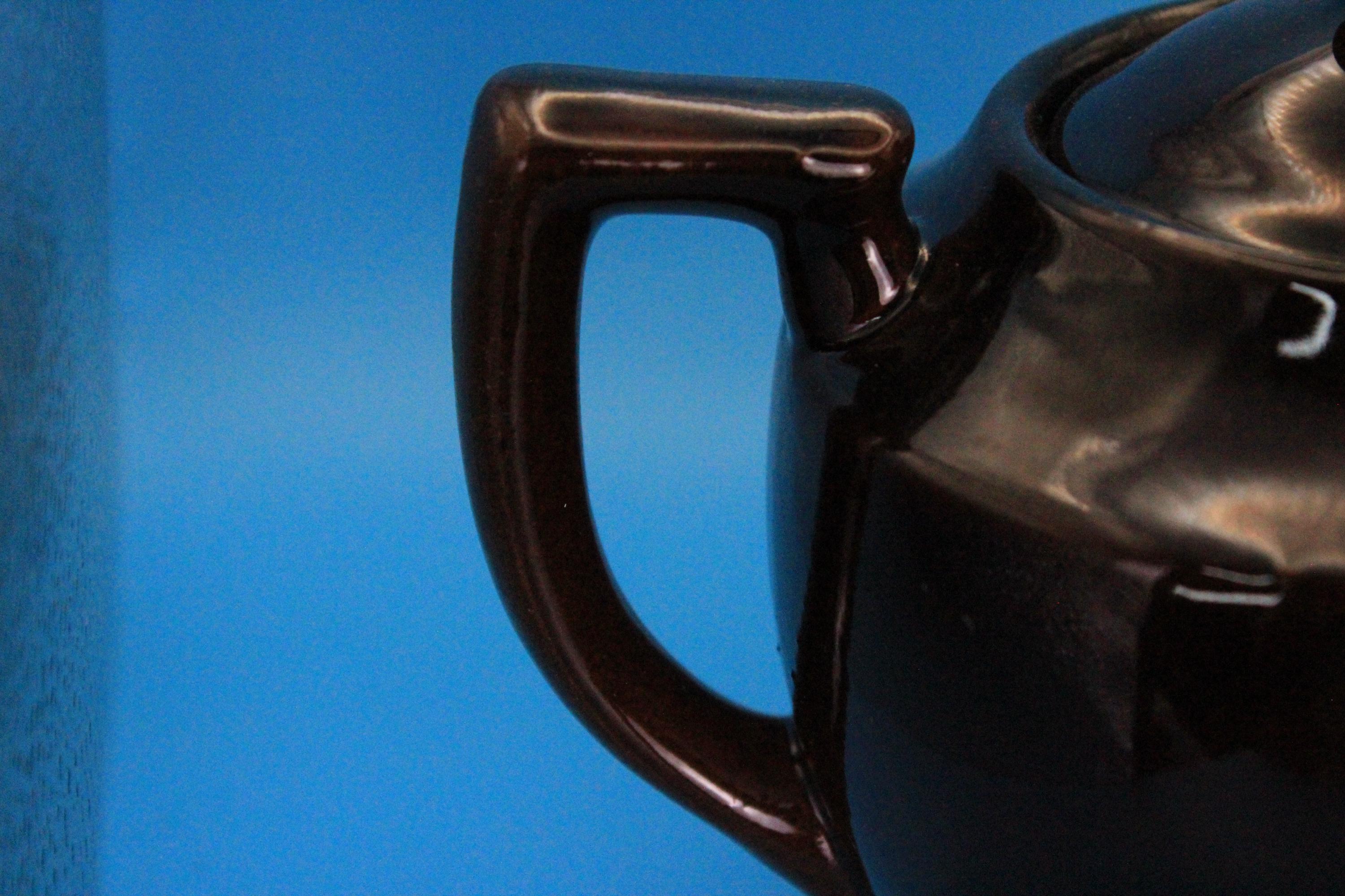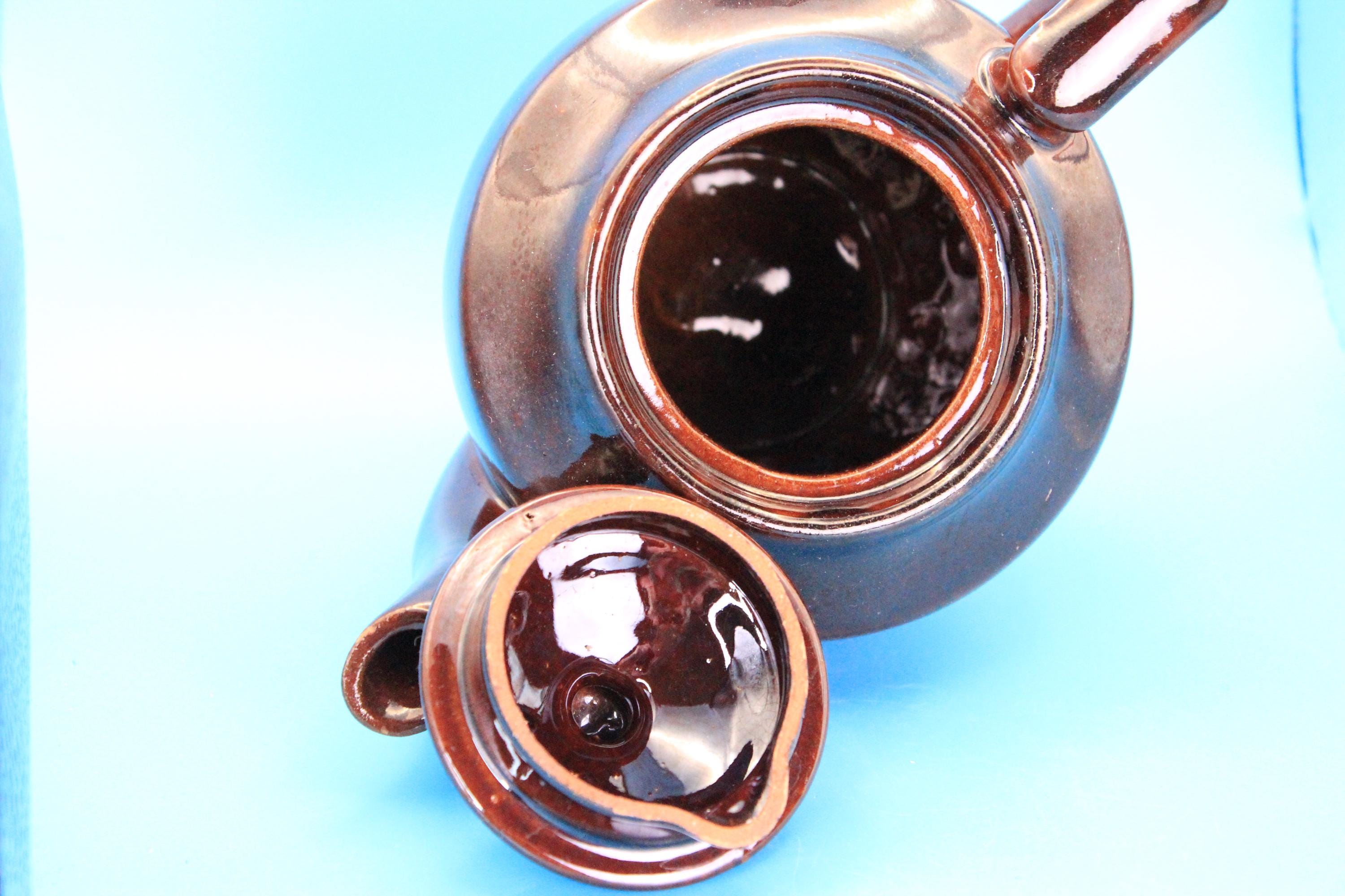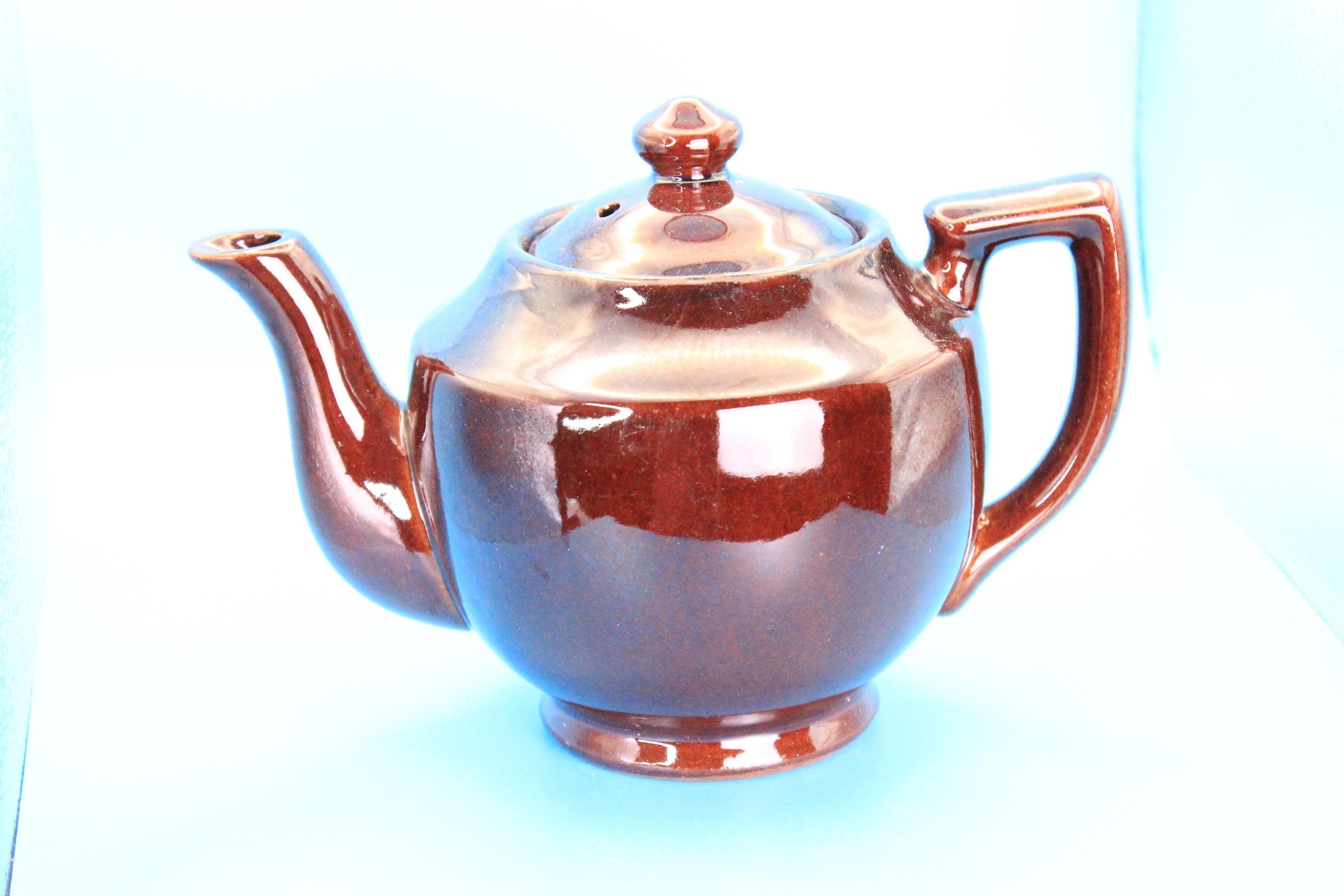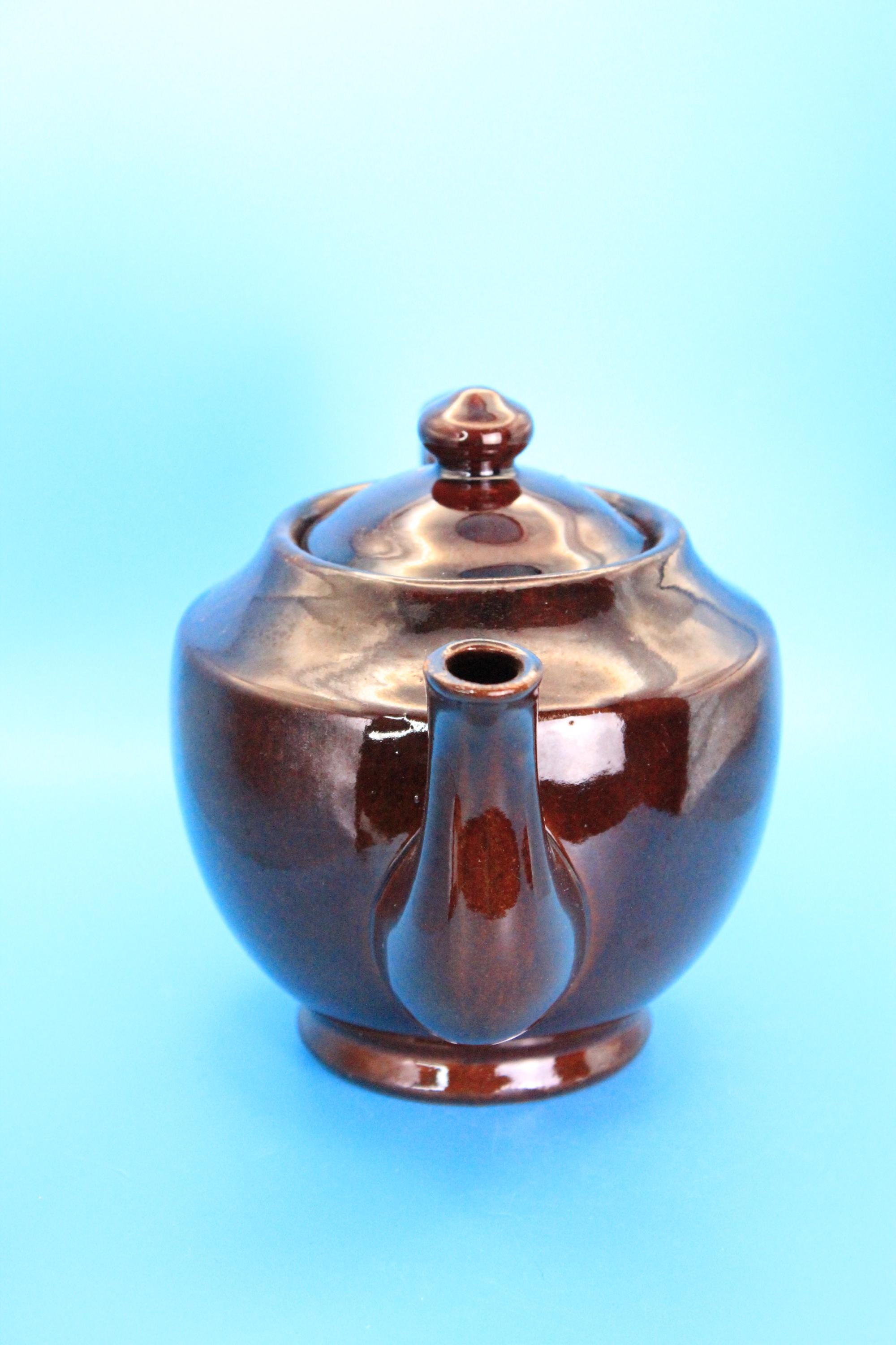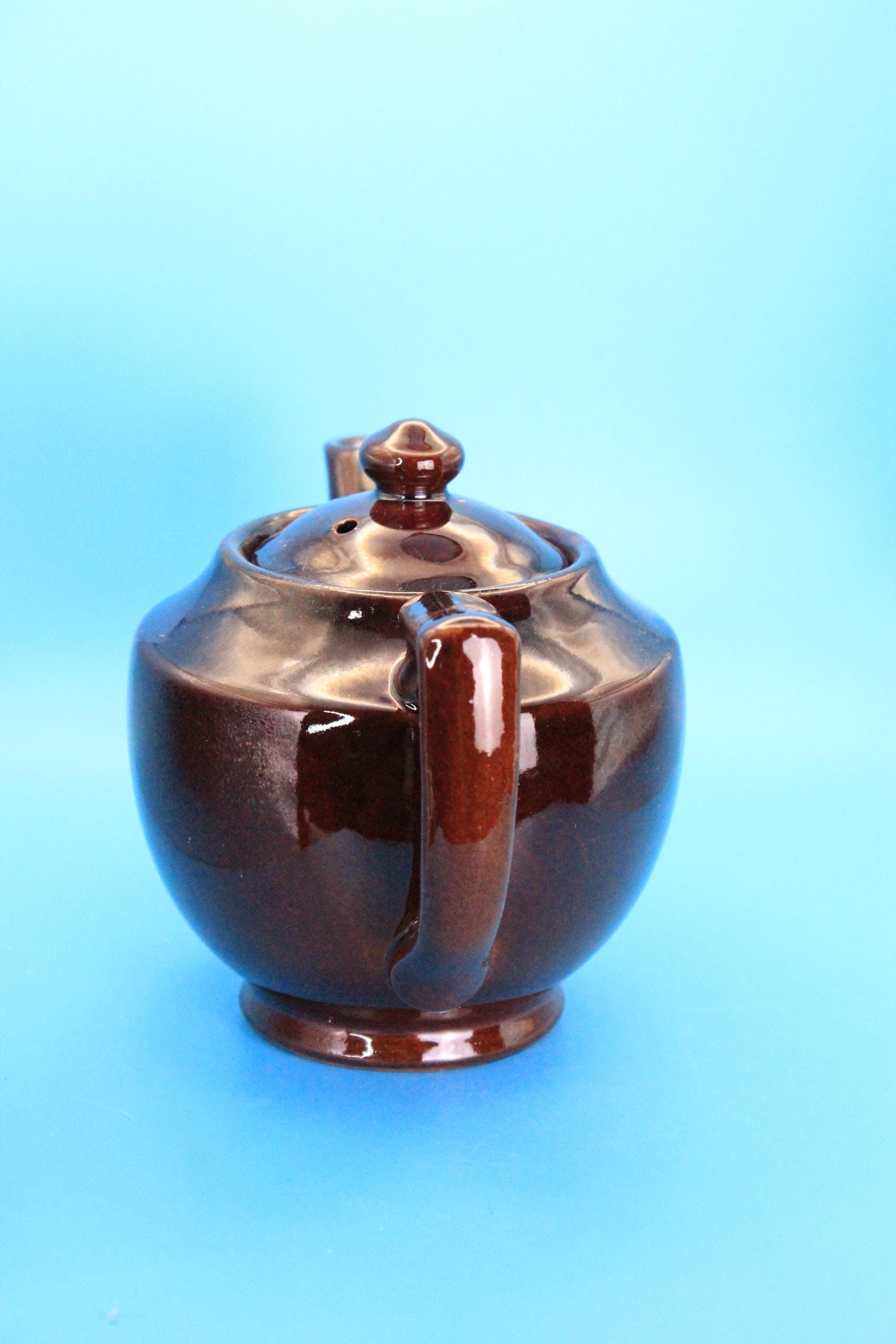 Brown Betty style vintage Japan teapot and lid. Classic Japanese styling. Redware clay with a rich brown glaze. "Japan" is embossed in the bottom of the pot. Measures 8 inches L x 5.5 inches deep x 5 inches tall. Very minor chip on the tip of the spout (please look at photos). Excellent vintage pre-owned condition.