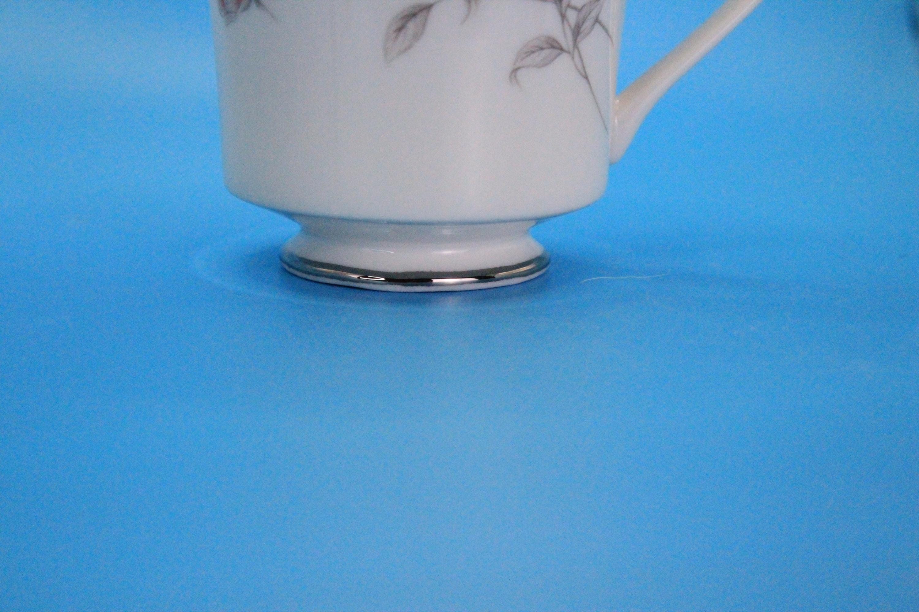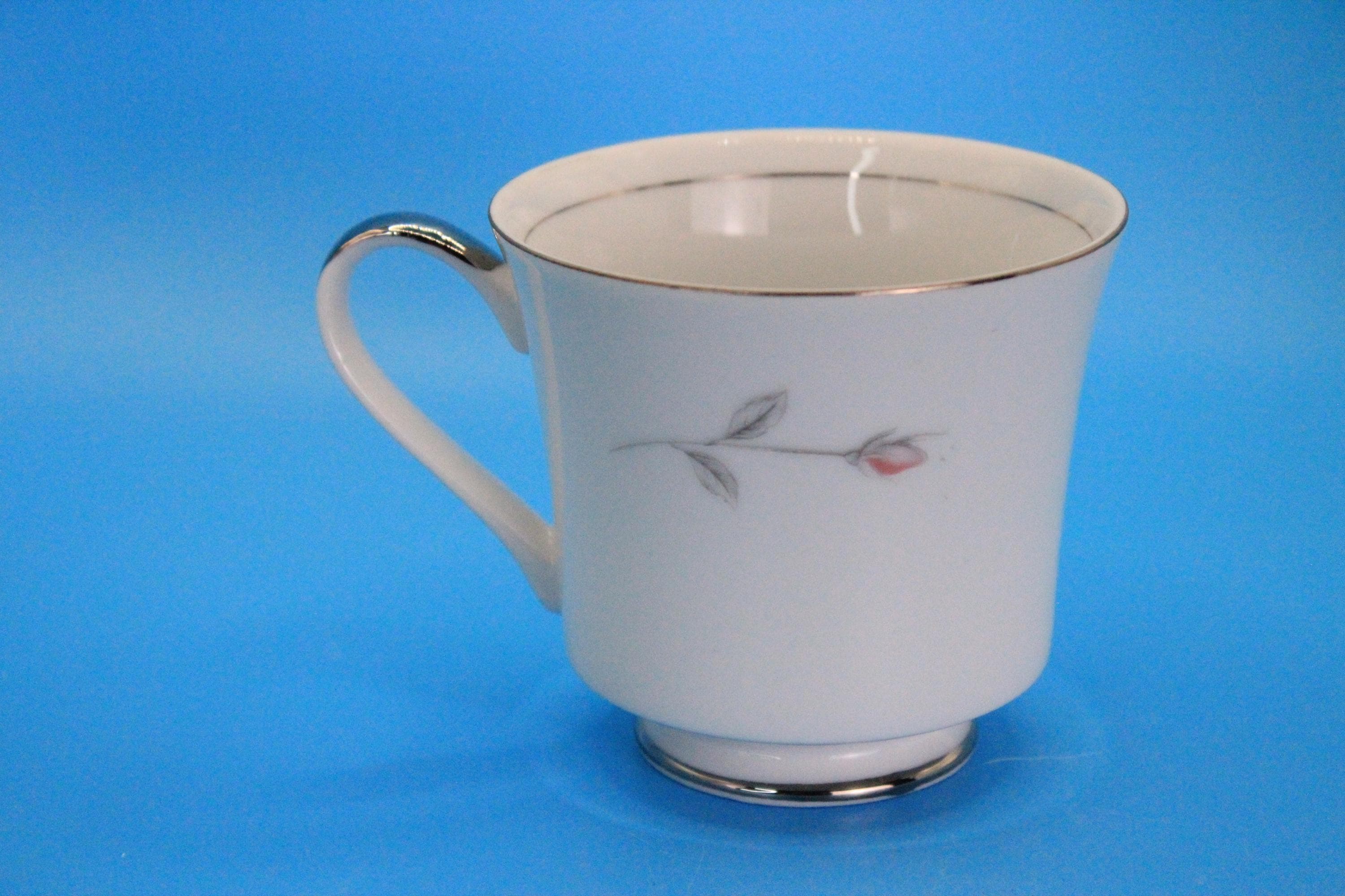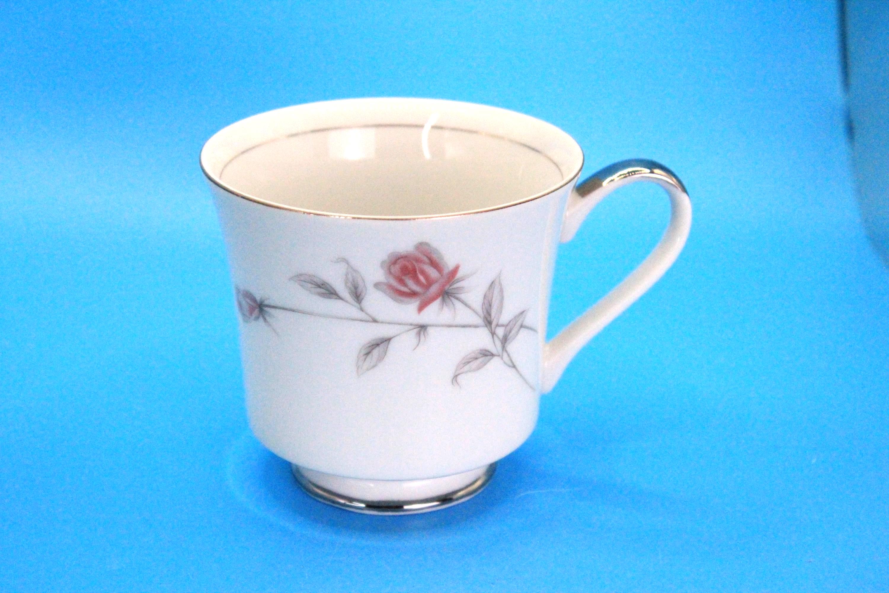 Replacement Footed Tea Coffee Cup, fine china, Lasting Rose by Vern Forbes, Japan. Beautifully delicate rose design on white glossy finish, is embellished with metallic silver on handle, rim, and the footed pedestal. It measures 3 5/16 in diameter and is 3 1/8 inches tall. It is in pristine pre-owned condition.