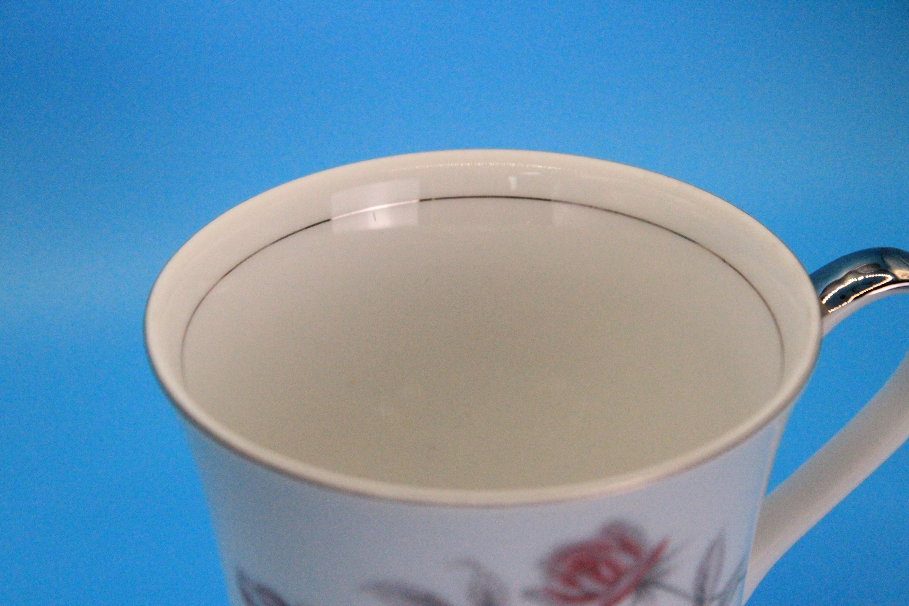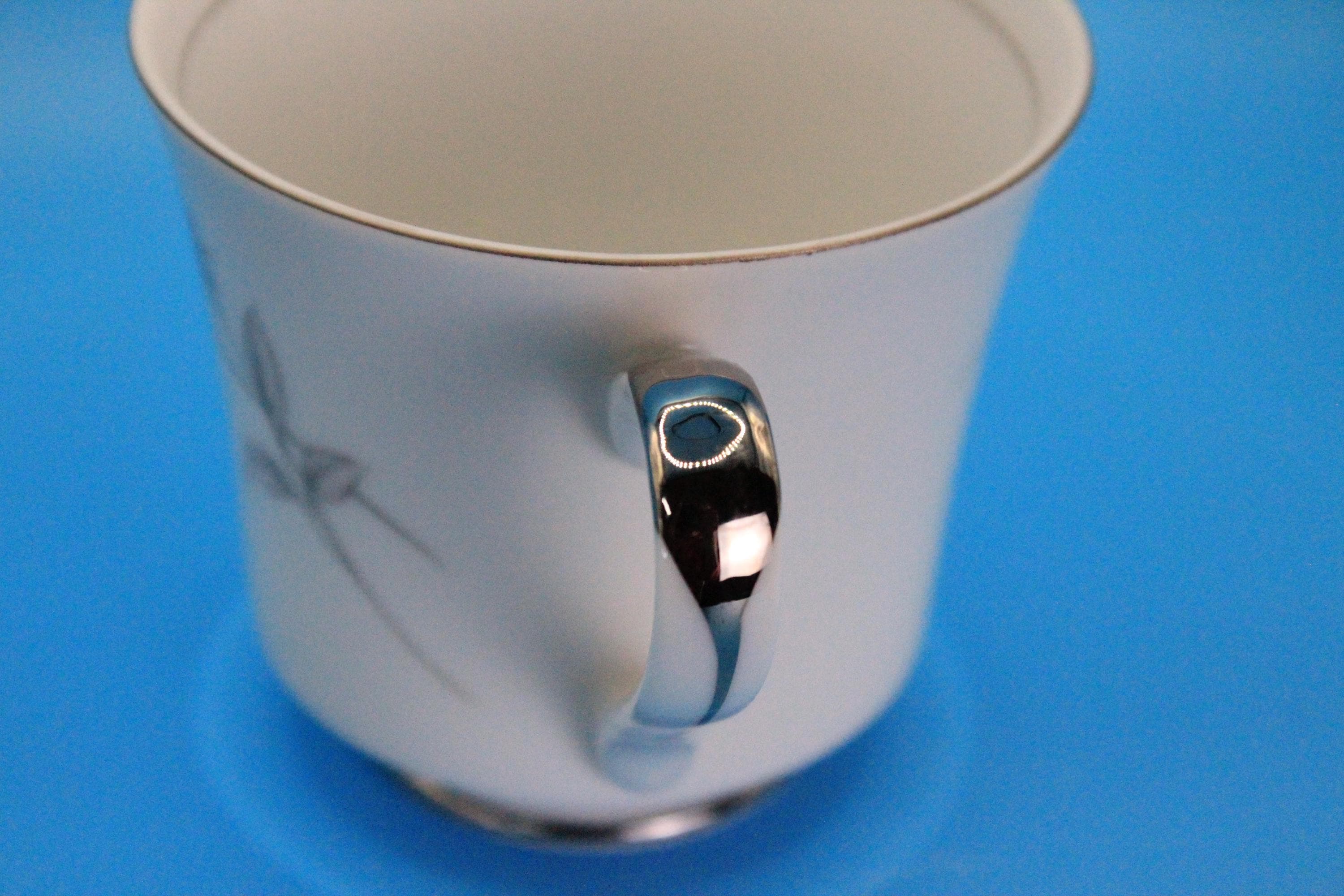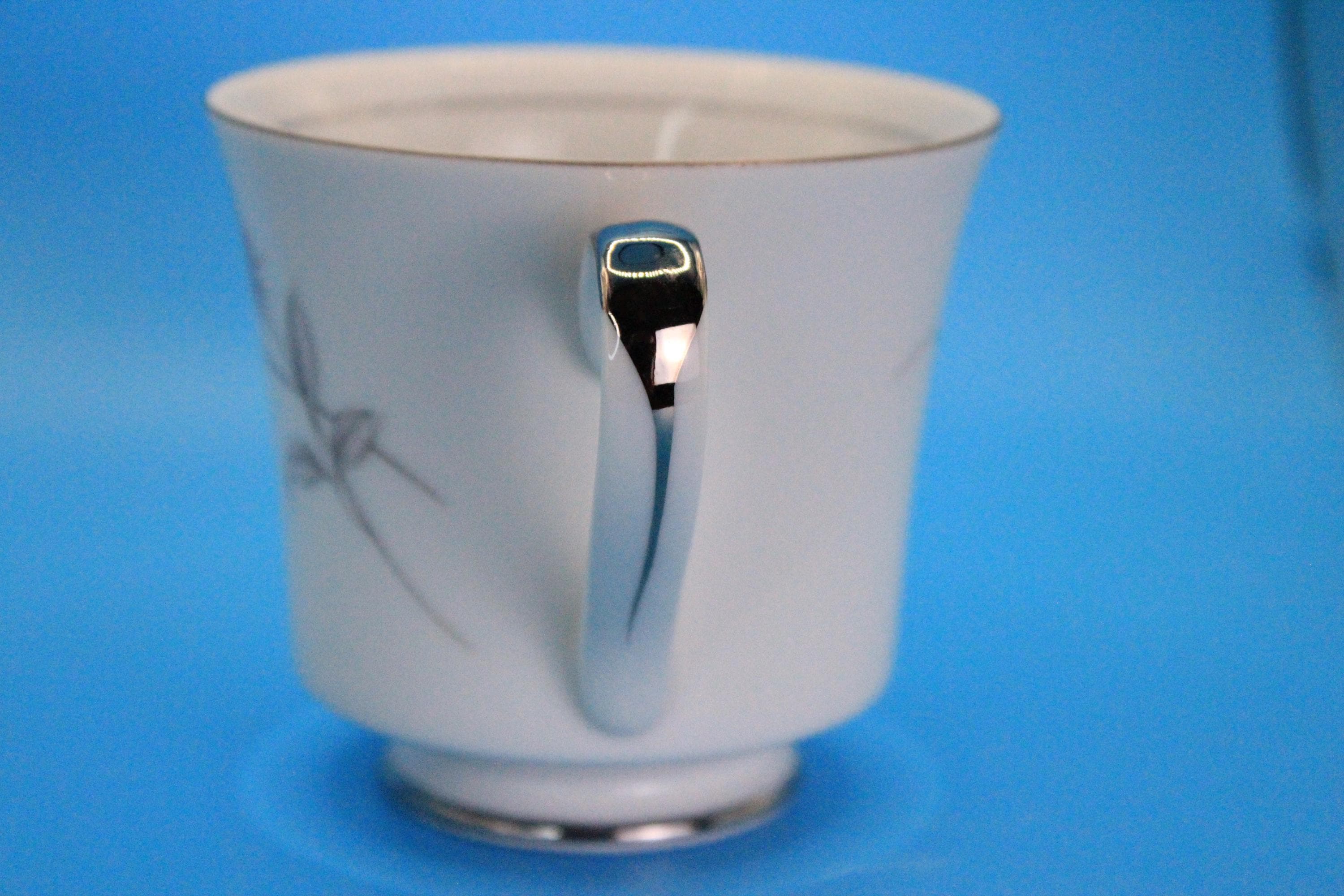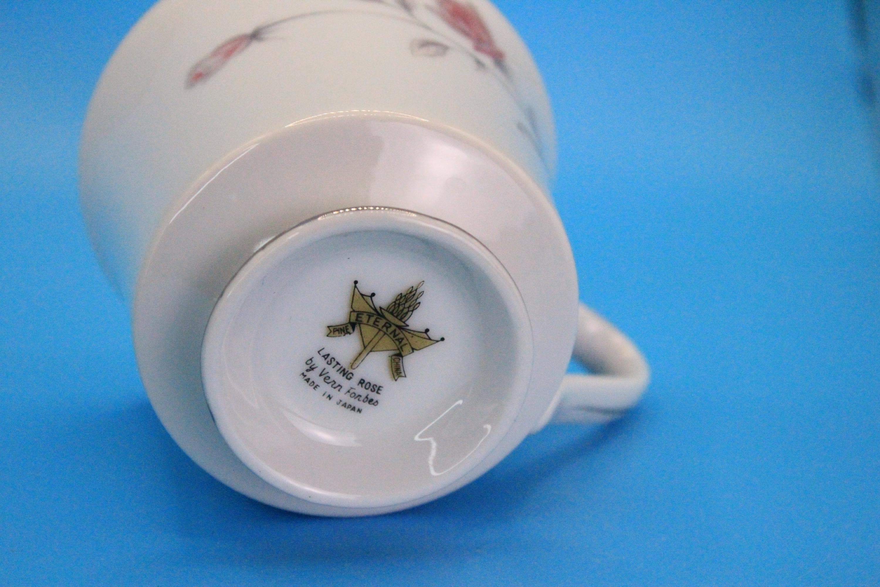 Replacement Footed Tea Coffee Cup, fine china, Lasting Rose by Vern Forbes, Japan. Beautifully delicate rose design on white glossy finish, is embellished with metallic silver on handle, rim, and the footed pedestal. It measures 3 5/16 in diameter and is 3 1/8 inches tall. It is in pristine pre-owned condition.