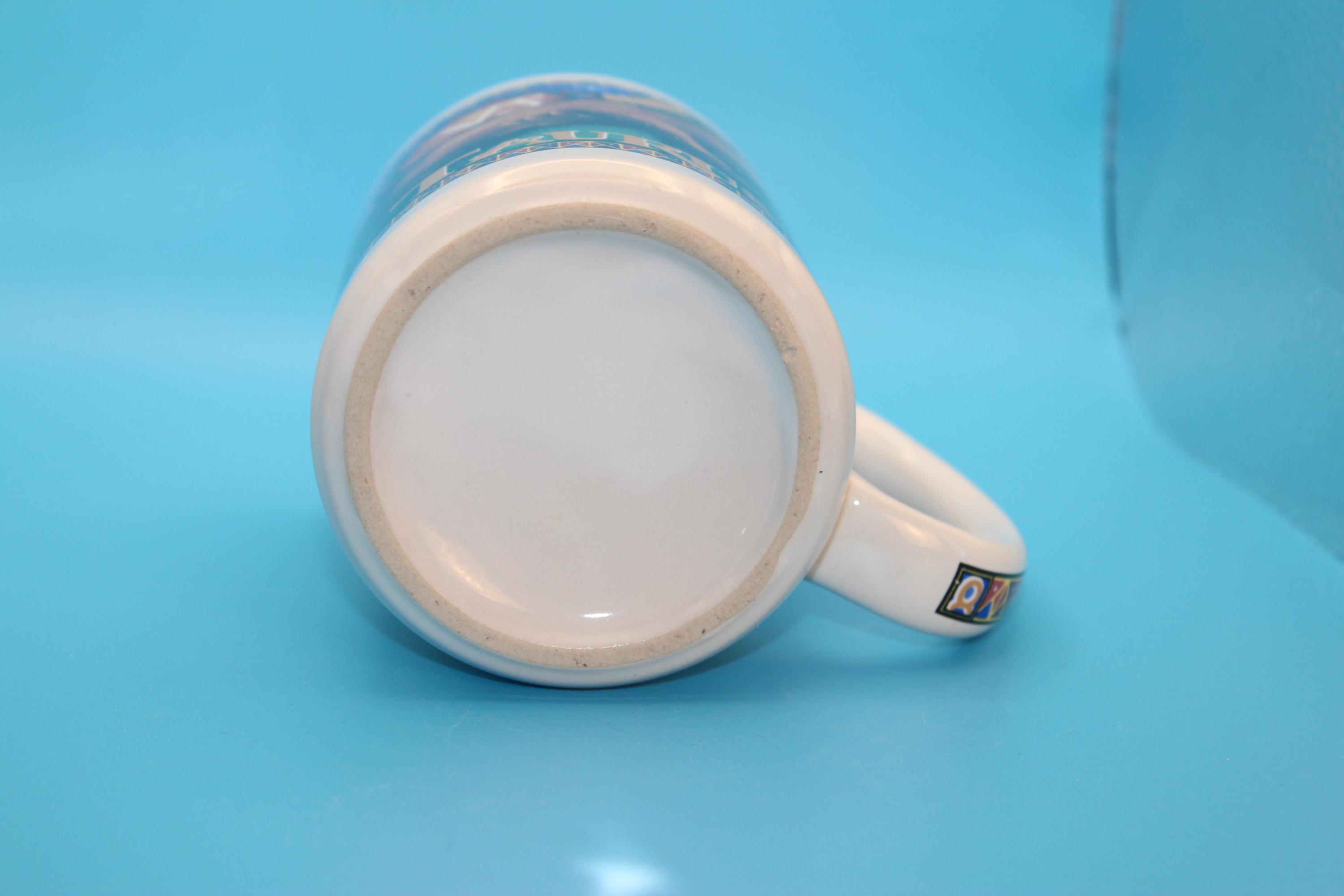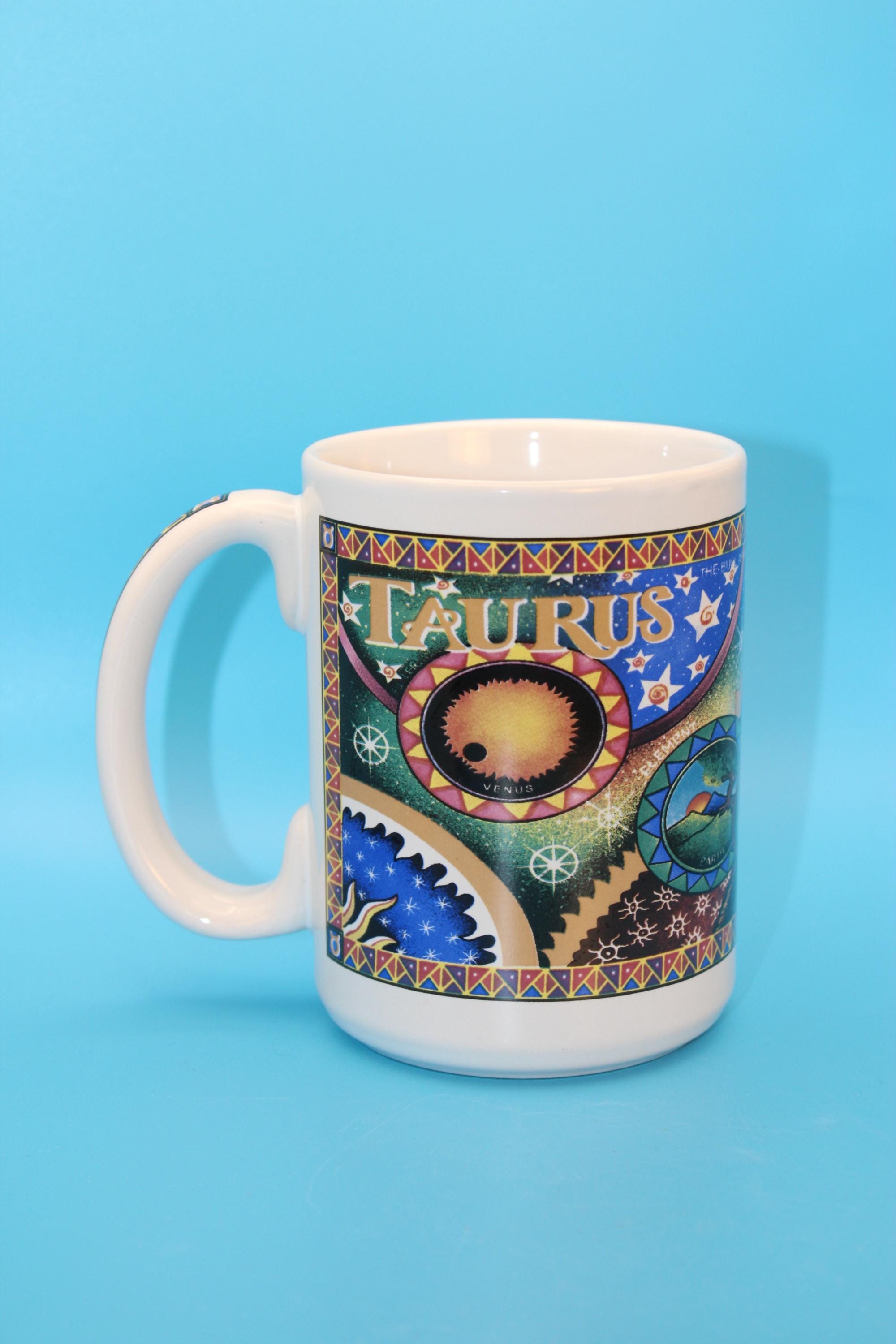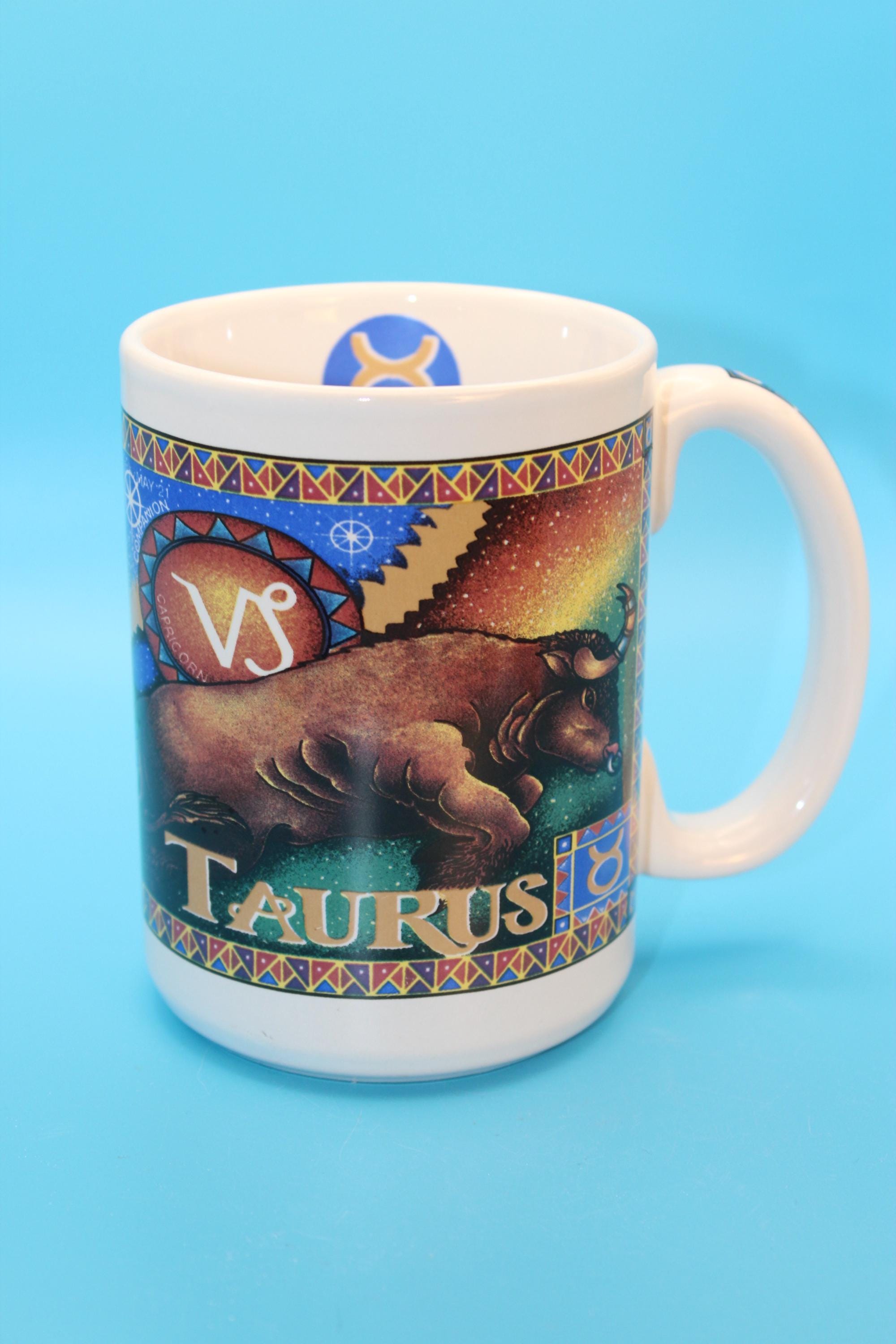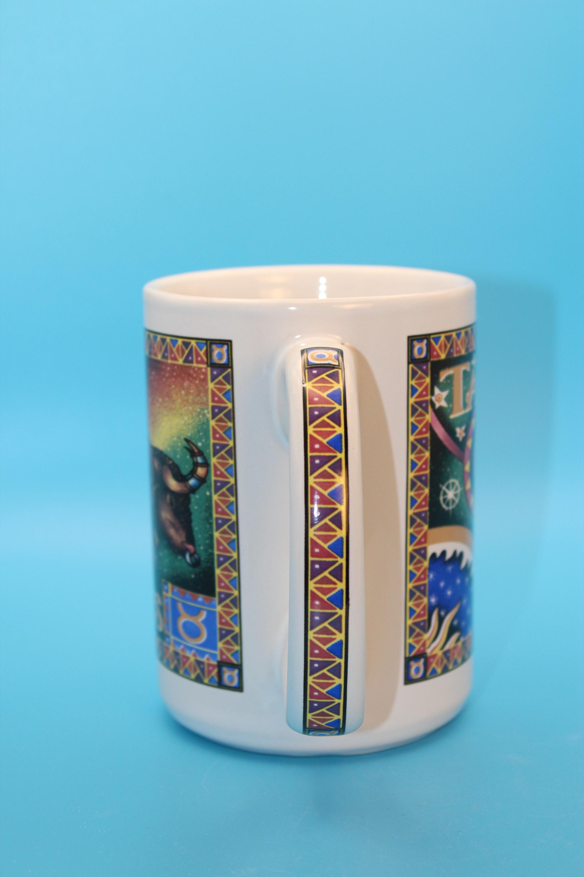 Novelty Coffee Tea Mug features TAURUS the bull with Colorful Graphics showing stars and planets. These graphics and glaze on this mug are in pristine pre-owned condition. Holds 16 oz of your favorite beverage.