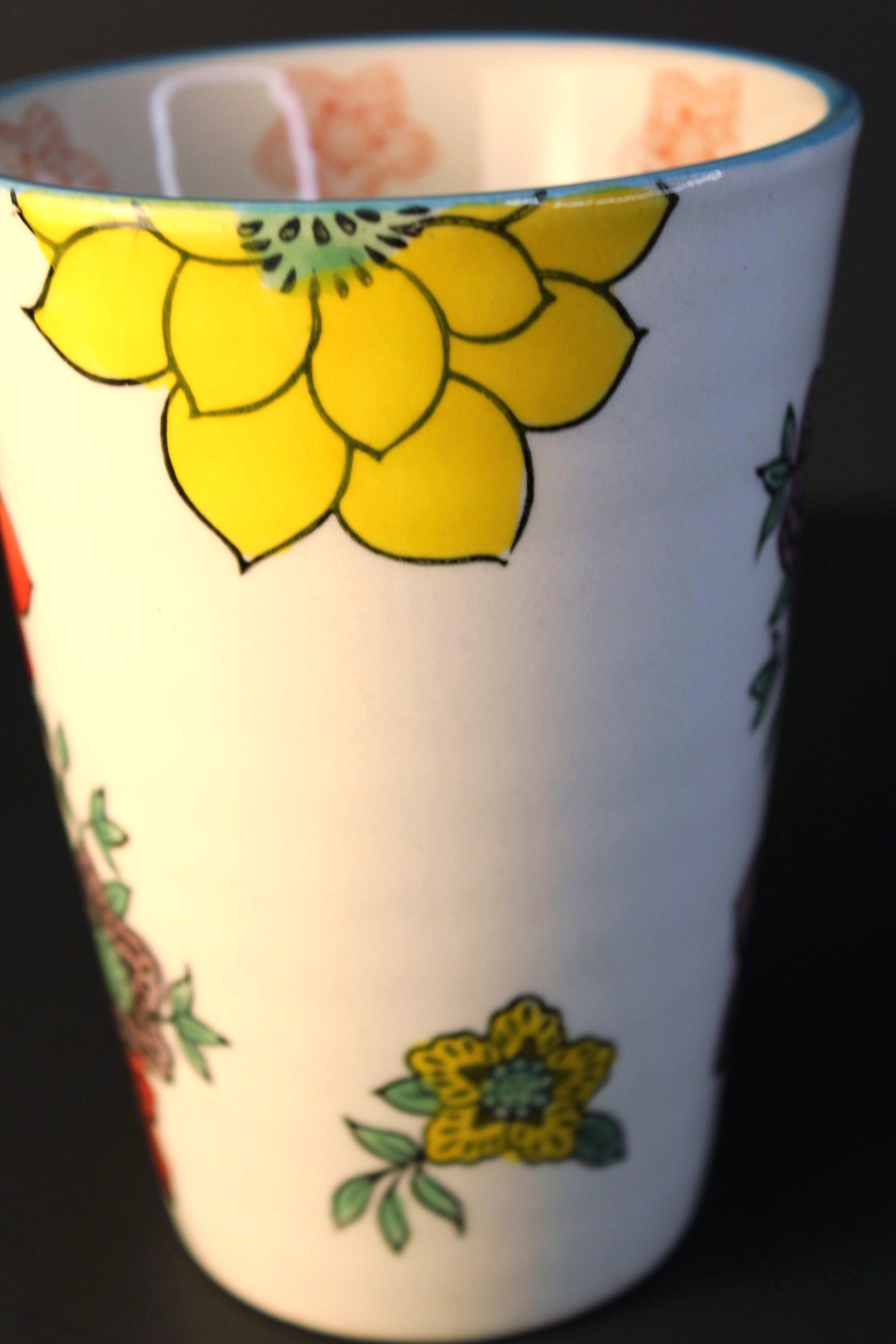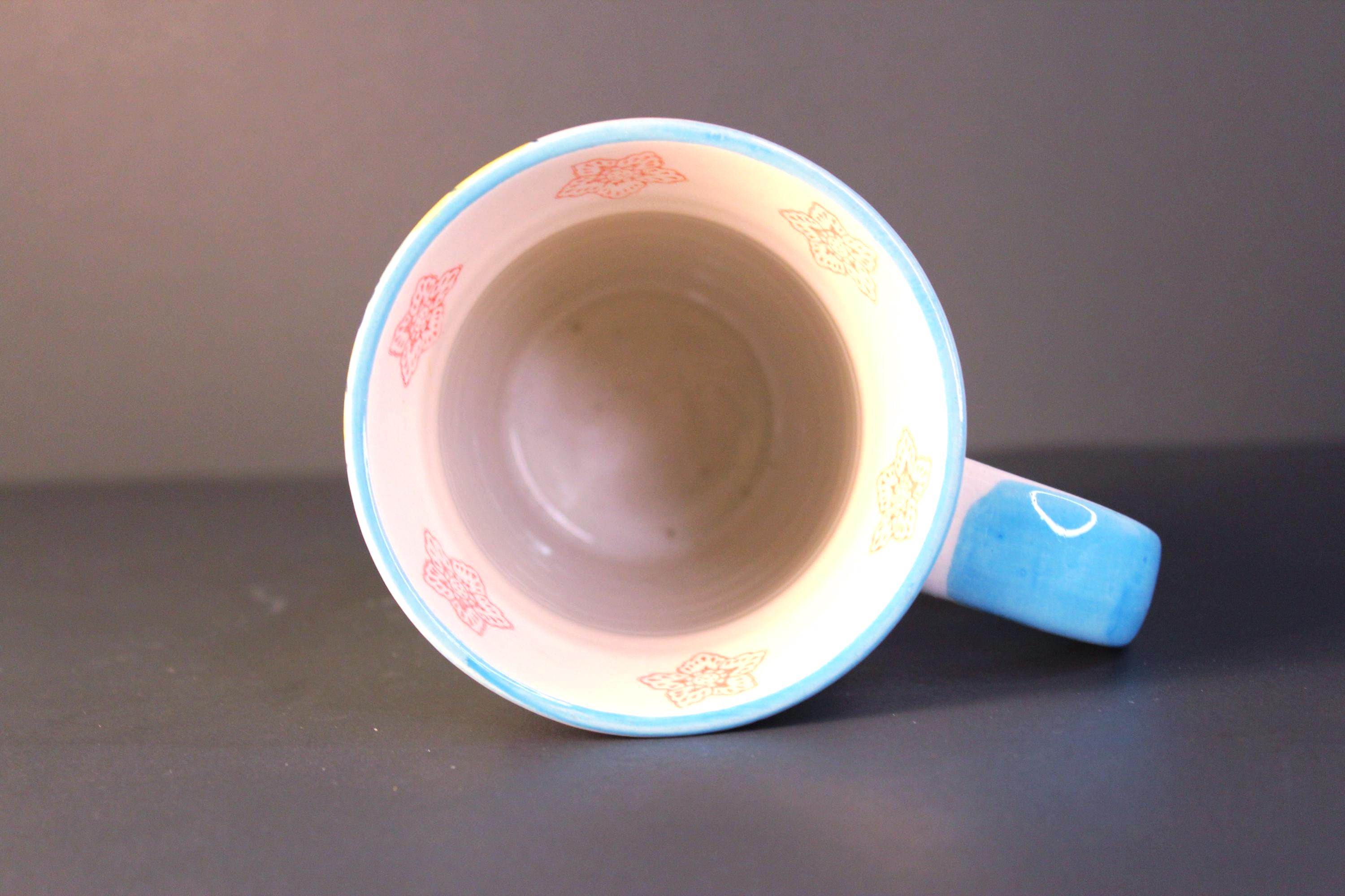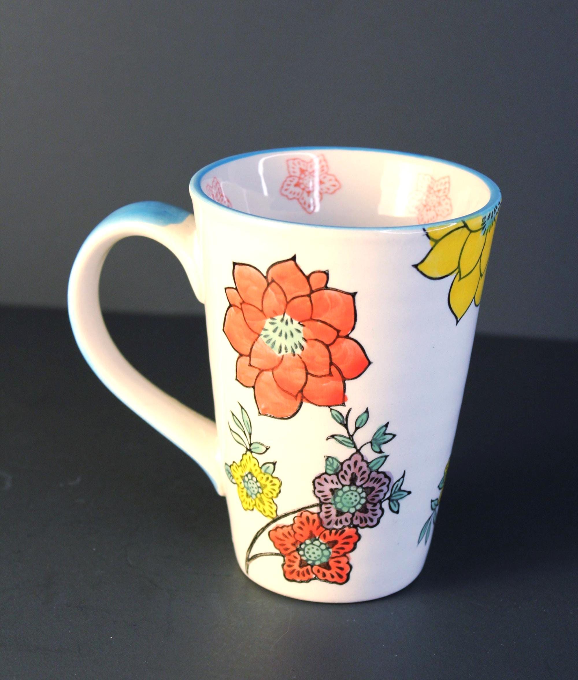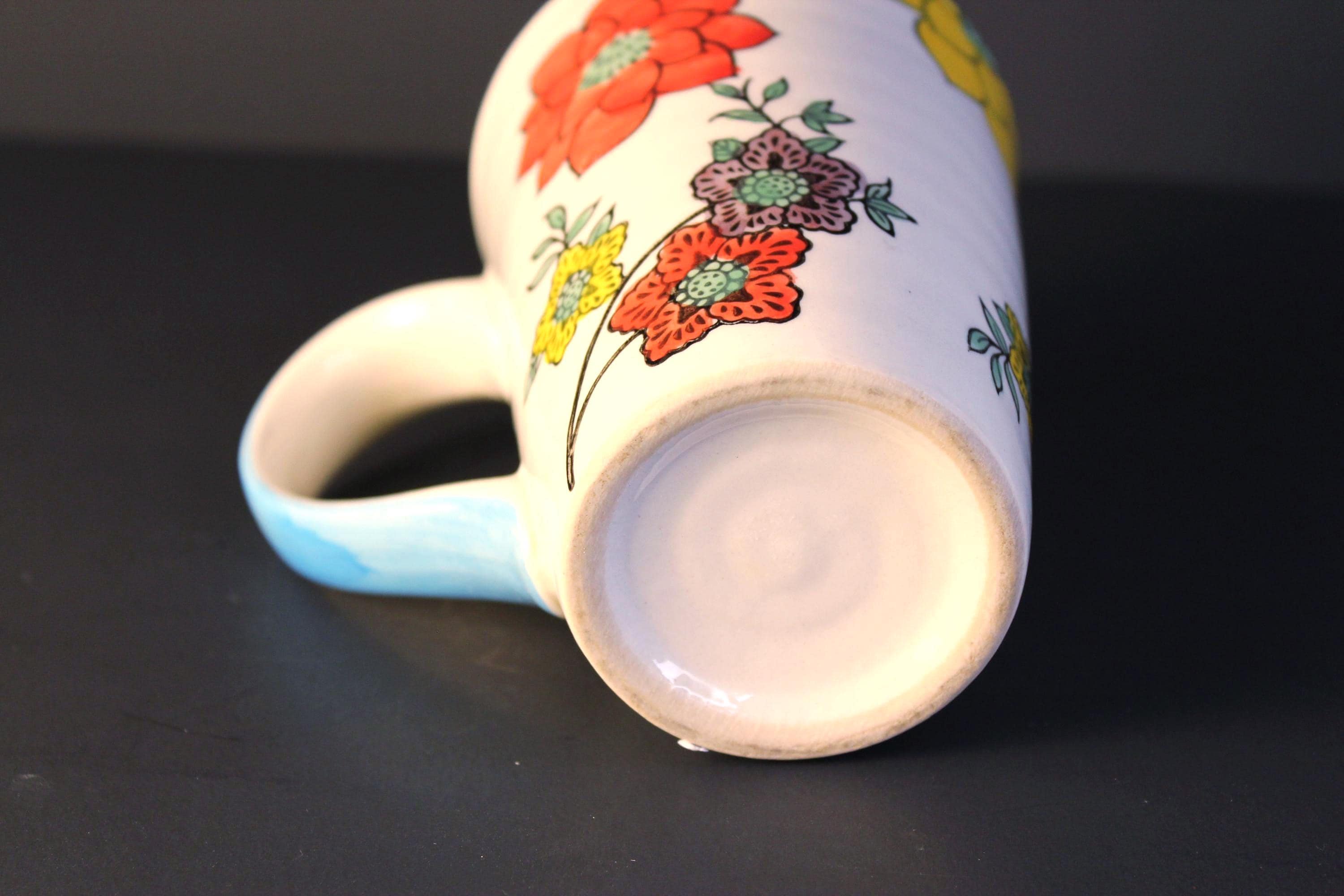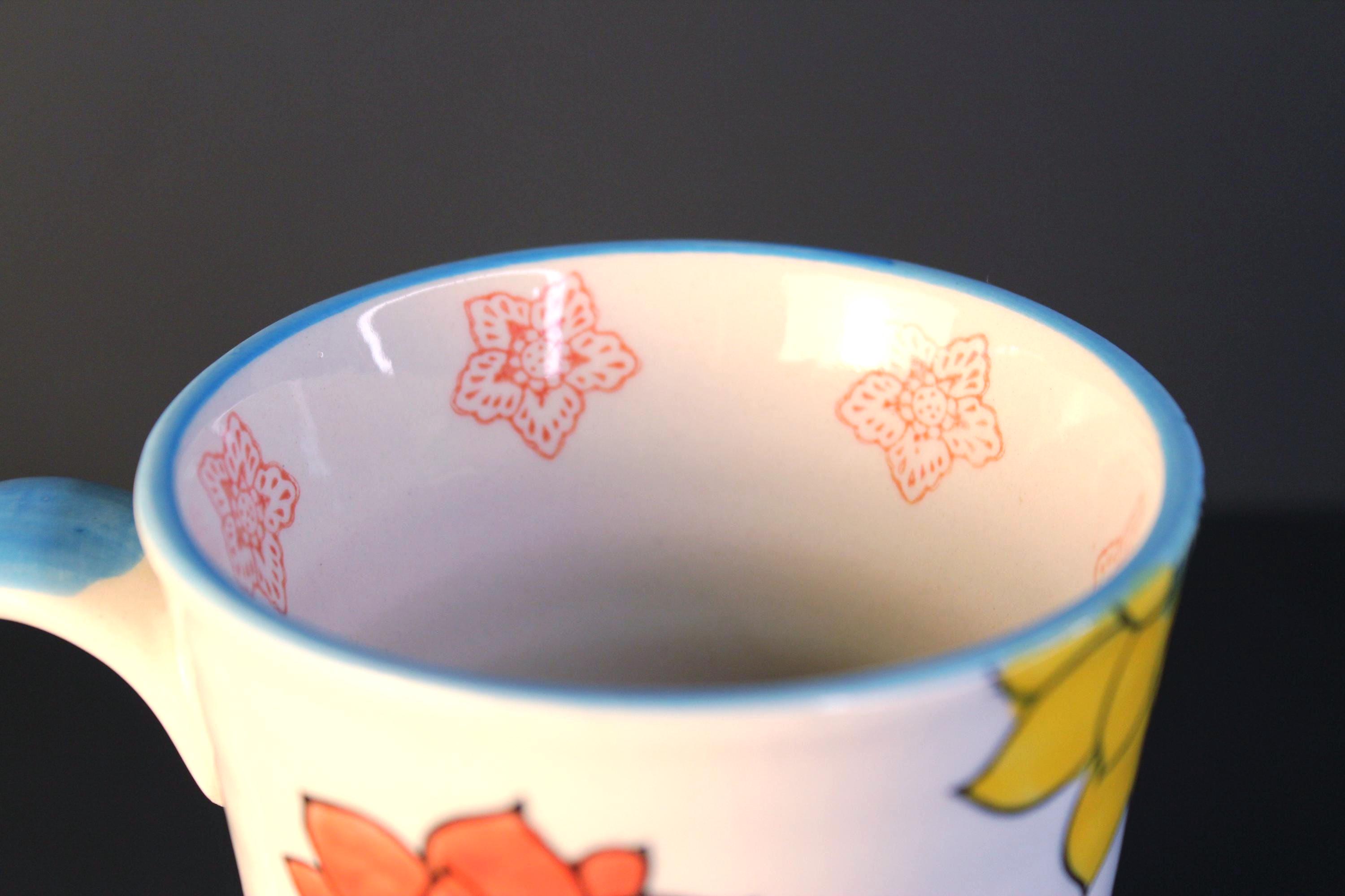 Gorgeous and cheerful pottery mug for your favorite beverage! 5.25 tall and 3.4" wide at rim. The pottery wheel rims can be seen if you look close, so cool :-). It has very pretty florals in red, purple, and yellow outlined in black. It has fun red/orange stamped flowers just inside the rim. The background color is a very nice off-white/cream glossy glaze. Nice large handle, which is painted blue, like the rim of the mug. This is a lovely mug that would be a treat for yourself as well as an excellent gift. It is in excellent pre-owned condition.