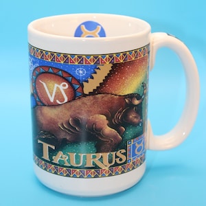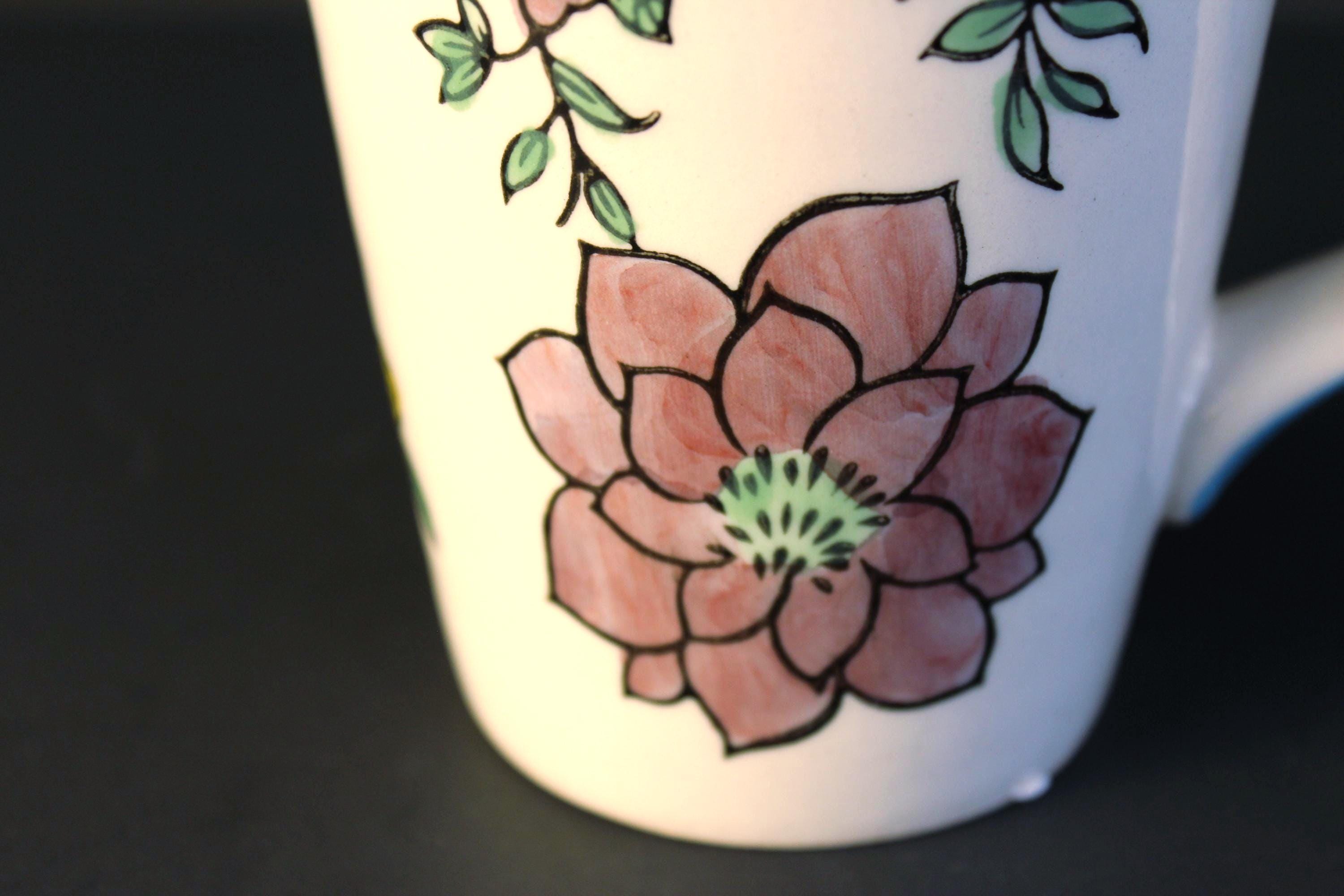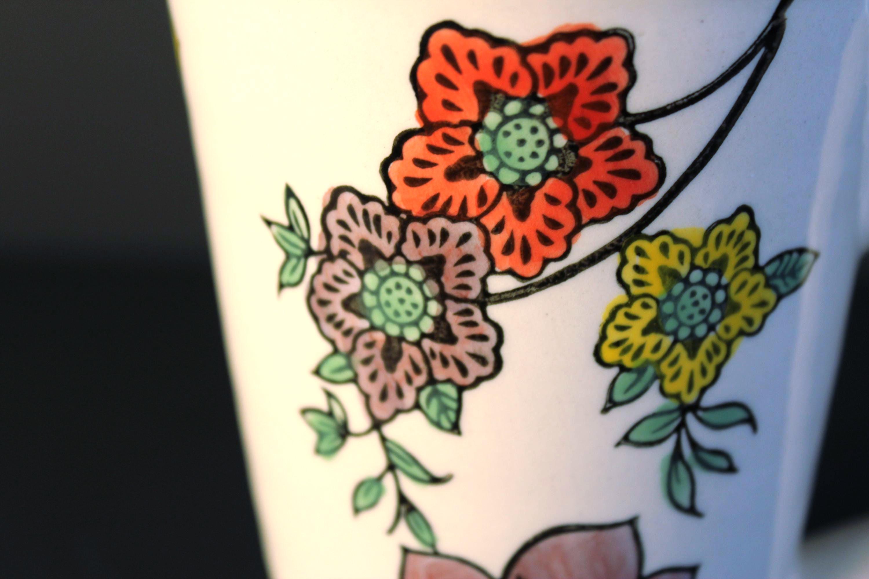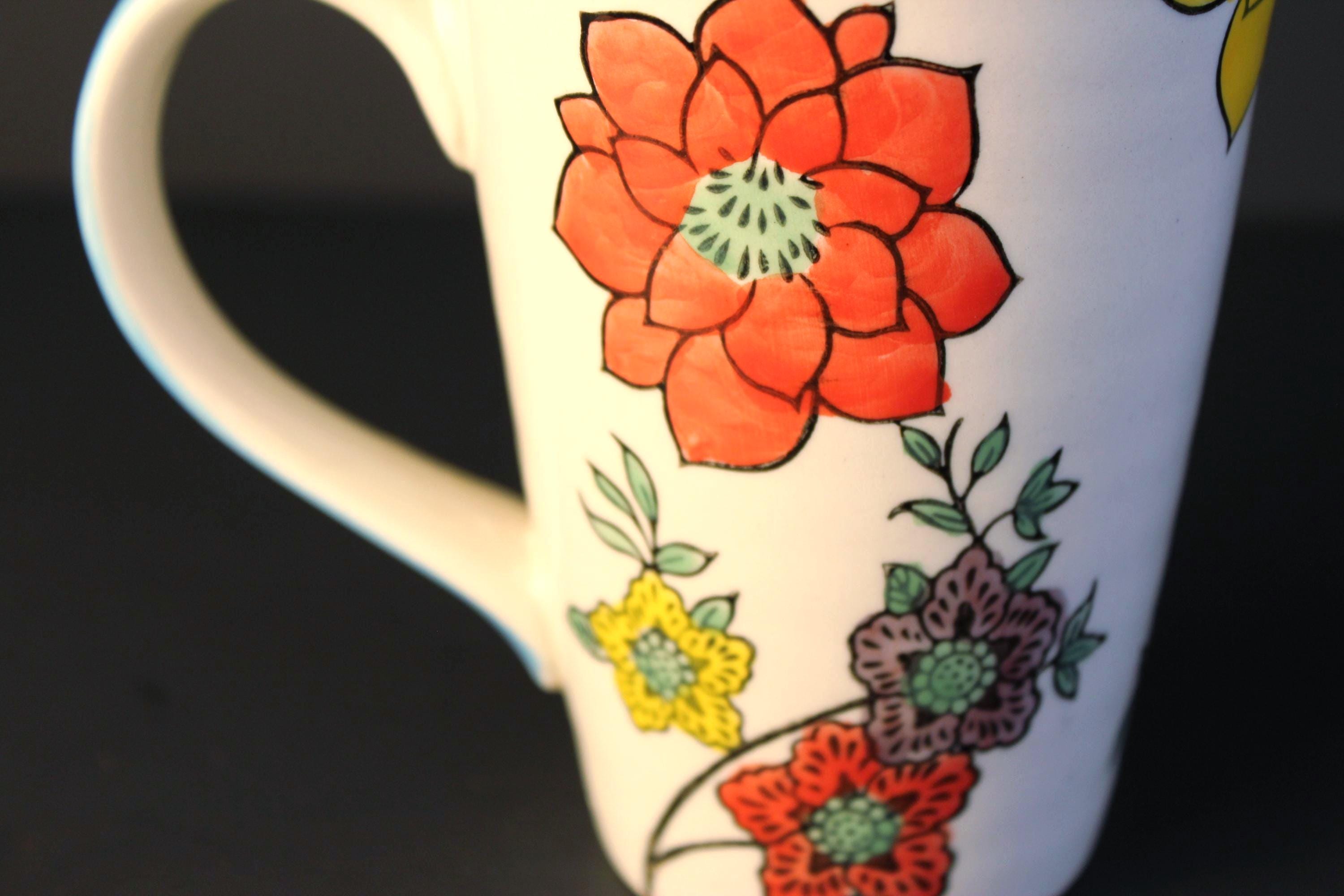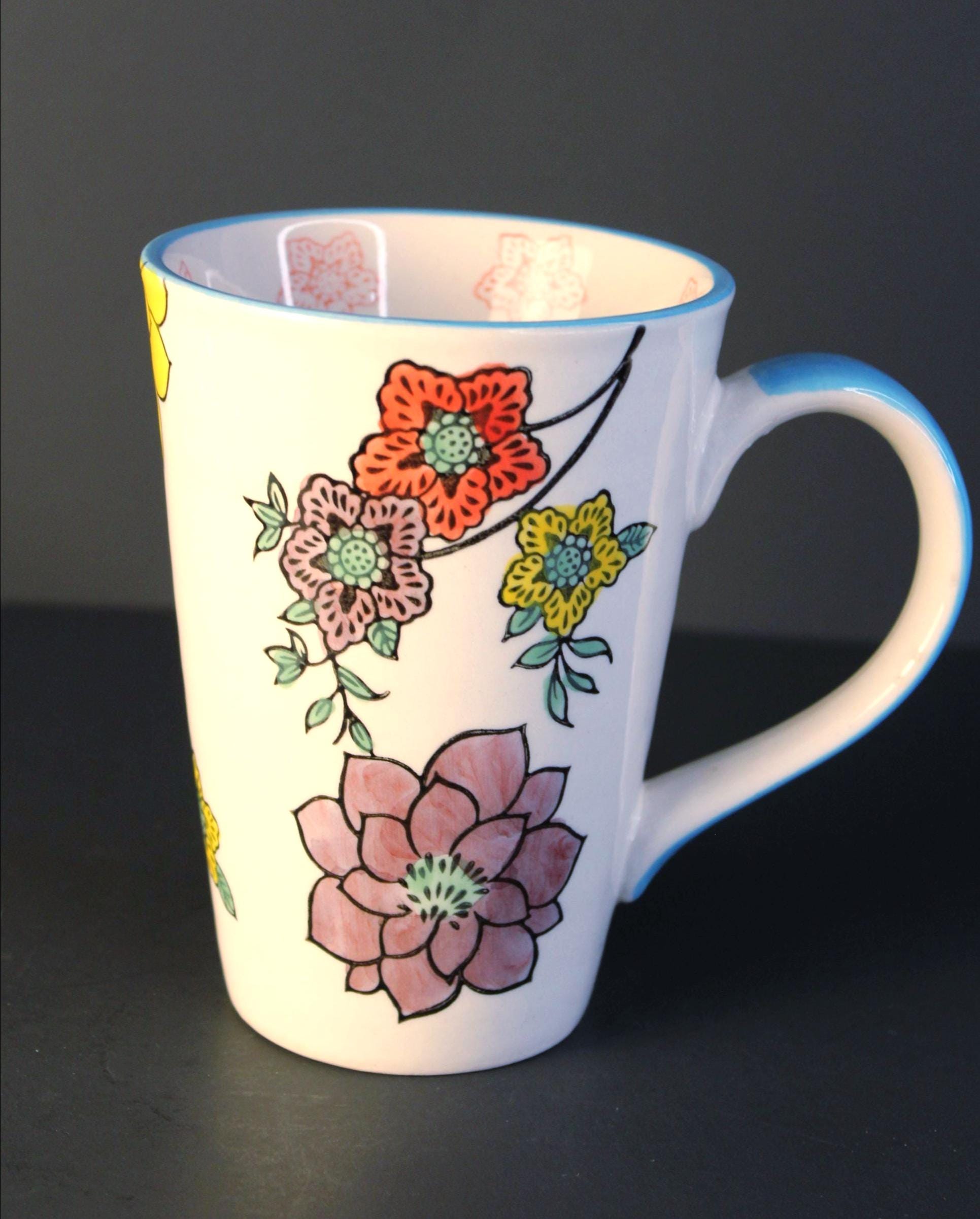Gorgeous and cheerful pottery mug for your favorite beverage! 5.25 tall and 3.4" wide at rim. The pottery wheel rims can be seen if you look close, so cool :-). It has very pretty florals in red, purple, and yellow outlined in black. It has fun red/orange stamped flowers just inside the rim. The background color is a very nice off-white/cream glossy glaze. Nice large handle, which is painted blue, like the rim of the mug. This is a lovely mug that would be a treat for yourself as well as an excellent gift. It is in excellent pre-owned condition.