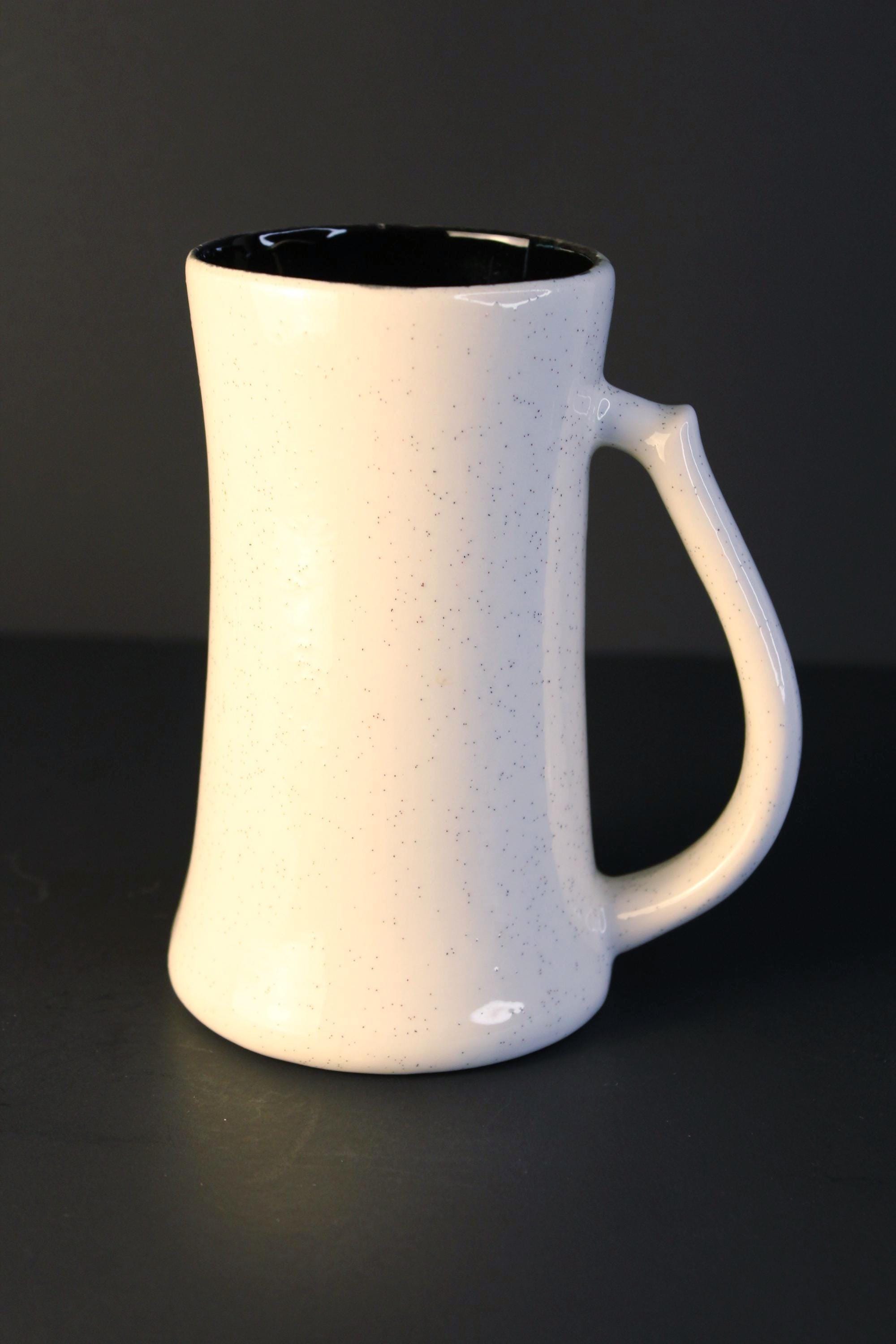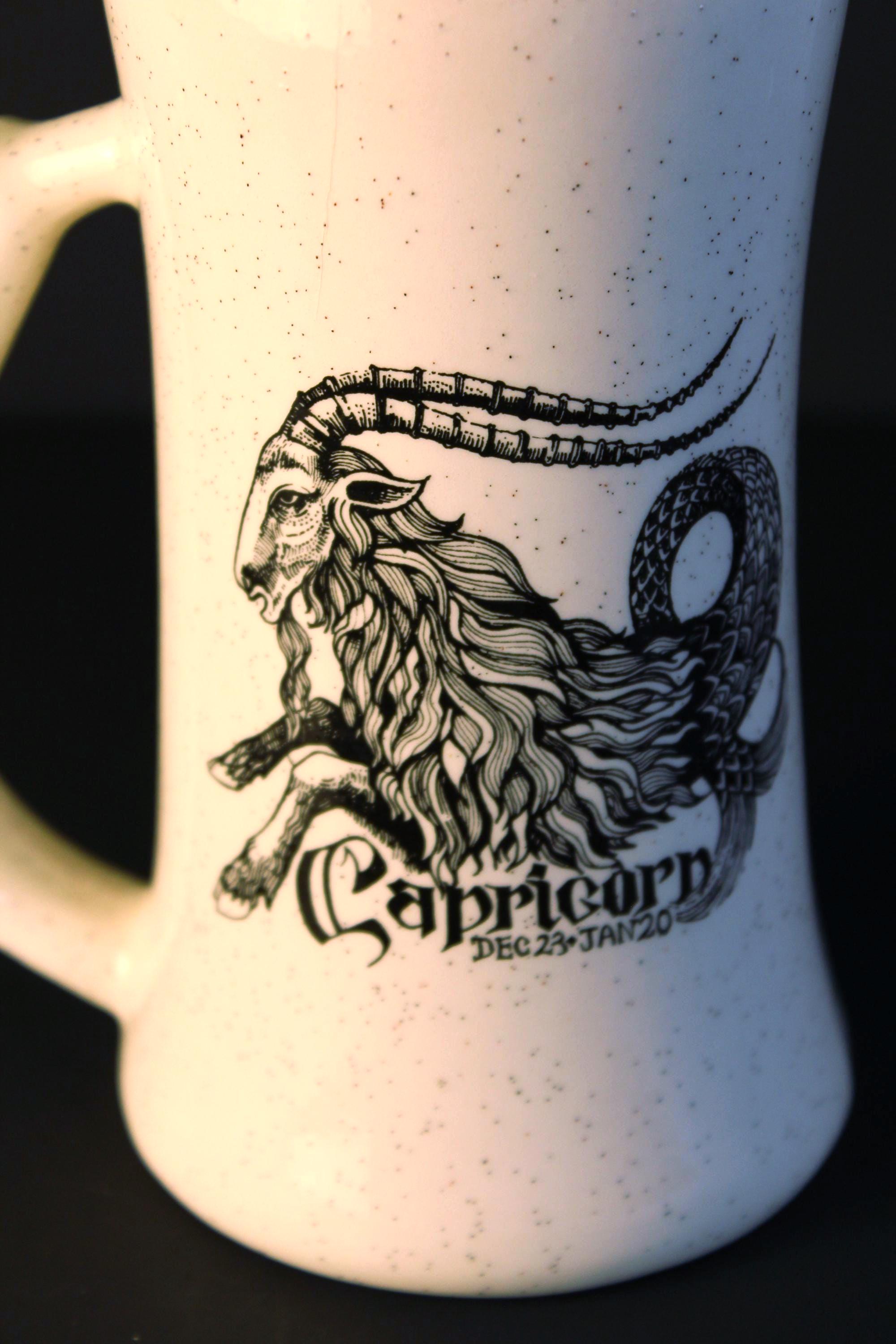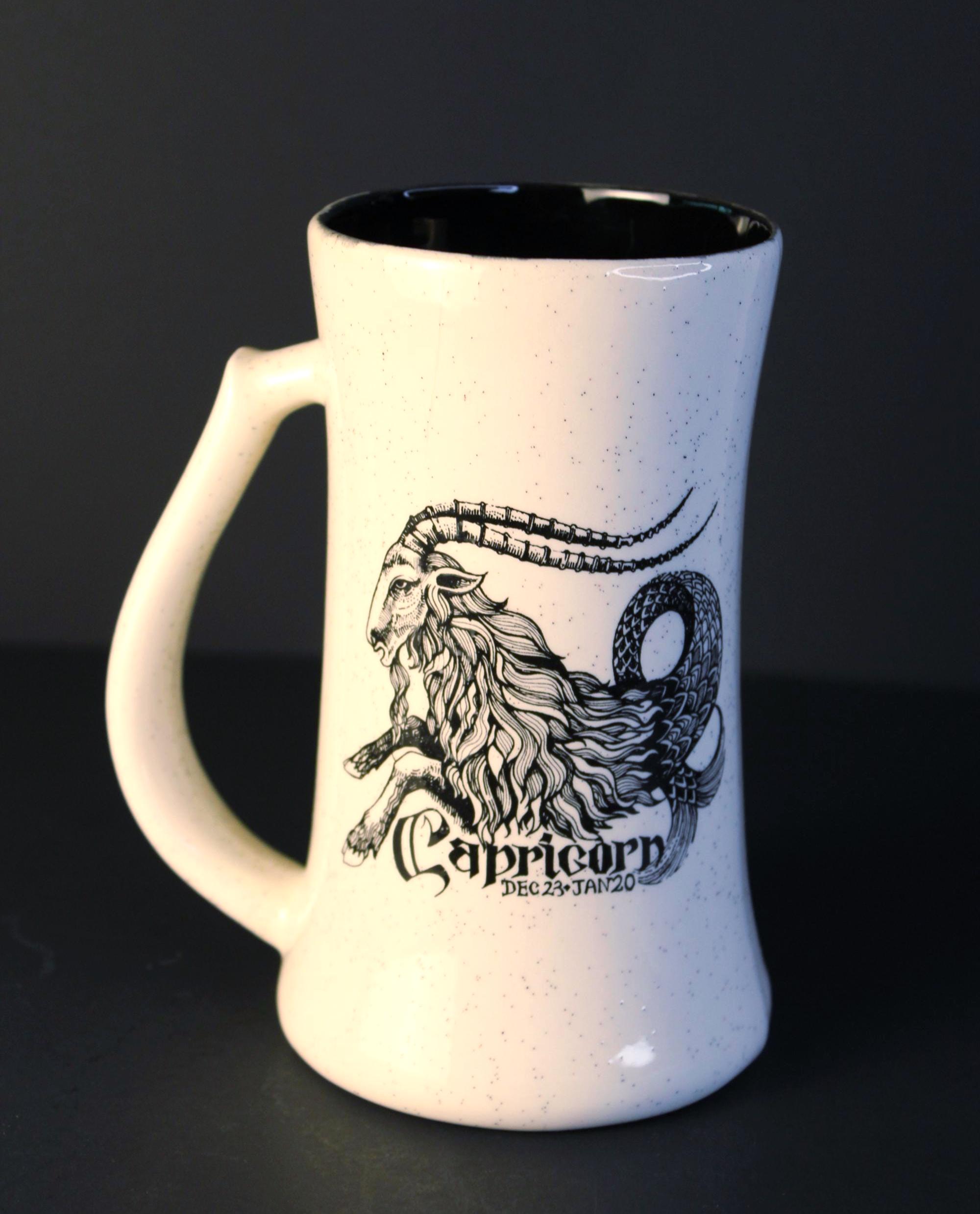 Novelty Coffee Tea Mug "Capricorn", Hand Made Ceramic. This is a really cool detailed Capricorn design with very complimentary black and cream glossy glaze. The handle is large and the mug is just over 6 inches tall. The bottom of the mug is slightly larger than the rim, which is a nice aesthetic and also provides stability. The overall look and design of the mug is quite sophisticated. This was hand glazed with a glossy cream with small black speckles on the outside and has a jet-black glossy glaze to the inside. The artist initials are seen on the bottom of the mug. There is one small area of crazing on the glaze to the outside of the mug, which is hard to see. Please view all photos. This is in excellent pre-owned condition.