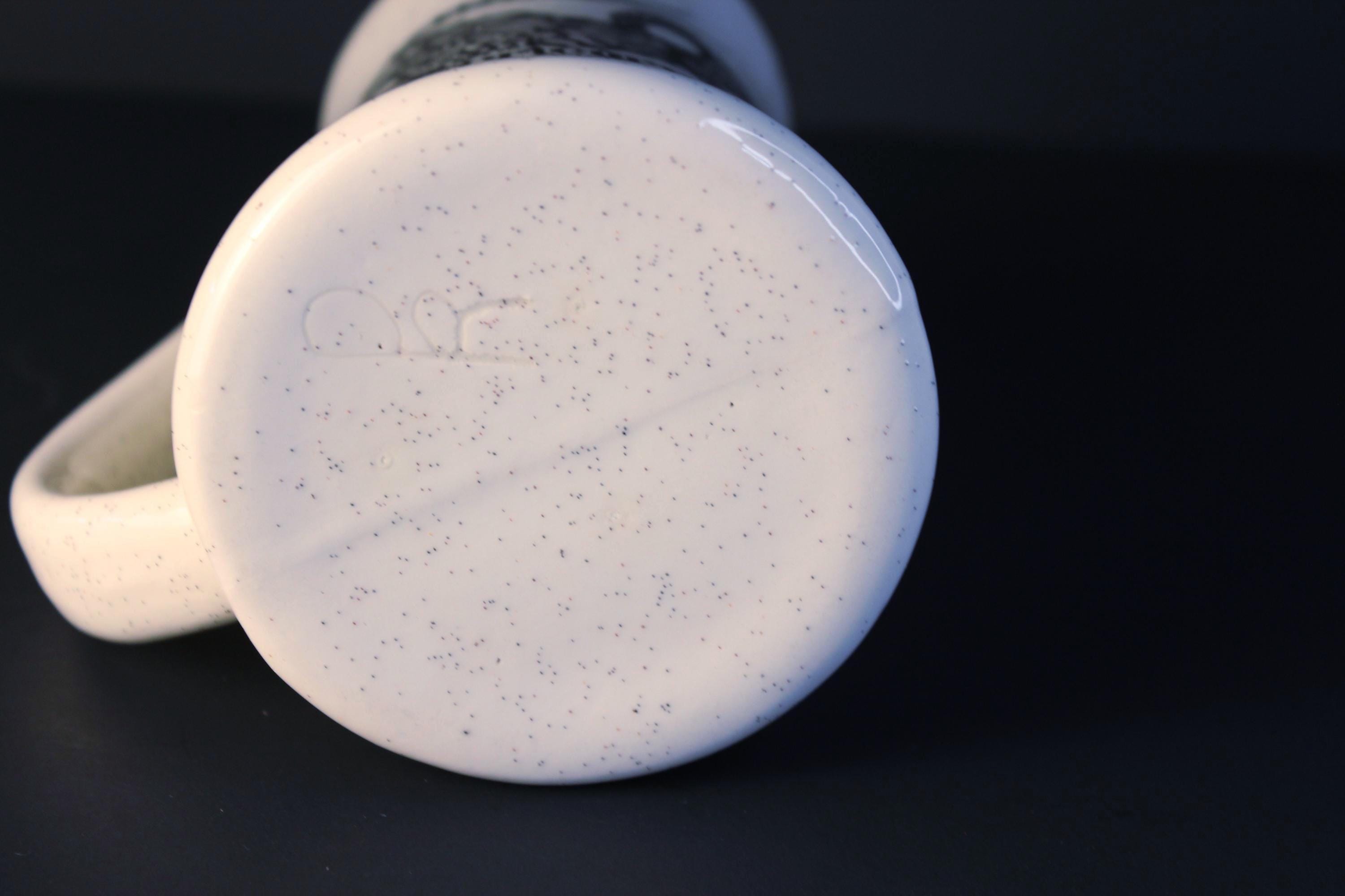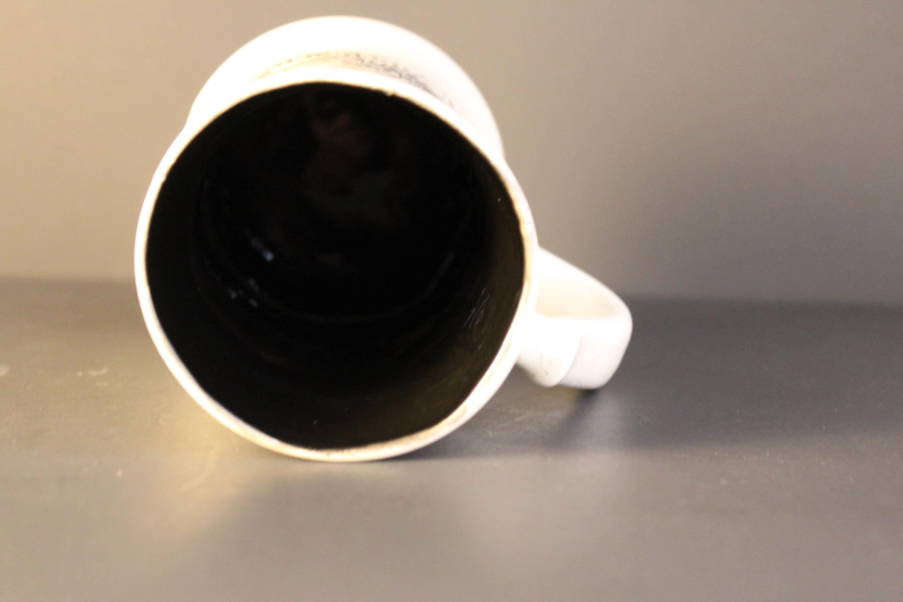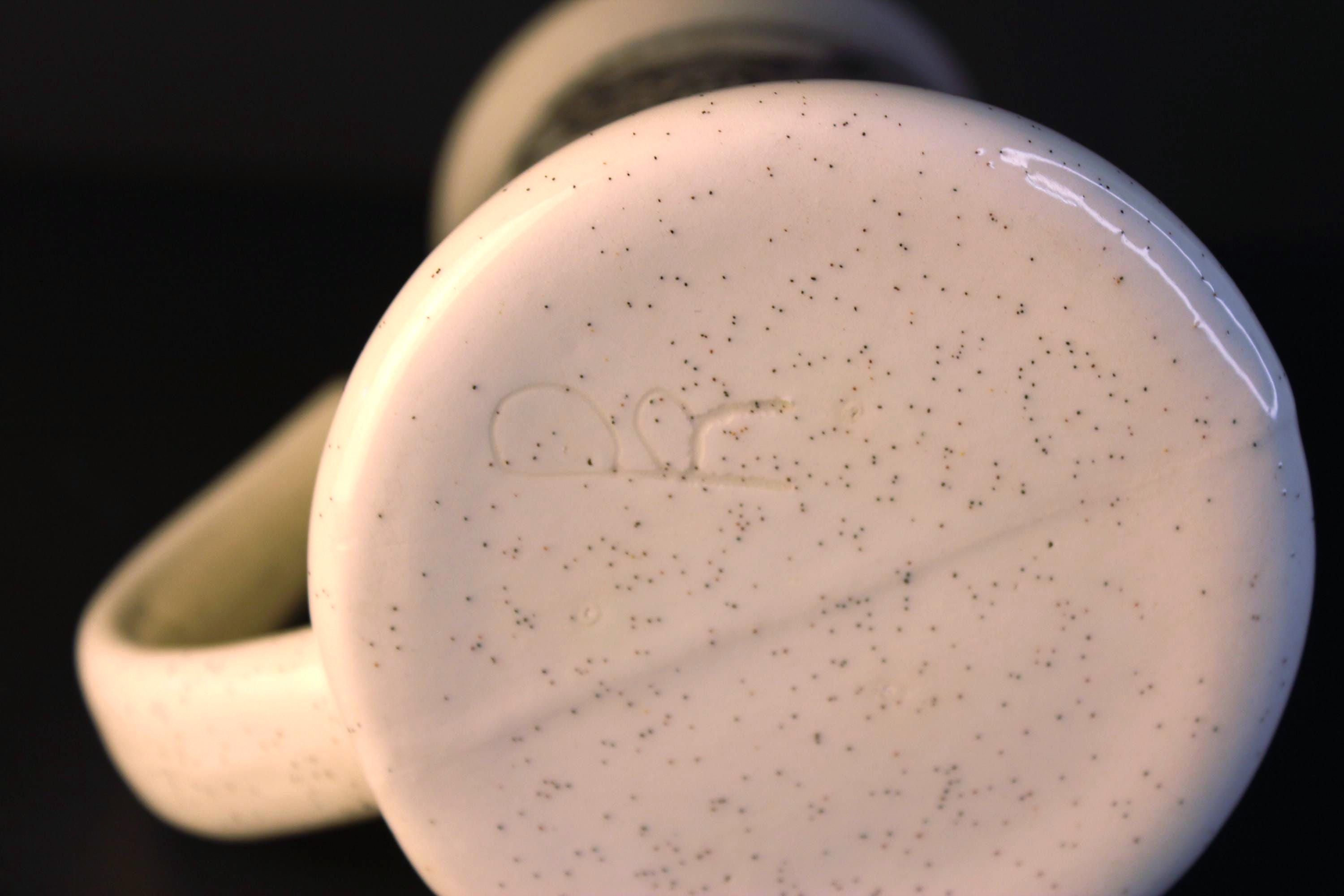 Novelty Coffee Tea Mug "Capricorn", Hand Made Ceramic. This is a really cool detailed Capricorn design with very complimentary black and cream glossy glaze. The handle is large and the mug is just over 6 inches tall. The bottom of the mug is slightly larger than the rim, which is a nice aesthetic and also provides stability. The overall look and design of the mug is quite sophisticated. This was hand glazed with a glossy cream with small black speckles on the outside and has a jet-black glossy glaze to the inside. The artist initials are seen on the bottom of the mug. There is one small area of crazing on the glaze to the outside of the mug, which is hard to see. Please view all photos. This is in excellent pre-owned condition.