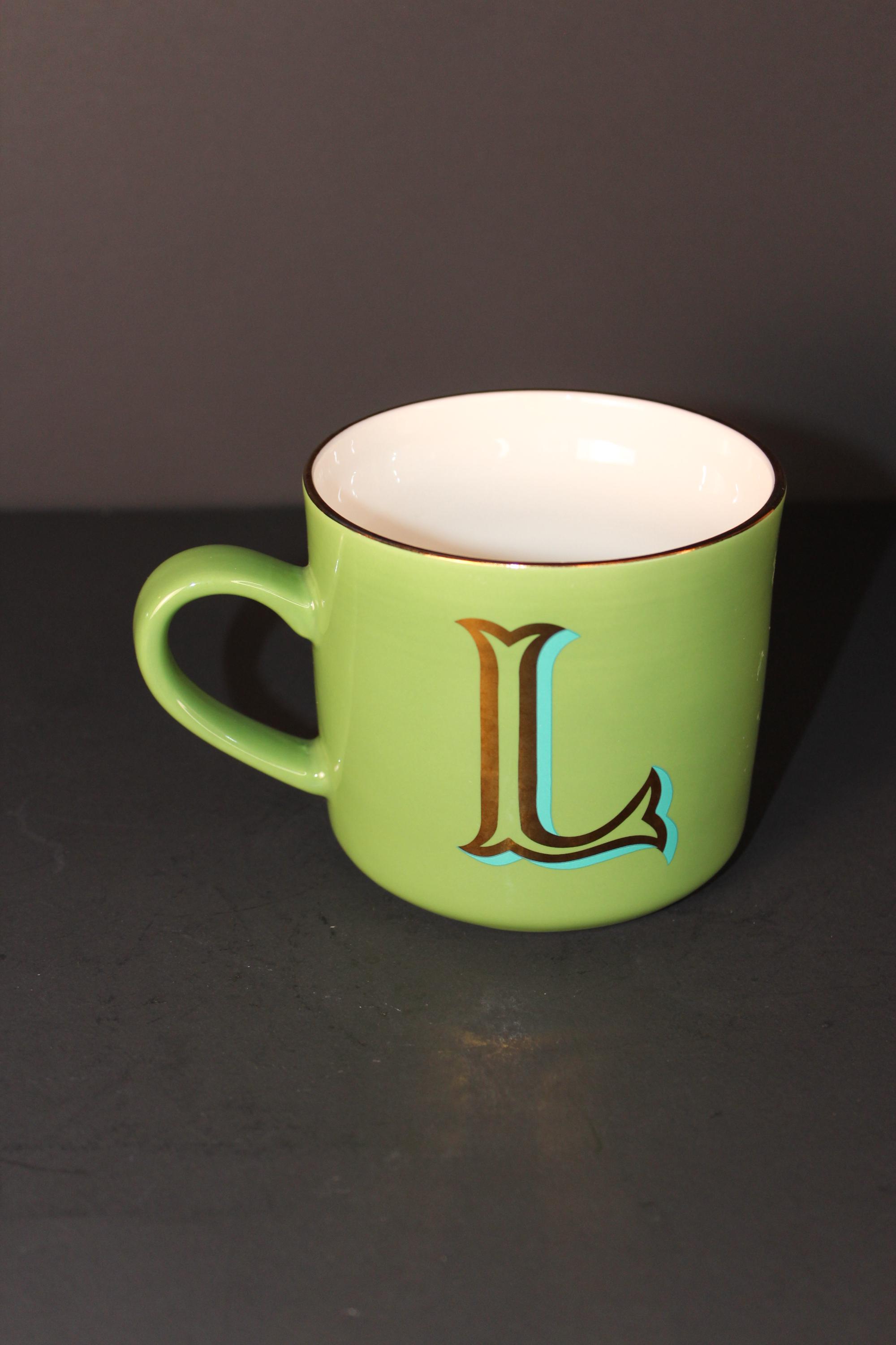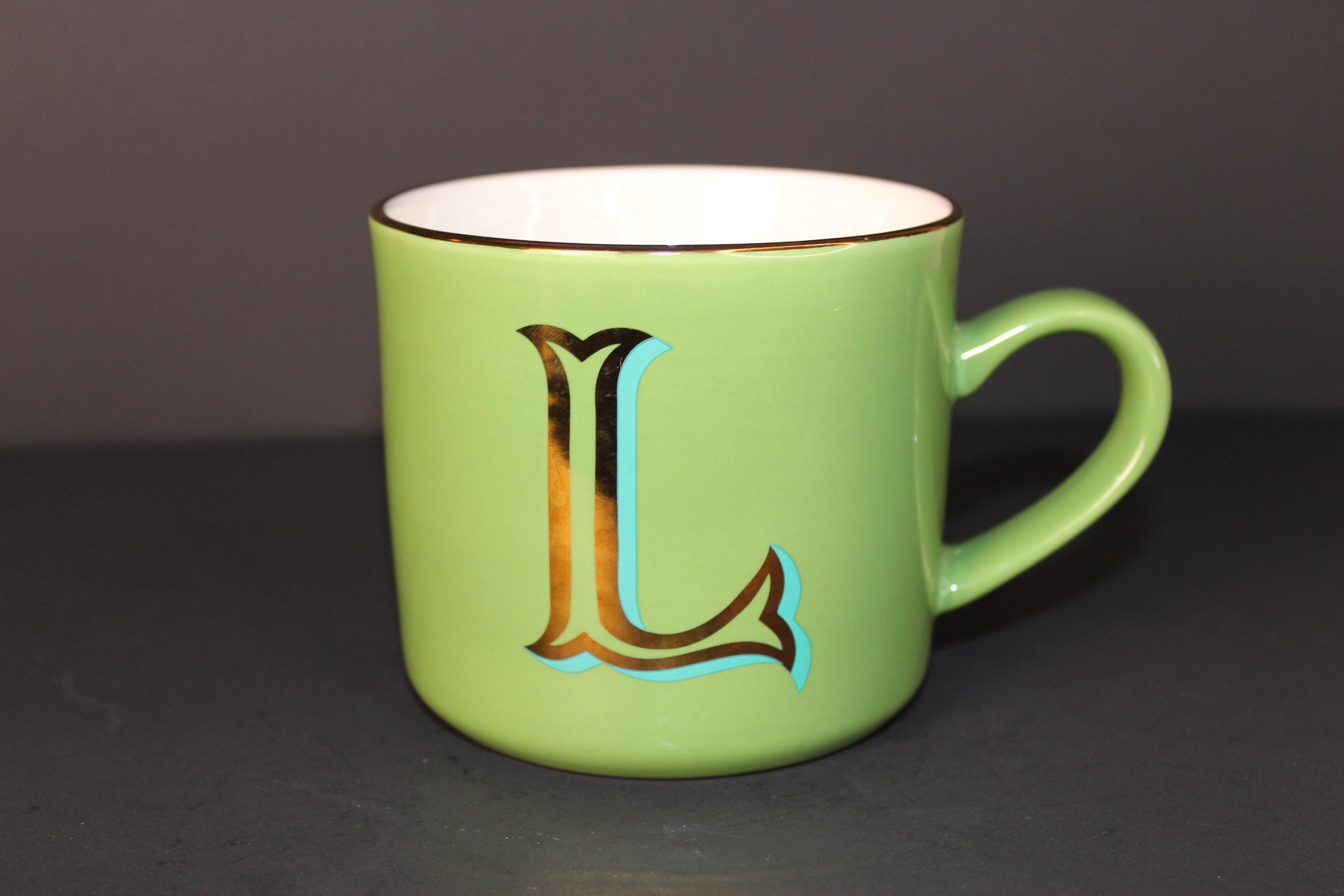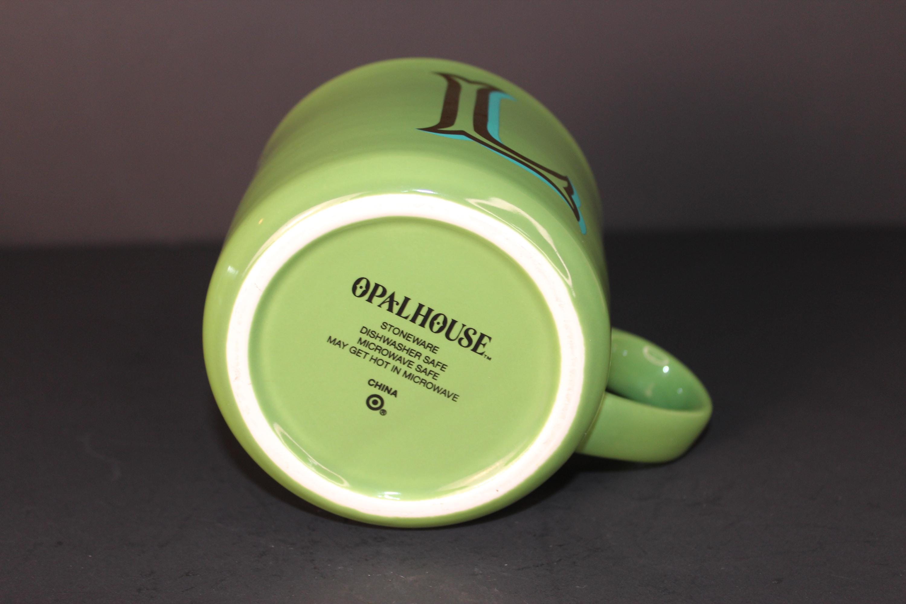 Novelty Coffee Tea Monogram "L" Mug 16 oz Threshold Green outside glaze, White inside. The monogram L is metallic gold and blue accent. The rim is edged in gold metallic. It is from the Opal House collection Target. This mug has very clean lines and has a sophisticated appeal. It has a shape such that it will not tip easily. The color of green is warm and fresh then perfectly accented with the gold monogram and rim. This is in perfect pre-owned condition.