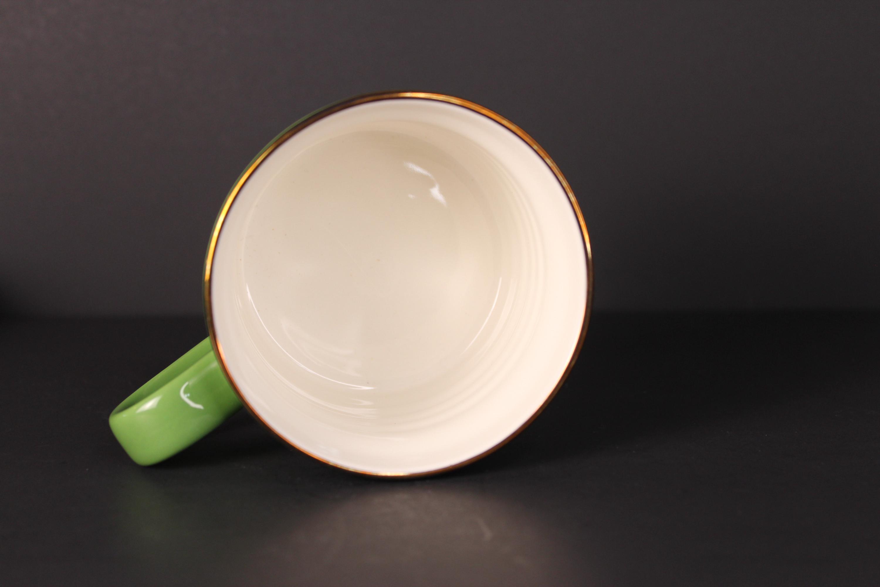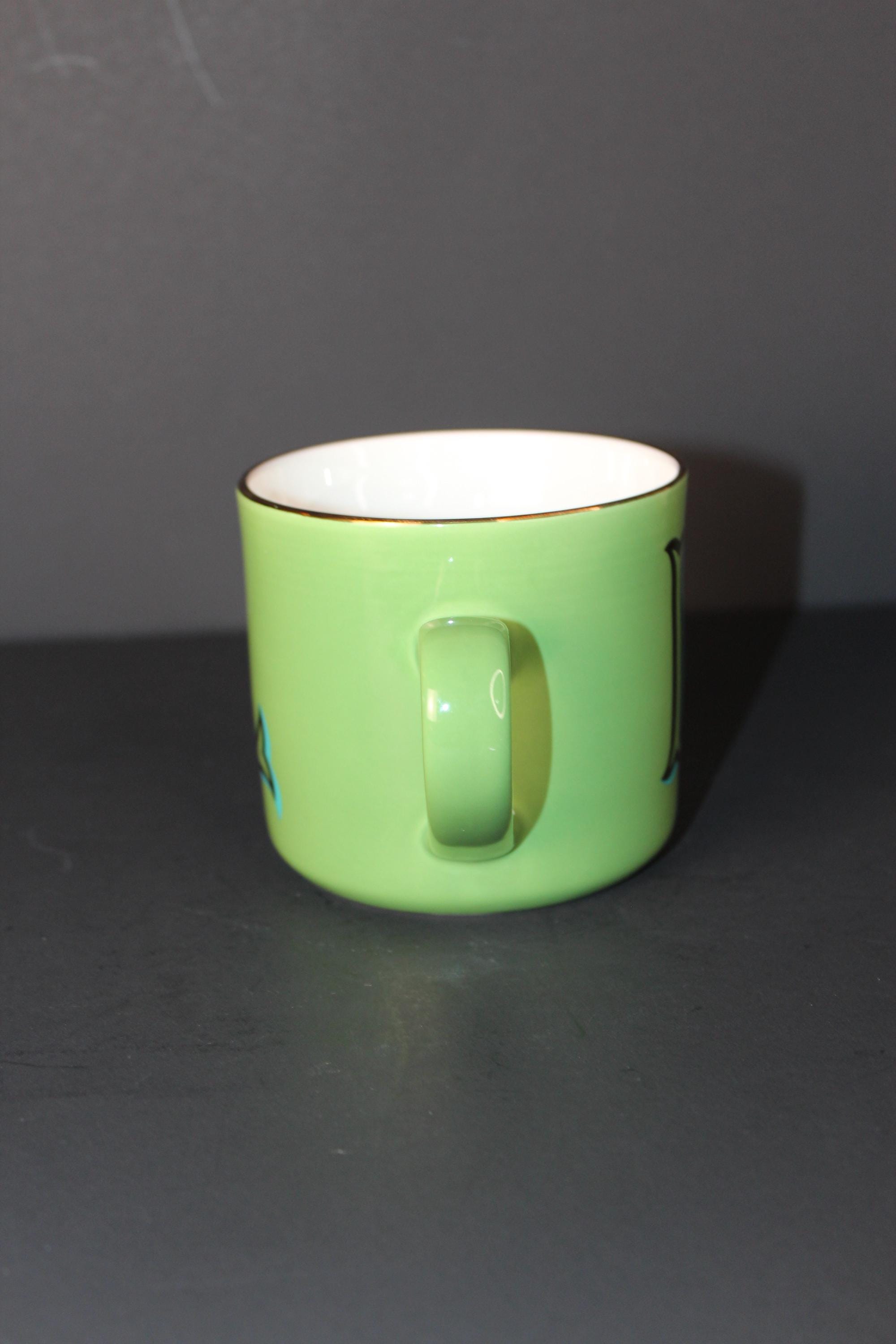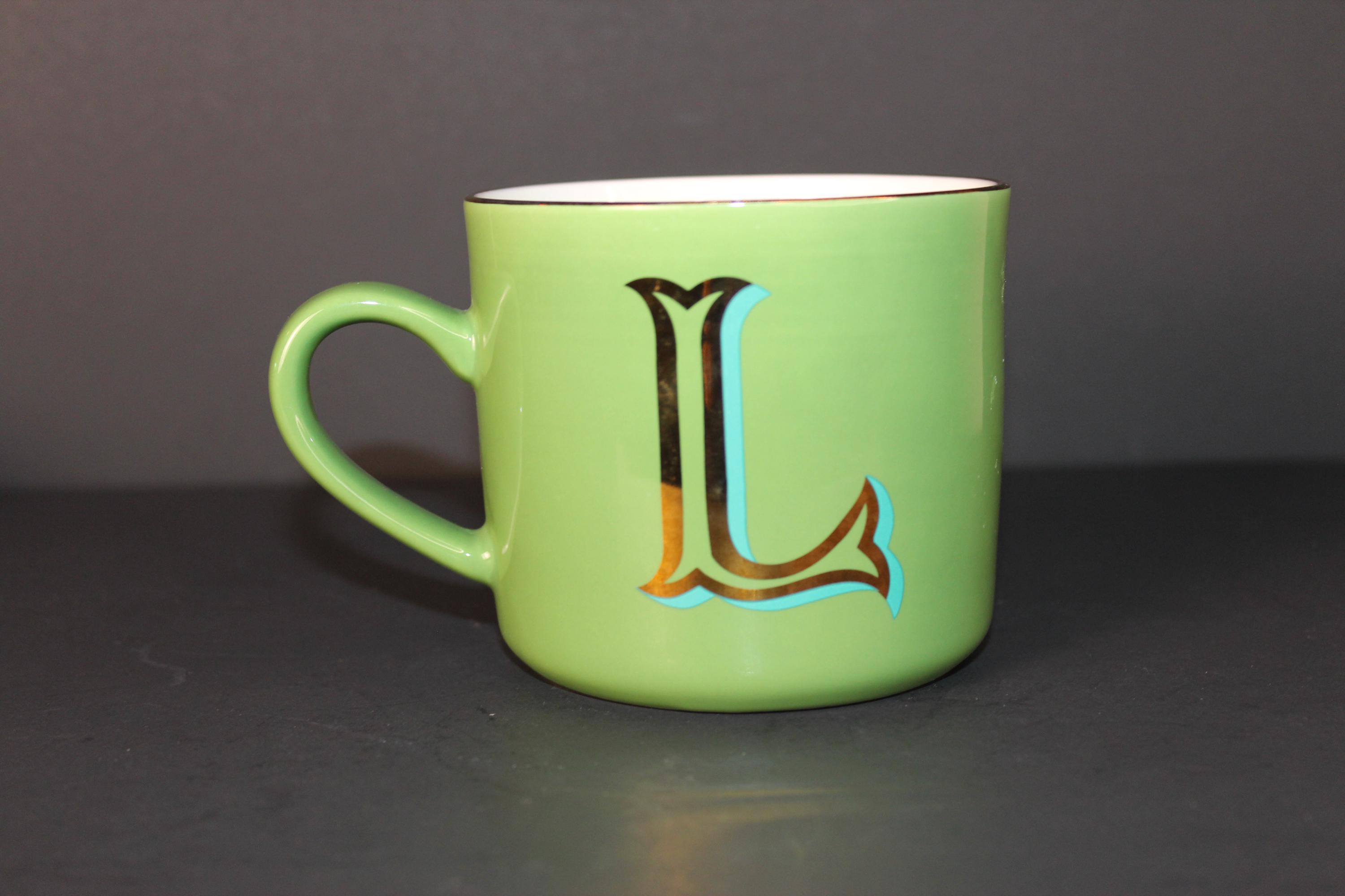 Novelty Coffee Tea Monogram "L" Mug 16 oz Threshold Green outside glaze, White inside. The monogram L is metallic gold and blue accent. The rim is edged in gold metallic. It is from the Opal House collection Target. This mug has very clean lines and has a sophisticated appeal. It has a shape such that it will not tip easily. The color of green is warm and fresh then perfectly accented with the gold monogram and rim. This is in perfect pre-owned condition.