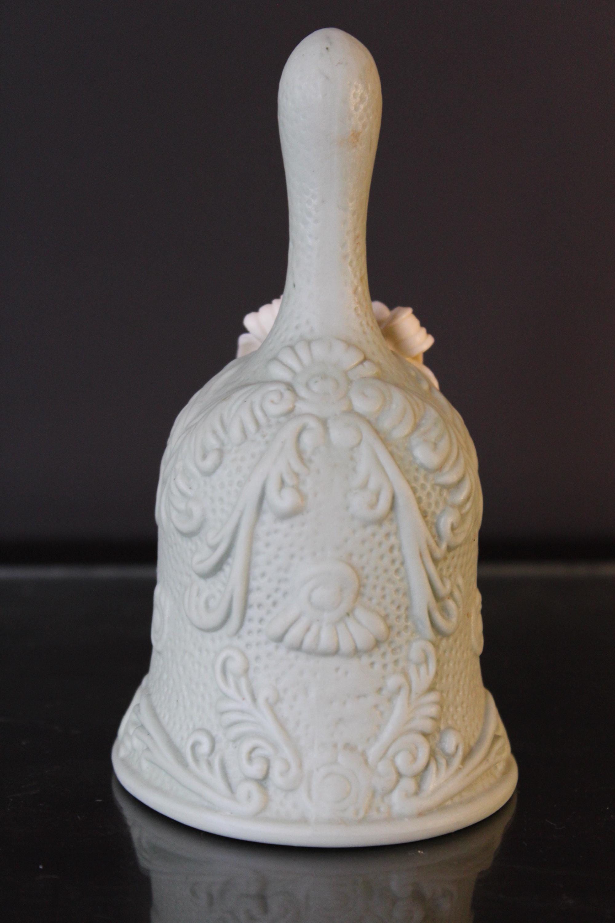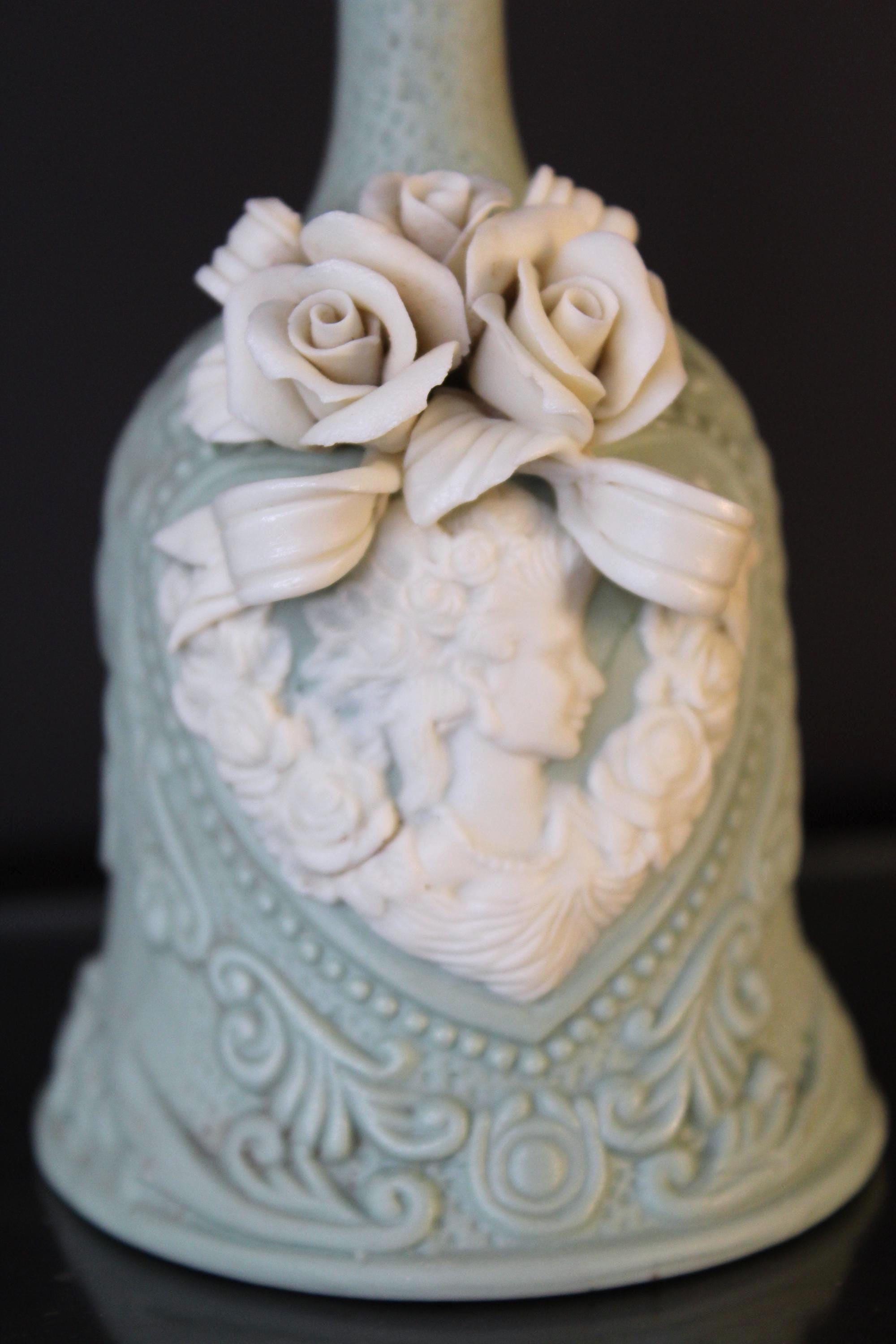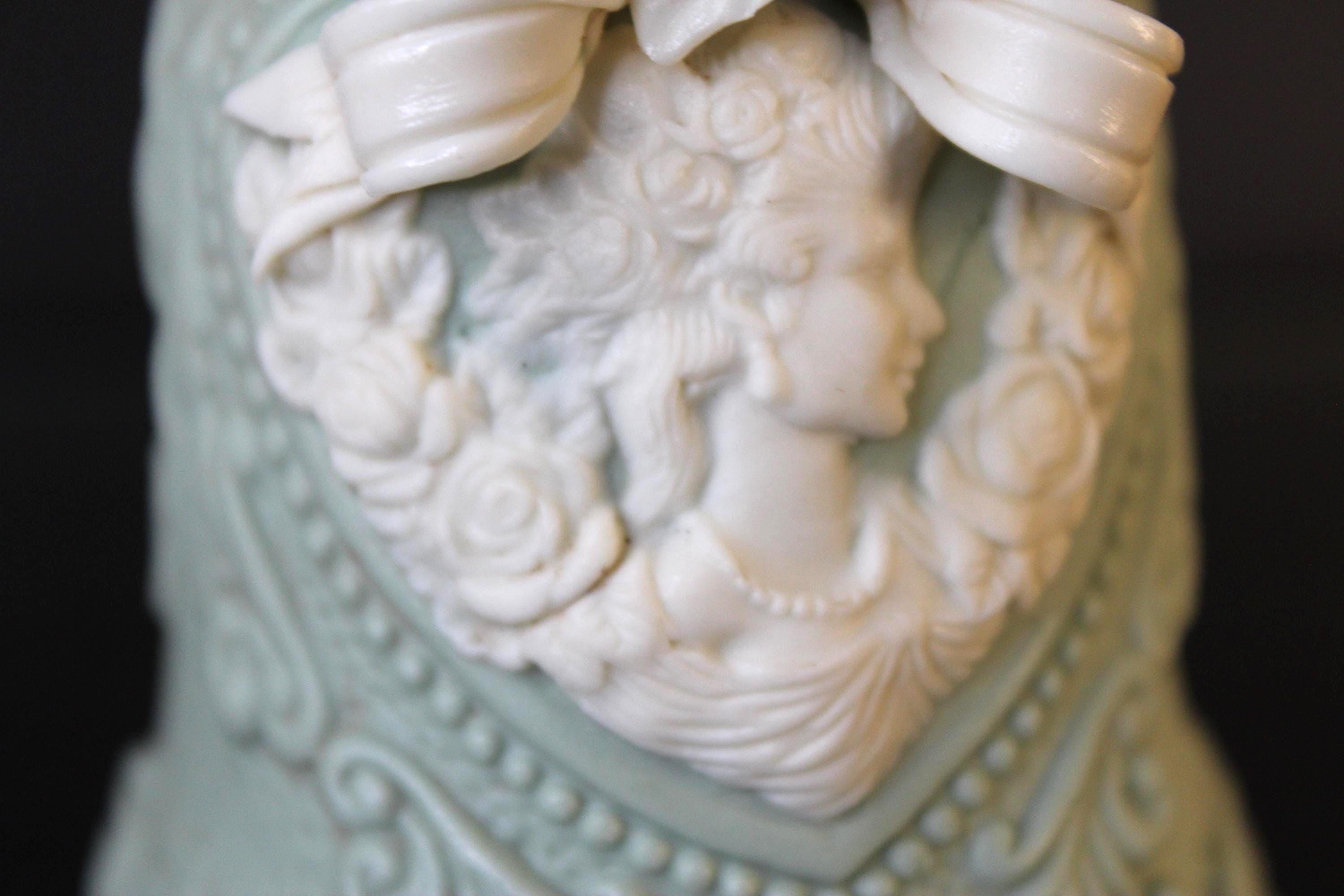 Vintage Victorian Cameo Jasperware Bell Collectible Off-White and Mint/Sea Foam Green, it measures 5.5 inches tall and is 3 inches wide. The variety of details on this piece are very lovely indeed. The clapper is original and intact. Please review the photos before purchasing. It is in excellent pre-owned condition. The price includes shipping!