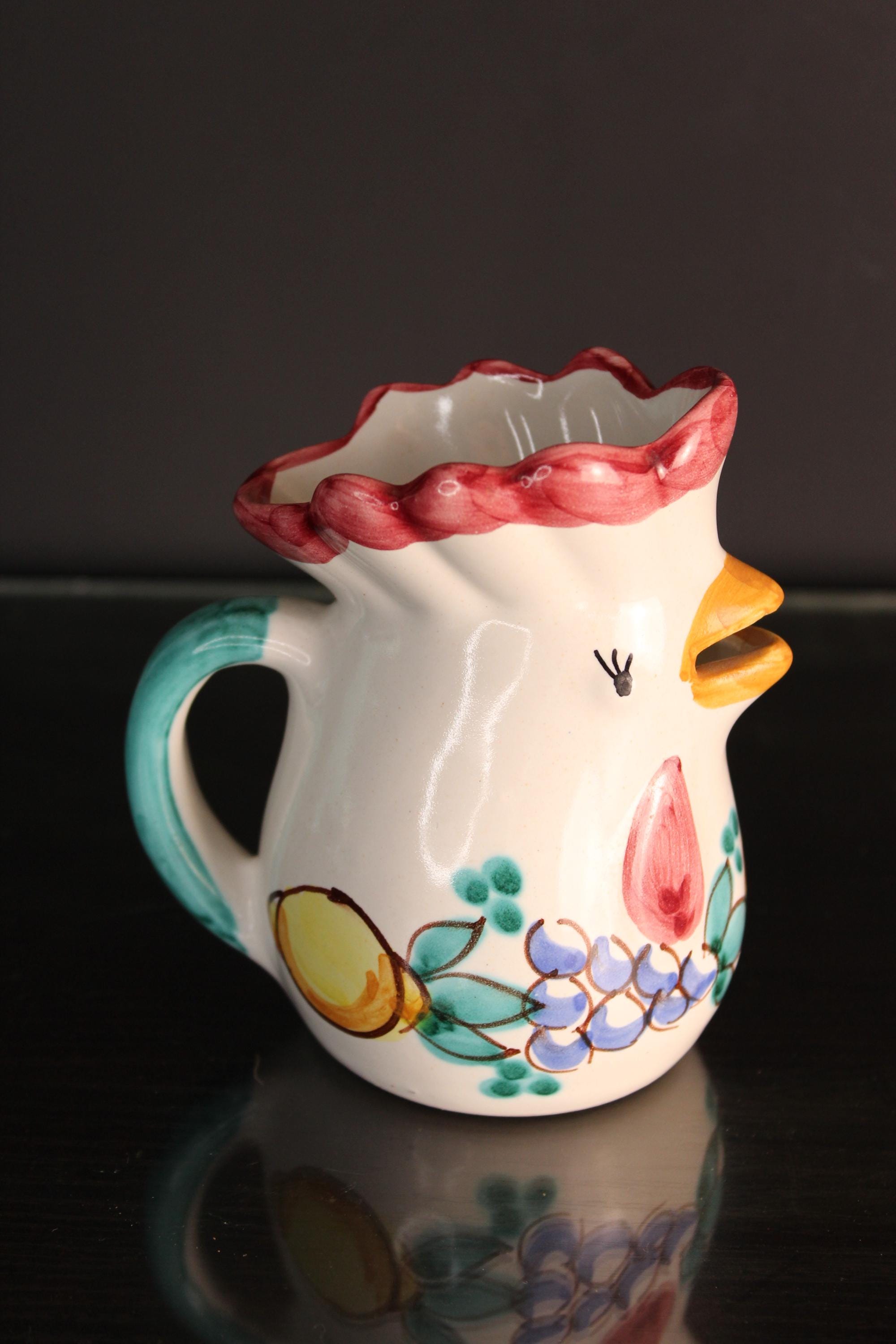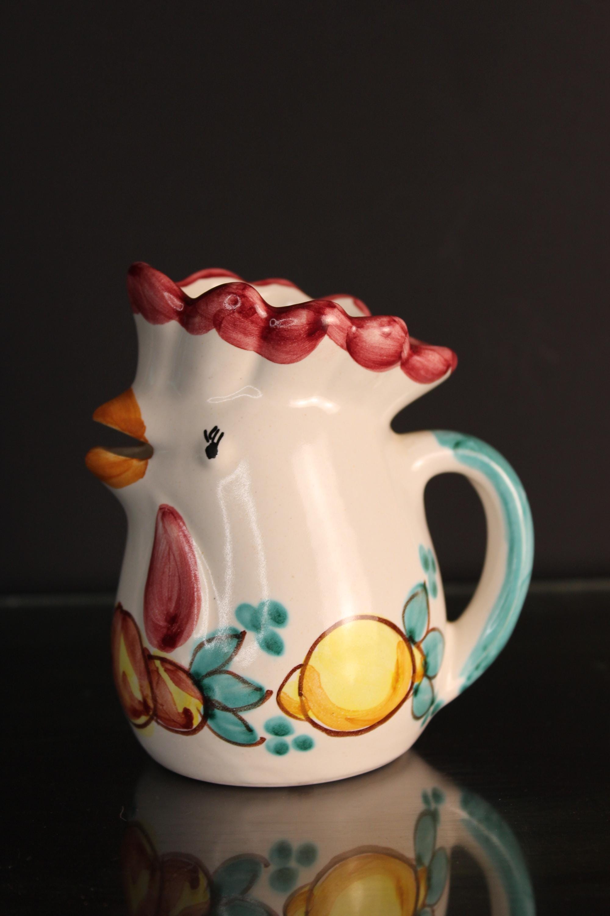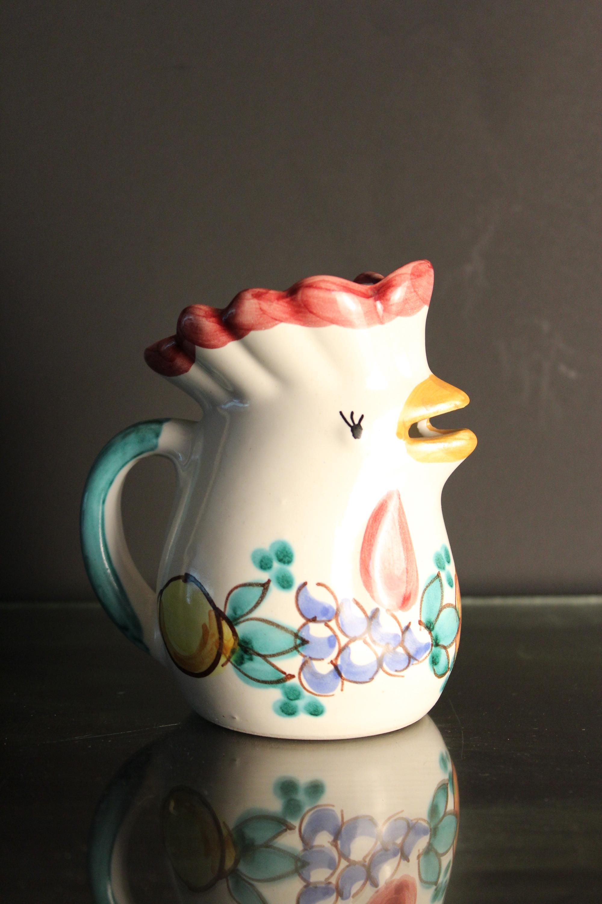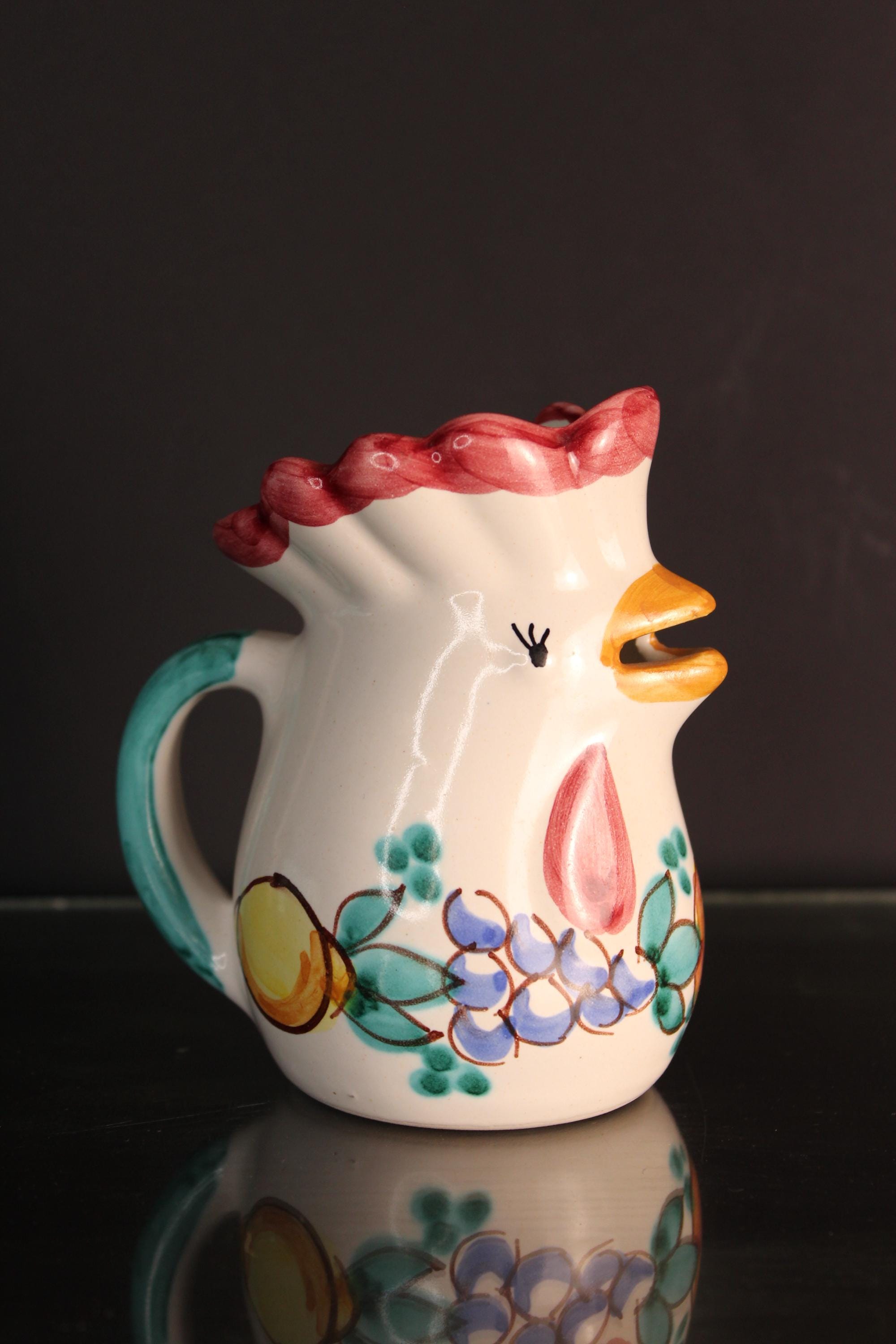 Outstanding example of Vintage Italian Hand Painted Ceramic Chicken Pitcher/Creamer by Giovanni Vietri. These collectible pitchers are made in Italy and their design dates back to the Renaissance period in Florence. They were originally used for wine and given as gifts for Good Luck but are now used as creamers or small pitchers for juice. Signed by the artist. Price includes shipping. This is in excellent pre-owned condition without any chips, cracks, scratches or crazing. It is 4.5 inches tall and 4 inches wide including the handle. The colors are vibrant and cheerful.