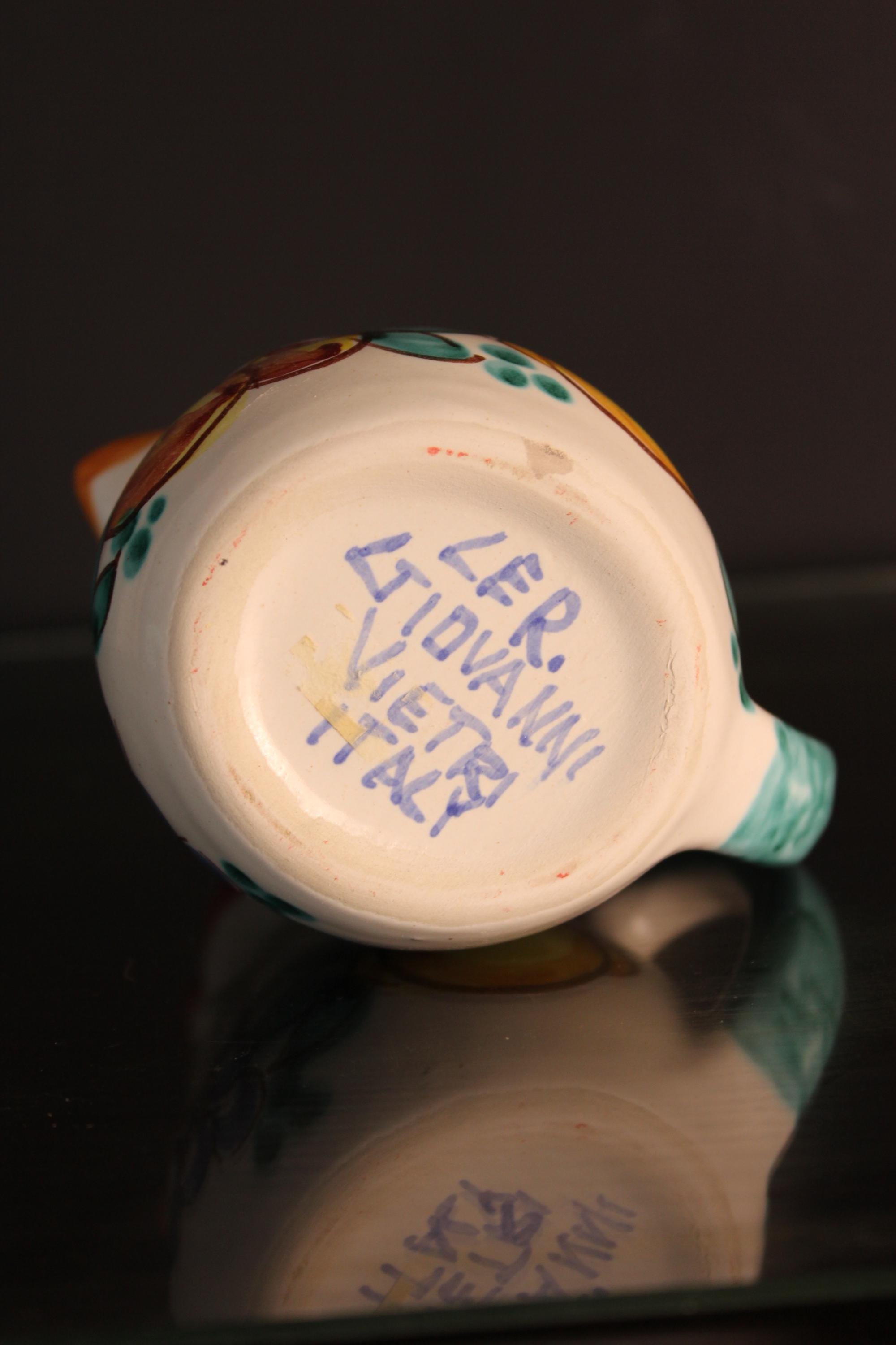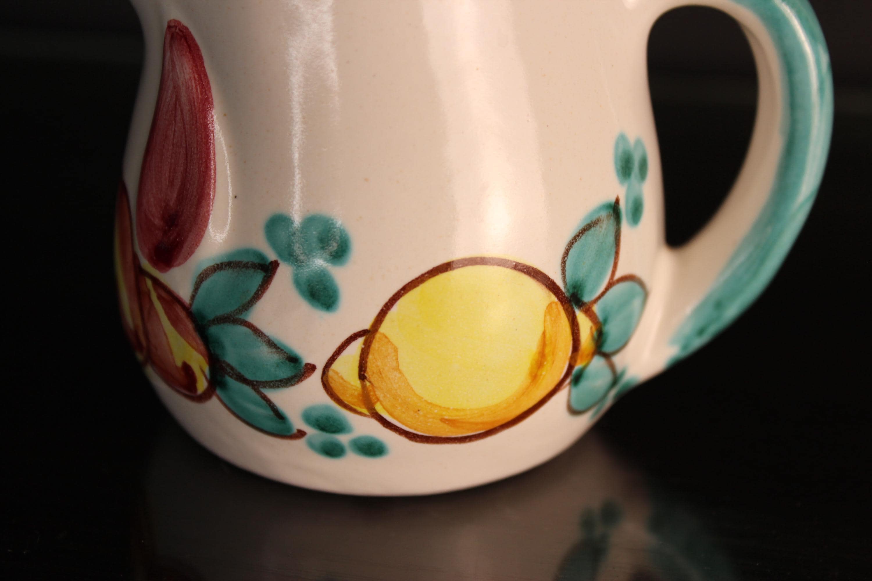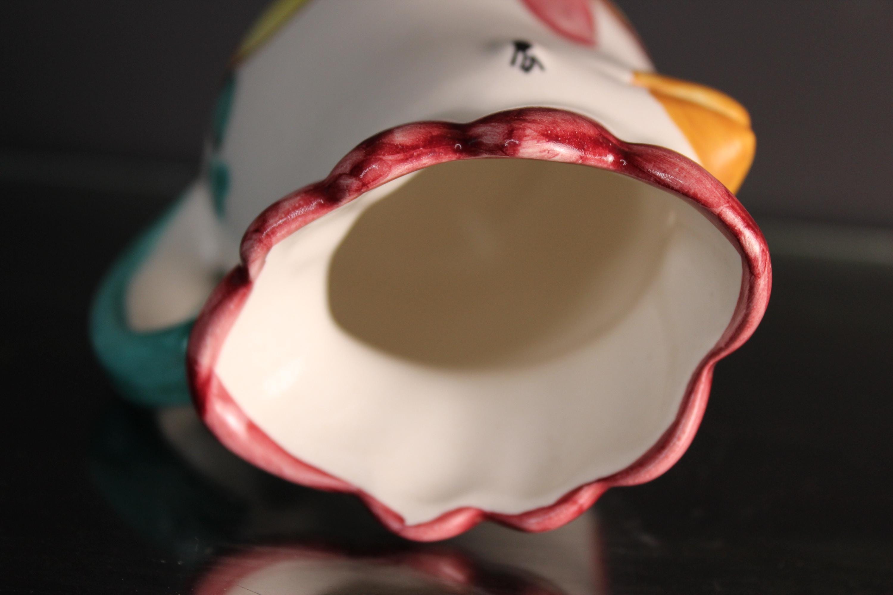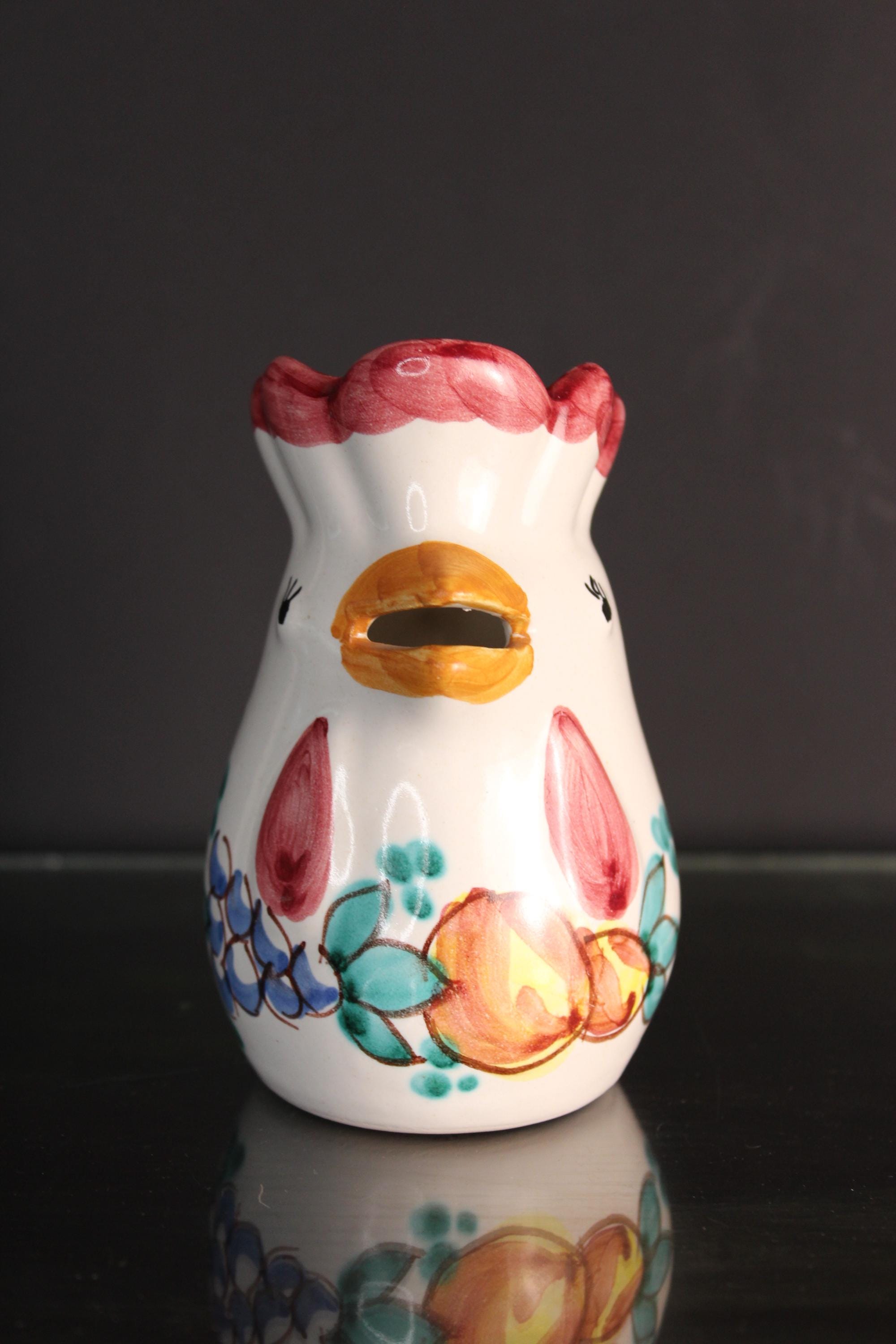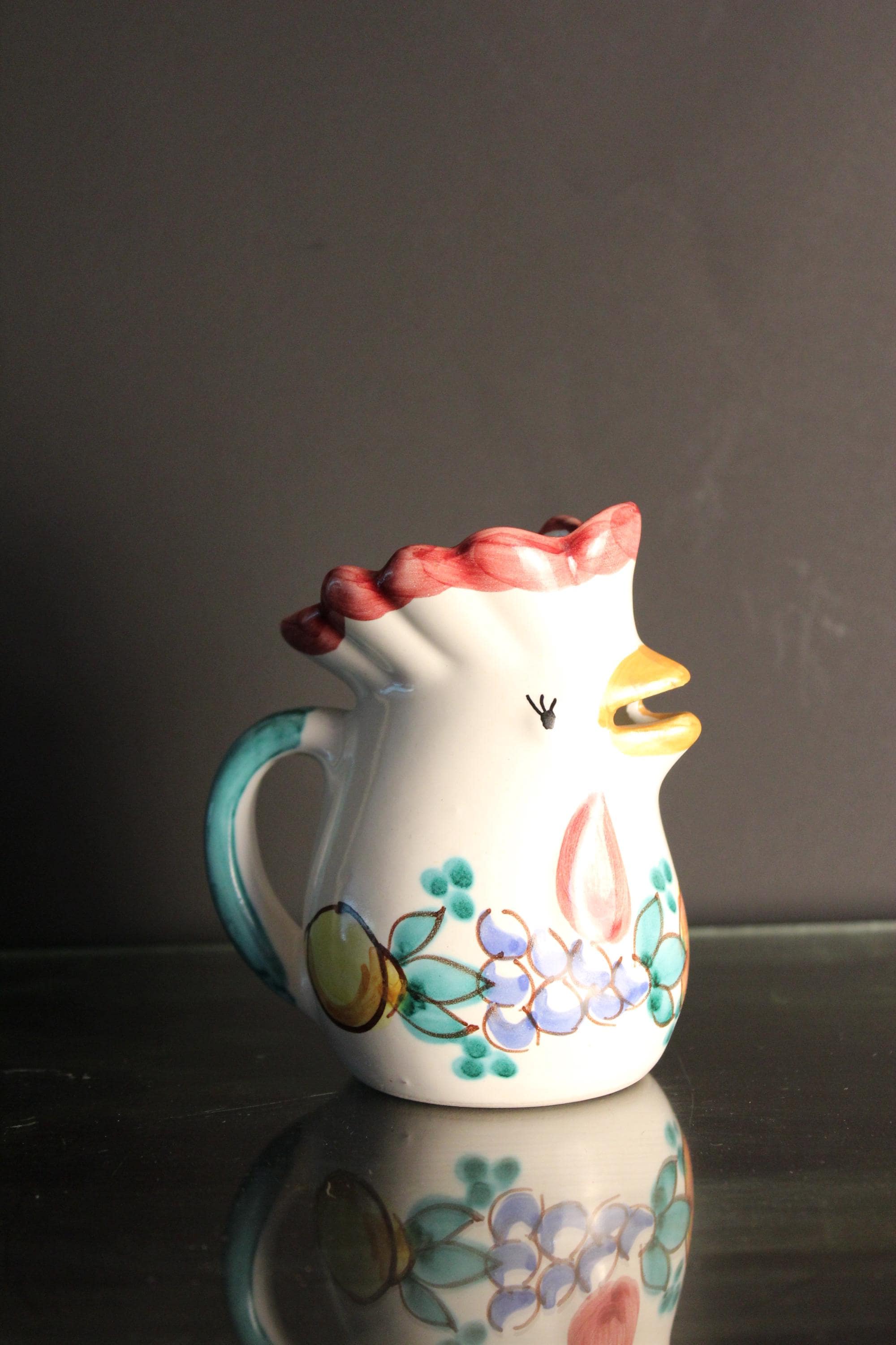 Outstanding example of Vintage Italian Hand Painted Ceramic Chicken Pitcher/Creamer by Giovanni Vietri. These collectible pitchers are made in Italy and their design dates back to the Renaissance period in Florence. They were originally used for wine and given as gifts for Good Luck but are now used as creamers or small pitchers for juice. Signed by the artist. Price includes shipping. This is in excellent pre-owned condition without any chips, cracks, scratches or crazing. It is 4.5 inches tall and 4 inches wide including the handle. The colors are vibrant and cheerful.