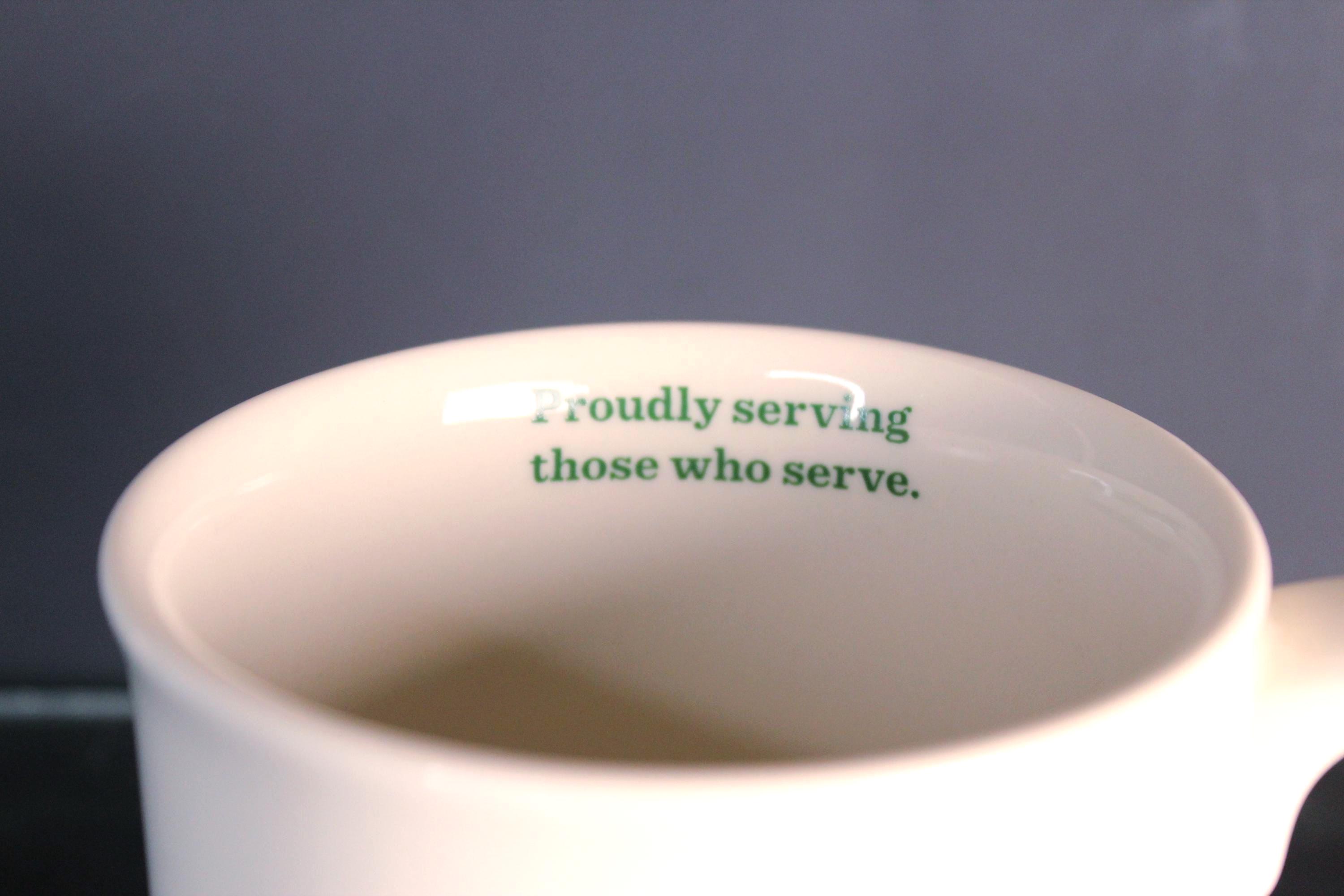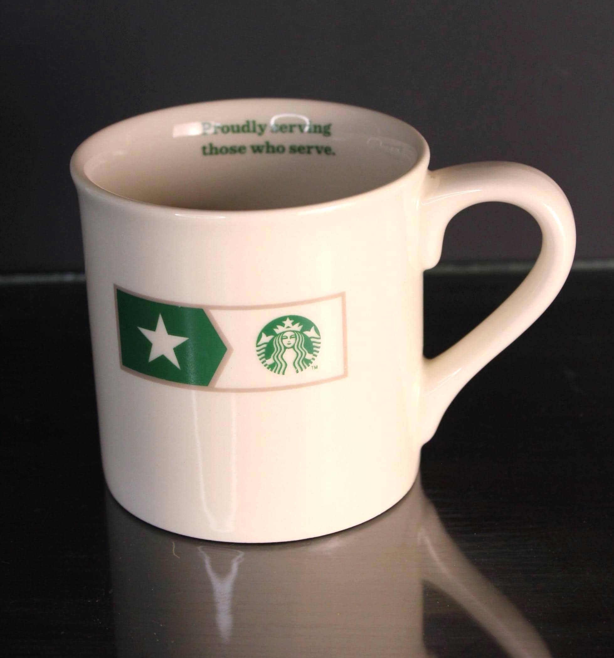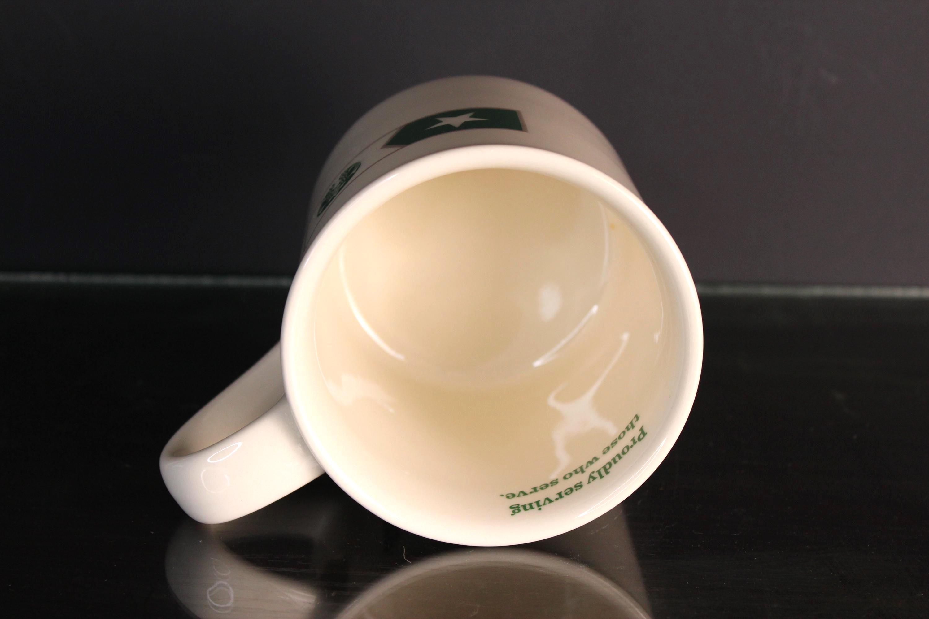 Starbucks Coffee Tea Mug "Proudly serving those who serve" Military Appreciation Mug 14 0zThis mug was designed as part of Starbucks' "Roll Call" initiative and were sold at Military Family Starbucks locations. The mug features the military star and the Starbucks siren logo. This is in pristine pre-owned condition. Price includes shipping.