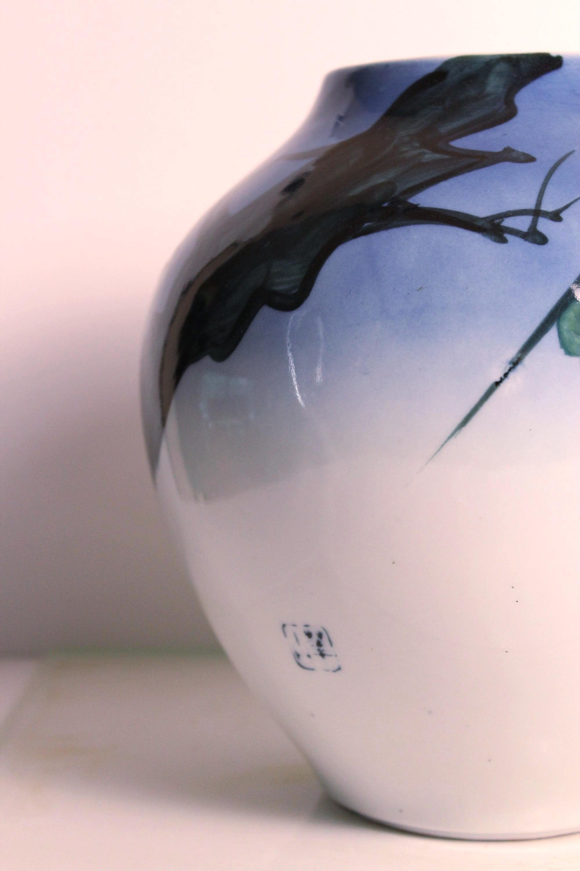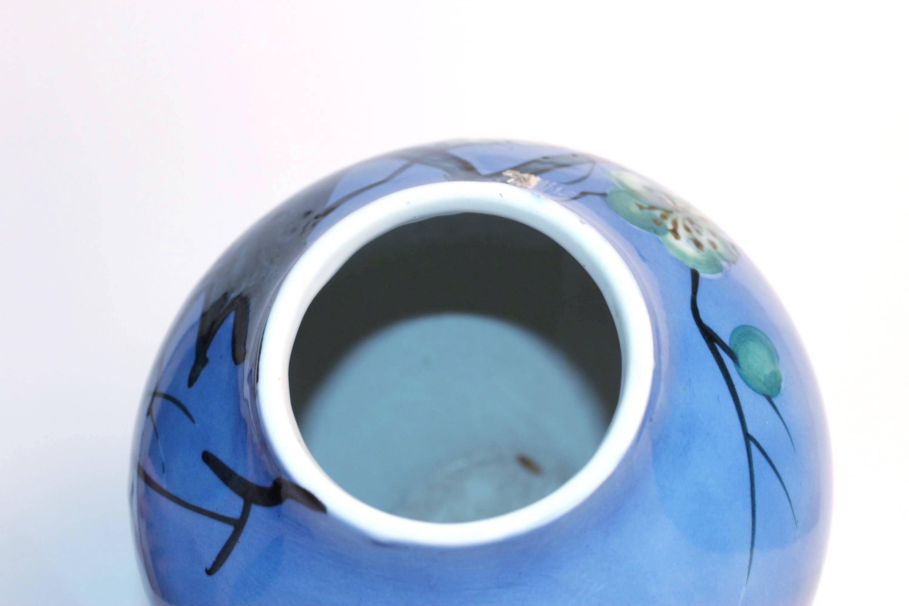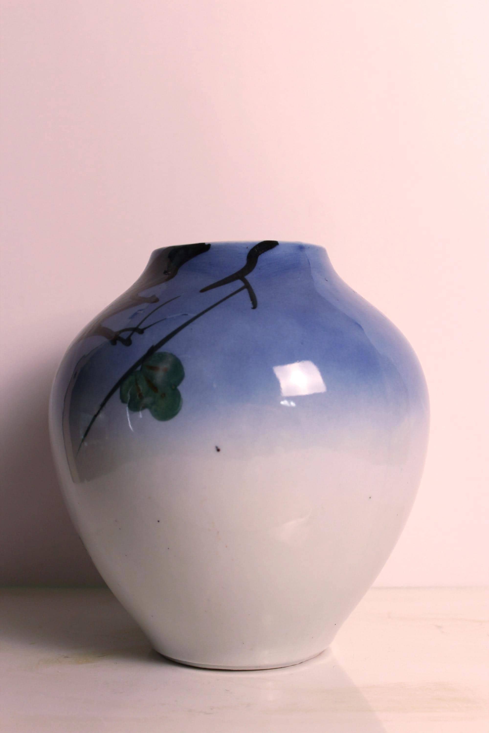 Vintage Japanese Hand Painted gorgeous Vase in Blue Green White. The design represents Japanese aesthetics that represent ancient ideals that include Wabi (transient and stark beauty) and Yugen (profound grace and subtlety) which is consistent with Japanese norms on what is considered tasteful or beautiful. The design depicts stylized dogwood blossom and branches. It looks different at every angle around the vase. Has part of the original sticker (see photos) written in Japanese. It is 8.5 inches tall and 7 inches wide. No chips, cracks or crazing. It is in excellent pre-owned condition. Price includes shipping.