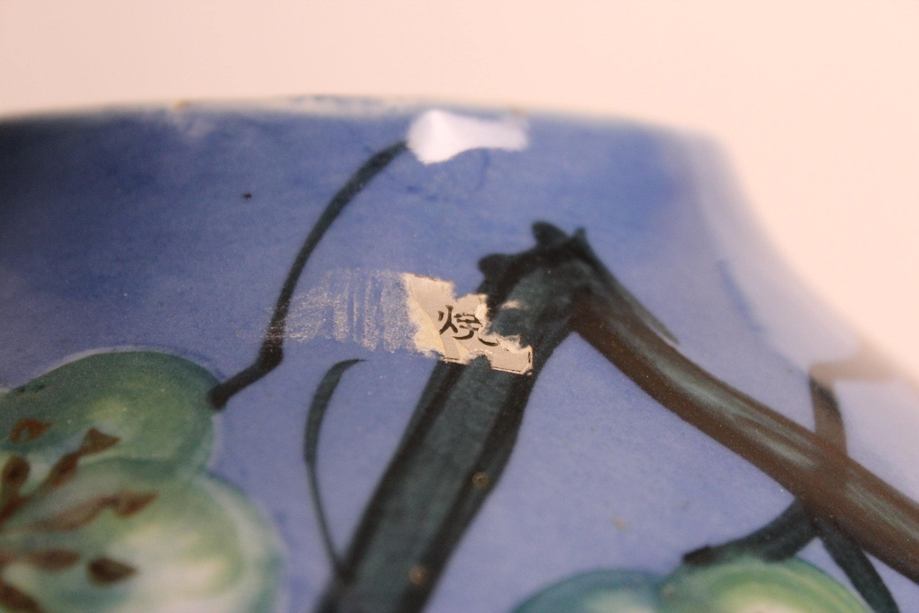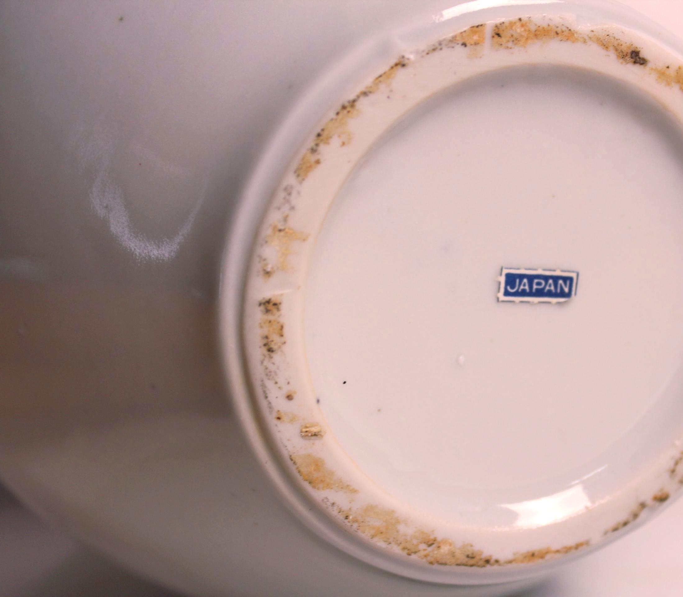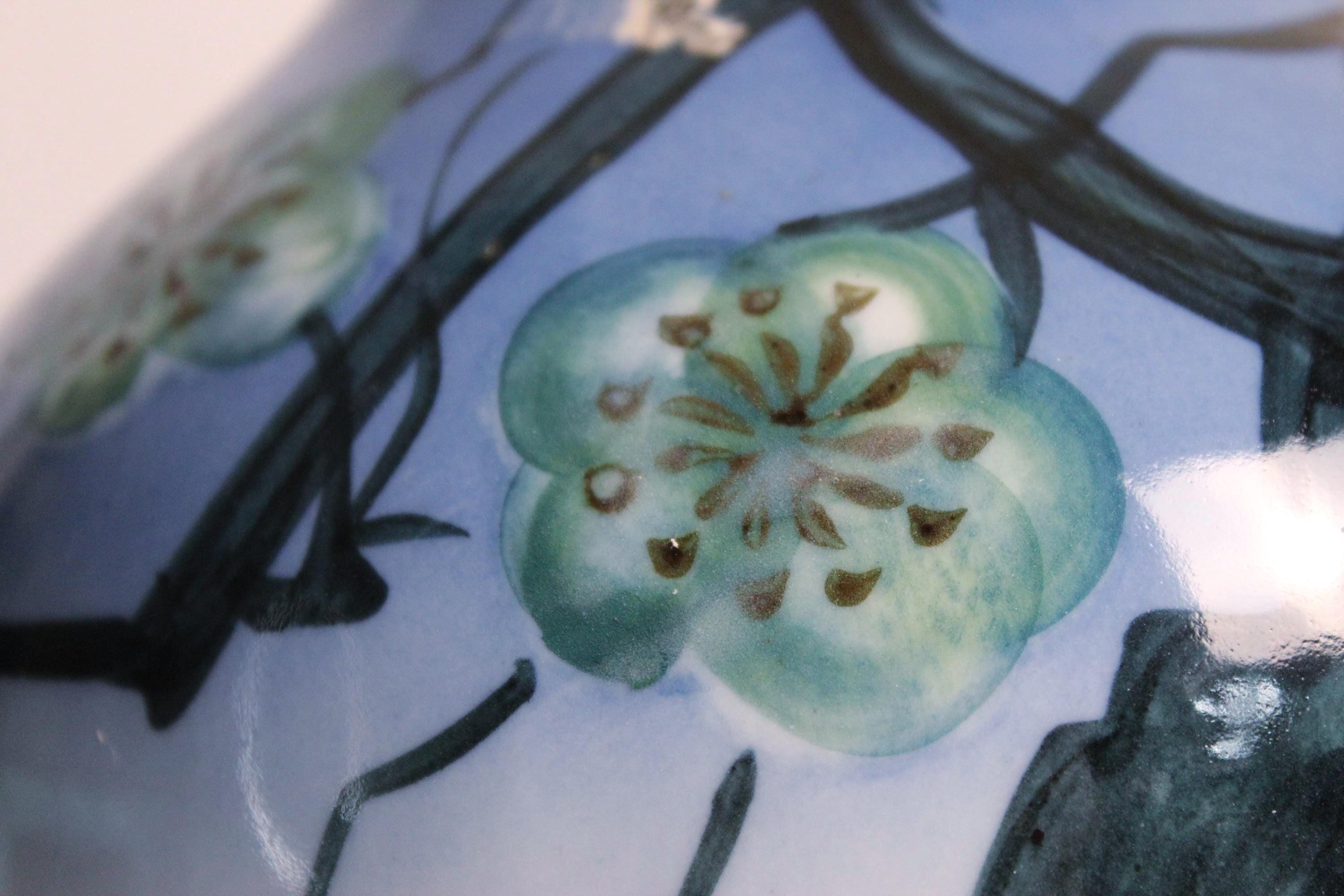 Vintage Japanese Hand Painted gorgeous Vase in Blue Green White. The design represents Japanese aesthetics that represent ancient ideals that include Wabi (transient and stark beauty) and Yugen (profound grace and subtlety) which is consistent with Japanese norms on what is considered tasteful or beautiful. The design depicts stylized dogwood blossom and branches. It looks different at every angle around the vase. Has part of the original sticker (see photos) written in Japanese. It is 8.5 inches tall and 7 inches wide. No chips, cracks or crazing. It is in excellent pre-owned condition. Price includes shipping.