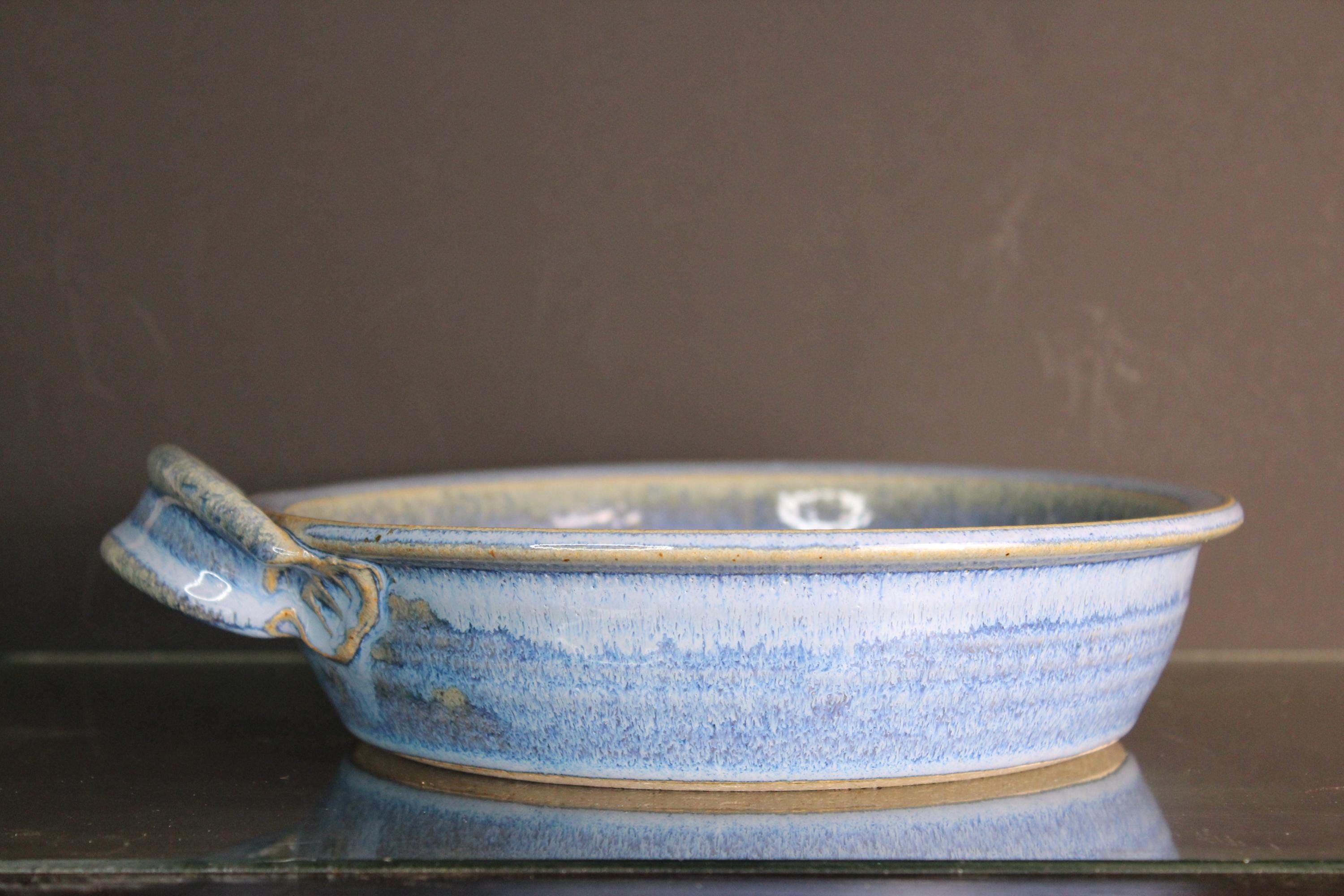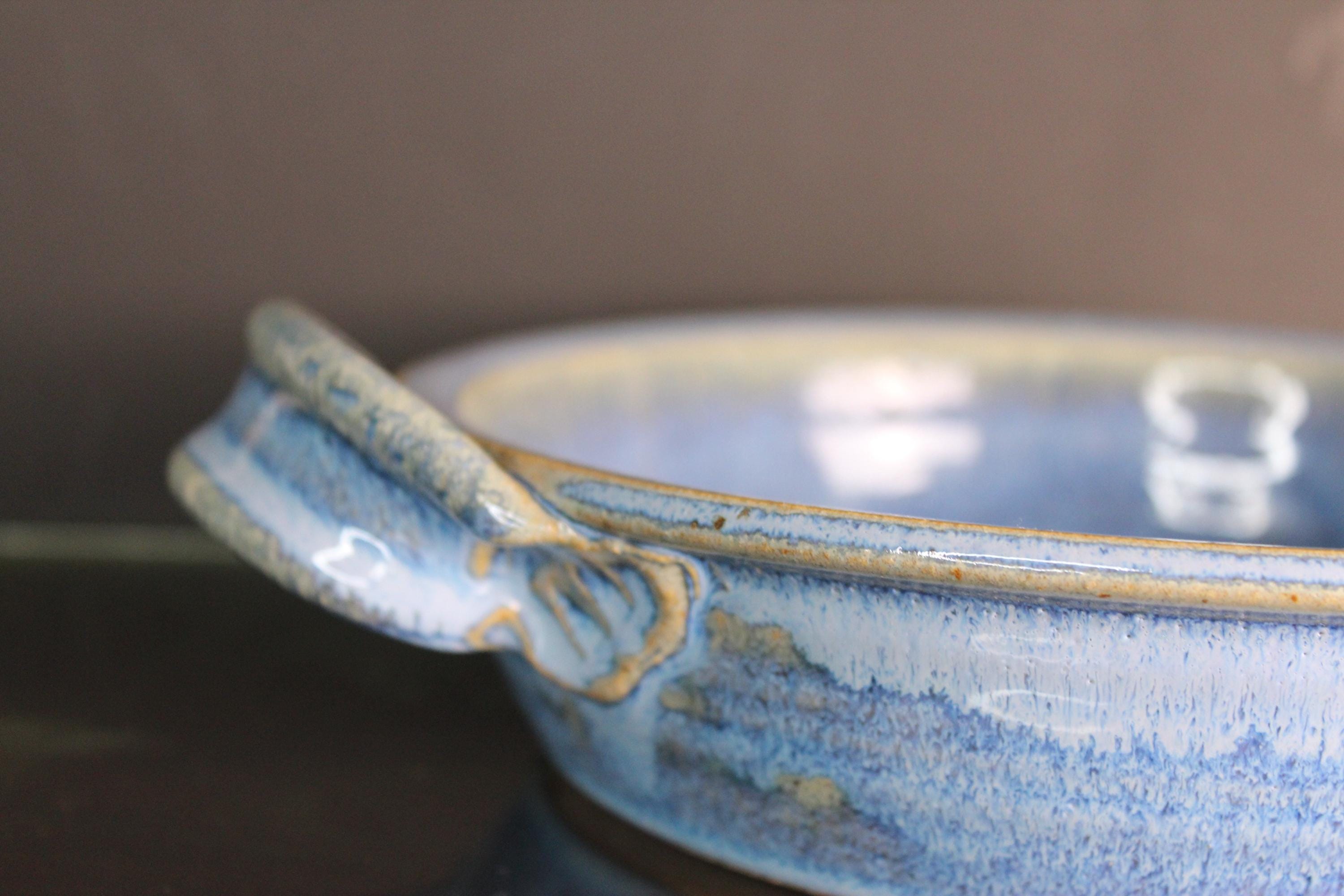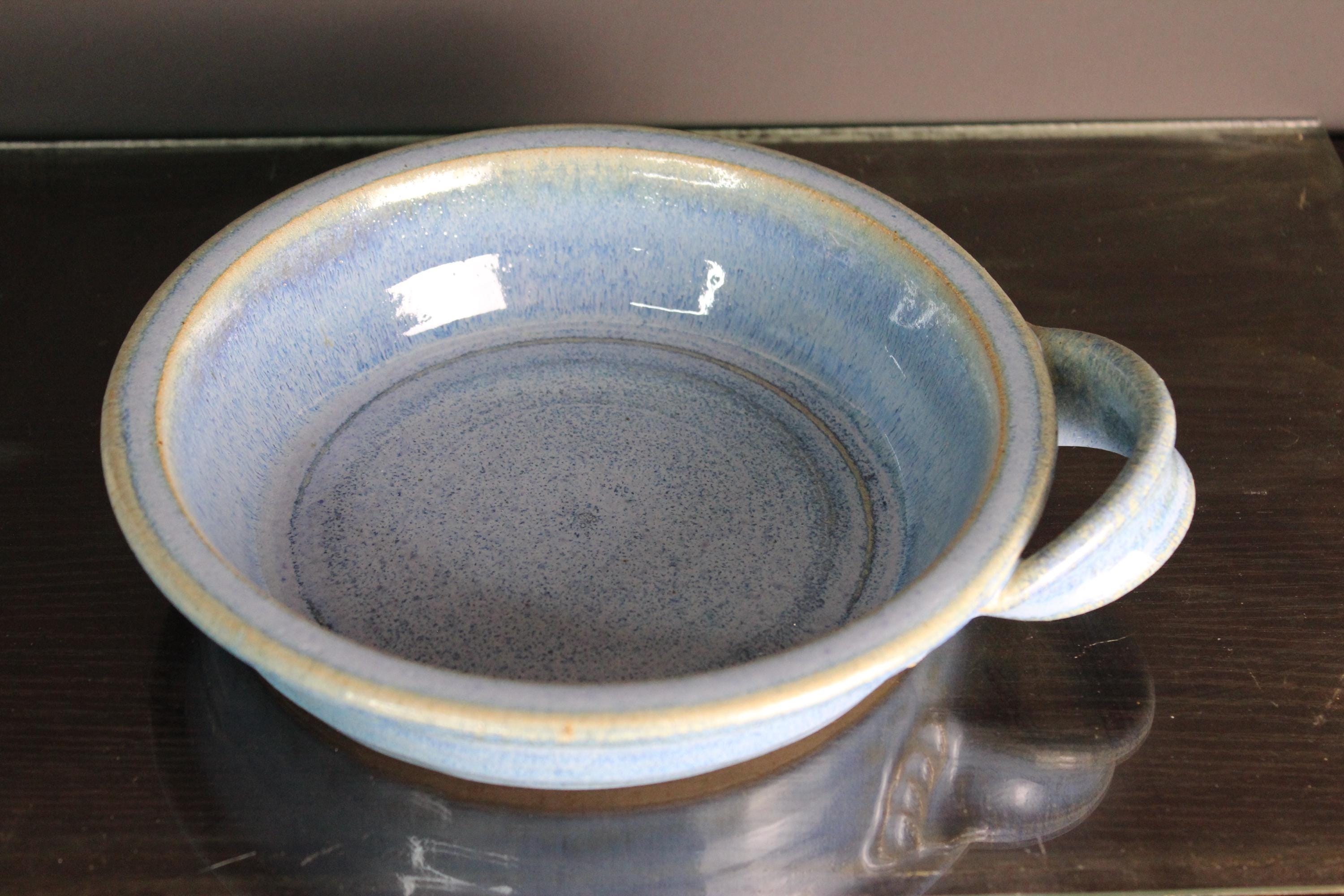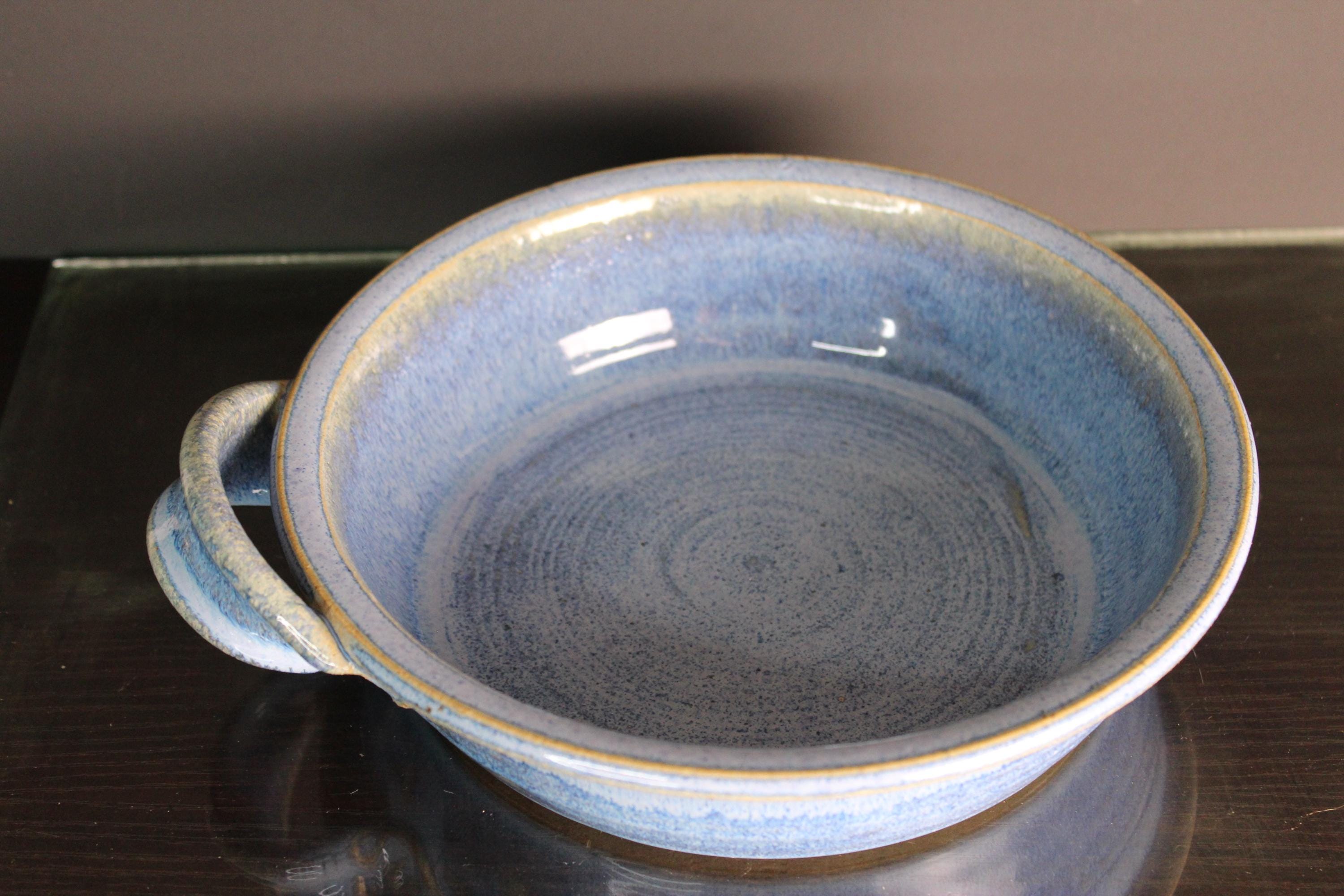 Gorgeous Hand Made Pottery Dishes Denim Blue Glaze. 8.25 inches wide and 2.0 inches deep. The handle details and the glaze make this an exceptionally nice piece. The artist has engraved their name on the back of the piece. The style of this piece makes it a functional piece of art that can have many uses that is beautiful to look at. It is in pristine pre-loved condition.