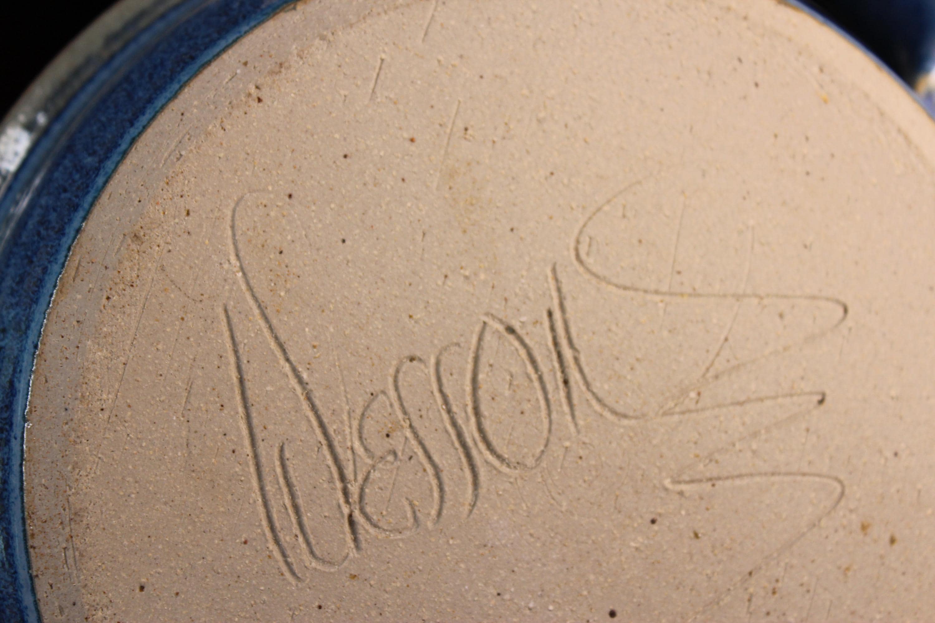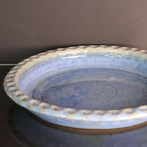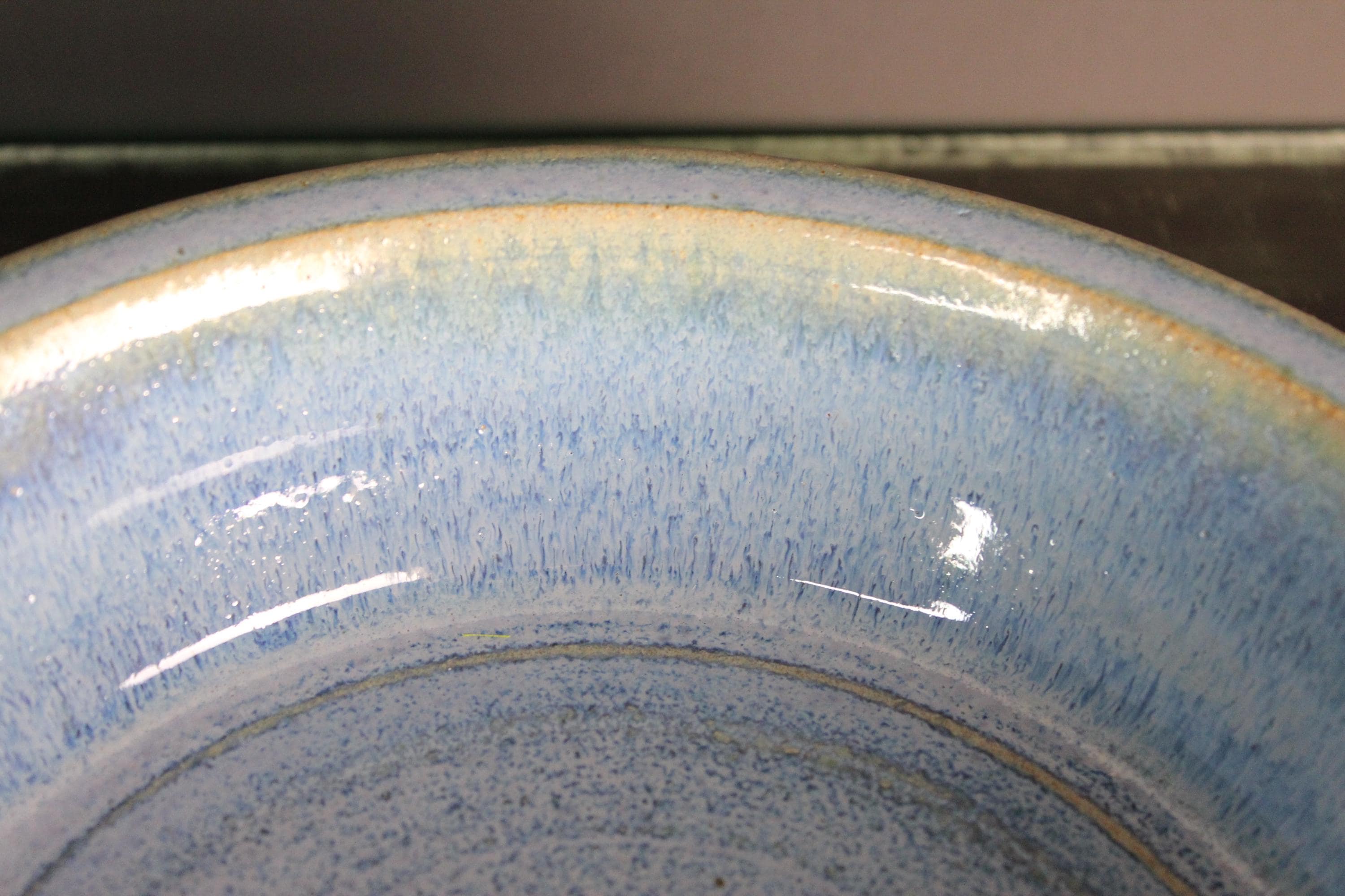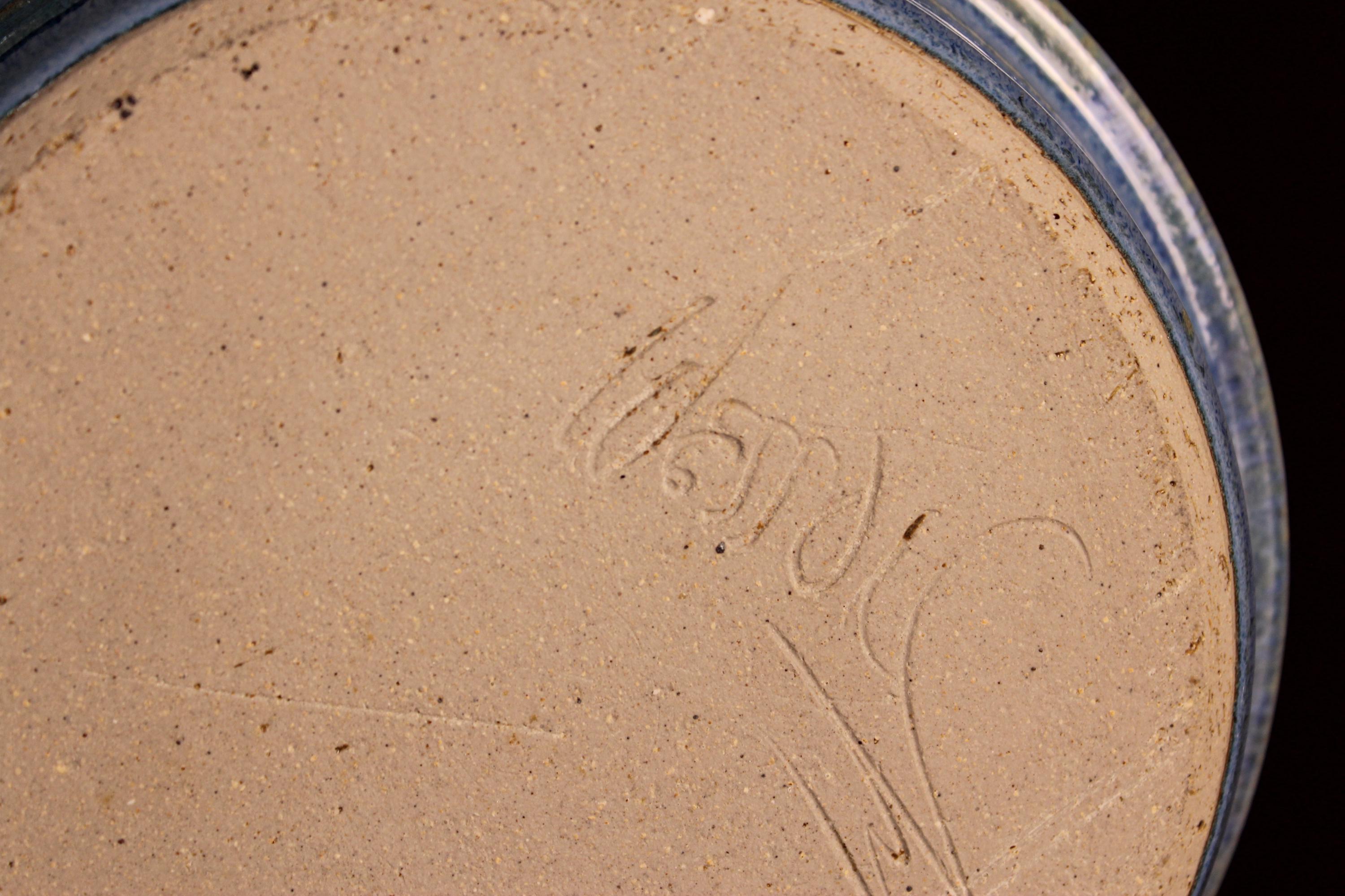 Gorgeous Hand Made Pottery Dishes Denim Blue Glaze. 8.25 inches wide and 2.0 inches deep. The handle details and the glaze make this an exceptionally nice piece. The artist has engraved their name on the back of the piece. The style of this piece makes it a functional piece of art that can have many uses that is beautiful to look at. It is in pristine pre-loved condition.