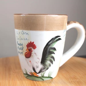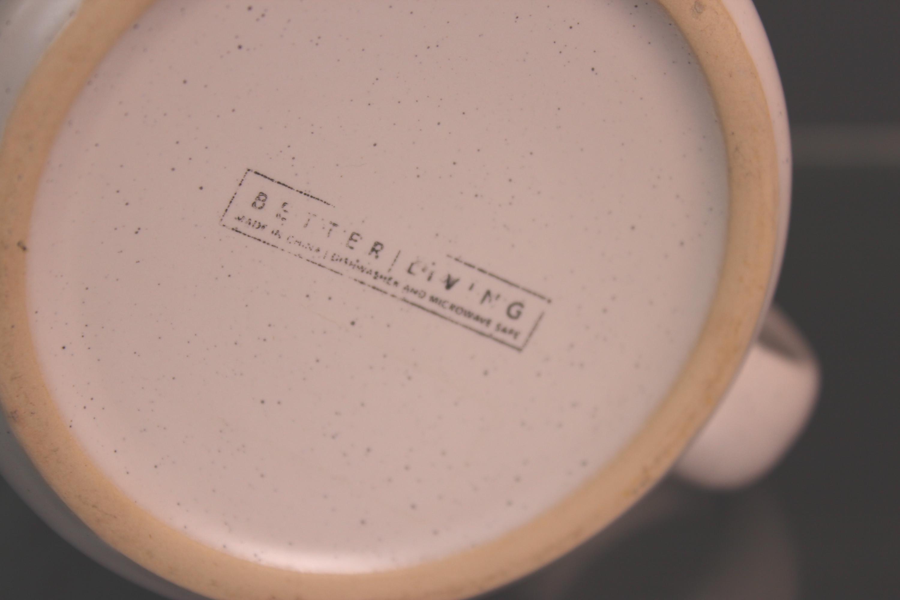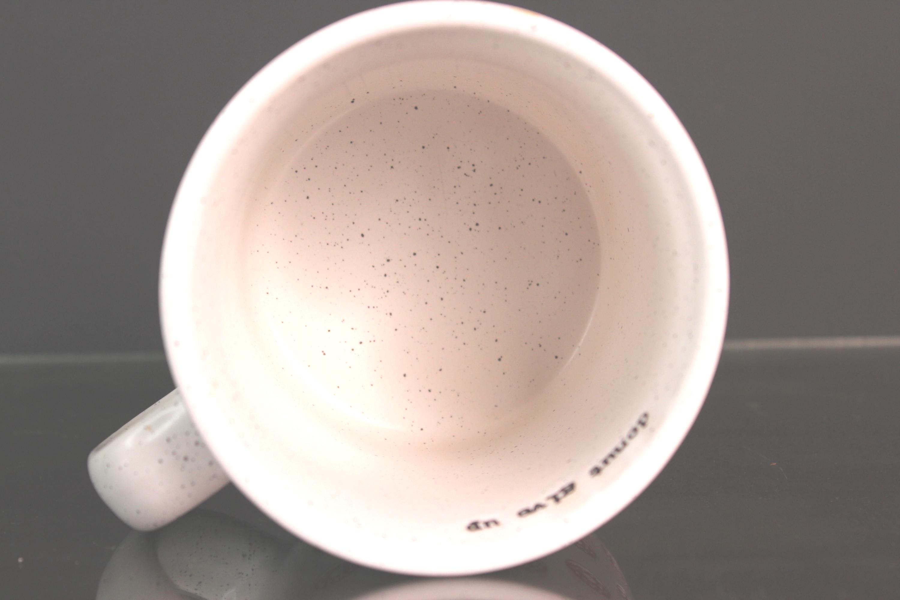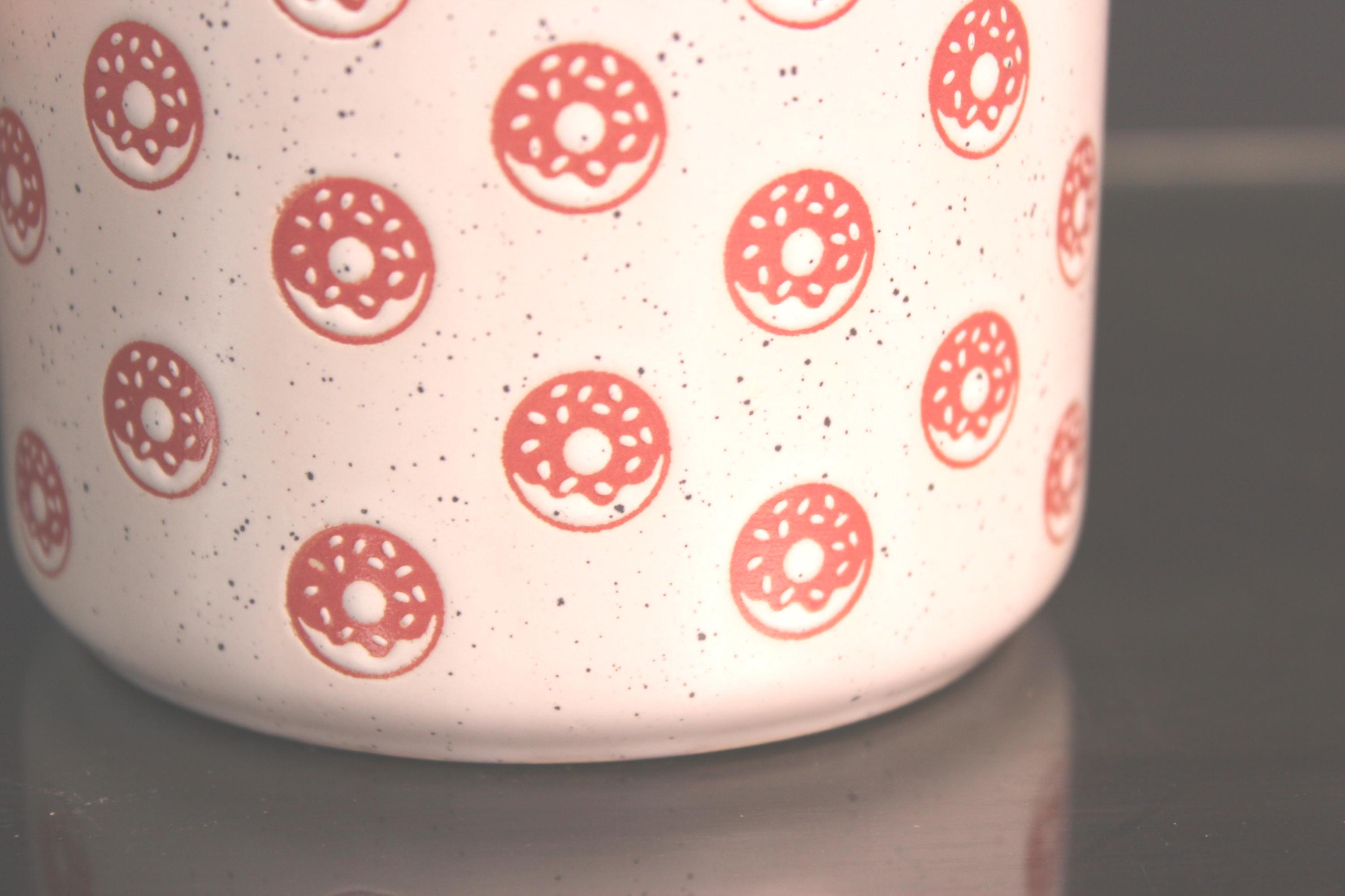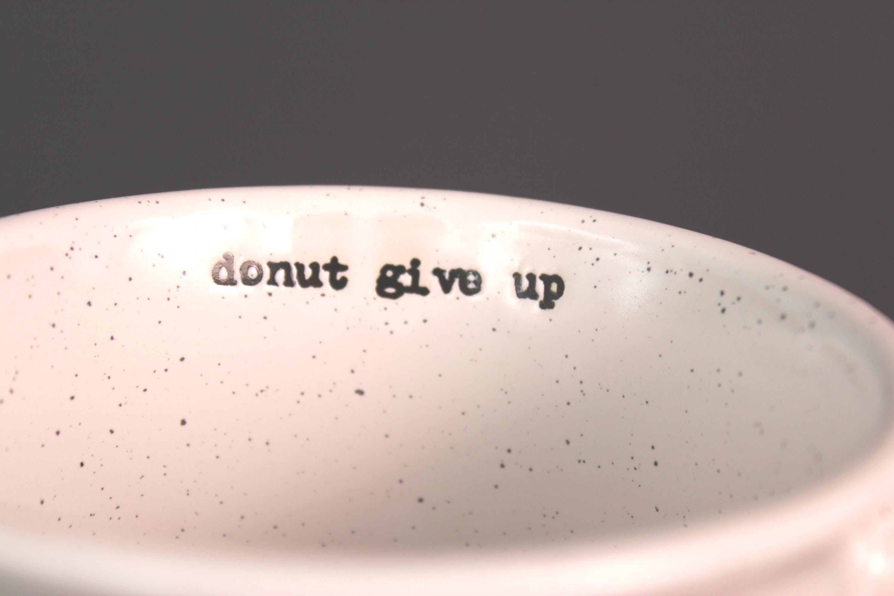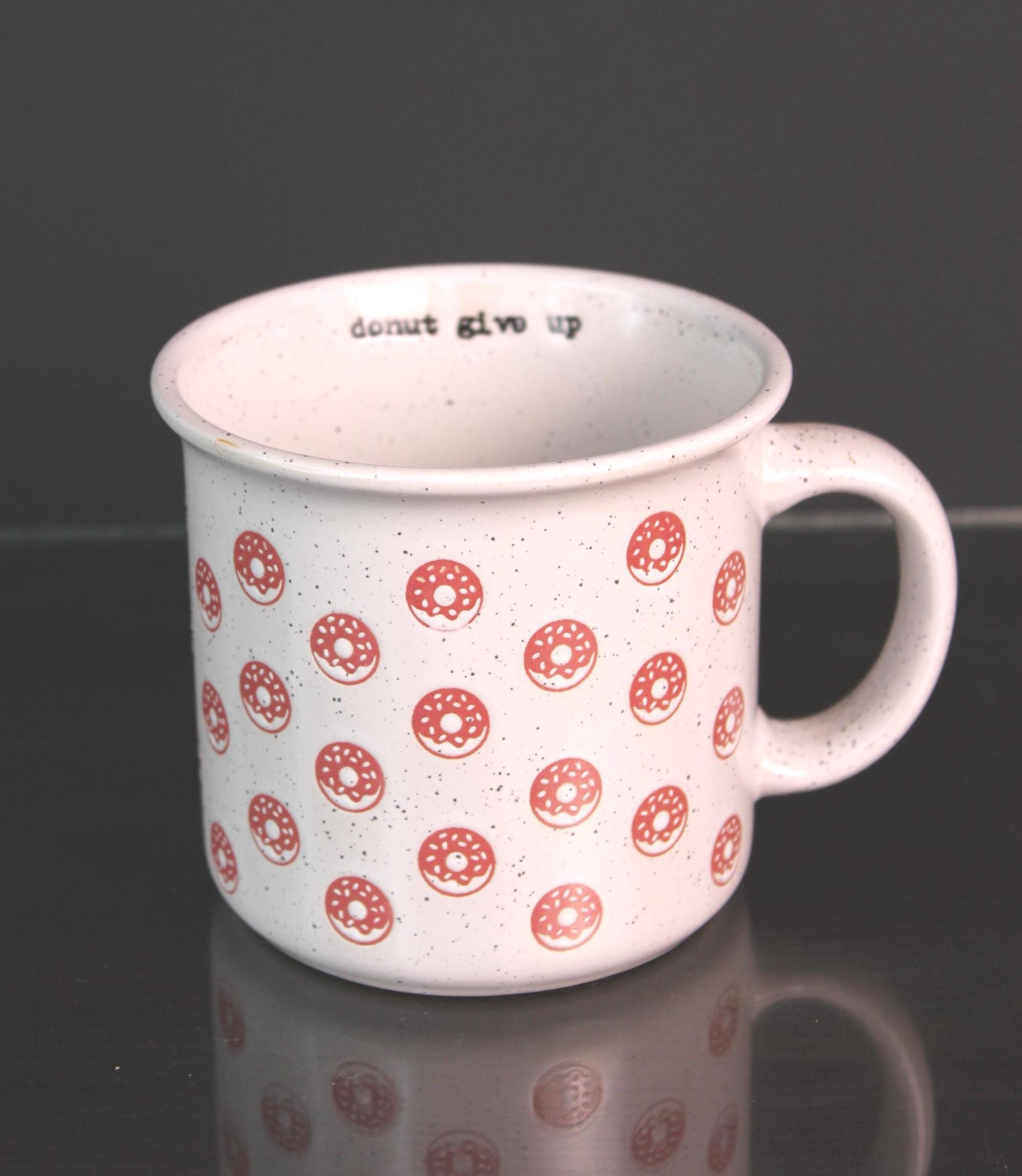 Super fun mug for your favorite hot beverage. It is a sturdy mug with a very nice, speckled glaze. It has embossed donuts in a reddish terra cotta color. The words "Donut Give Up" are embossed in black in the inside of the mug. The handle is roomy and fits the hand well. It is made by Better Living. Price includes shipping!