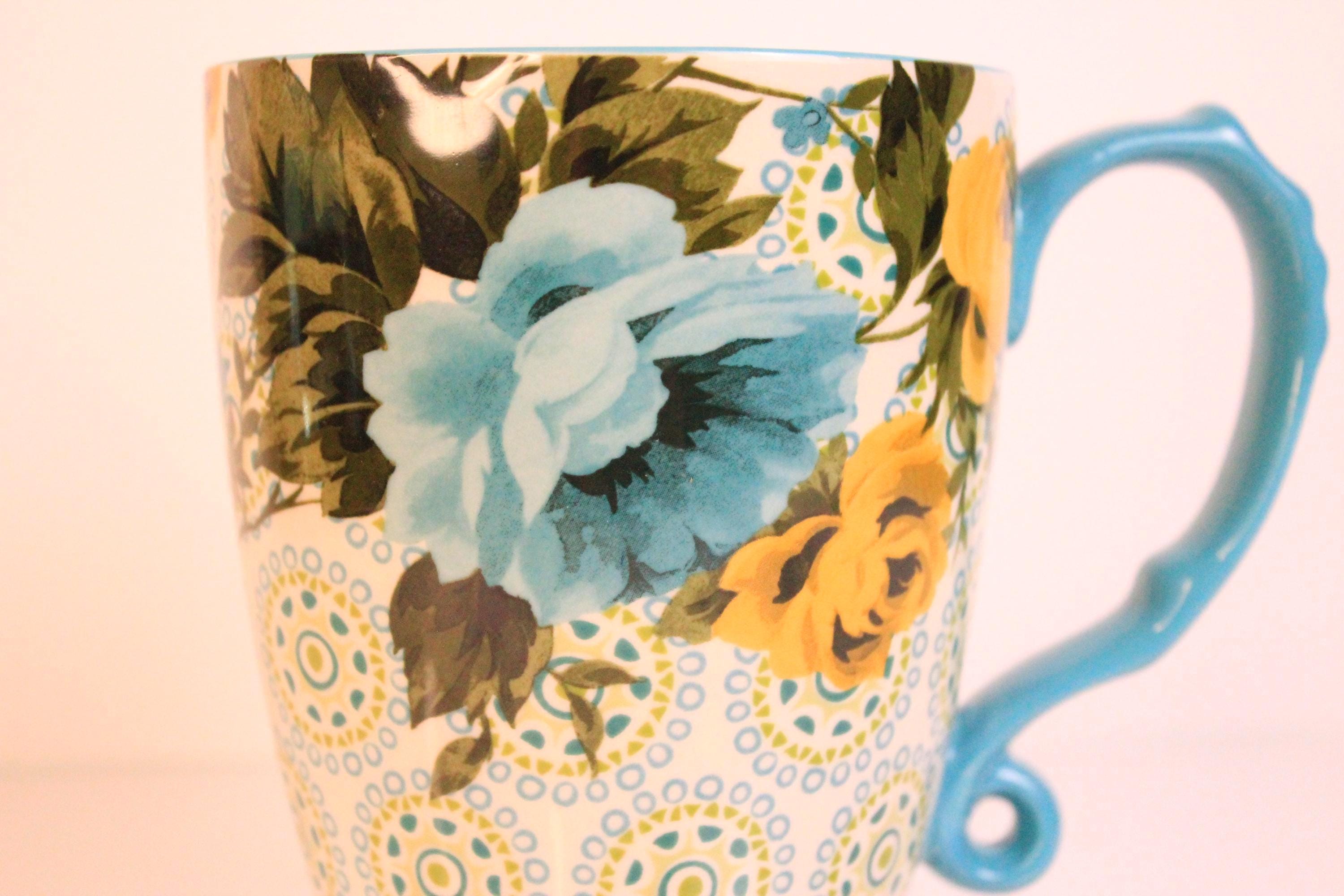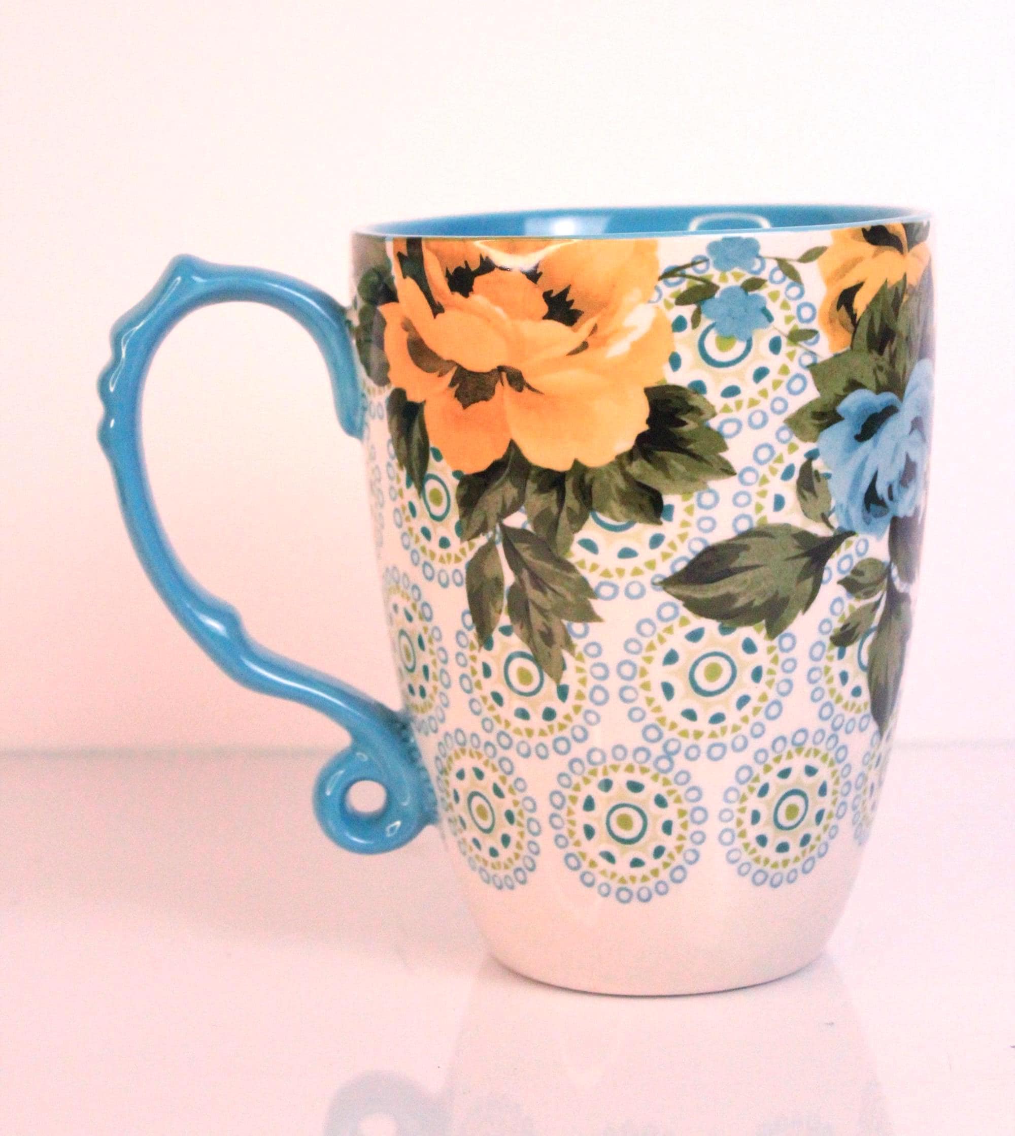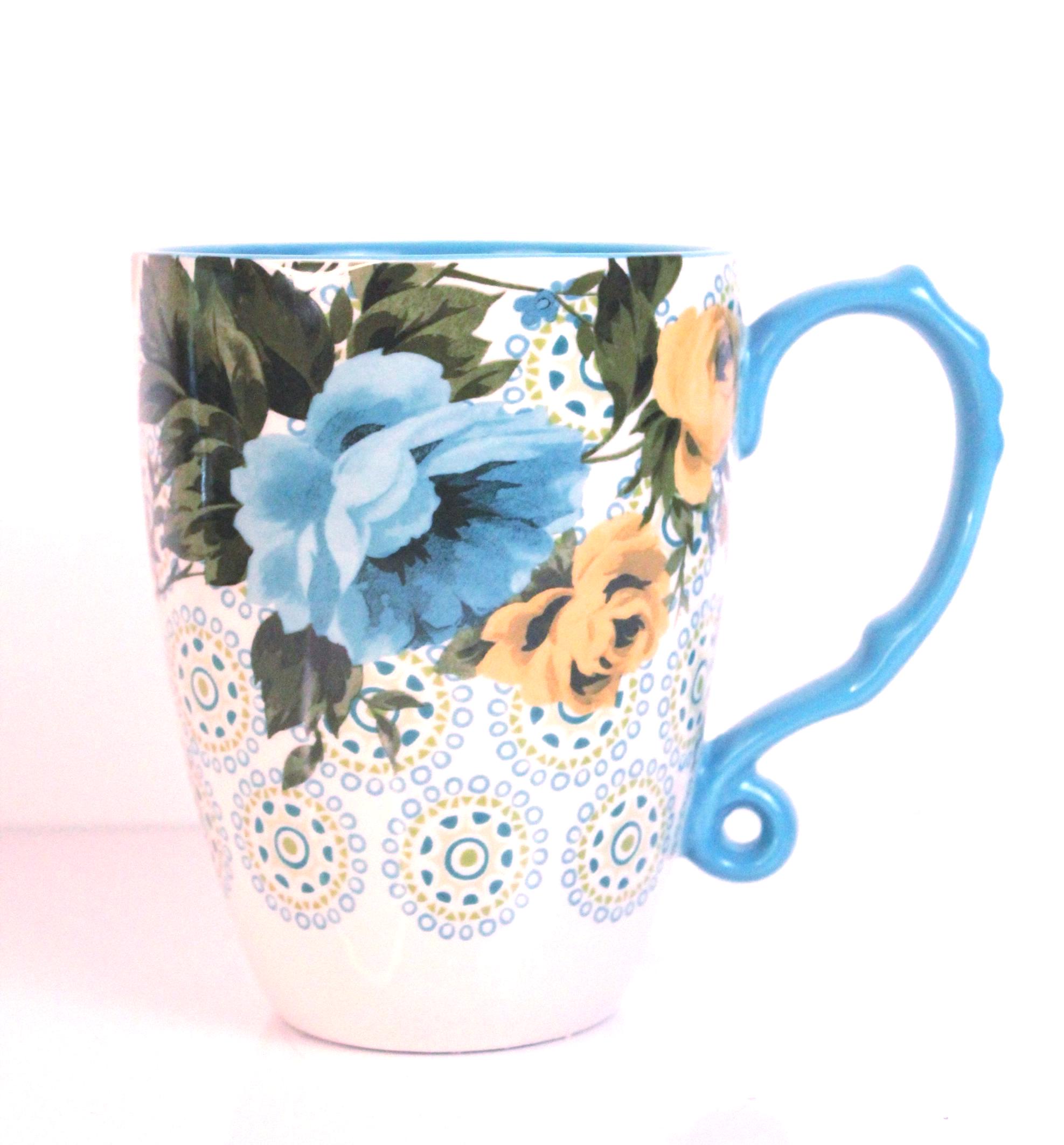 Pioneer Woman Rose Shadow 24 oz Floral Jumbo Latte Mug. This is a beautiful vibrant floral pattern with blue and yellow flowers. The inside of the mug is the very pretty turquoise blue, the same as the handle. Even the handle is pretty to look at! It is a large capacity for your favorite beverage. Made in durable stoneware, it is both microwave and dishwasher safe.