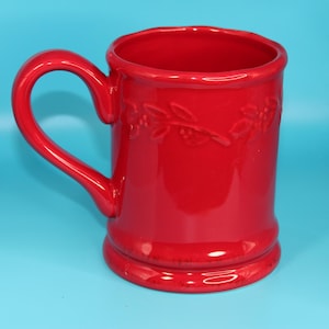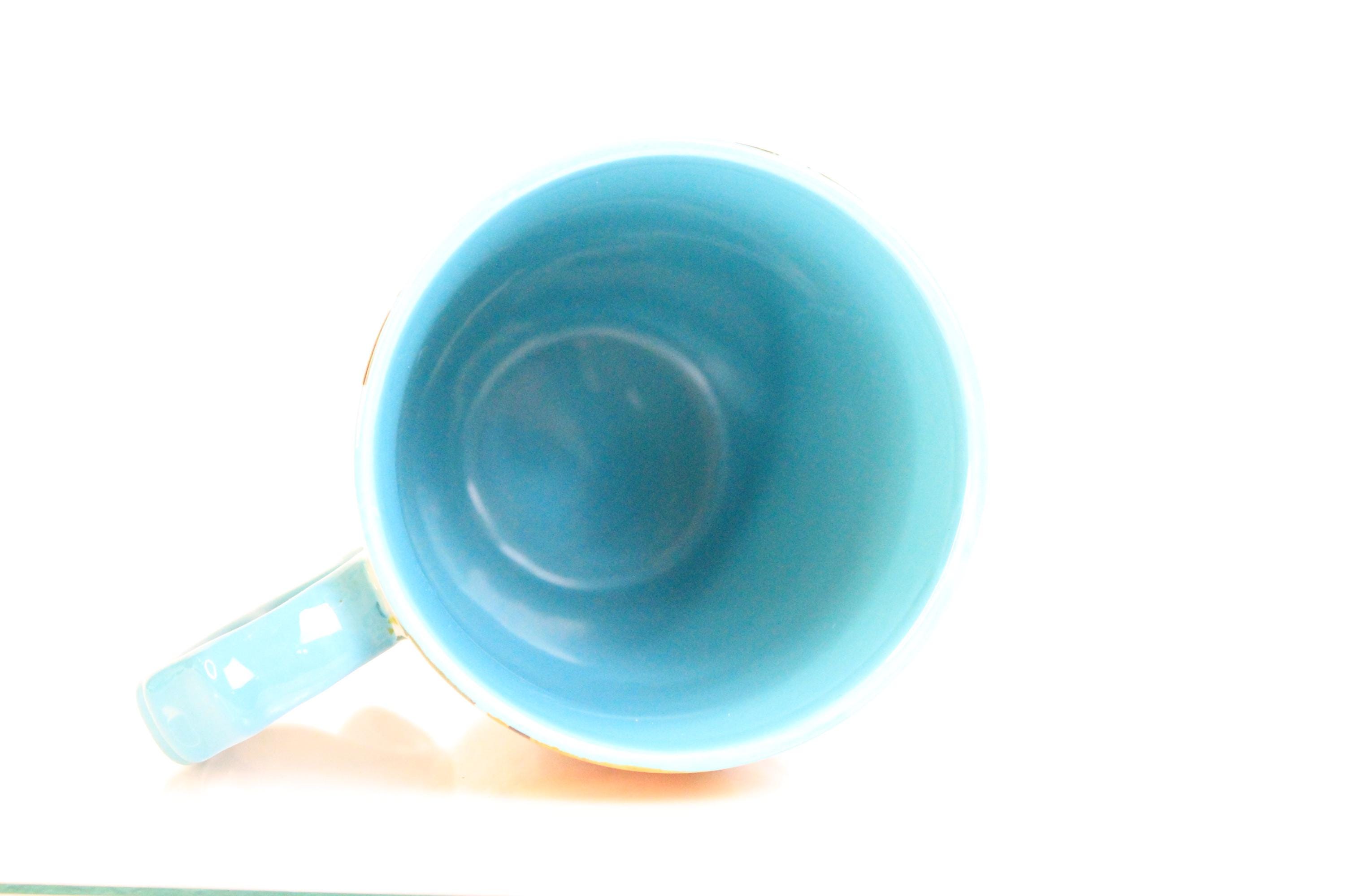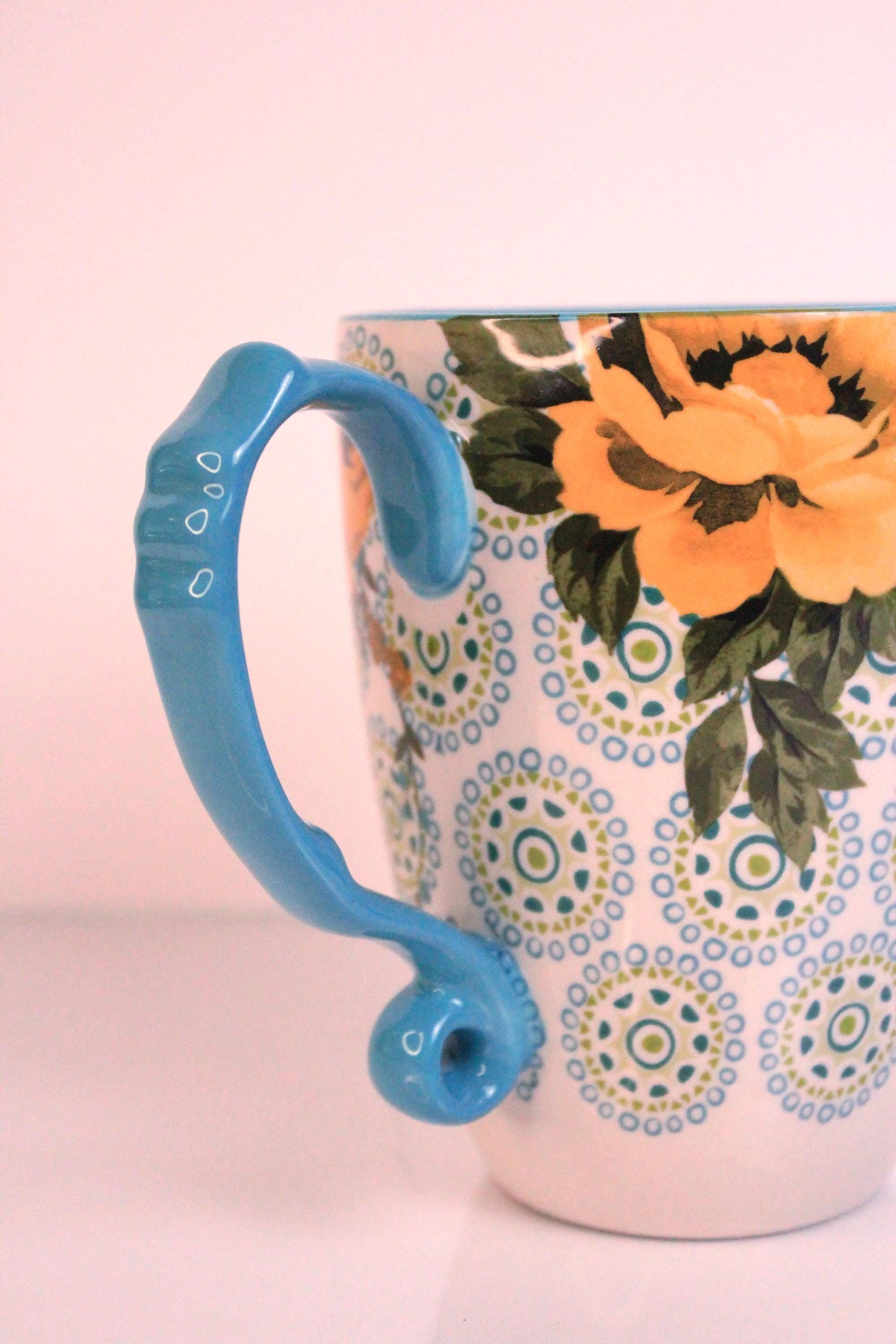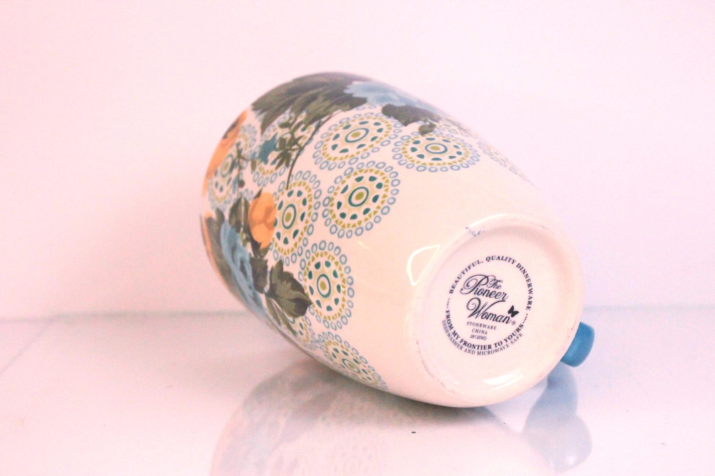 Pioneer Woman Rose Shadow 24 oz Floral Jumbo Latte Mug. This is a beautiful vibrant floral pattern with blue and yellow flowers. The inside of the mug is the very pretty turquoise blue, the same as the handle. Even the handle is pretty to look at! It is a large capacity for your favorite beverage. Made in durable stoneware, it is both microwave and dishwasher safe.