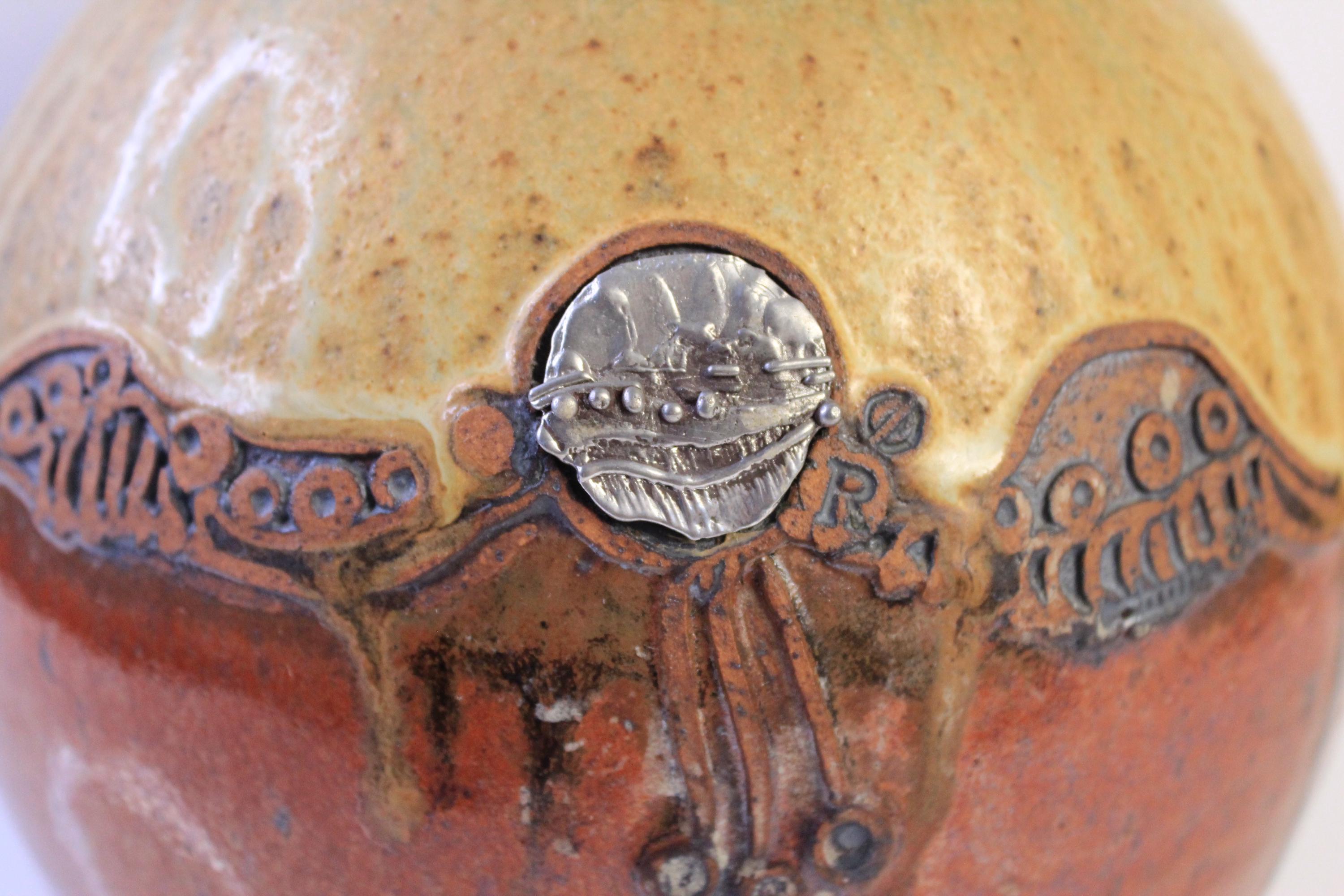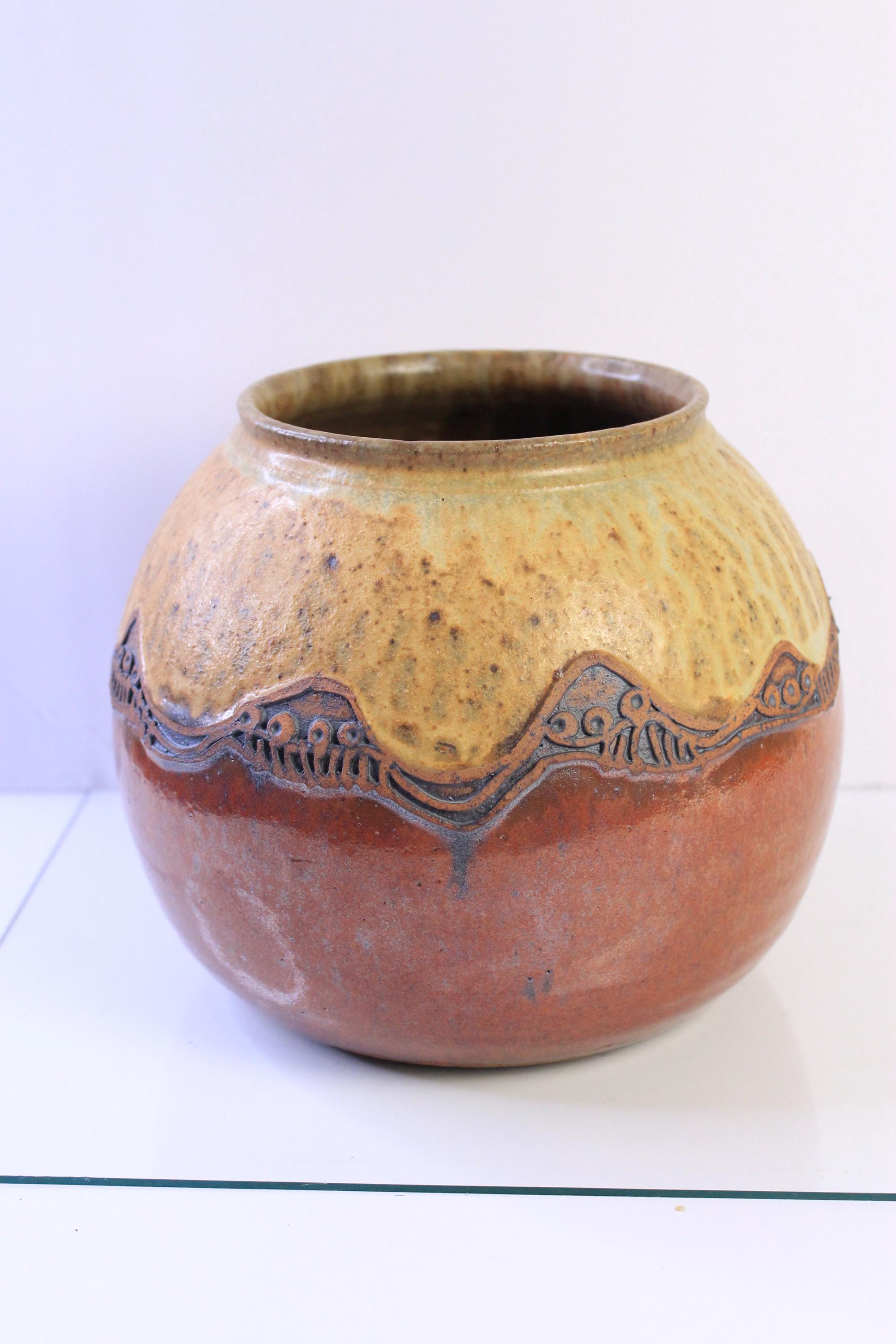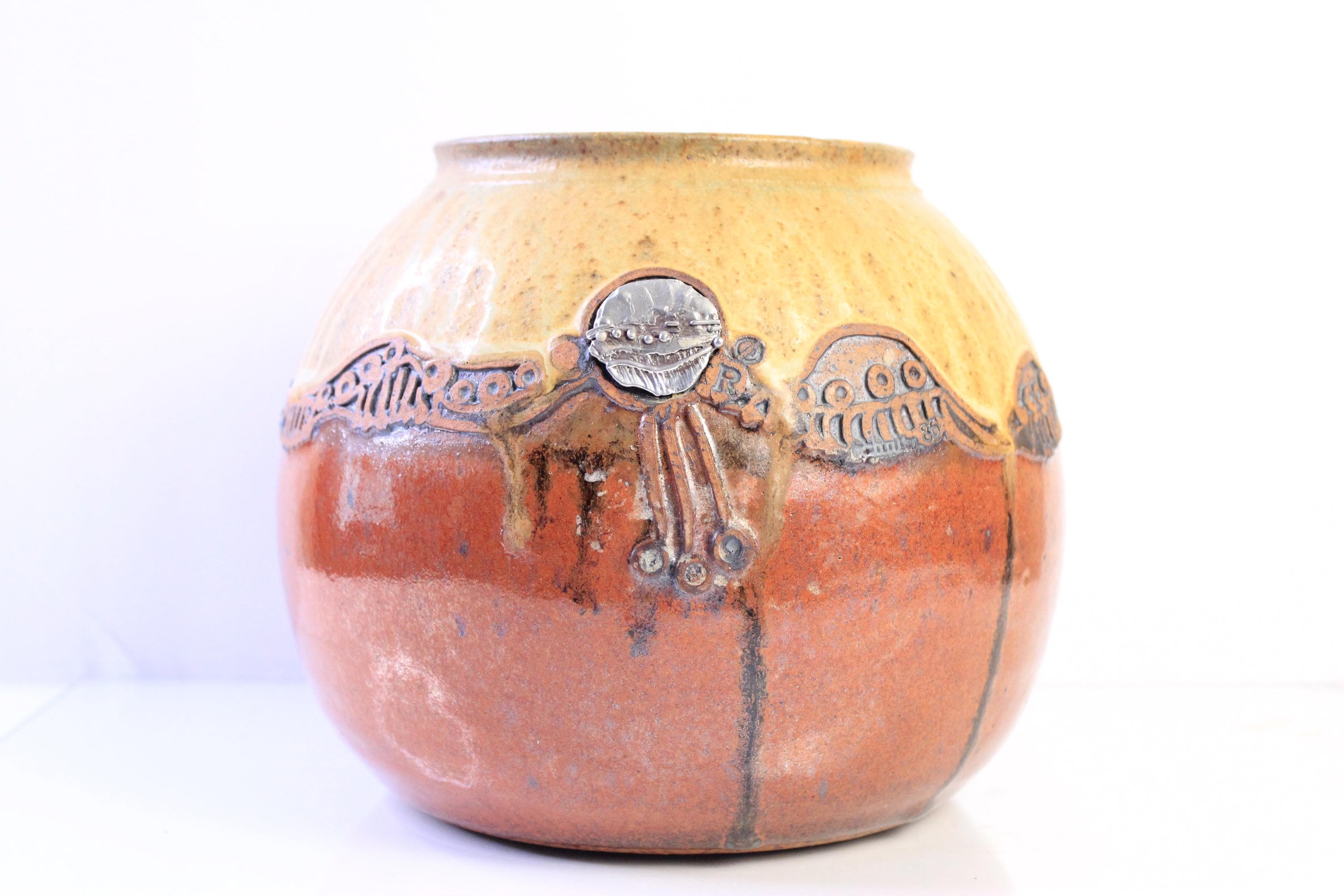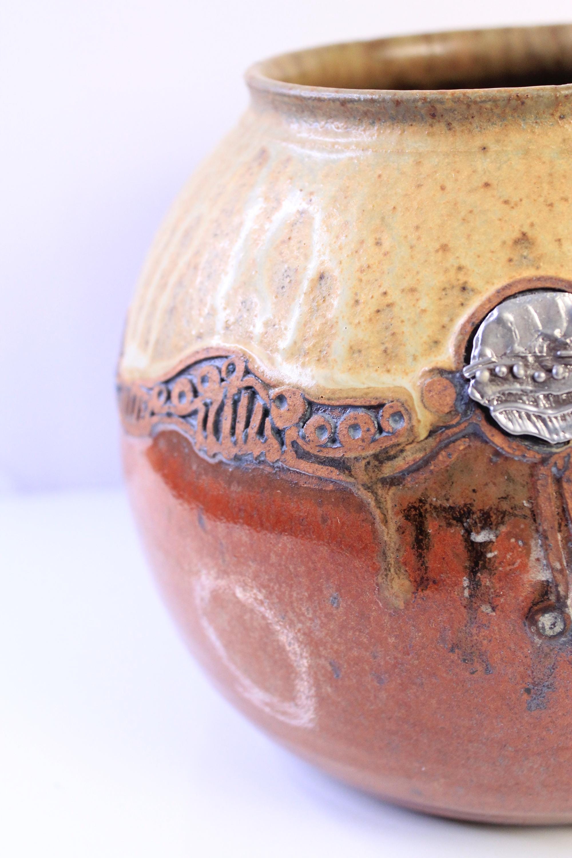 This is a very beautiful pottery art piece. The artist uses mixed media including clay and metal along with the textural carvings that add so much visual interest! The glaze is also mixed with a dark rust and a tan poured effect. It is a pleasure to behold and is a complement to any decor. It is signed (engraved) on the bottom of the piece by the artist. It is 7 inches high and 8 inches wide. It is in excellent pre-loved condition. Shipping included!