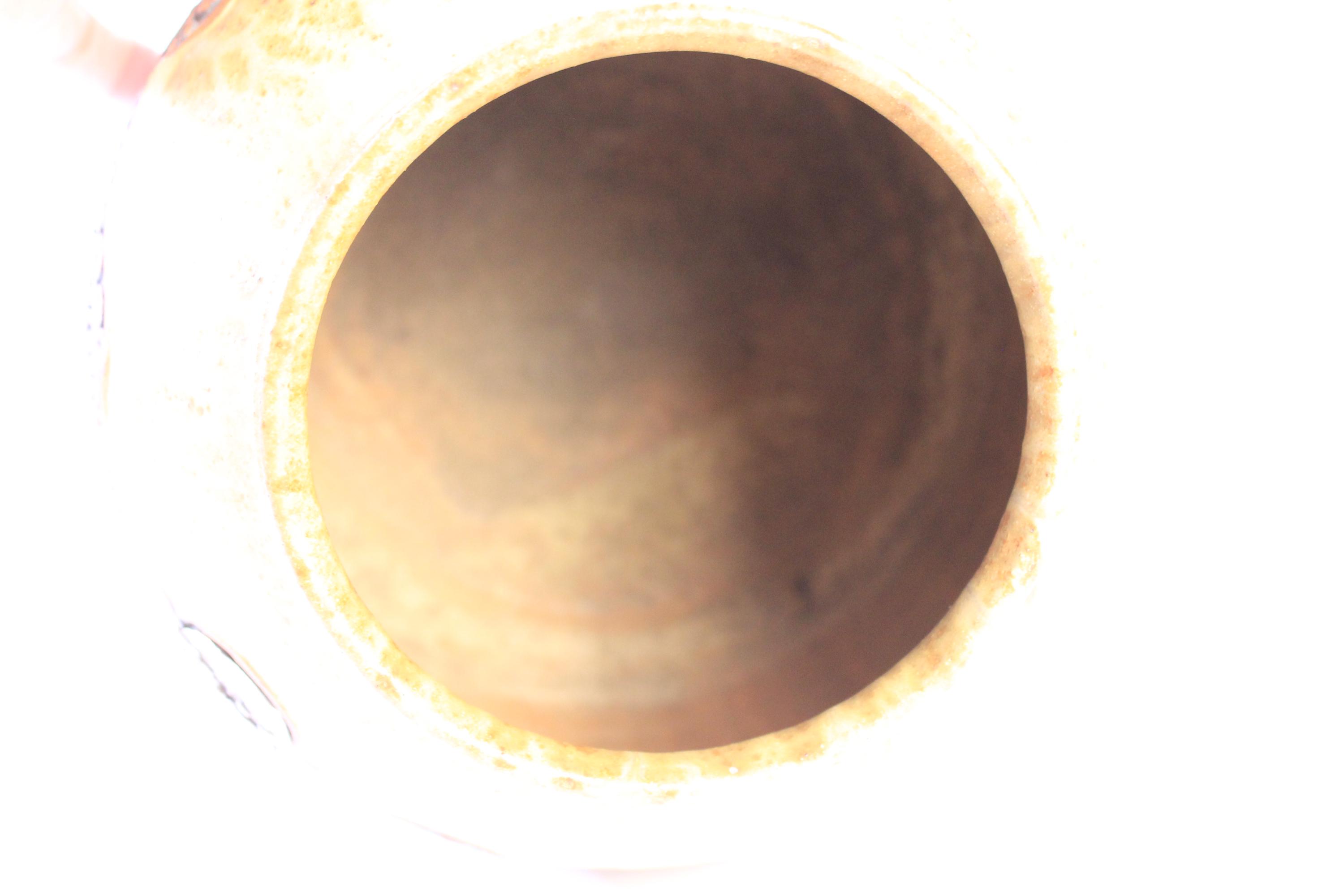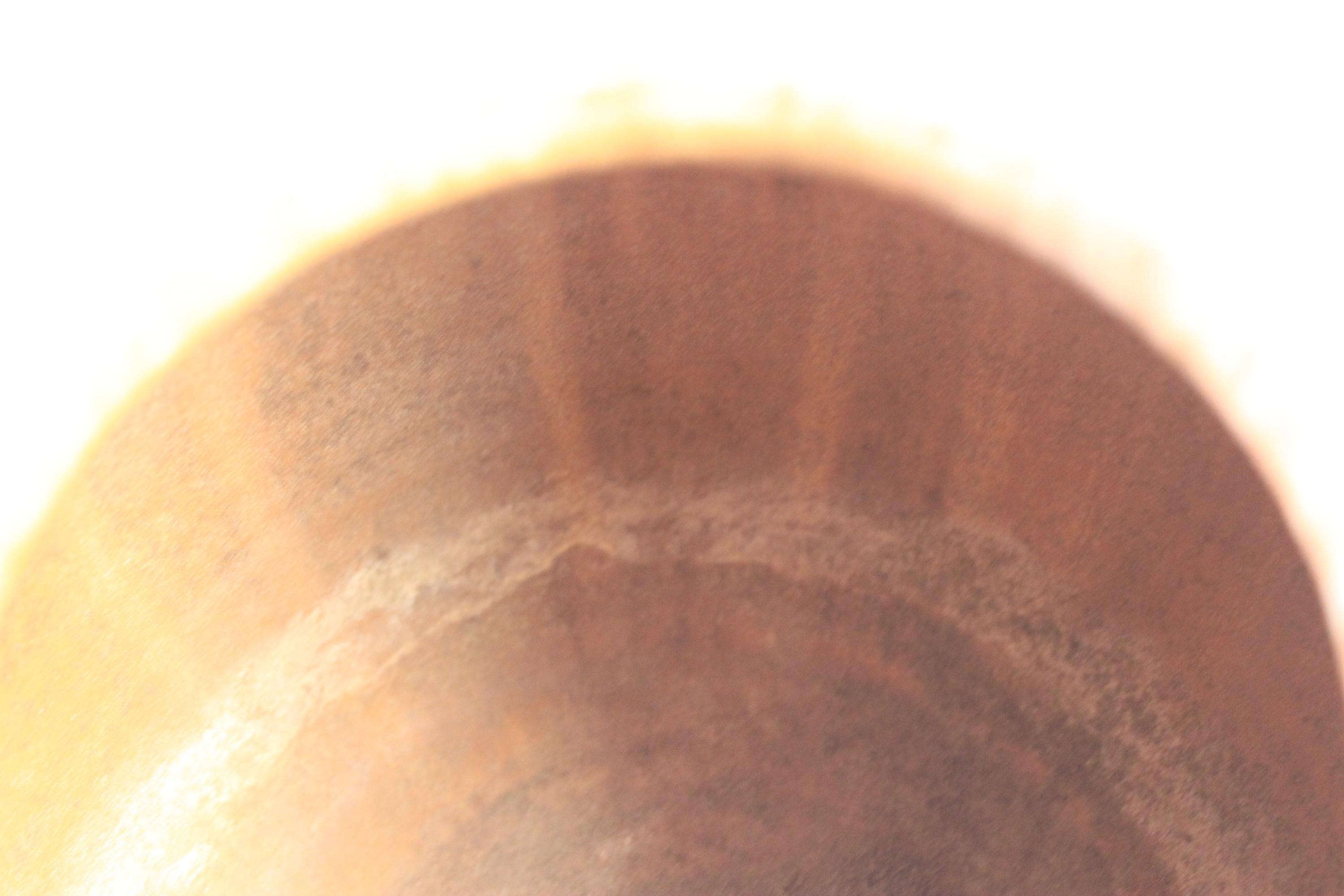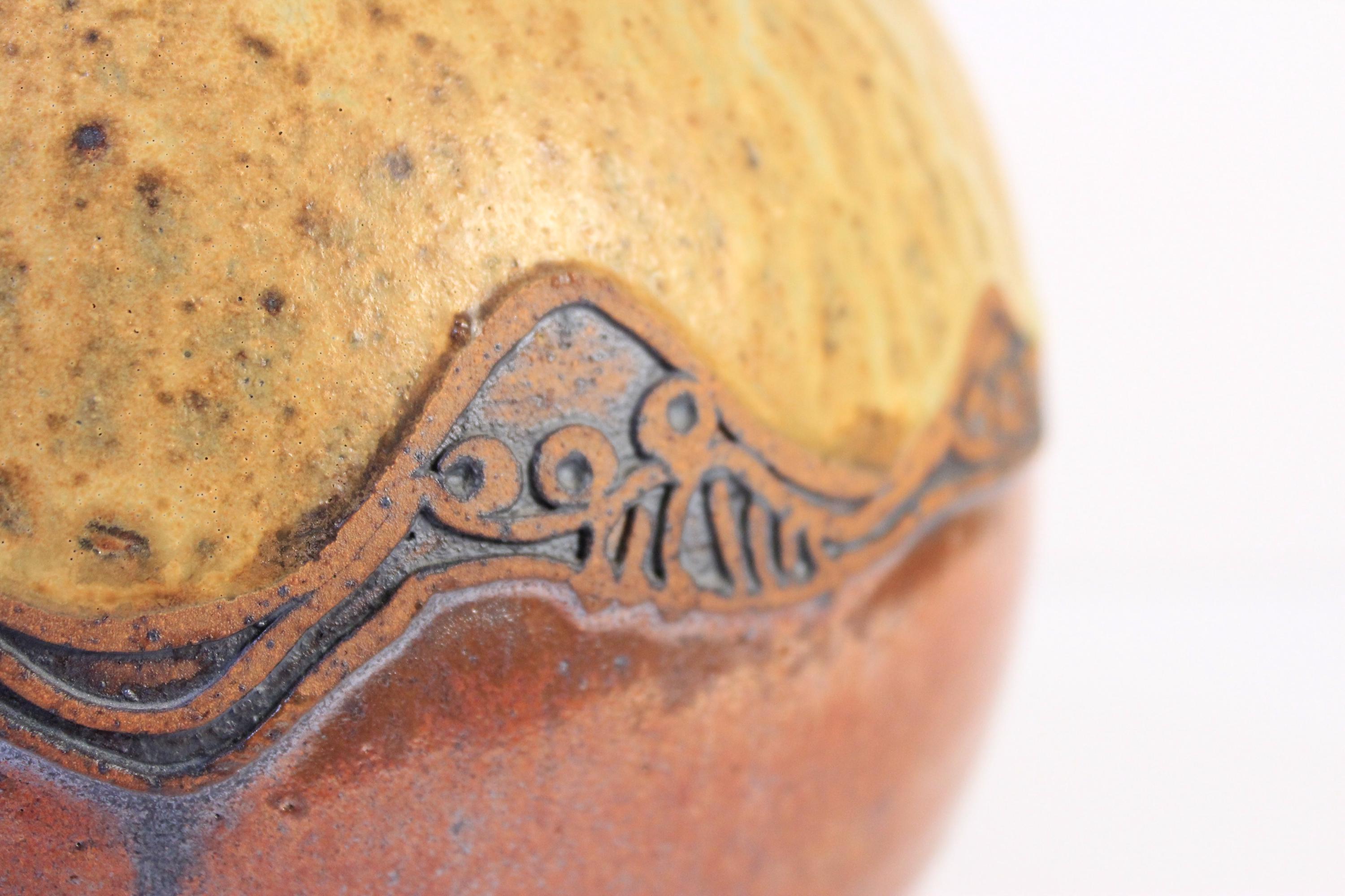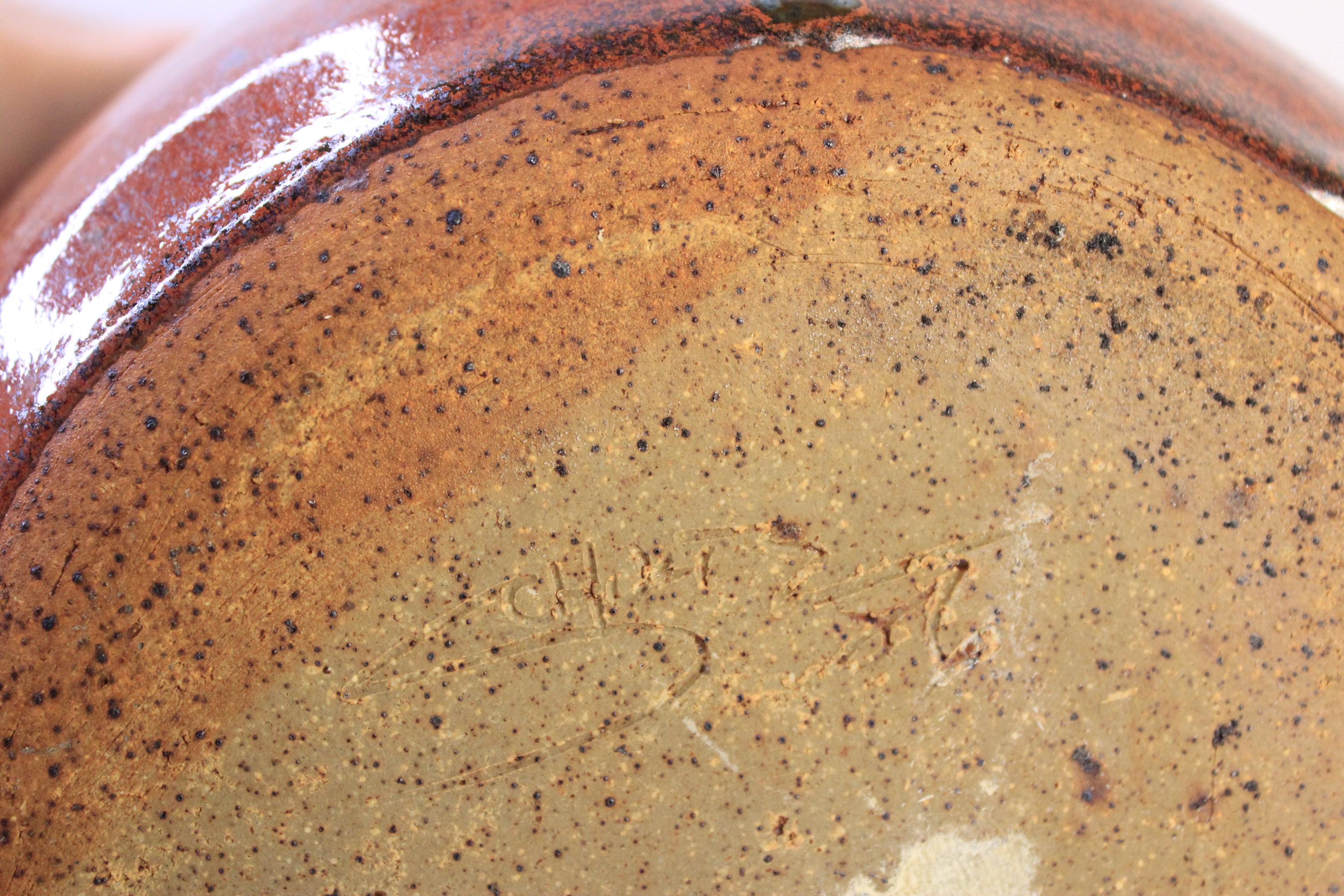 This is a very beautiful pottery art piece. The artist uses mixed media including clay and metal along with the textural carvings that add so much visual interest! The glaze is also mixed with a dark rust and a tan poured effect. It is a pleasure to behold and is a complement to any decor. It is signed (engraved) on the bottom of the piece by the artist. It is 7 inches high and 8 inches wide. It is in excellent pre-loved condition. Shipping included!