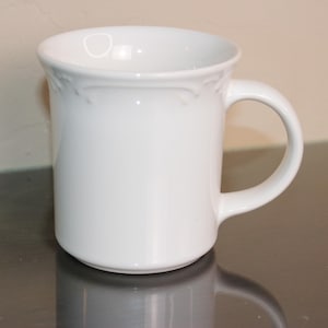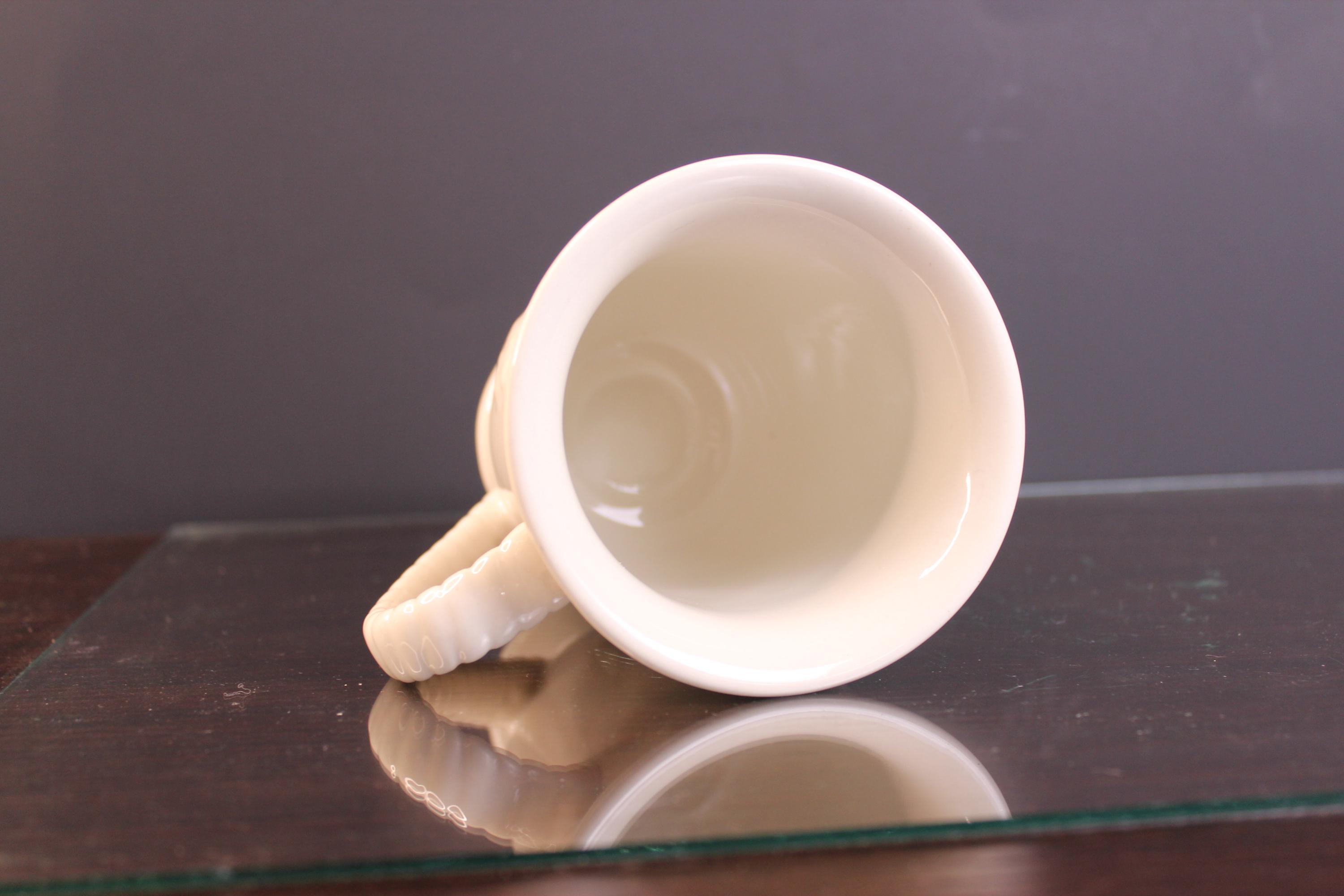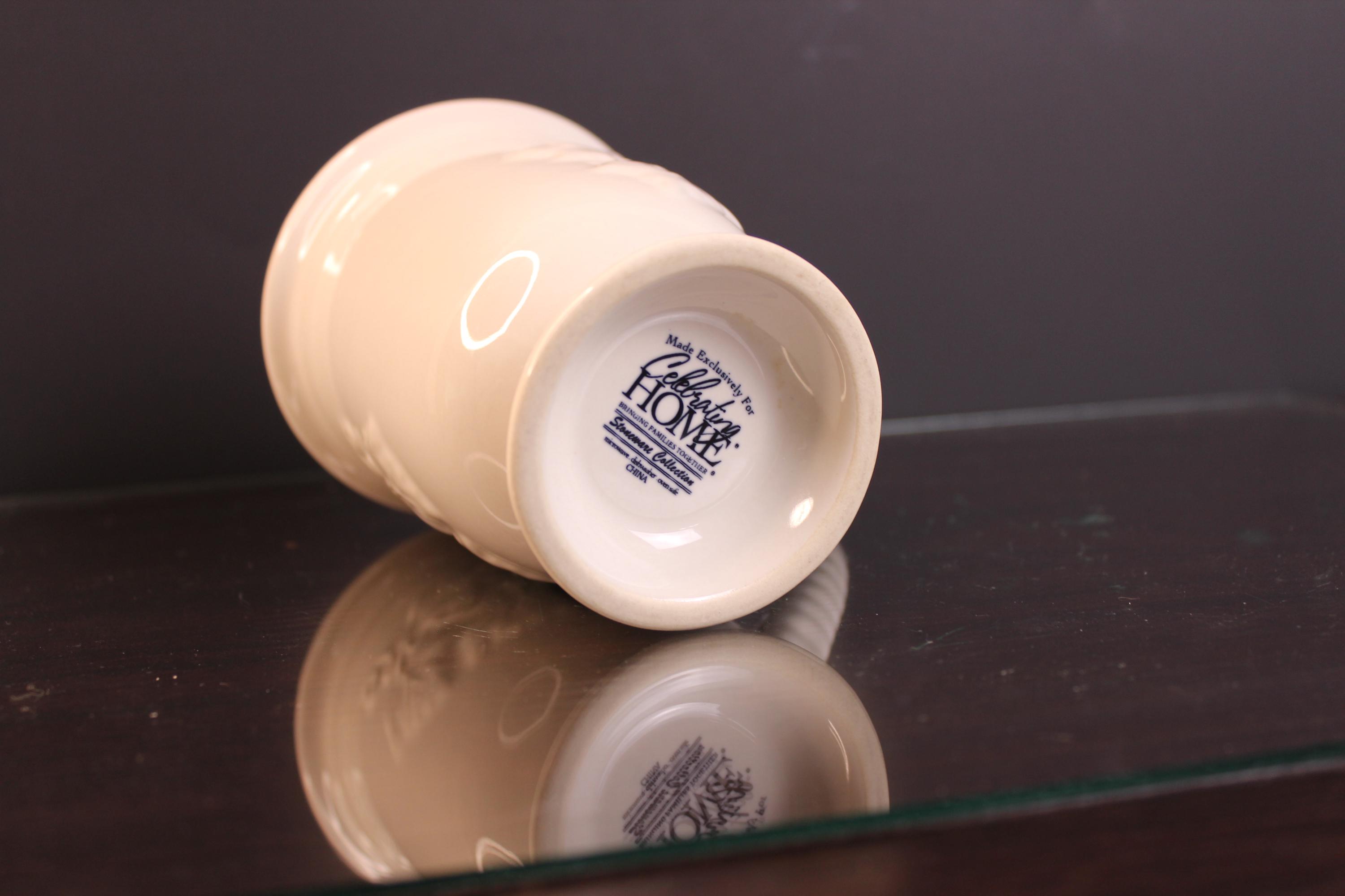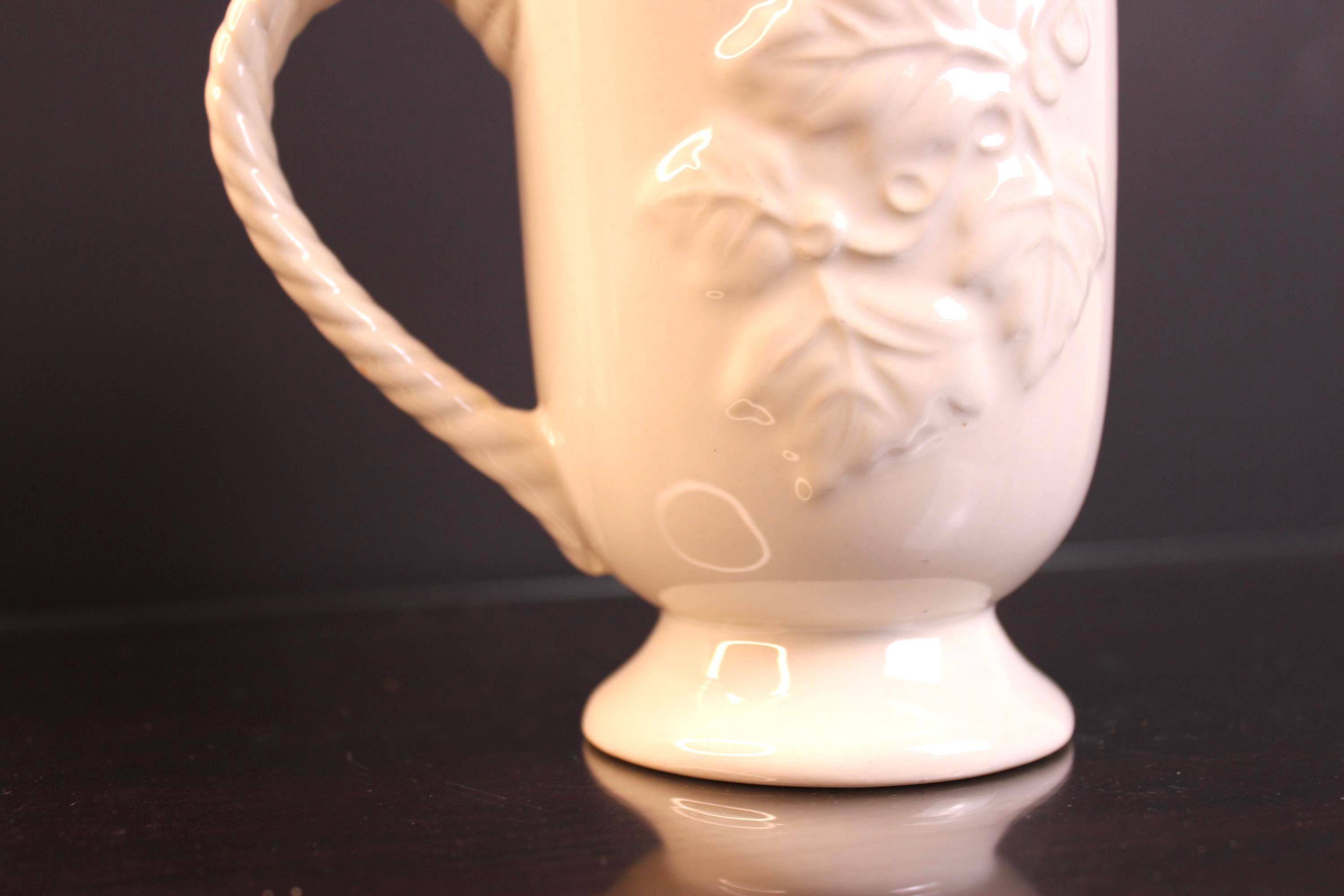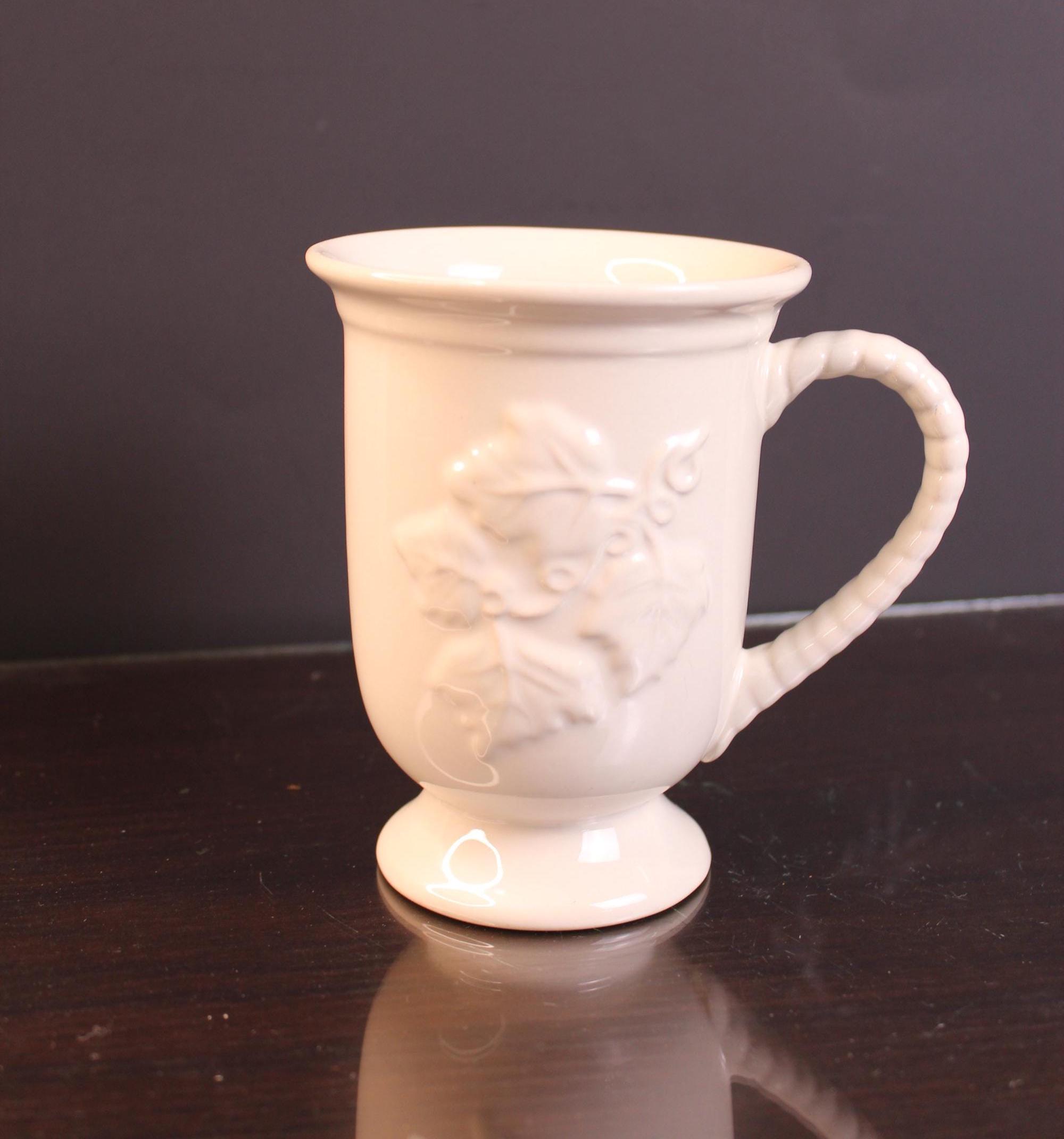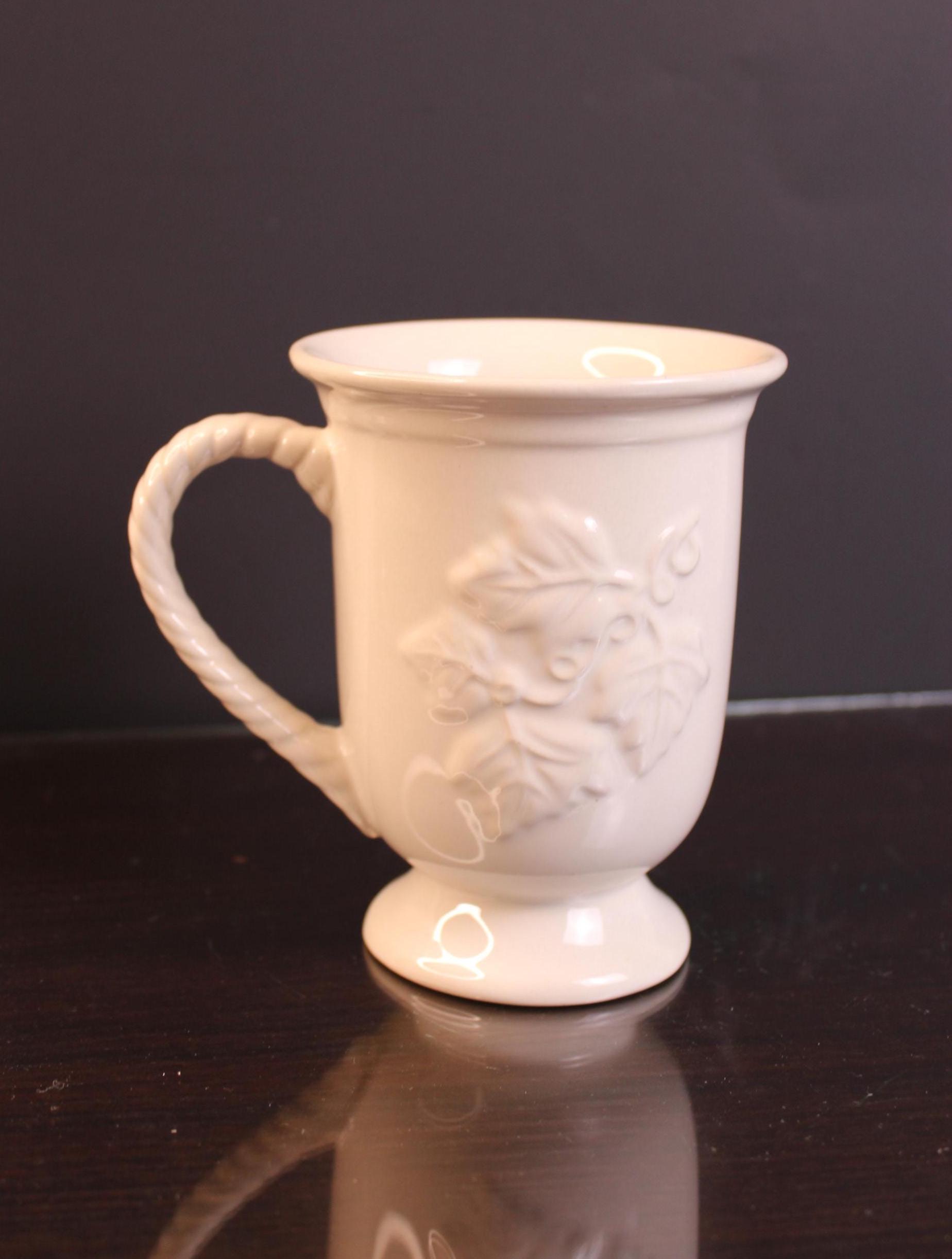 Replacement Coffee Tea Pedestal Mug "Veranda Home and Garden Party" Celebrating Home Stoneware Collection in a creamy white. A rope handle adds visual interest and the vine and leaf embossed pattern on both sides of the mug is a timeless design. This charming stoneware mug is at home in most decor. It is in pristine pre-owned condition. Includes shipping.