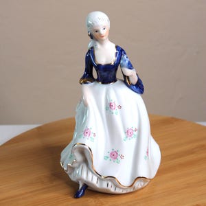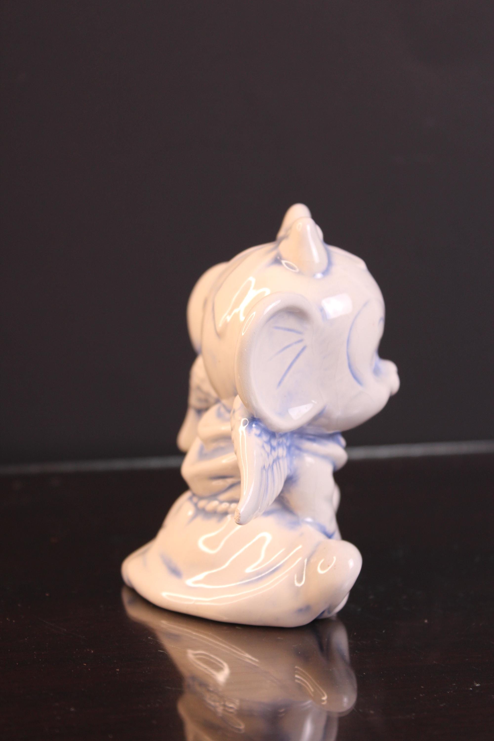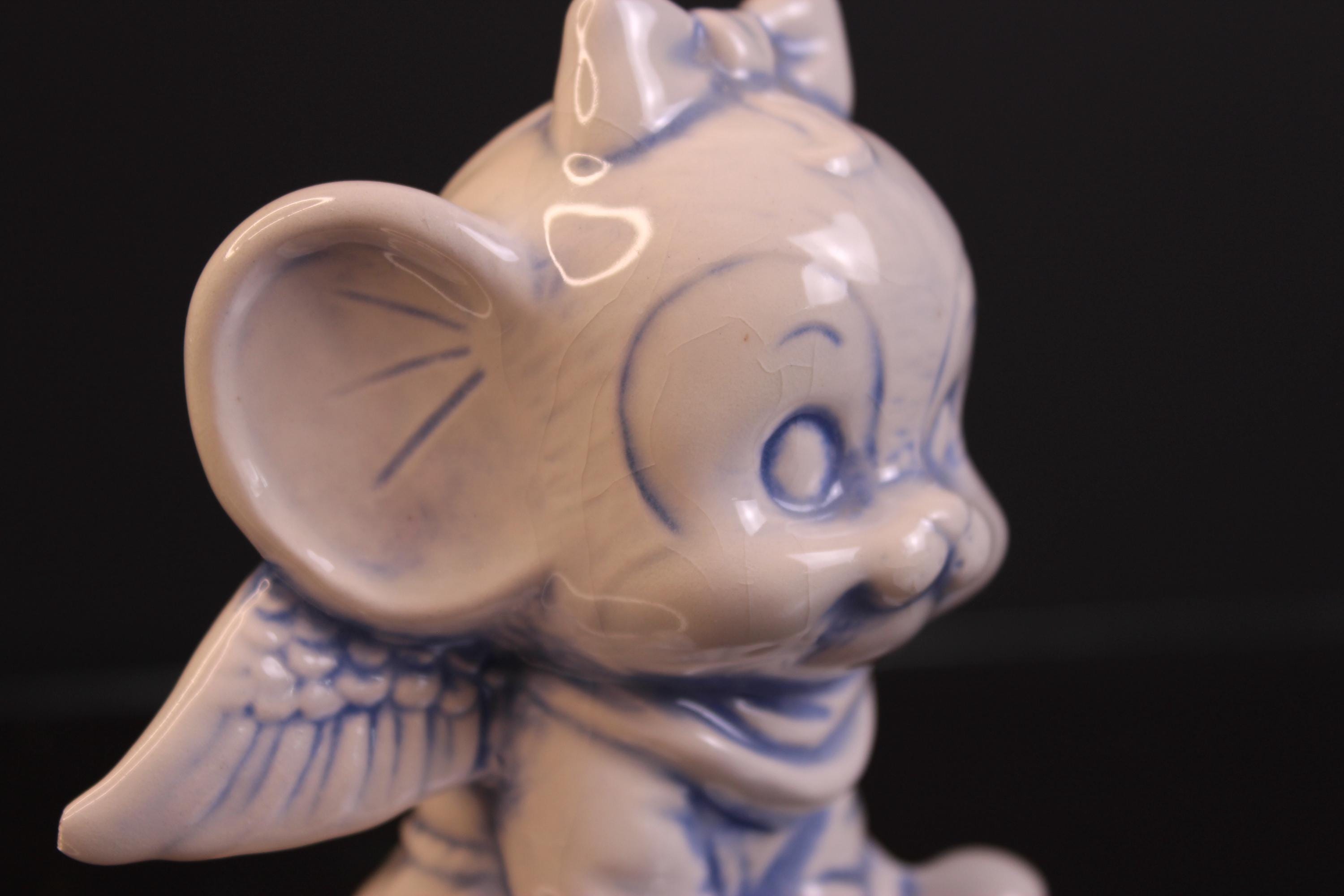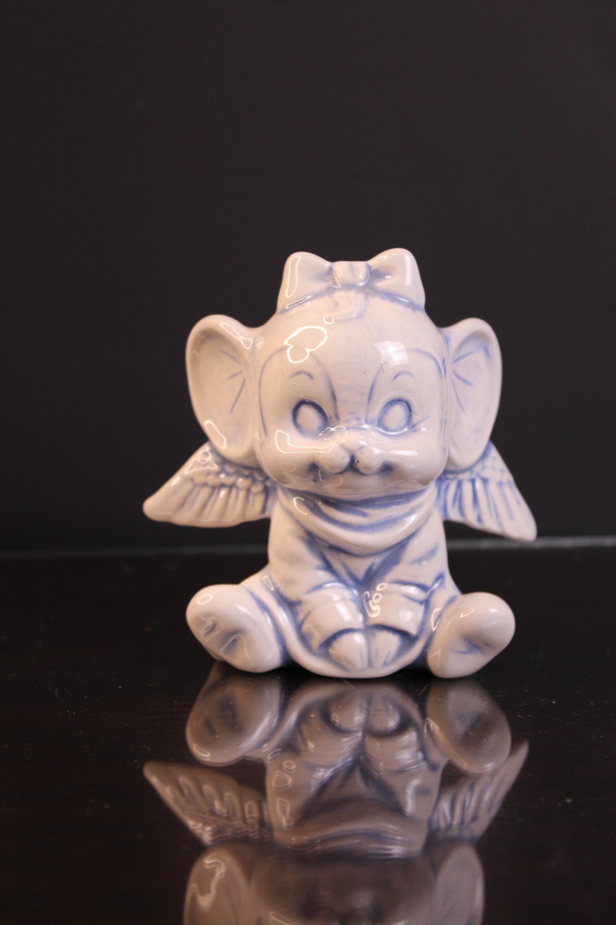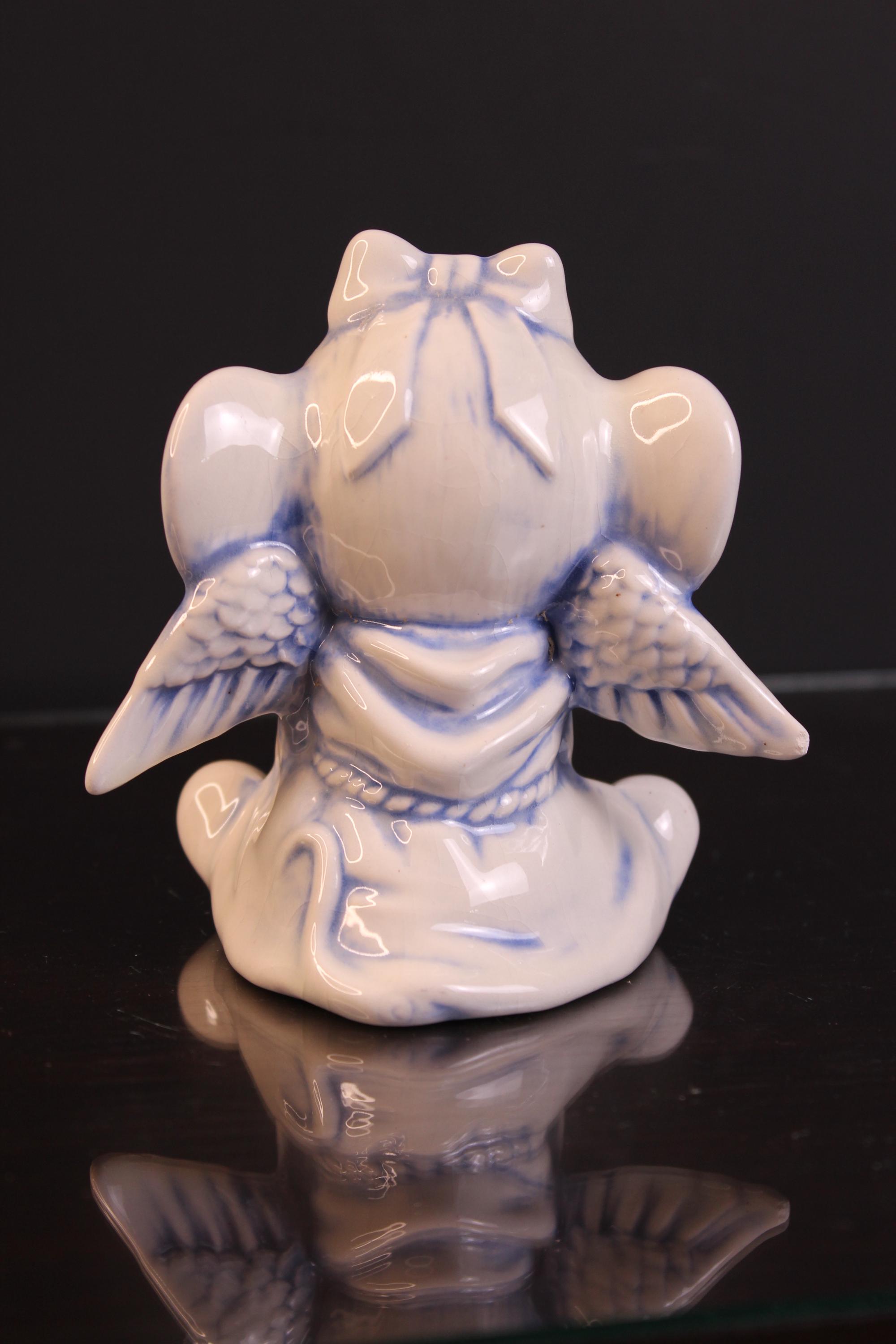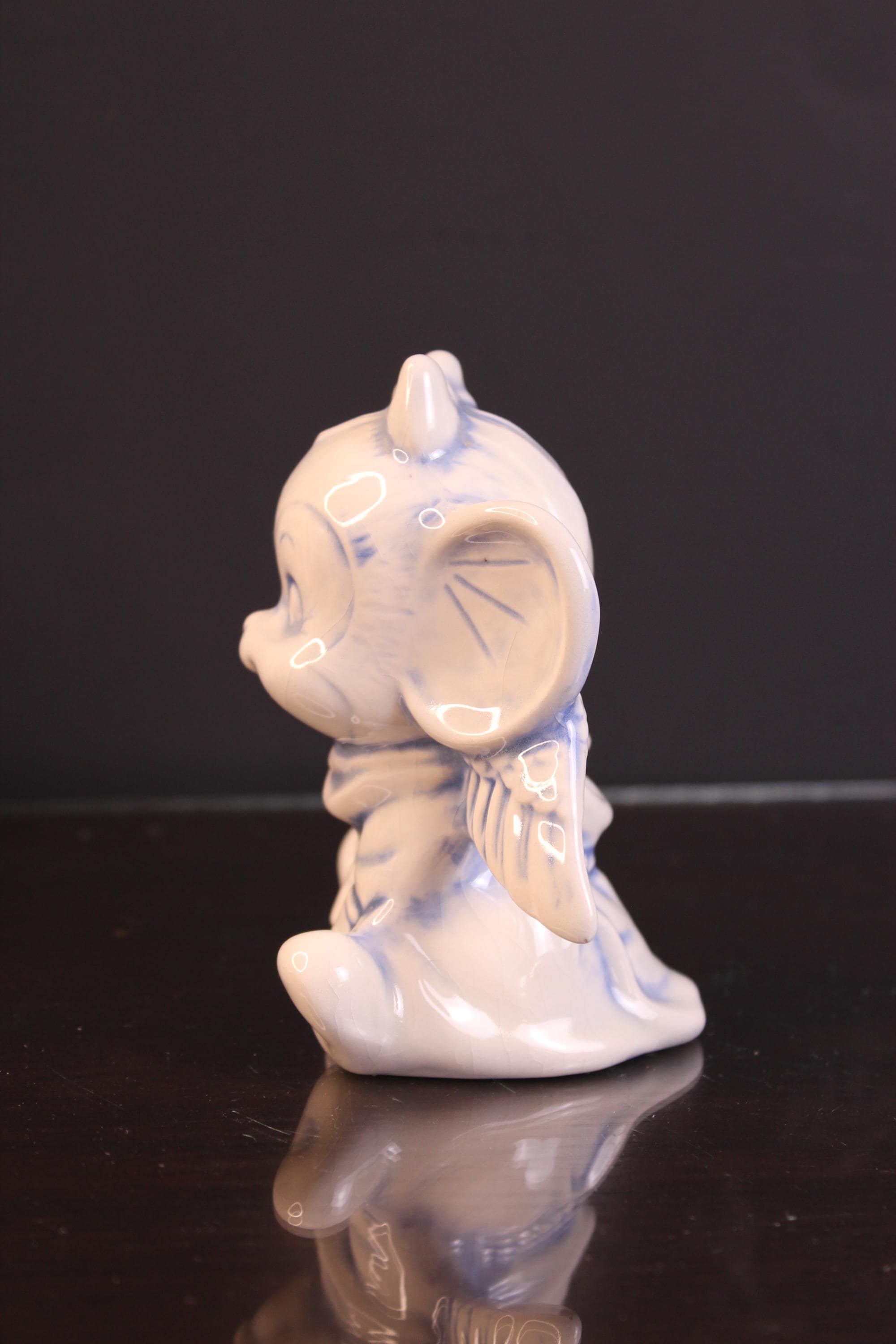 Sweet little Angel Mouse with Bow Figurine, She is 4.25 inches tall and 4.25 inches at widest point. She is in very nice vintage condition, with some crazing to the glaze but no chips, cracks to the structure or scratches. It is in white glaze with blue antiquing. Pre-loved. Shipping included.