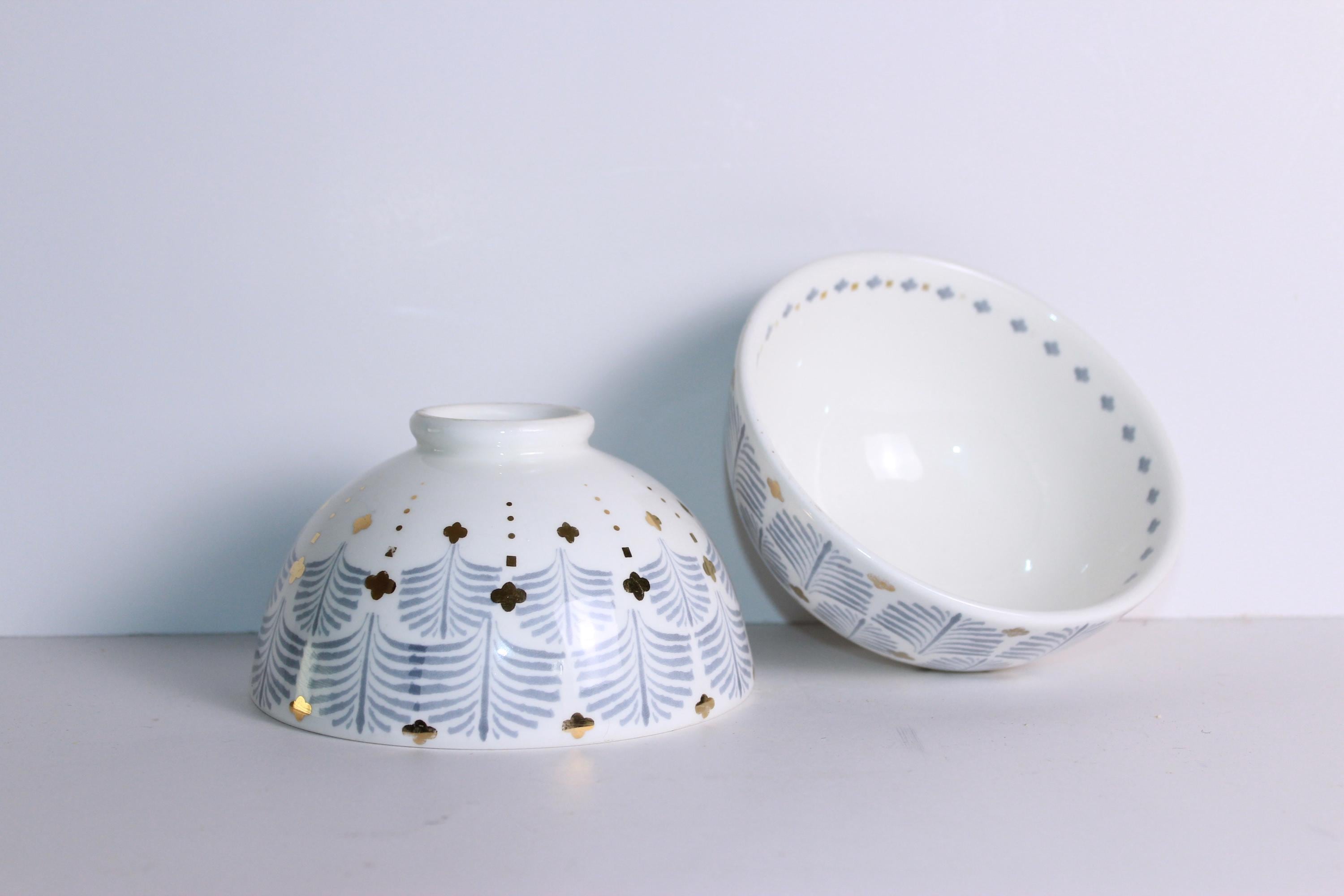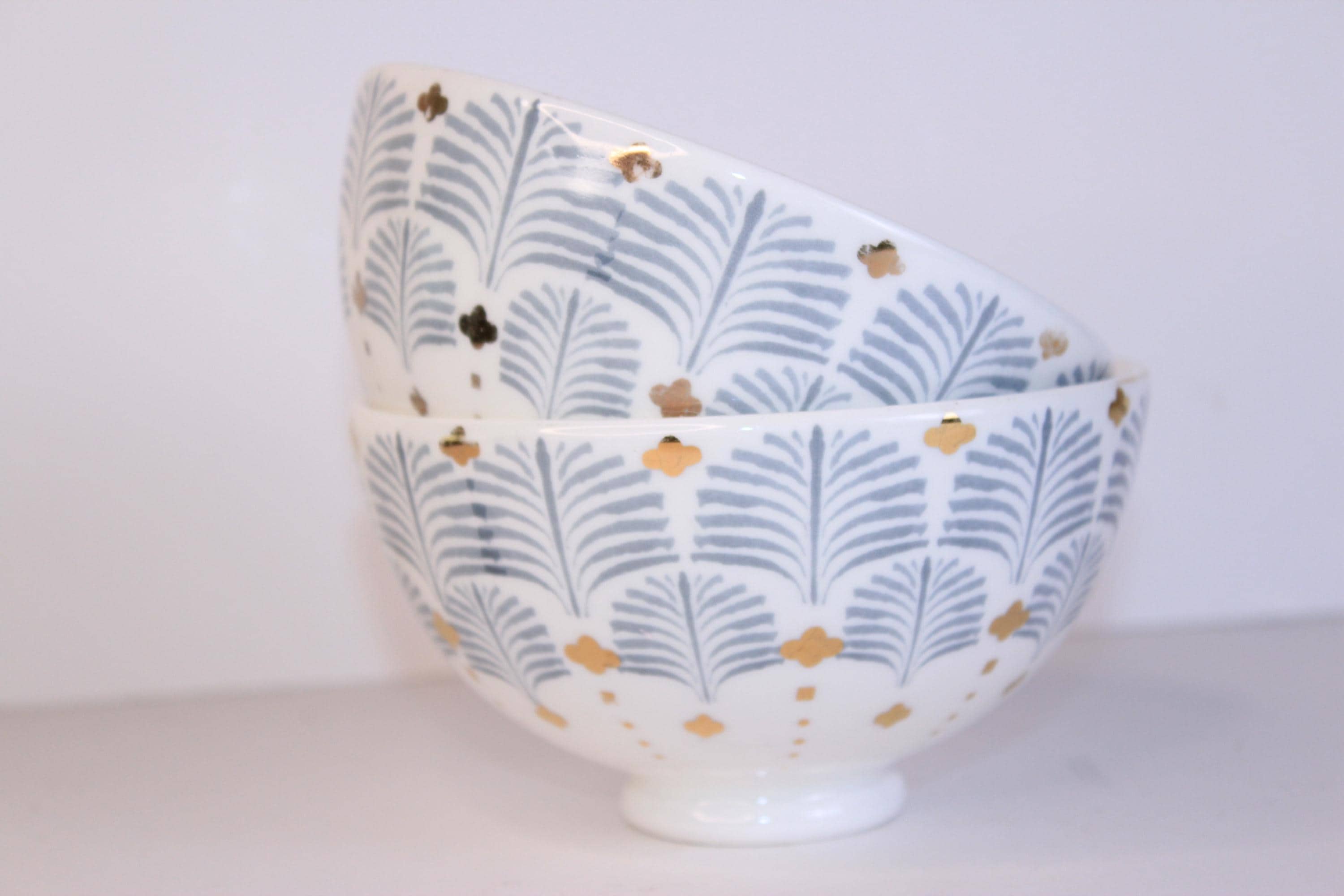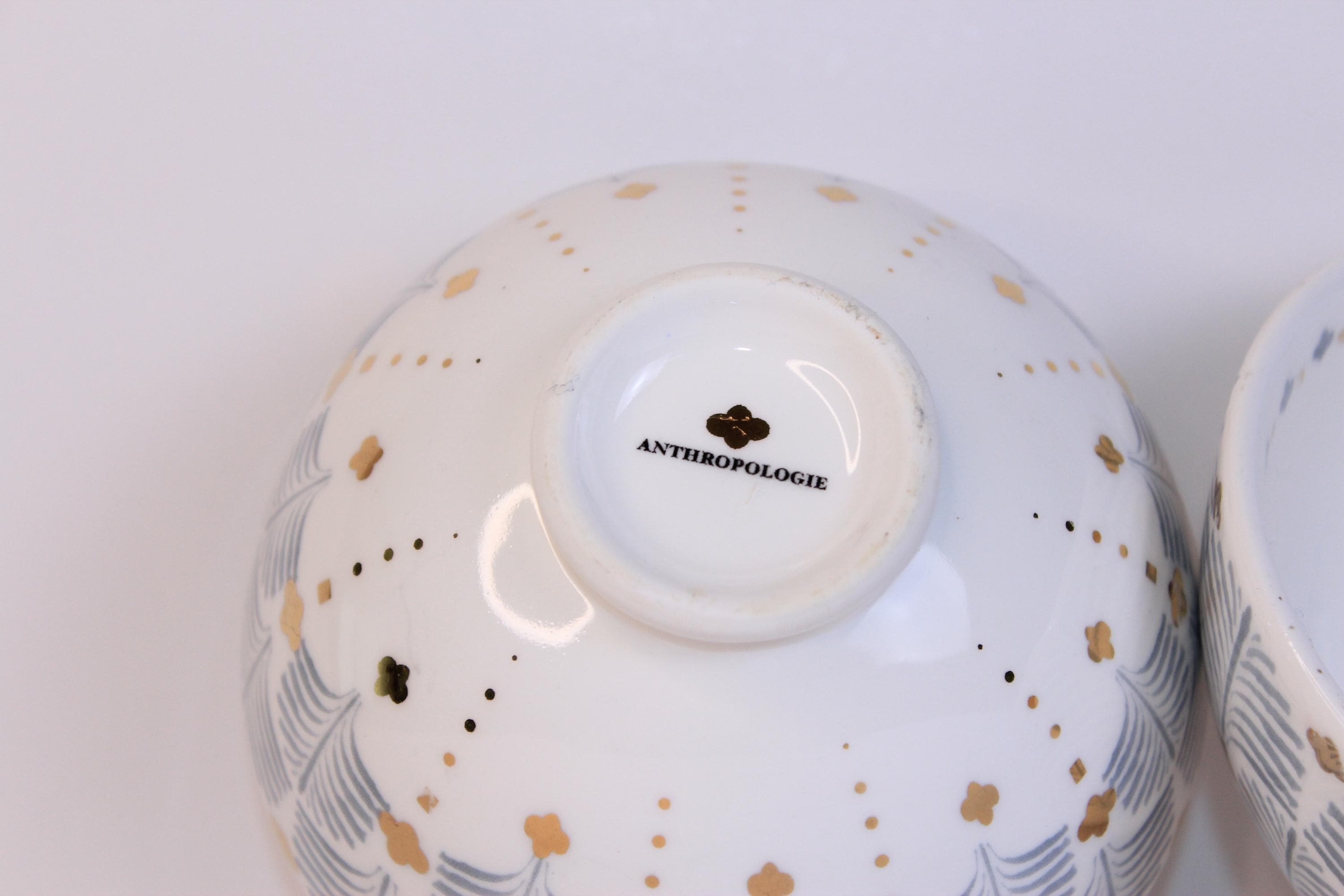 Very pretty, sophisticated looking bowls (set of two) from Anthropologie. Features a light gray fern-like pattern with small gold metallic accents. Stoneware, 5.5 inches wide and 3 inched high. Shows some wear on the metallic painted parts but does not detract from the appearance or function. Please review all photos. No chips, cracks, scrapes, or stains. Very good pre-owned condition.