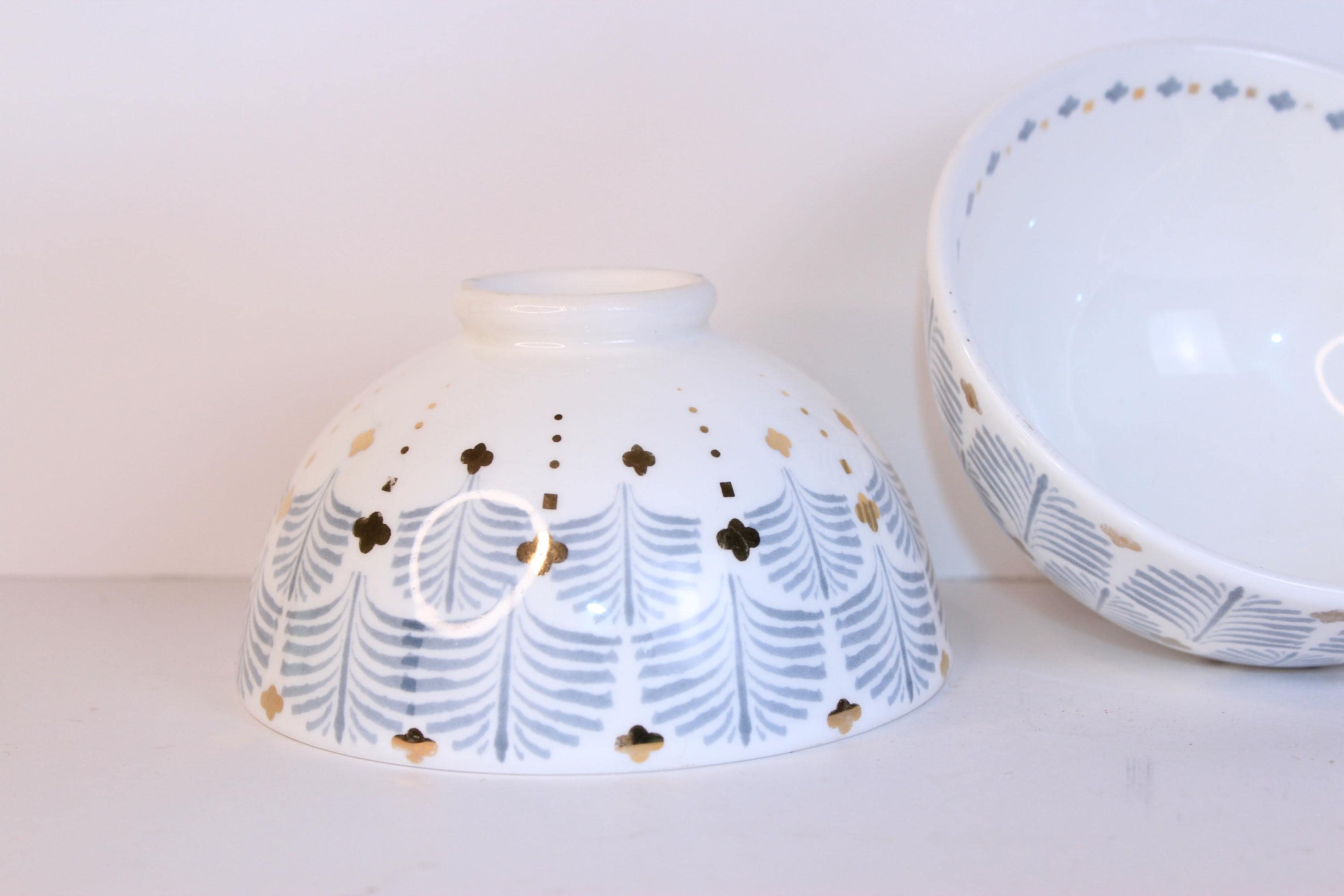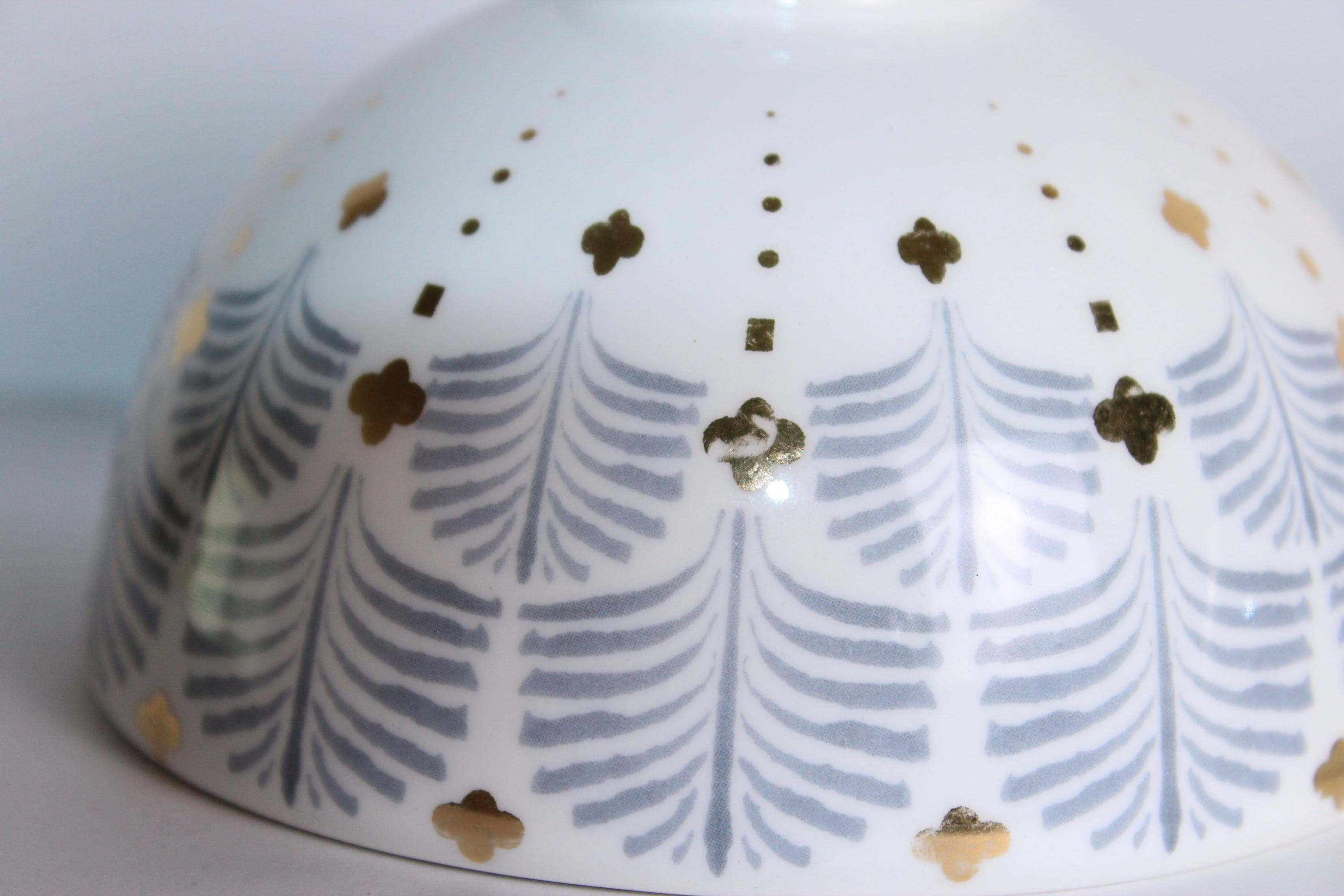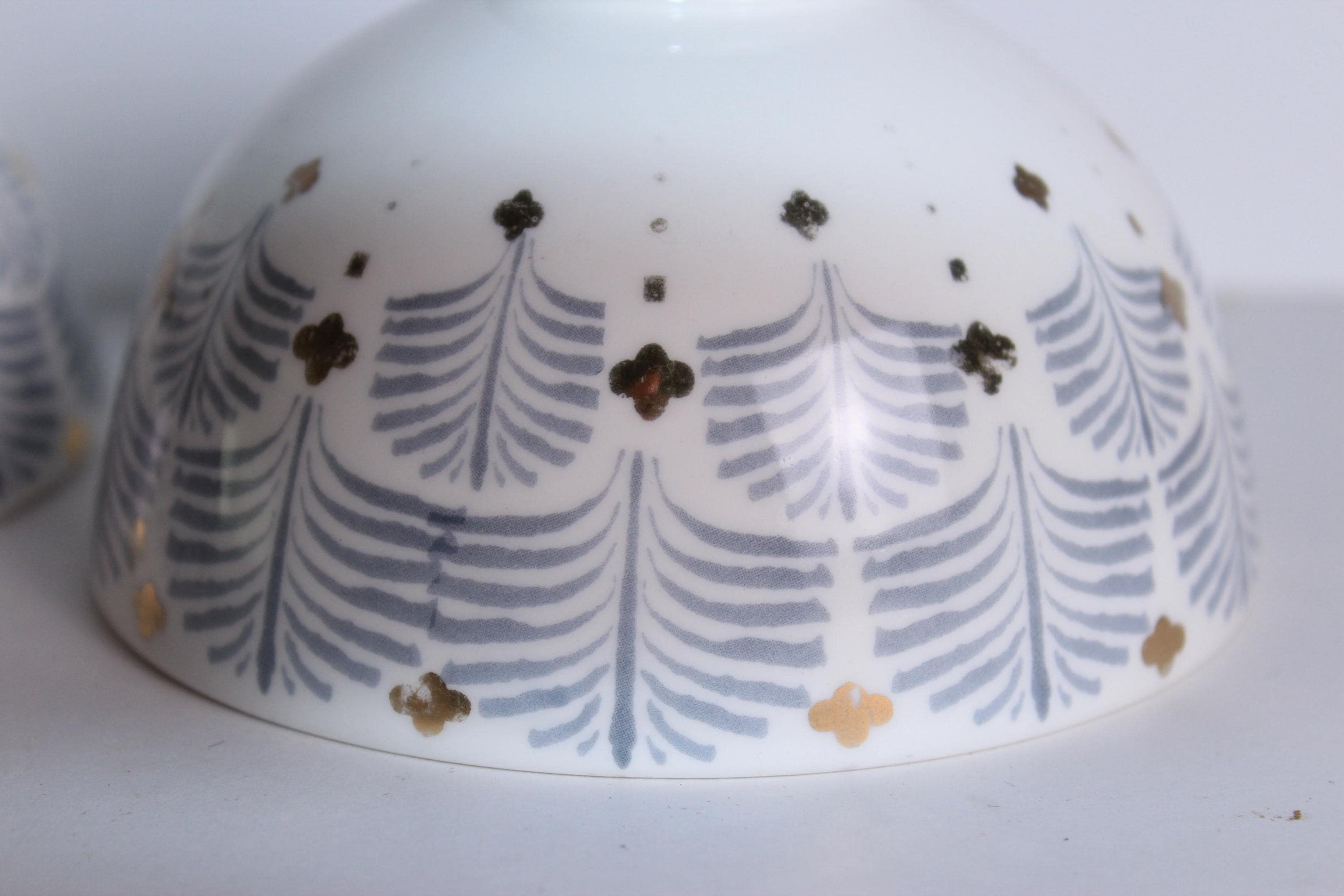 Very pretty, sophisticated looking bowls (set of two) from Anthropologie. Features a light gray fern-like pattern with small gold metallic accents. Stoneware, 5.5 inches wide and 3 inched high. Shows some wear on the metallic painted parts but does not detract from the appearance or function. Please review all photos. No chips, cracks, scrapes, or stains. Very good pre-owned condition.