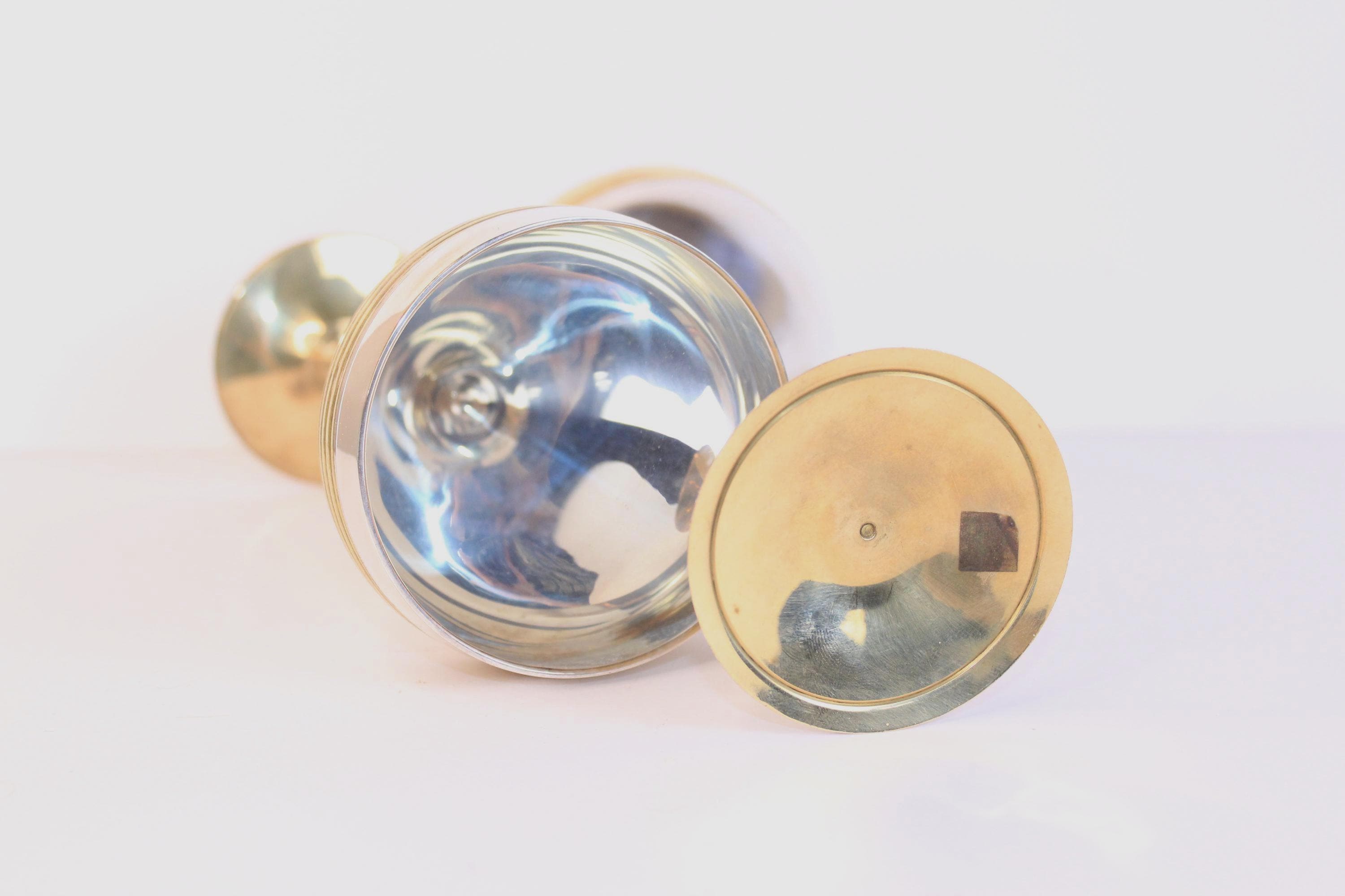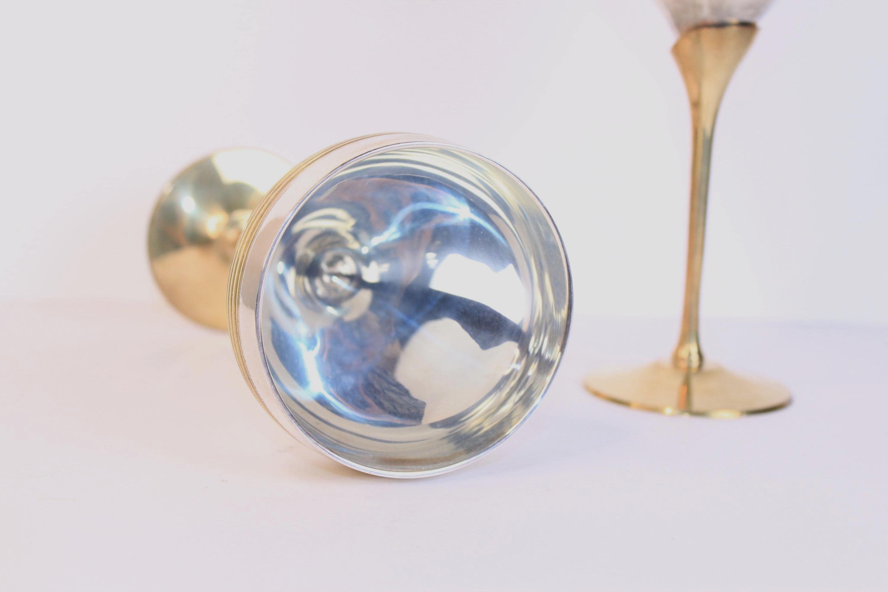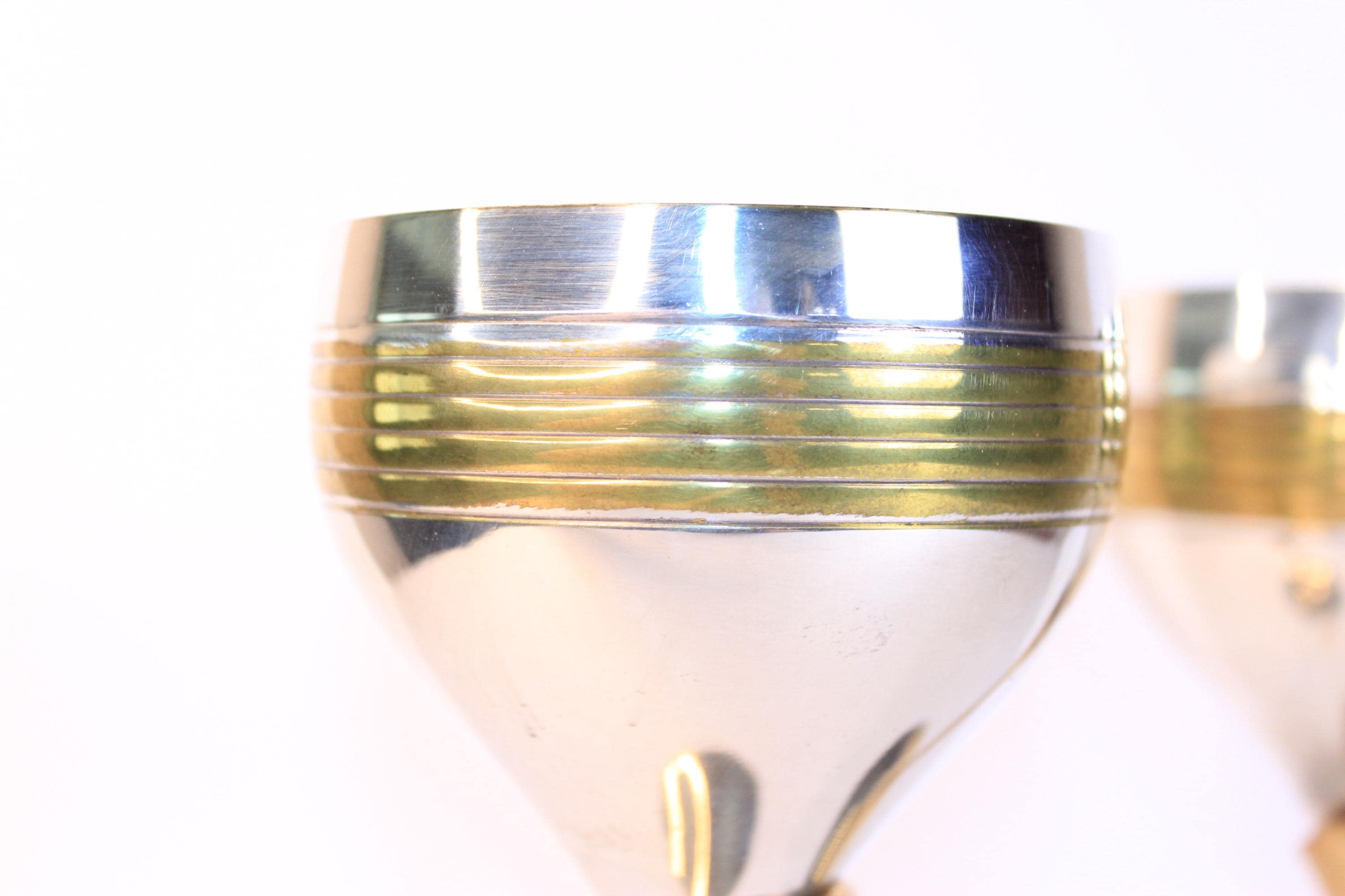 Vintage Silver Plated and Brass Wine Goblets Set of Two, from India. They feature a mid-century modern design with a silver-plated body and brass gold toned stems and banding motifs. They are 7.5 inches tall and 3.25 inches in diameter. As vintage metallic items they do show minor patina on the brass areas, and the silver plate is excellent condition without signs of wear. Wonderful for weddings and other celebrations and for display.