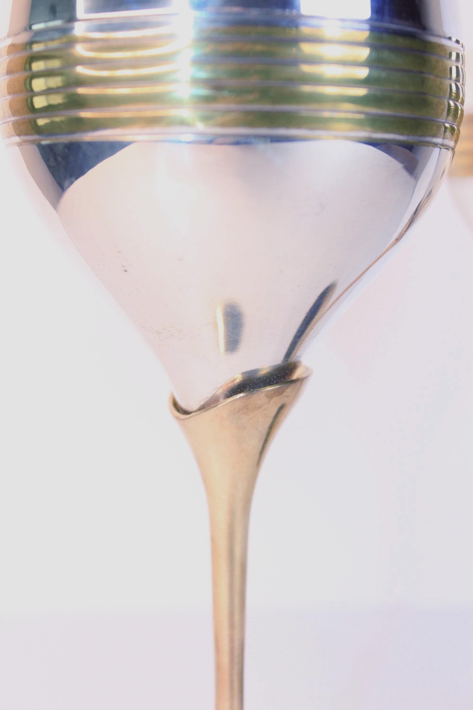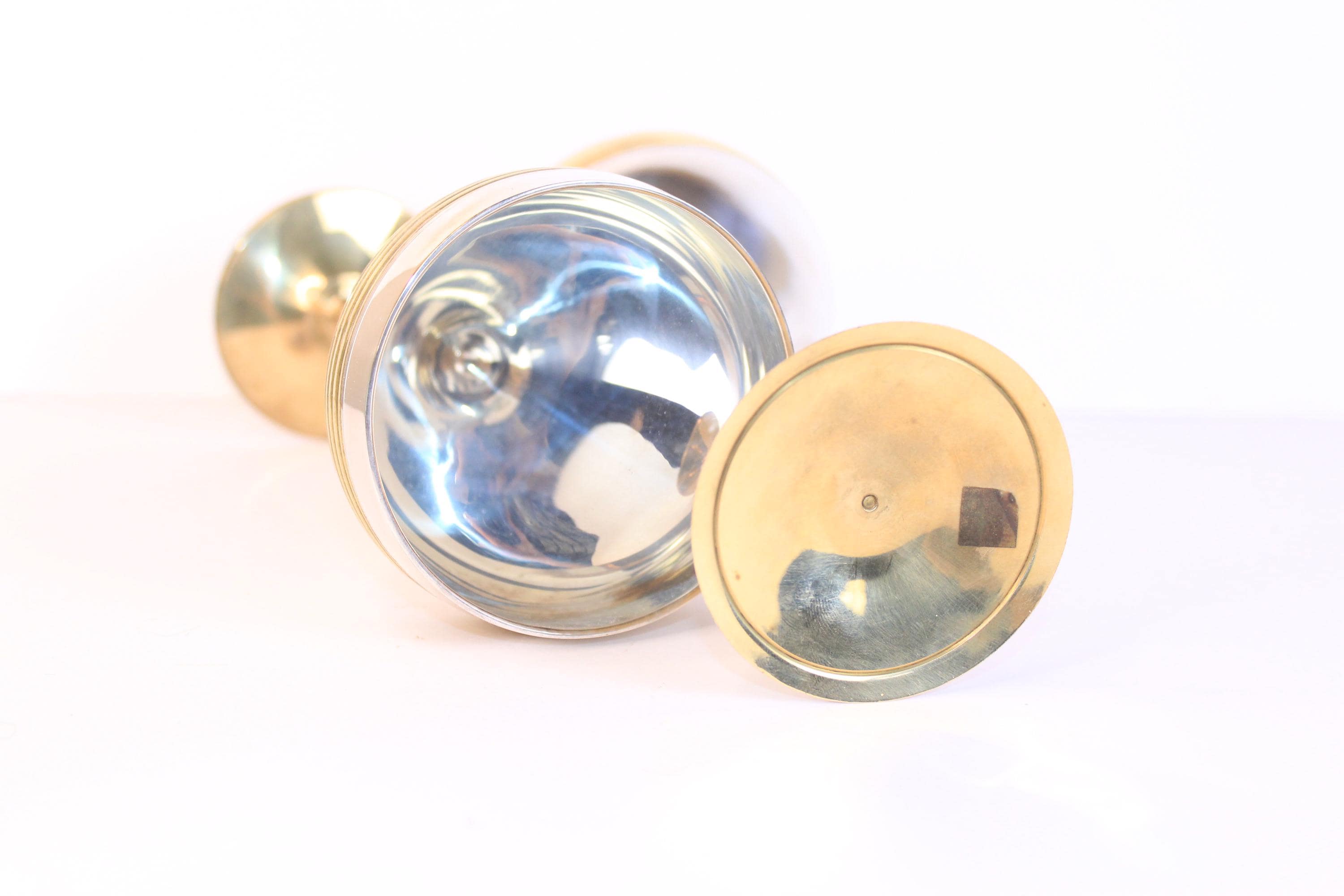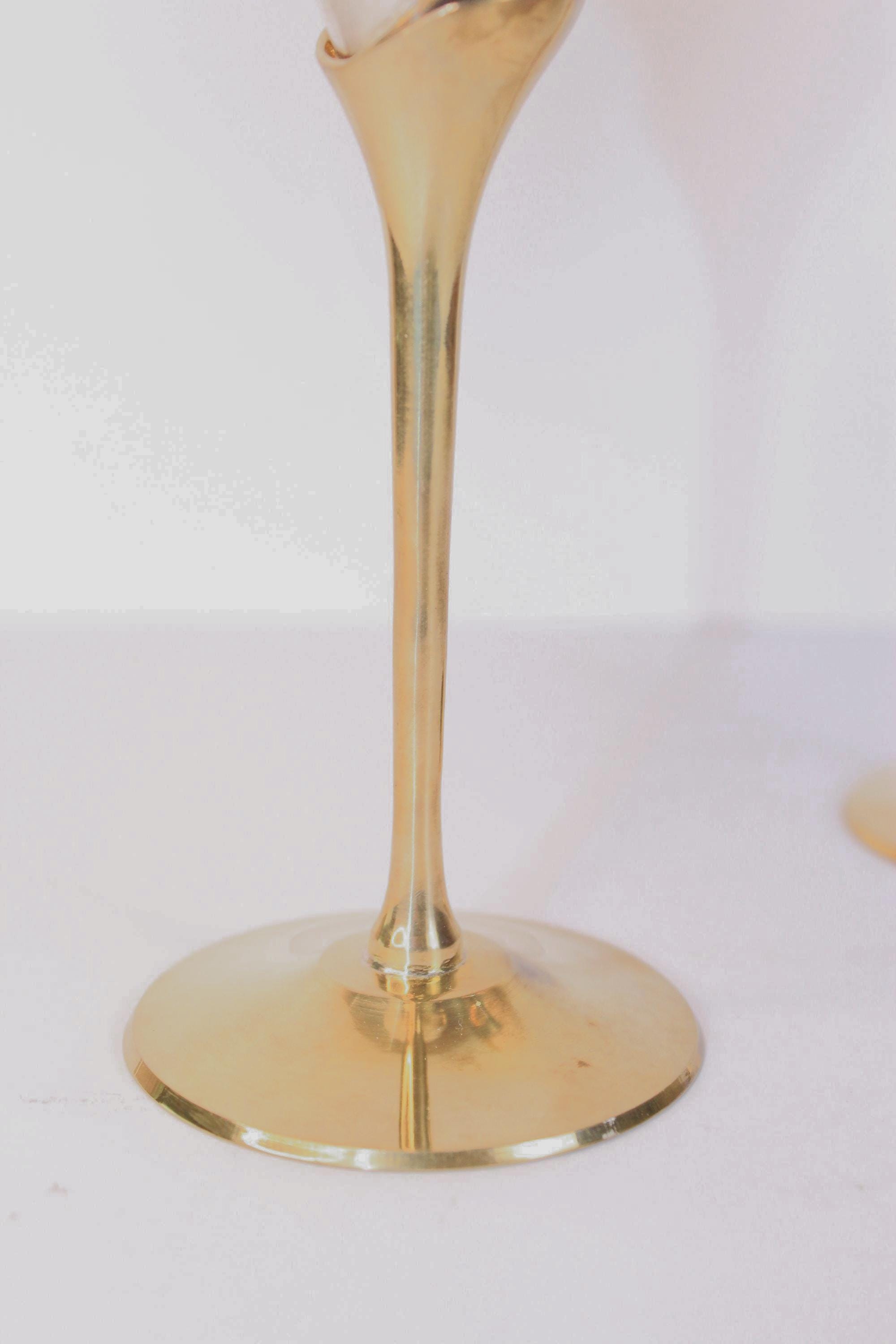 Vintage Silver Plated and Brass Wine Goblets Set of Two, from India. They feature a mid-century modern design with a silver-plated body and brass gold toned stems and banding motifs. They are 7.5 inches tall and 3.25 inches in diameter. As vintage metallic items they do show minor patina on the brass areas, and the silver plate is excellent condition without signs of wear. Wonderful for weddings and other celebrations and for display.