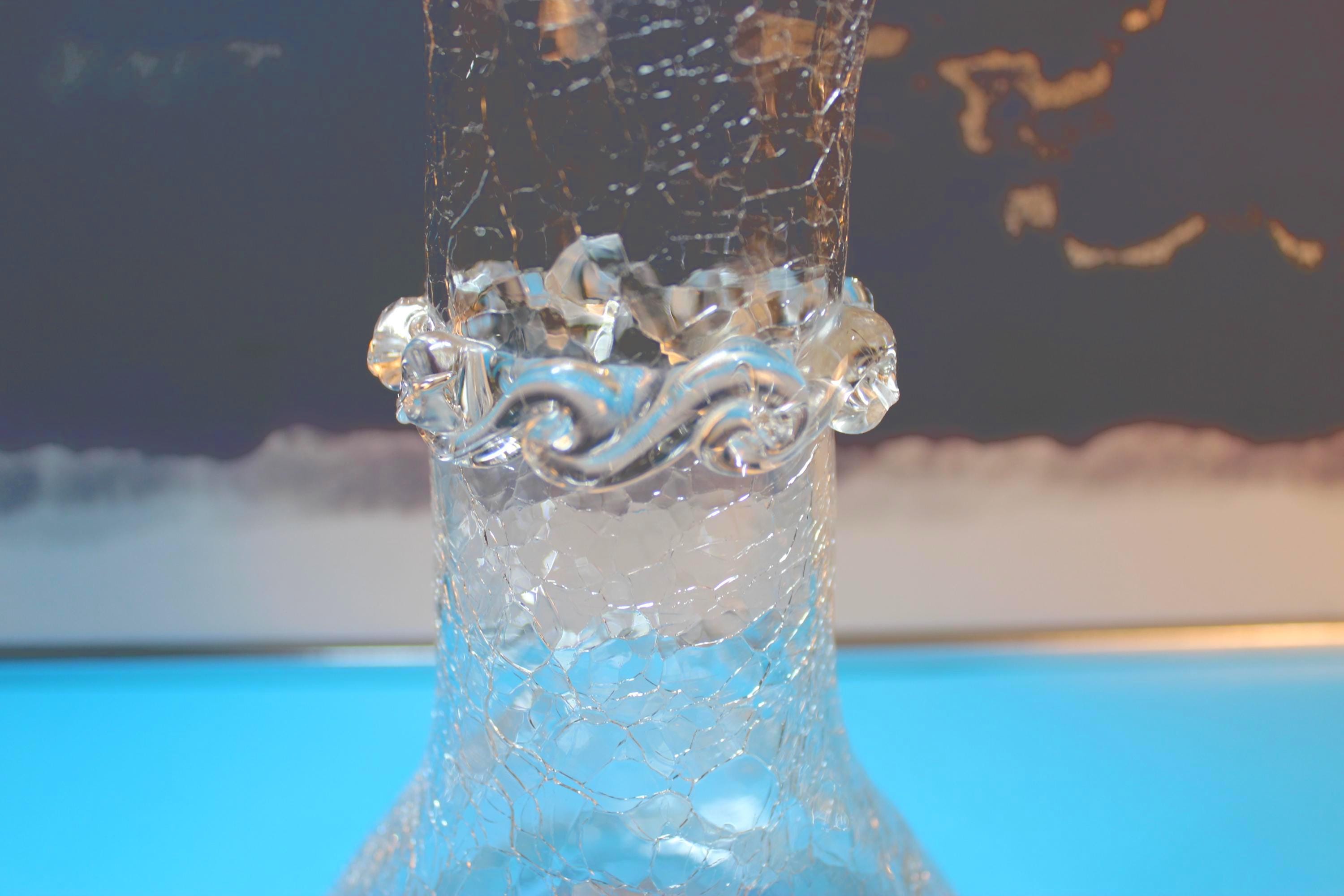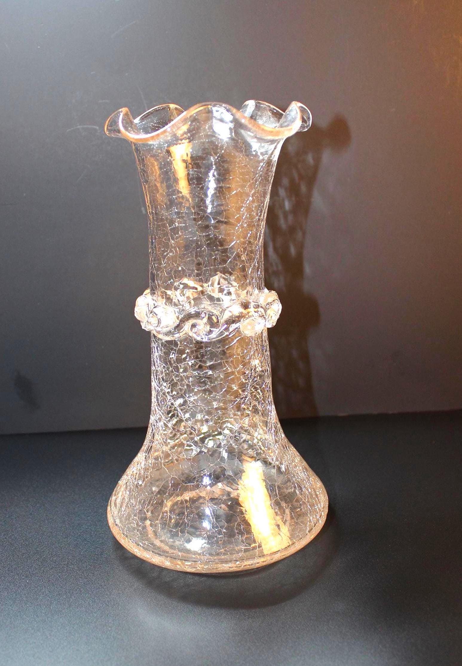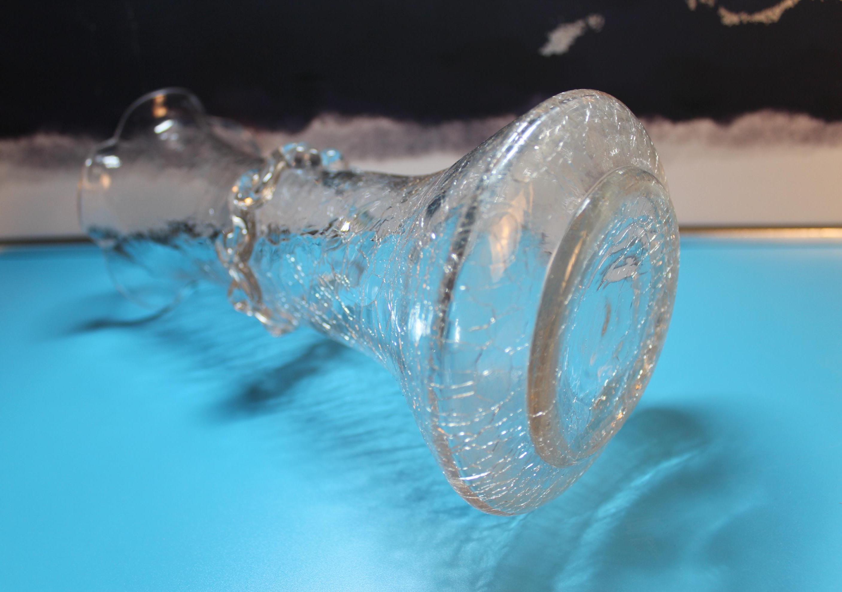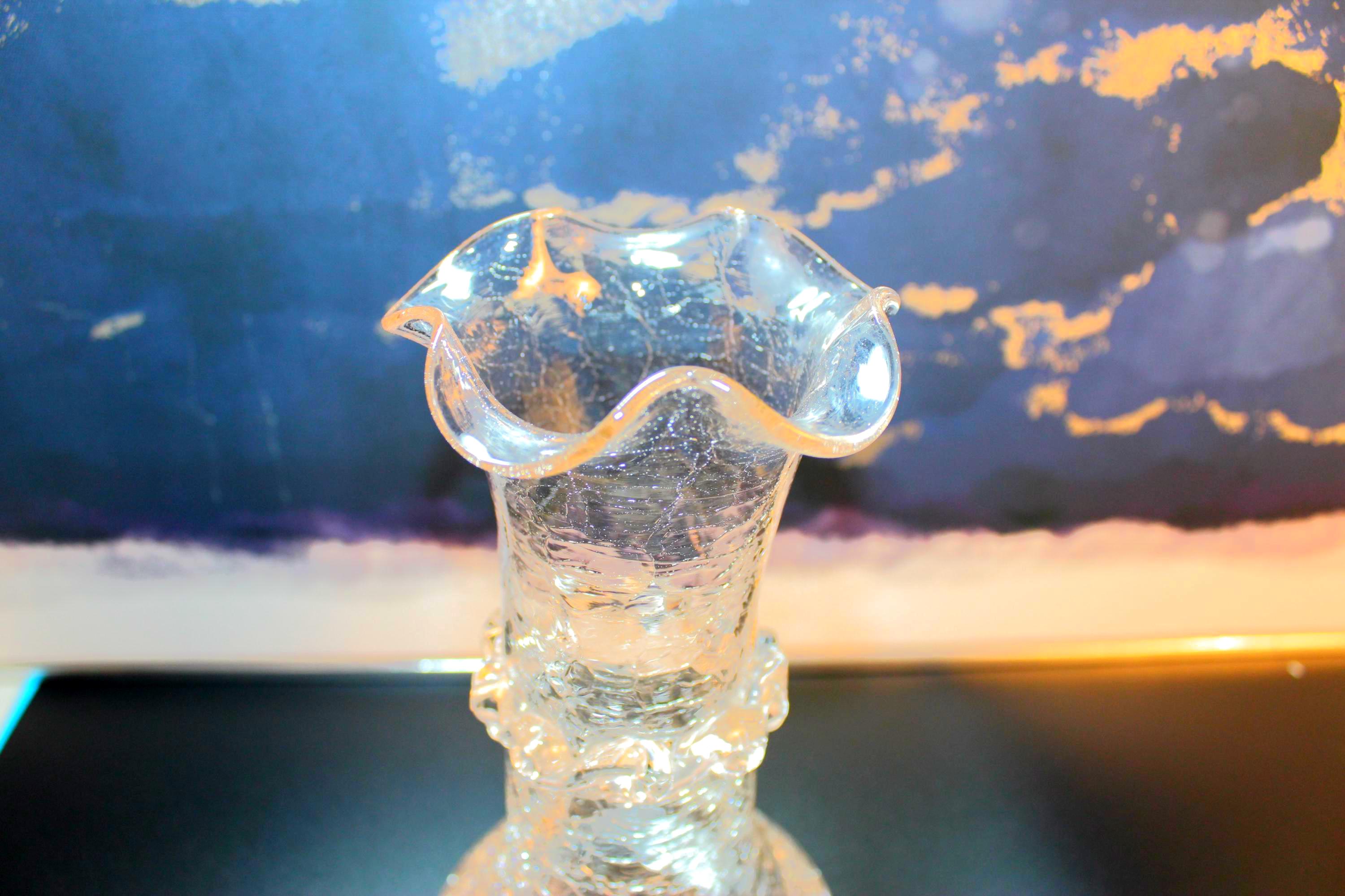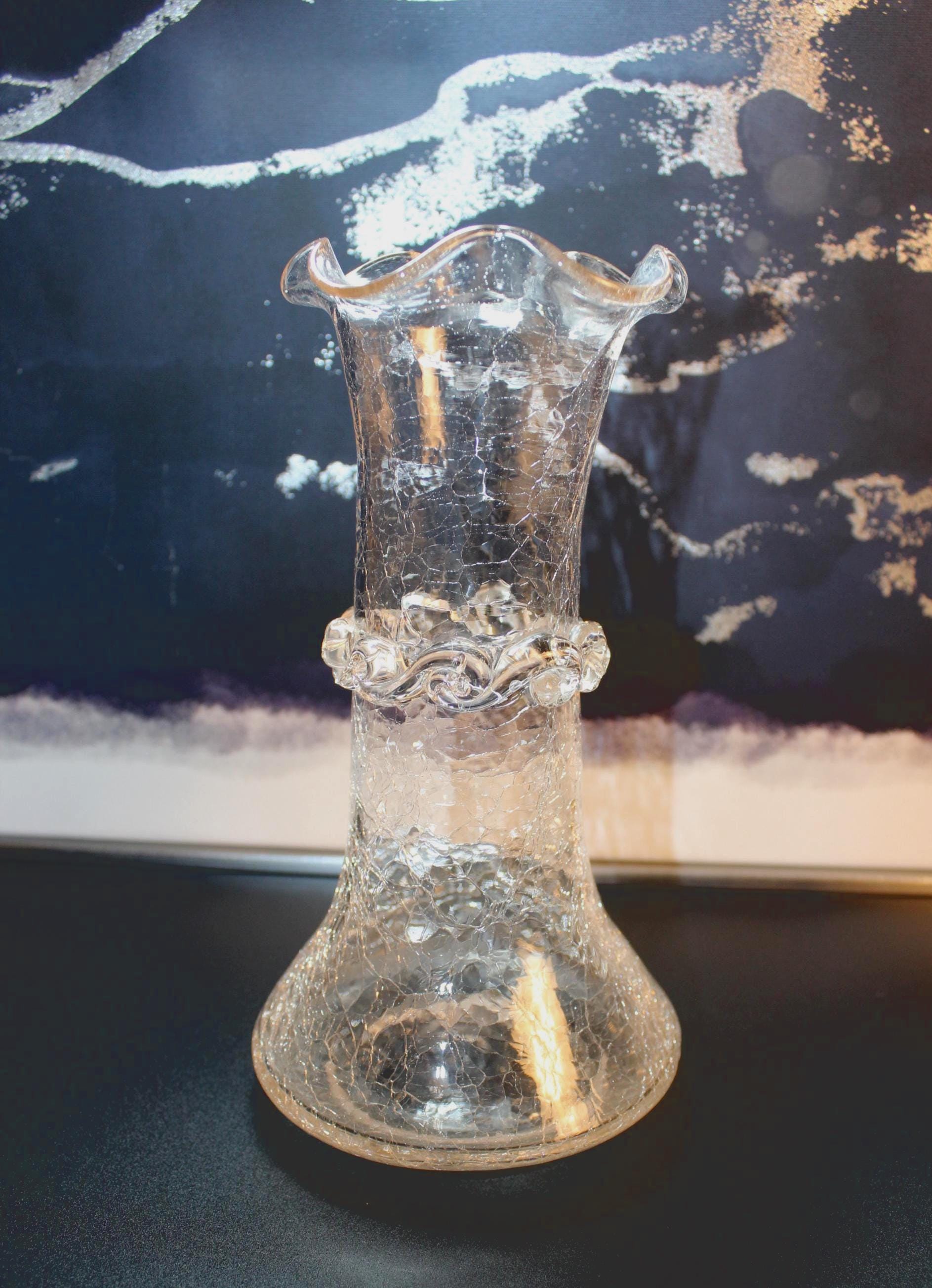 Vintage mid-century crackle glass vase, 8 inch high, handblown. It reminds the viewer of water and crackled ice. It has a ruffled rim and a wavy embellishment added to the middle of the vase shaft. It is 8 inches tall and 4.5 inches wide. It is clear glass and goes with any decor. It is fully functional or can be used as an art glass for display. It is in excellent condition, no chips or cracks.