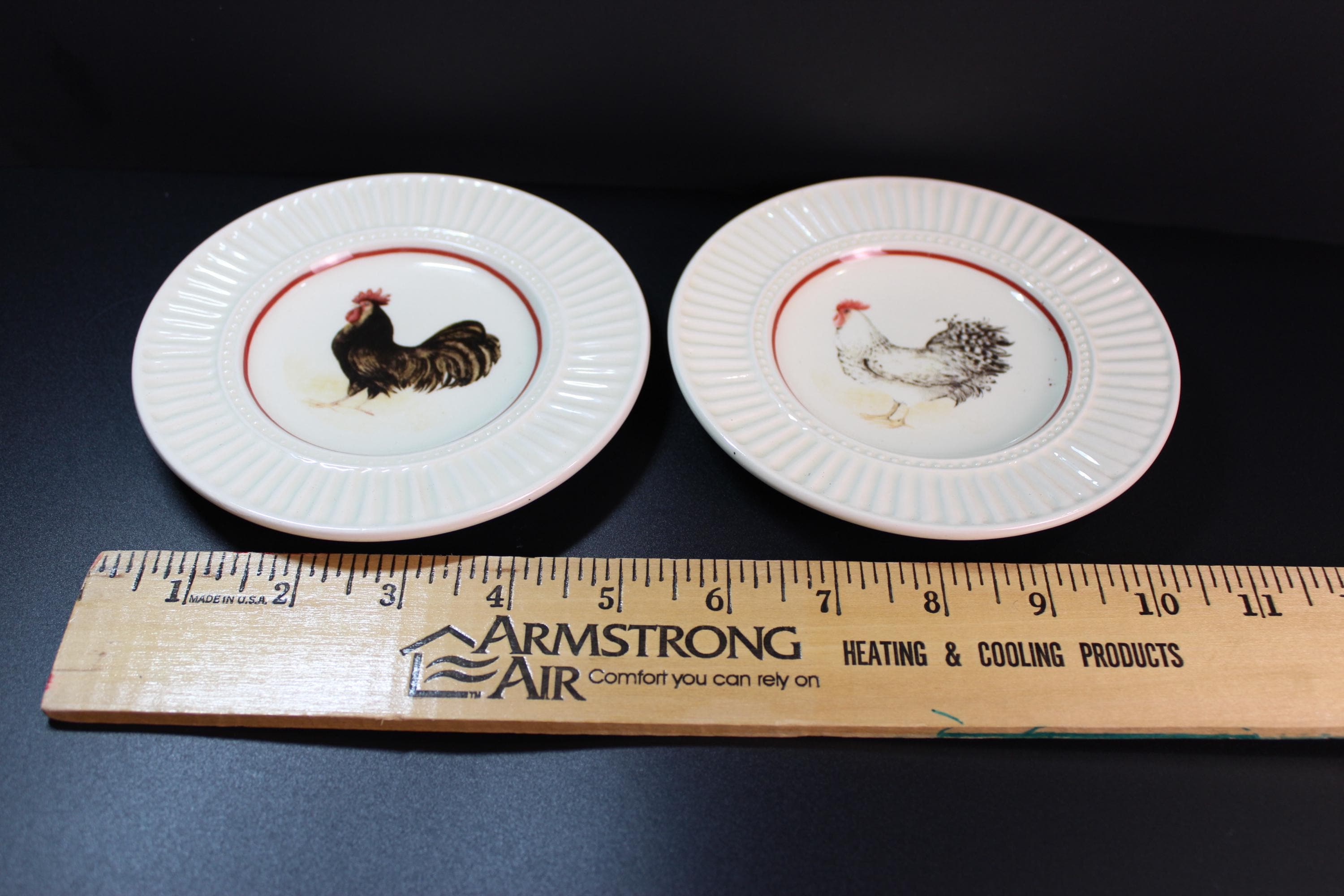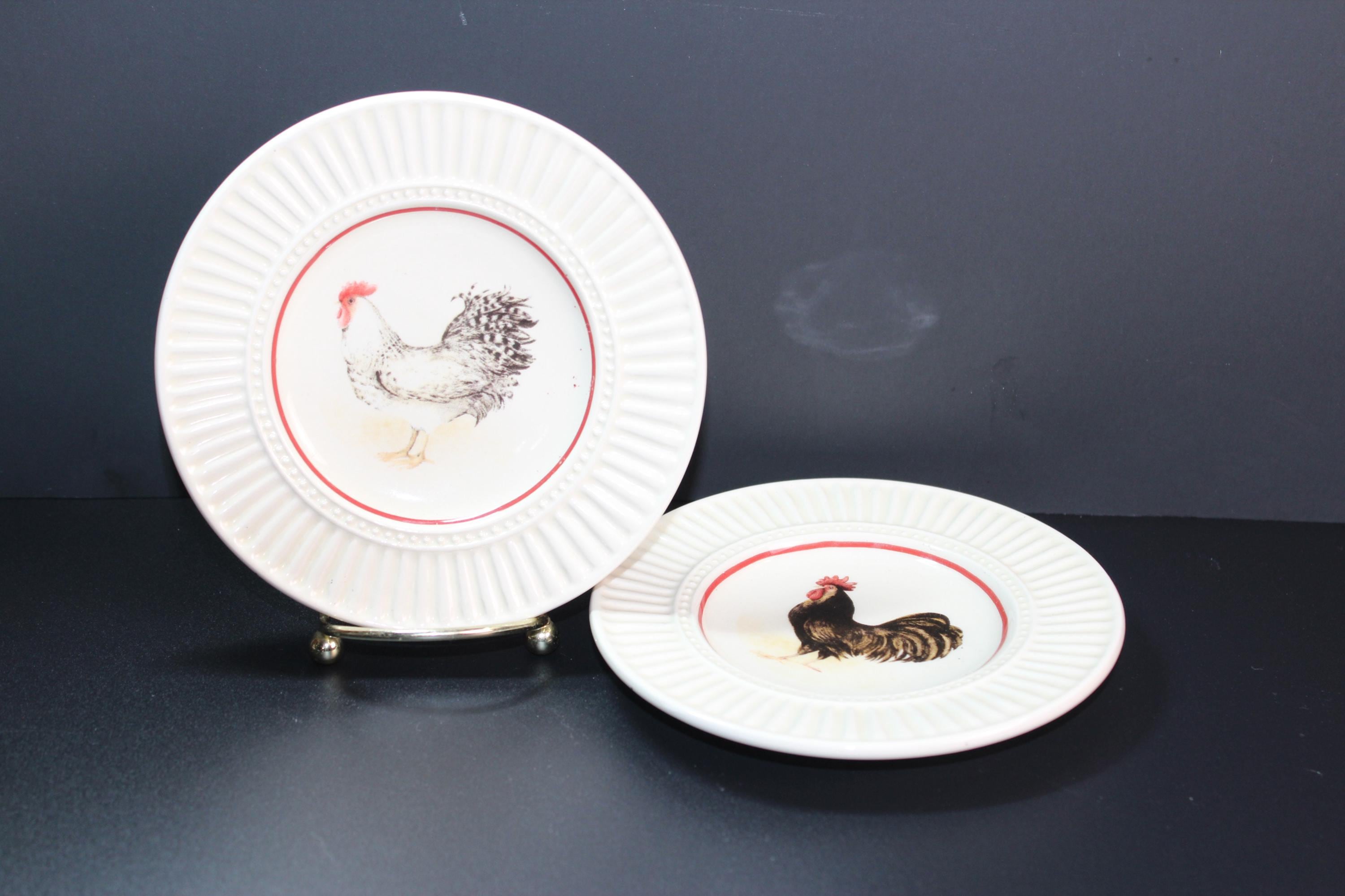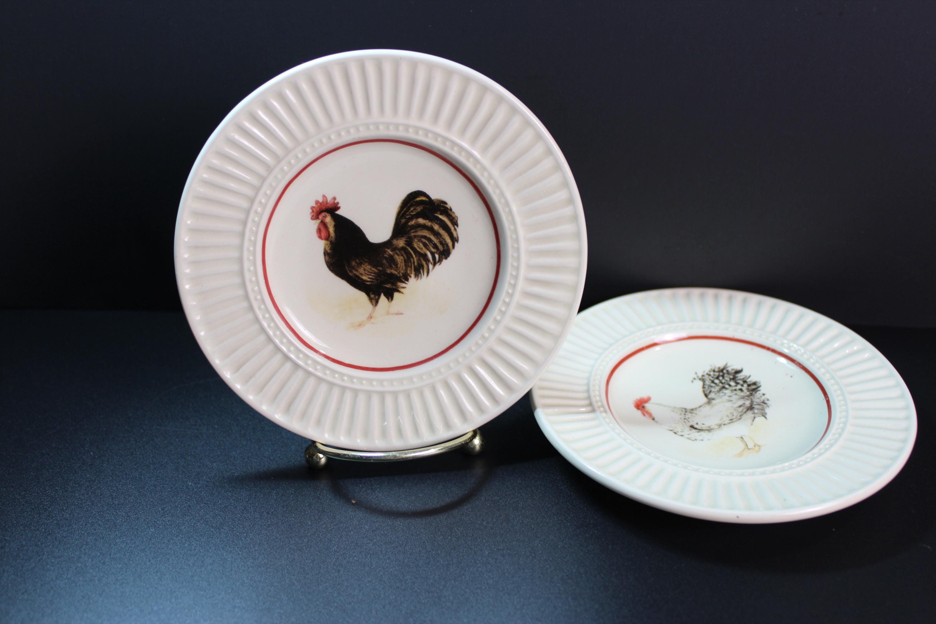Vintage Rooster Plates set of two, by the talented Susan Winget, Morning Glory Collection for Cracker Barrel. Each plate is 5 inches in diameter. They are designed with embossed beading and ridges around the edges (see photos for details). The graphics are in pristine condition and there are no chips cracks or scratches. They are ready to hang or display in a variety of decor.