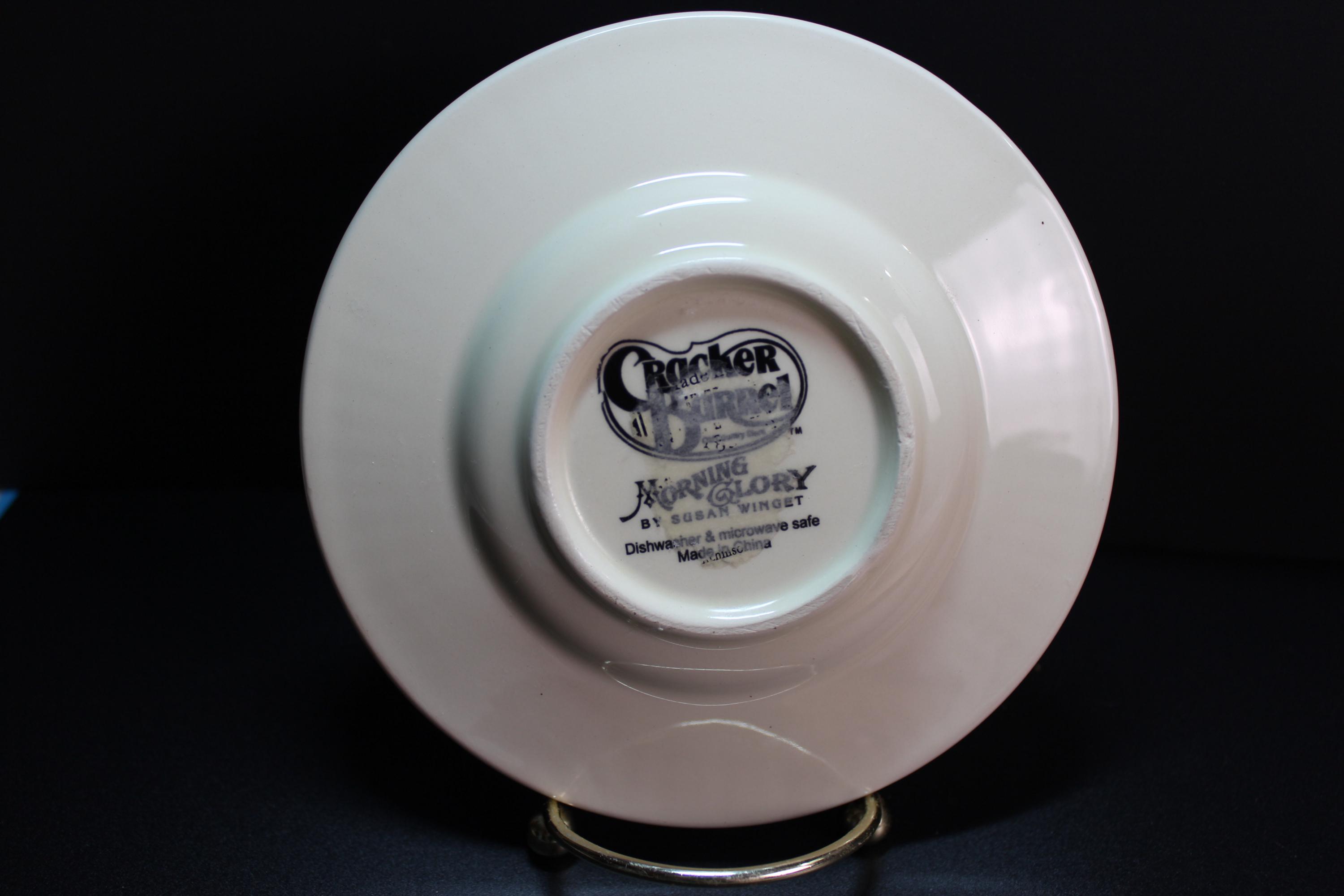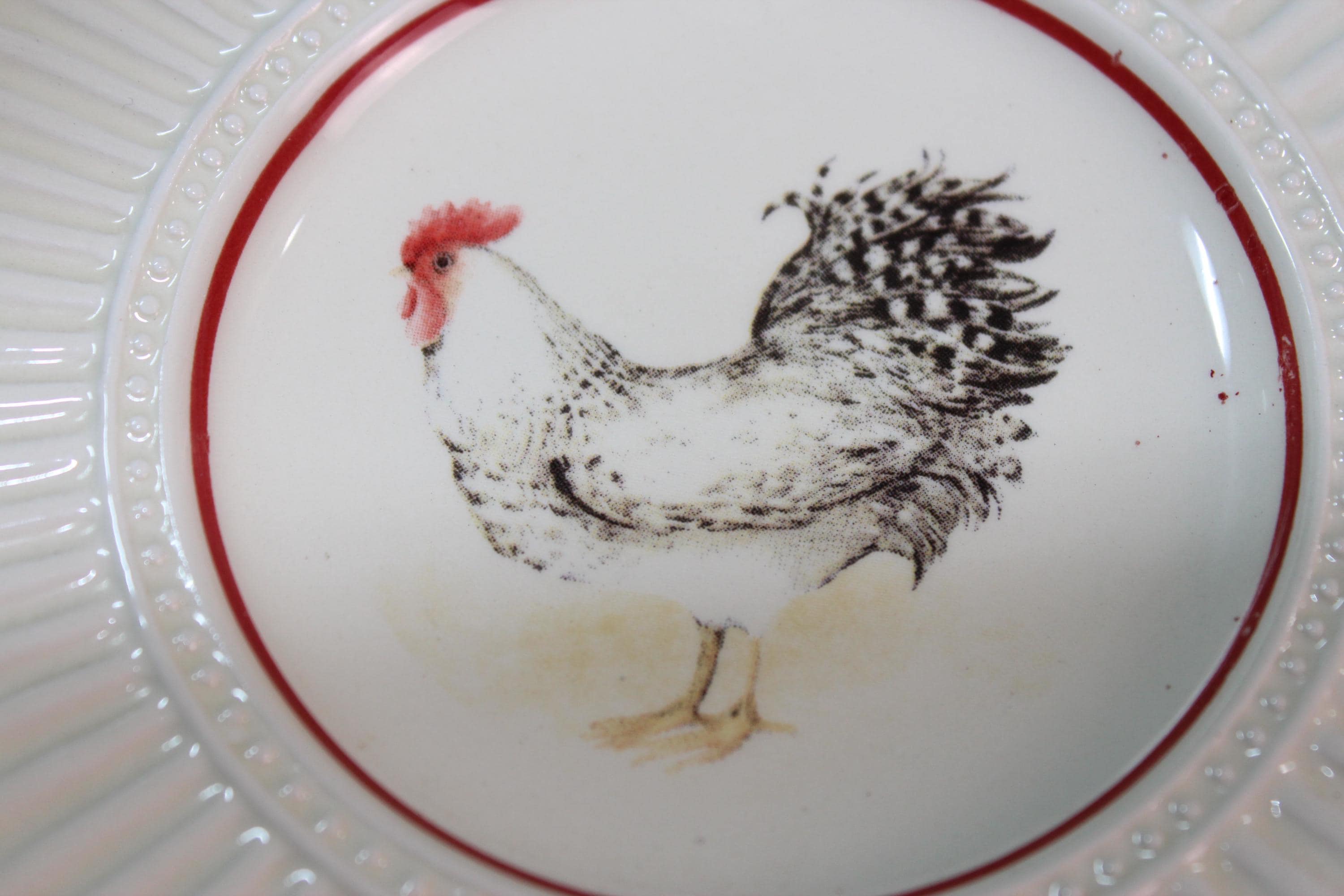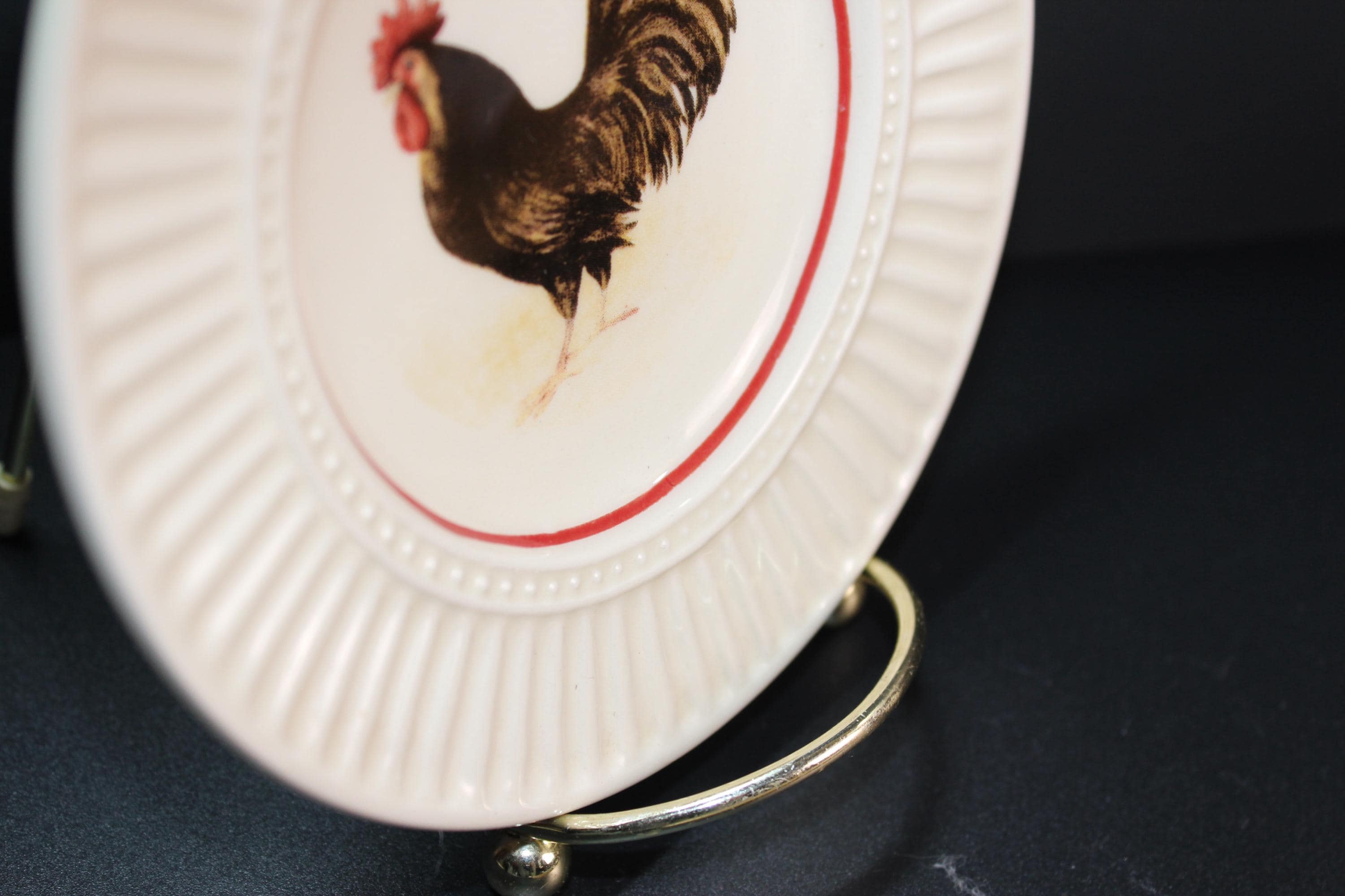 Vintage Rooster Plates set of two, by the talented Susan Winget, Morning Glory Collection for Cracker Barrel. Each plate is 5 inches in diameter. They are designed with embossed beading and ridges around the edges (see photos for details). The graphics are in pristine condition and there are no chips cracks or scratches. They are ready to hang or display in a variety of decor.
