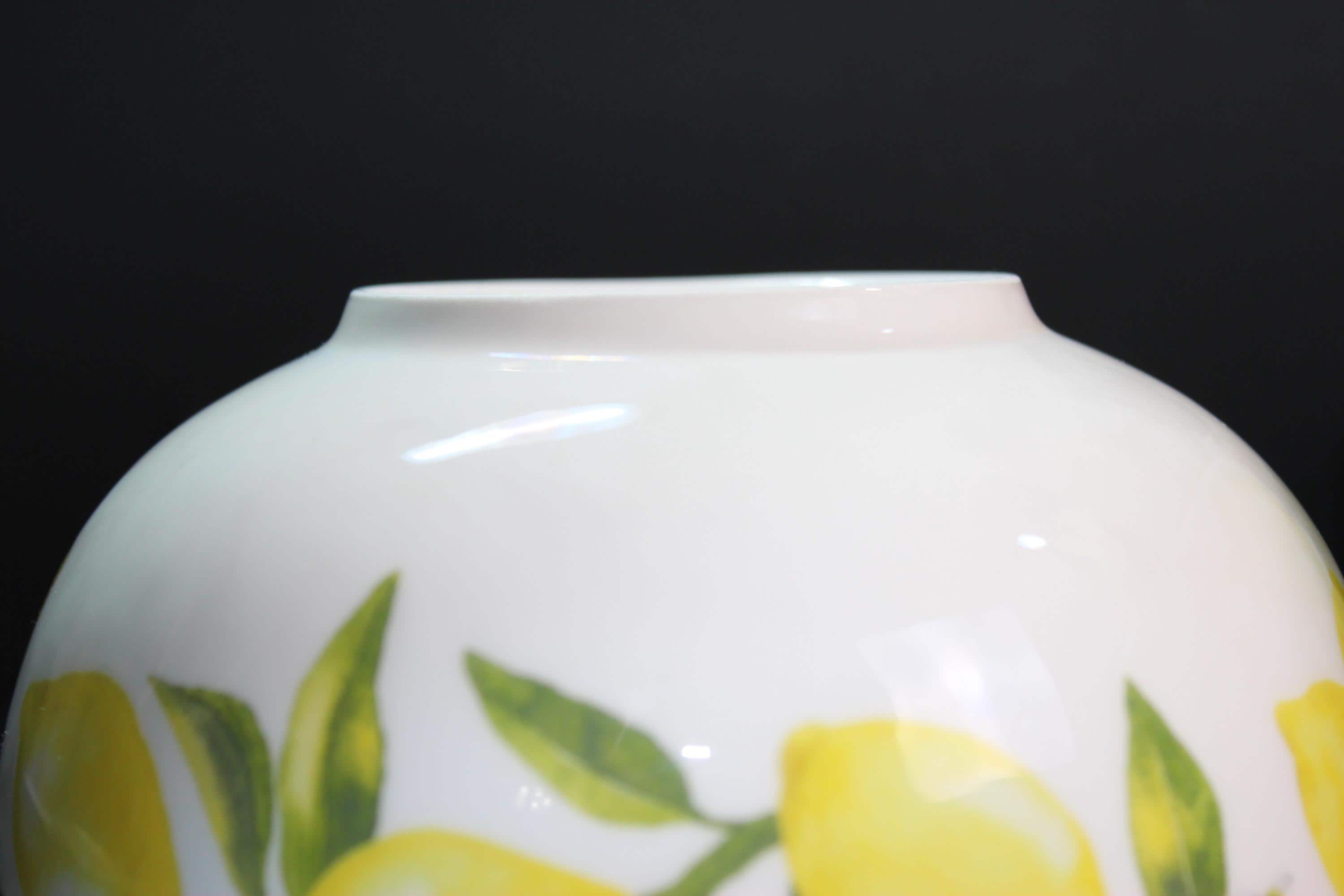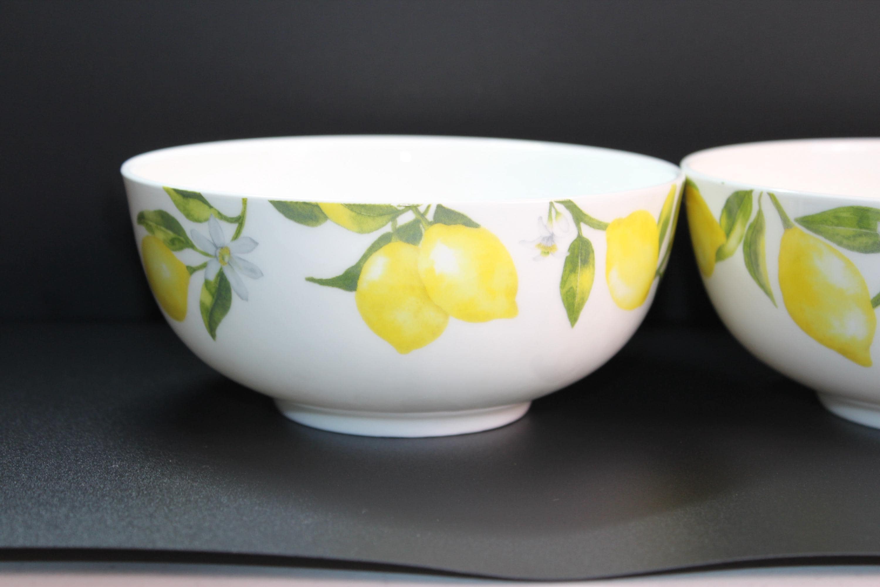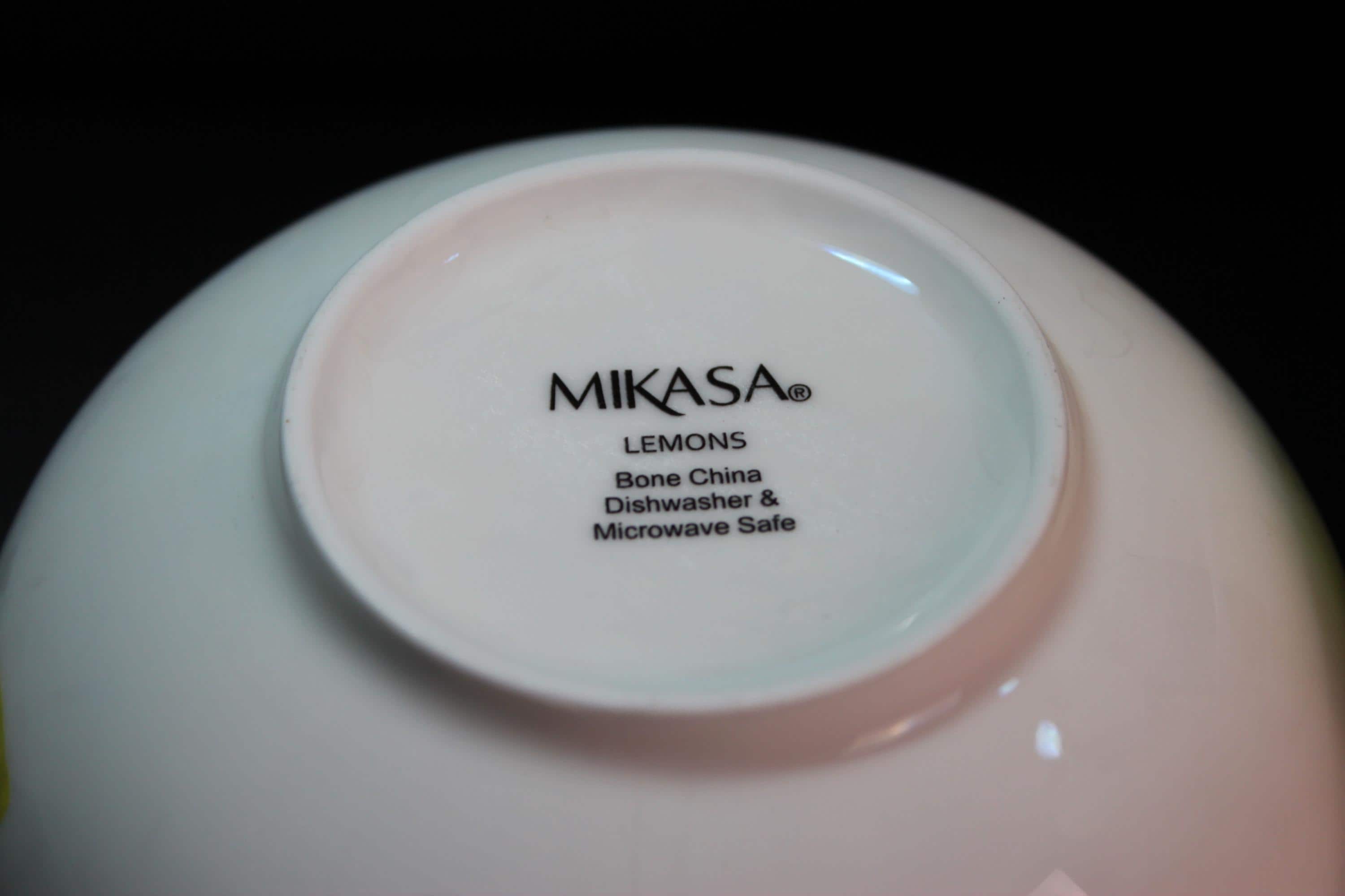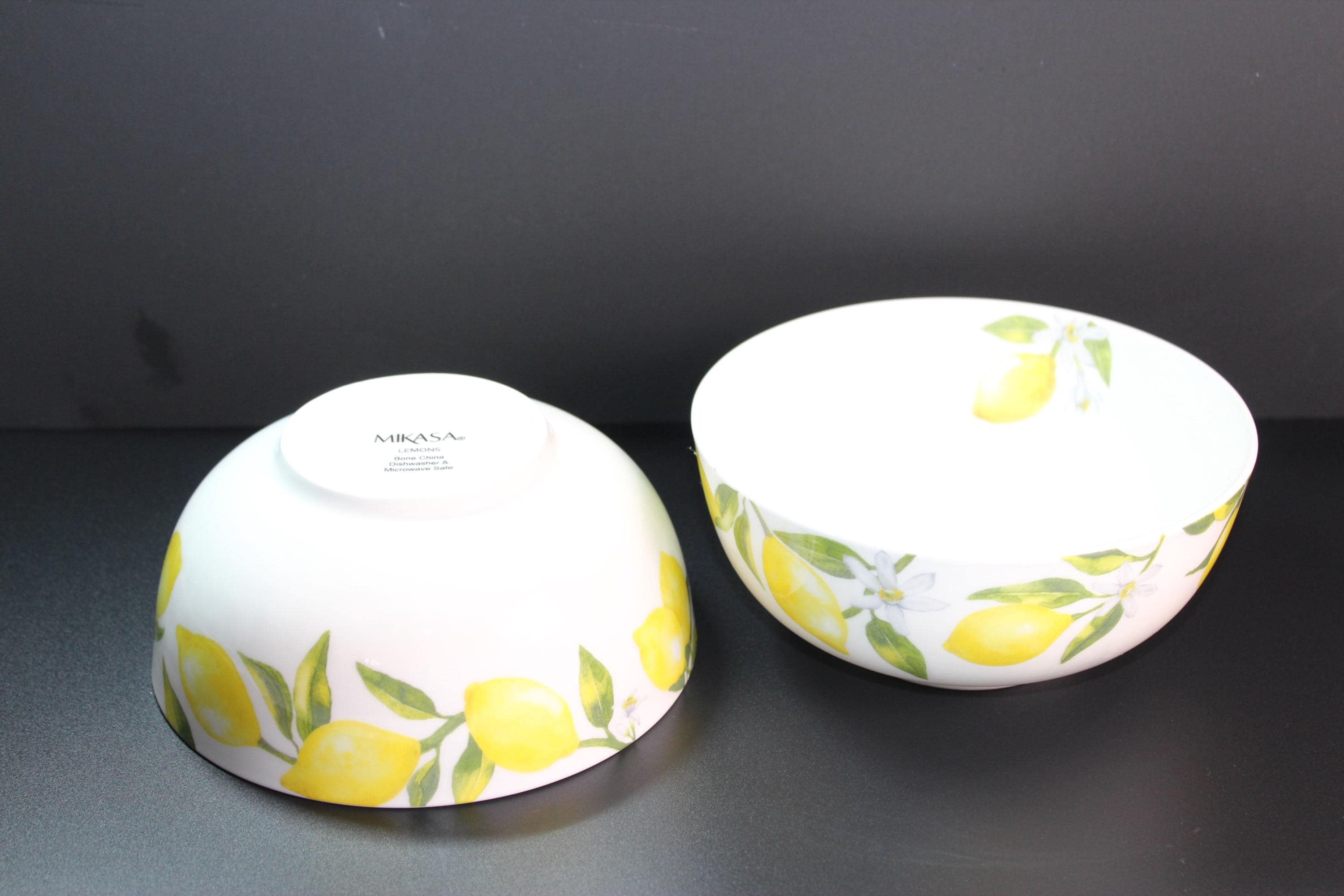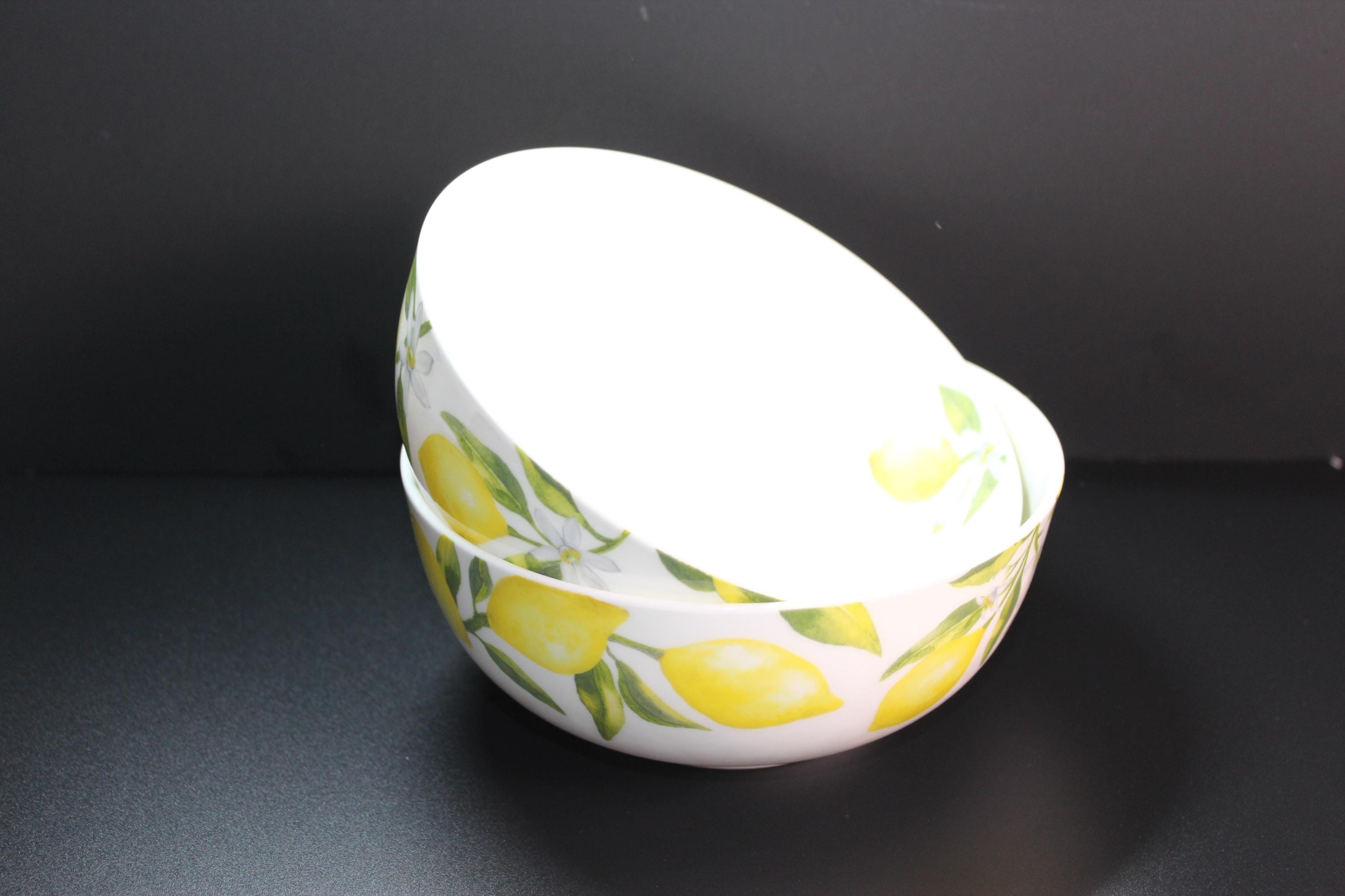 Beautiful and fresh set of two Mikasa Fine China "Lemons" footed bowls. Pure white with lemony yellow, white, and green decals inside and out. These are in excellent pre-owned condition. Microwave and dishwasher safe. Measuring 6 inches diameter and 3 inches deep. Very pretty with matching set or mix with blue, pink, green, gray or other dishes.