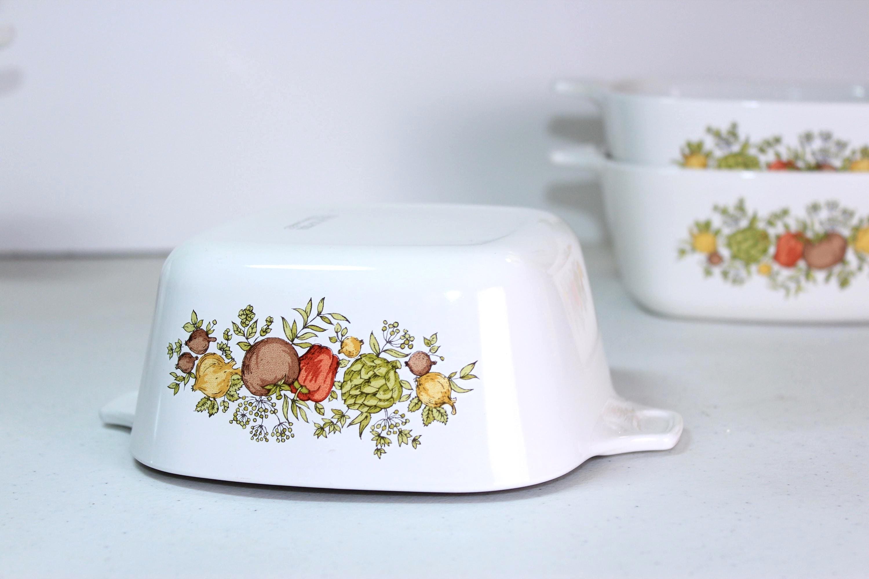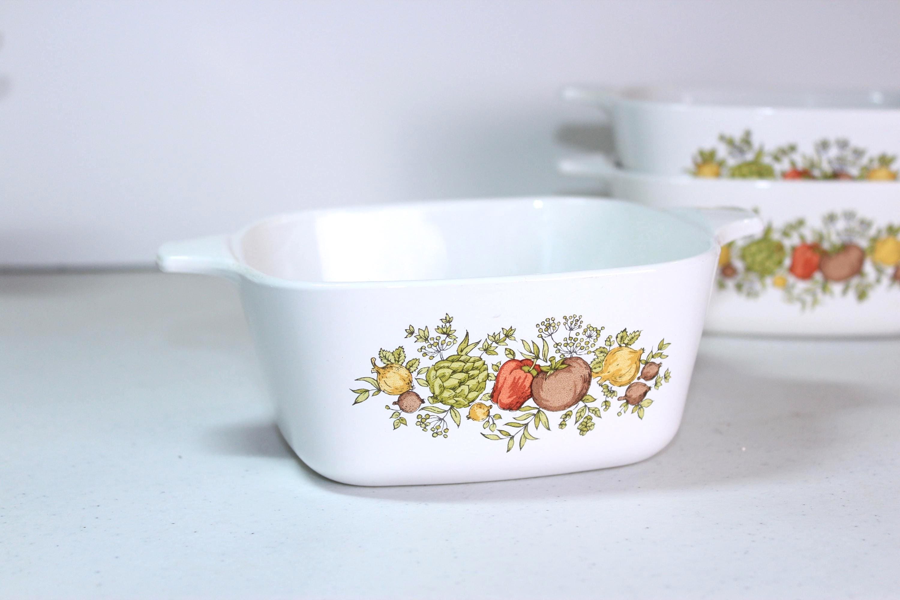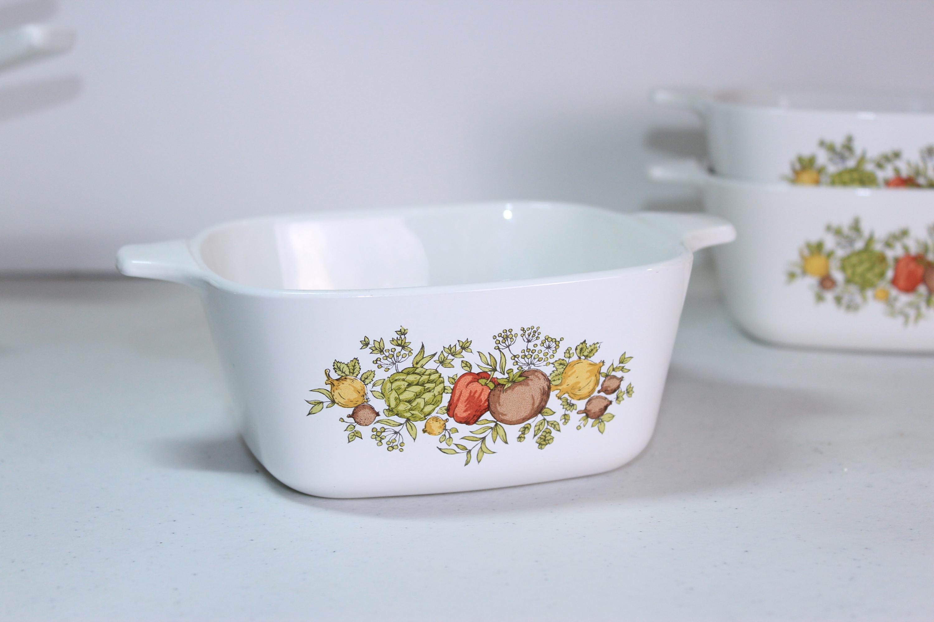 Vintage Corning Ware P-43-B 2 3/4 Cup, fun personal size Casserole Dish Spice of Life. Excellent condition, no scratches, chips or cracks. Graphics still beautiful. There are 3 available. Please message me before purchase if you want multiple to combine shipping.