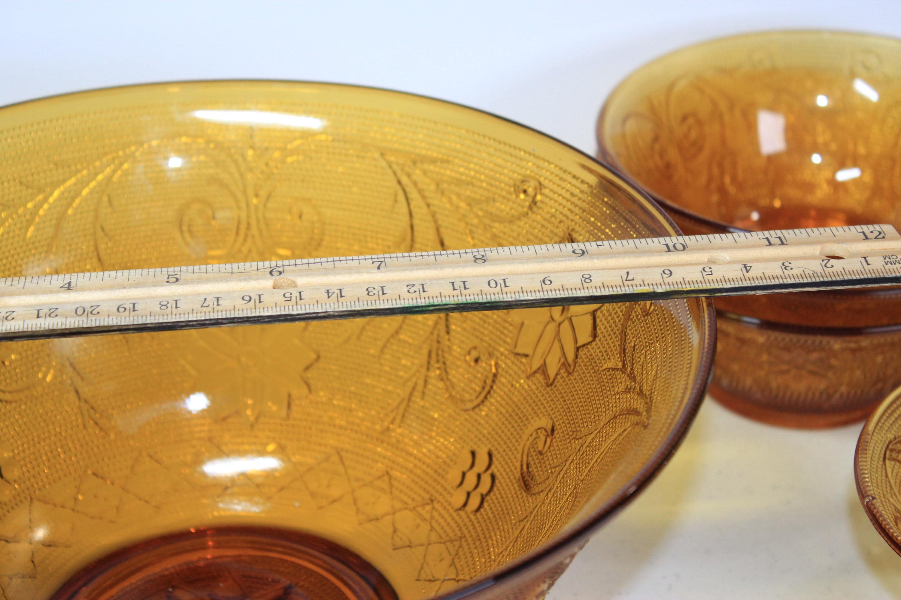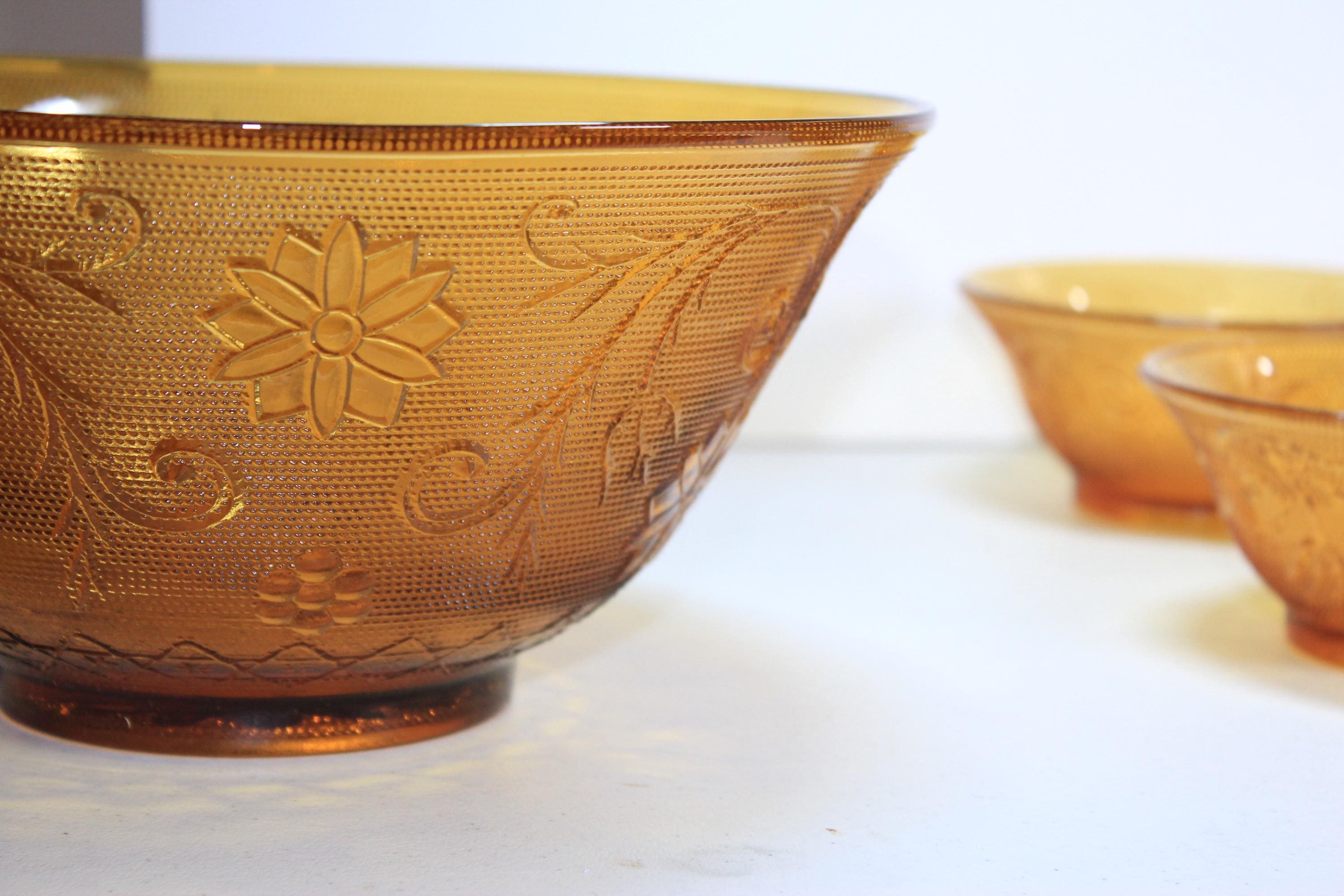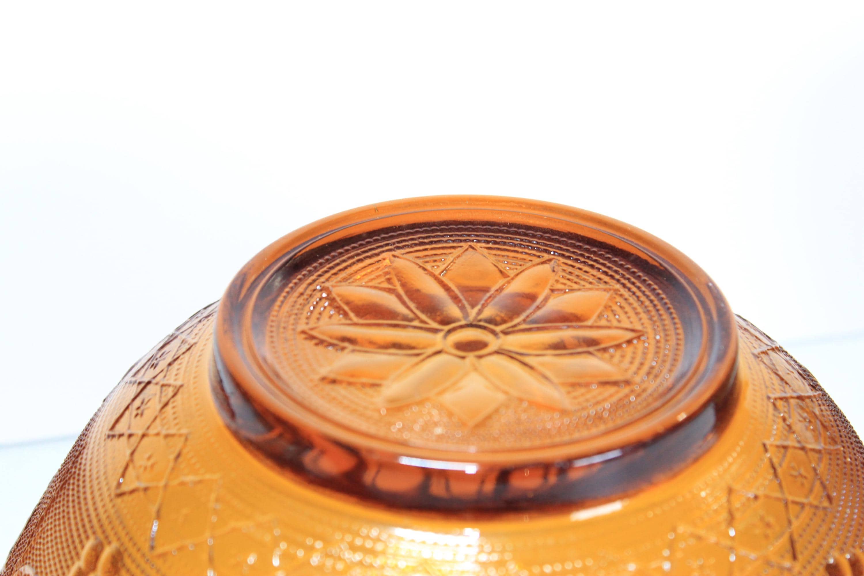 This vintage 1970's Amber Tiara Indiana Glass Footed Serving Bowl is 10 inches in diameter, and suitable for many uses such as a serving dish, for displaying, or could be used as a beautiful base for a centerpiece. It features intricately textural designs over the entire outer surface, has a footed bottom and smooth inner surface. The pattern is an intricate floral and scrolling vine design, which was originally introduced in the 1920's. The color is "golden amber" or "amber". It was made by Indiana Glass company and sold by Tiara Exclusives from 1971 to 1989. This bowl appears to be in pristine condition, which is rare for a vintage piece. It has been very well preserved. Please message BEFORE purchase if you intend to also purchase the matching salad/dessert bowls, I will combine shipping and give a 10% discount.