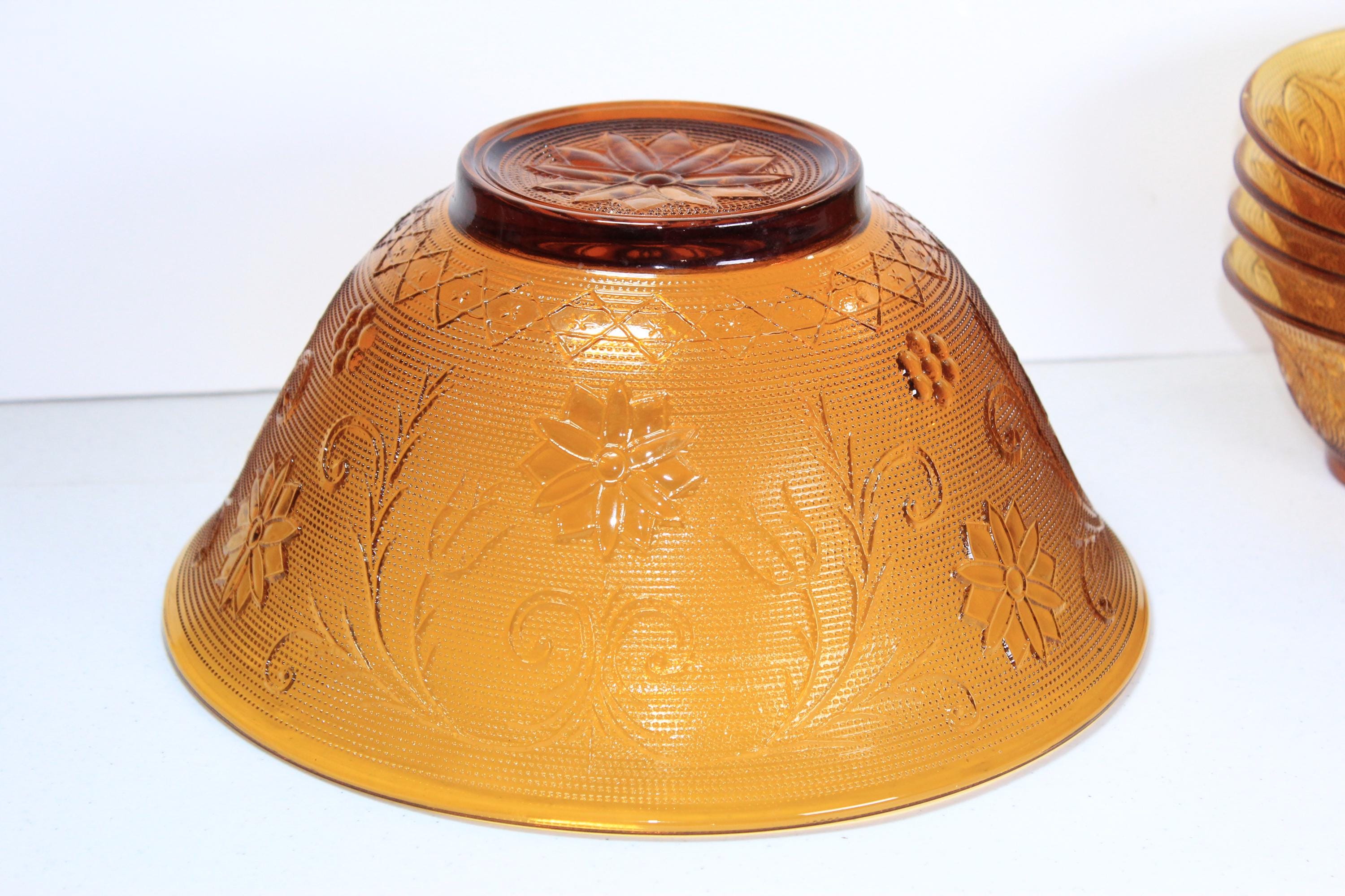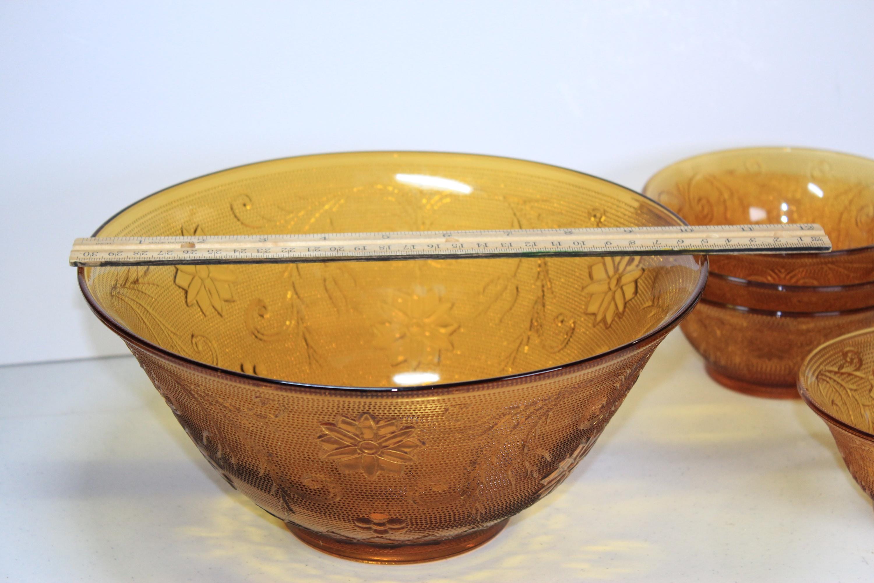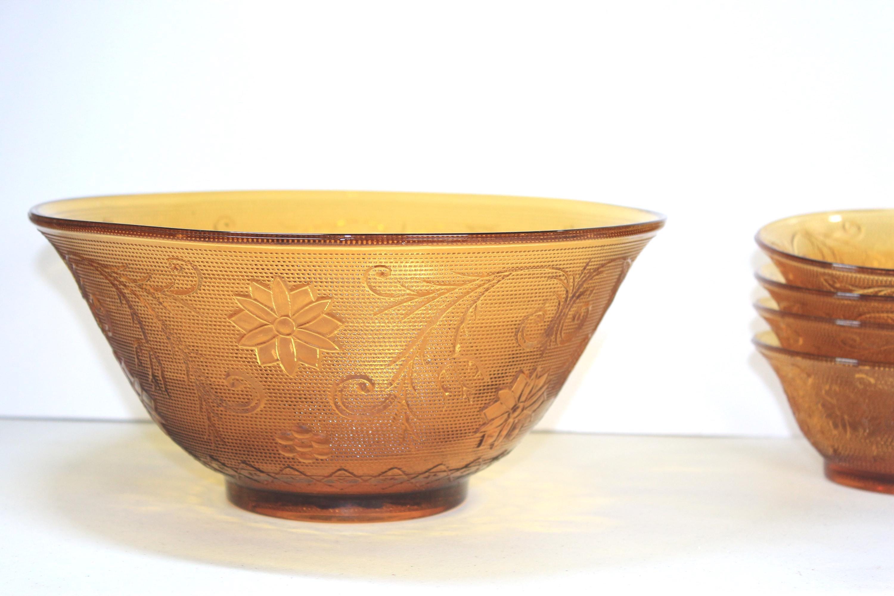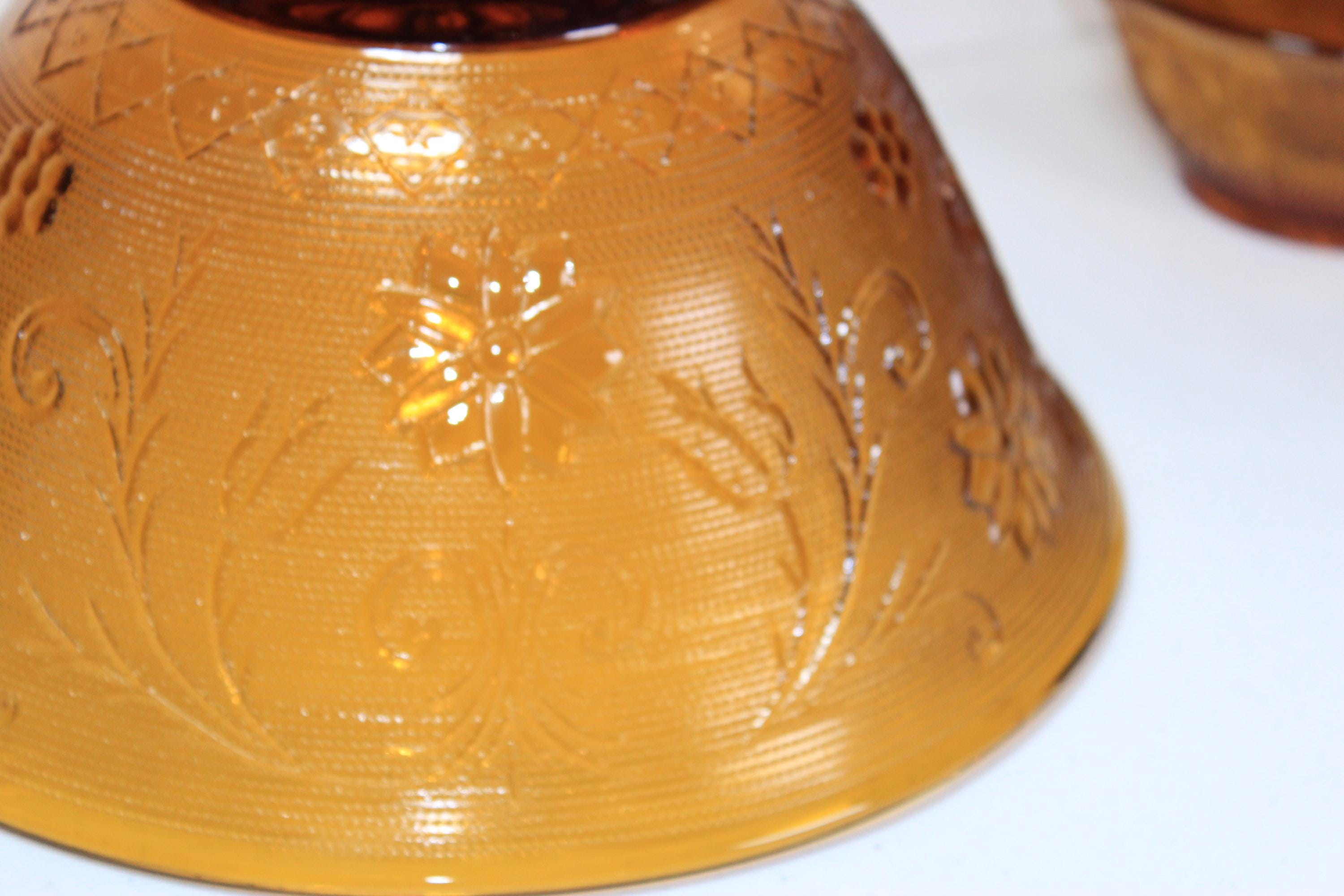 This vintage 1970's Amber Tiara Indiana Glass Footed Serving Bowl is 10 inches in diameter, and suitable for many uses such as a serving dish, for displaying, or could be used as a beautiful base for a centerpiece. It features intricately textural designs over the entire outer surface, has a footed bottom and smooth inner surface. The pattern is an intricate floral and scrolling vine design, which was originally introduced in the 1920's. The color is "golden amber" or "amber". It was made by Indiana Glass company and sold by Tiara Exclusives from 1971 to 1989. This bowl appears to be in pristine condition, which is rare for a vintage piece. It has been very well preserved. Please message BEFORE purchase if you intend to also purchase the matching salad/dessert bowls, I will combine shipping and give a 10% discount.