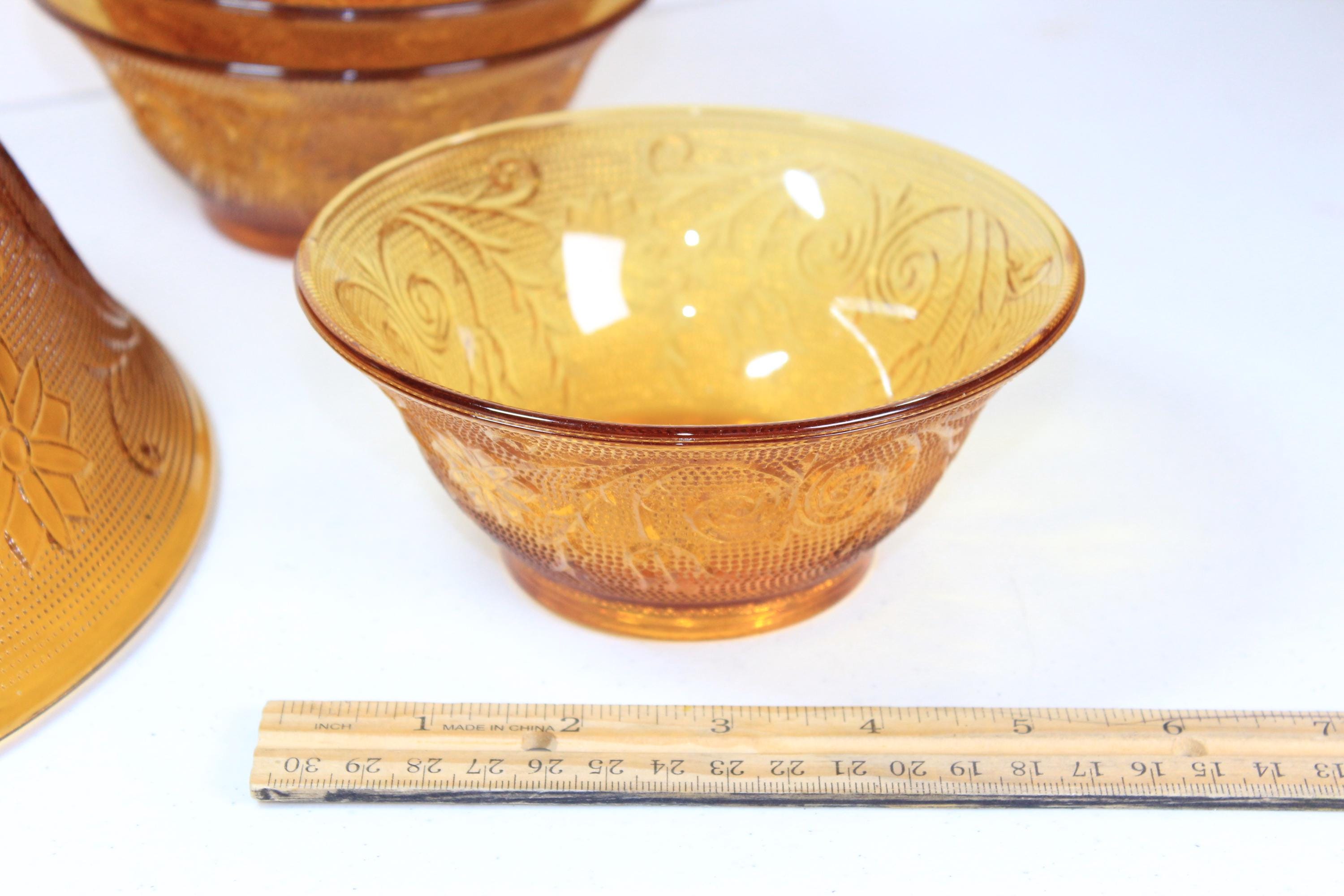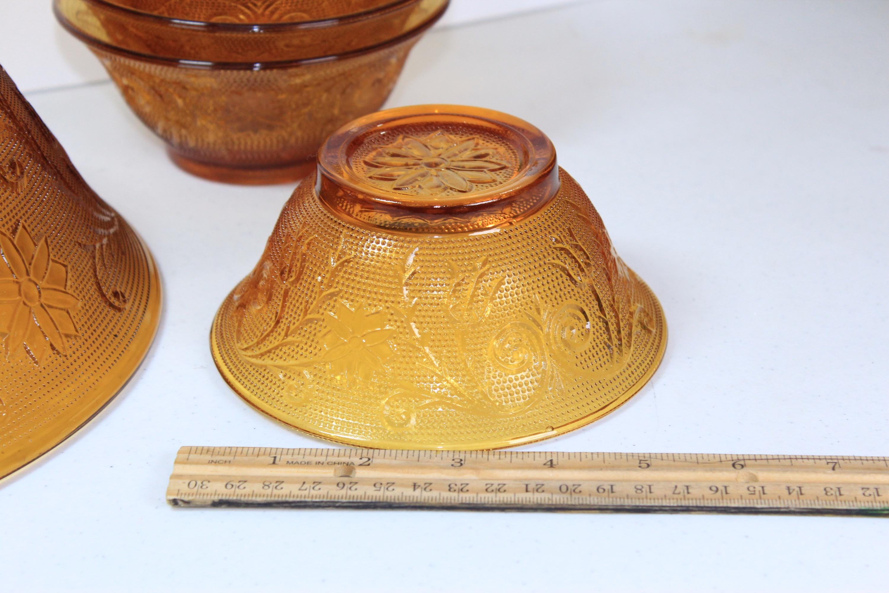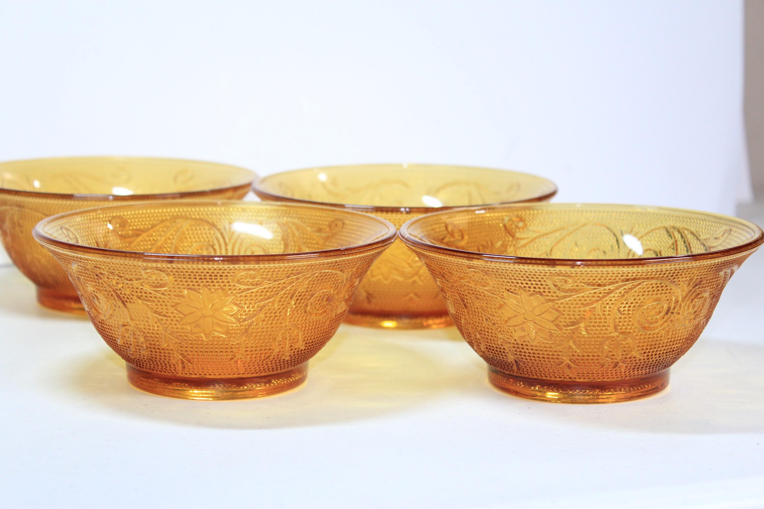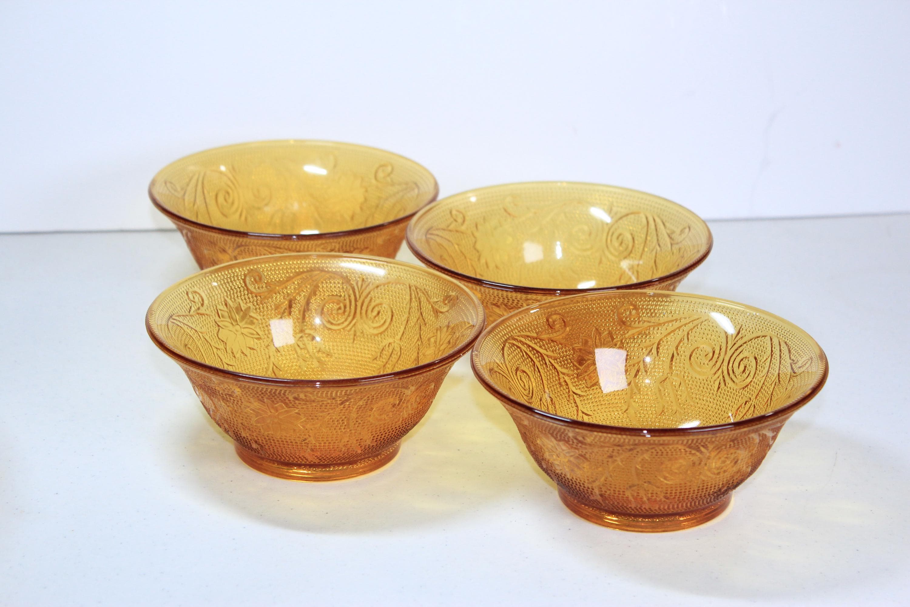This vintage 1970's Amber Tiara Indiana Glass Footed set of four salad/dessert dishes measure 5.5 inches in diameter and are 2.25 inches deep. They feature intricately textural designs over the entire outer surface, have footed bottoms and smooth inner surfaces. The pattern is an intricate floral and scrolling vine design, which was originally introduced in the 1920's. The color is "golden amber" or "amber. It was made by Indiana Glass company and sold by Tiara Exclusives from 1971 to 1989. These bowls appear to be in pristine condition, which is rare for vintage pieces. They are very well preserved. Please message BEFORE purchase if you intend to also purchase the matching 10 inch Serving Bowl, I will combine shipping and give a 10% discount.